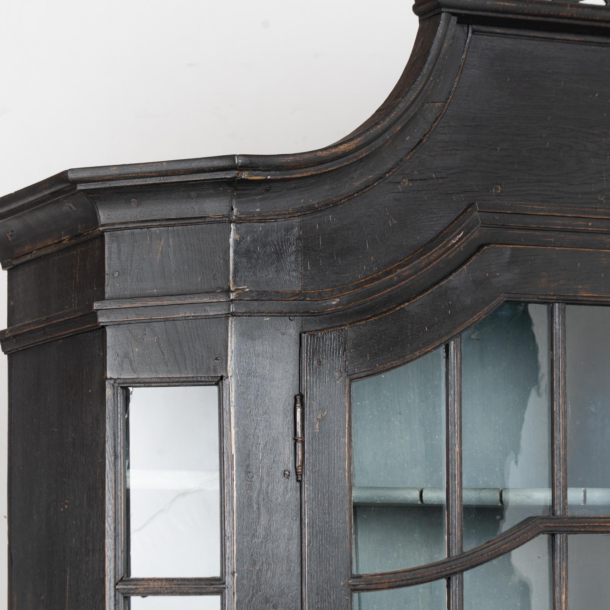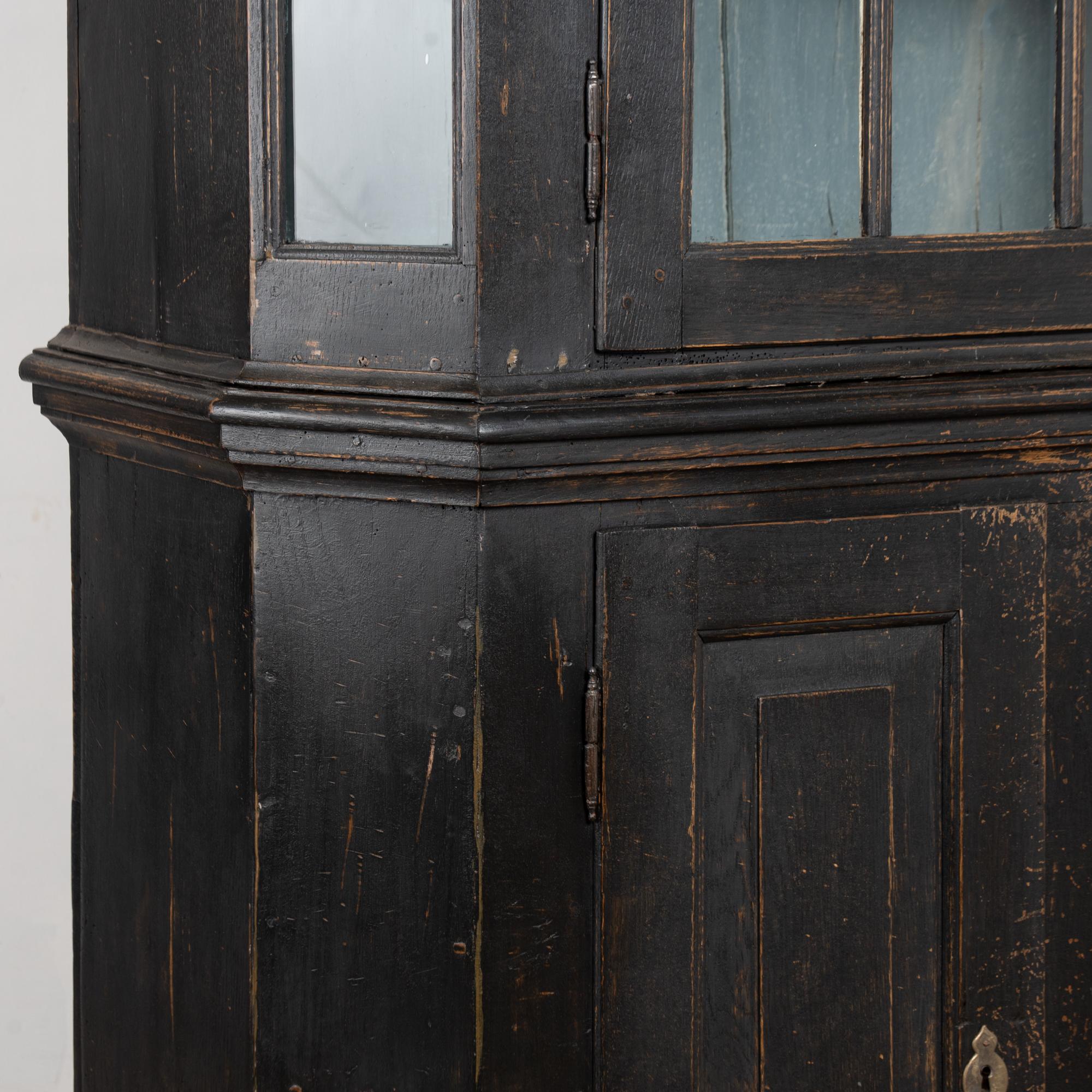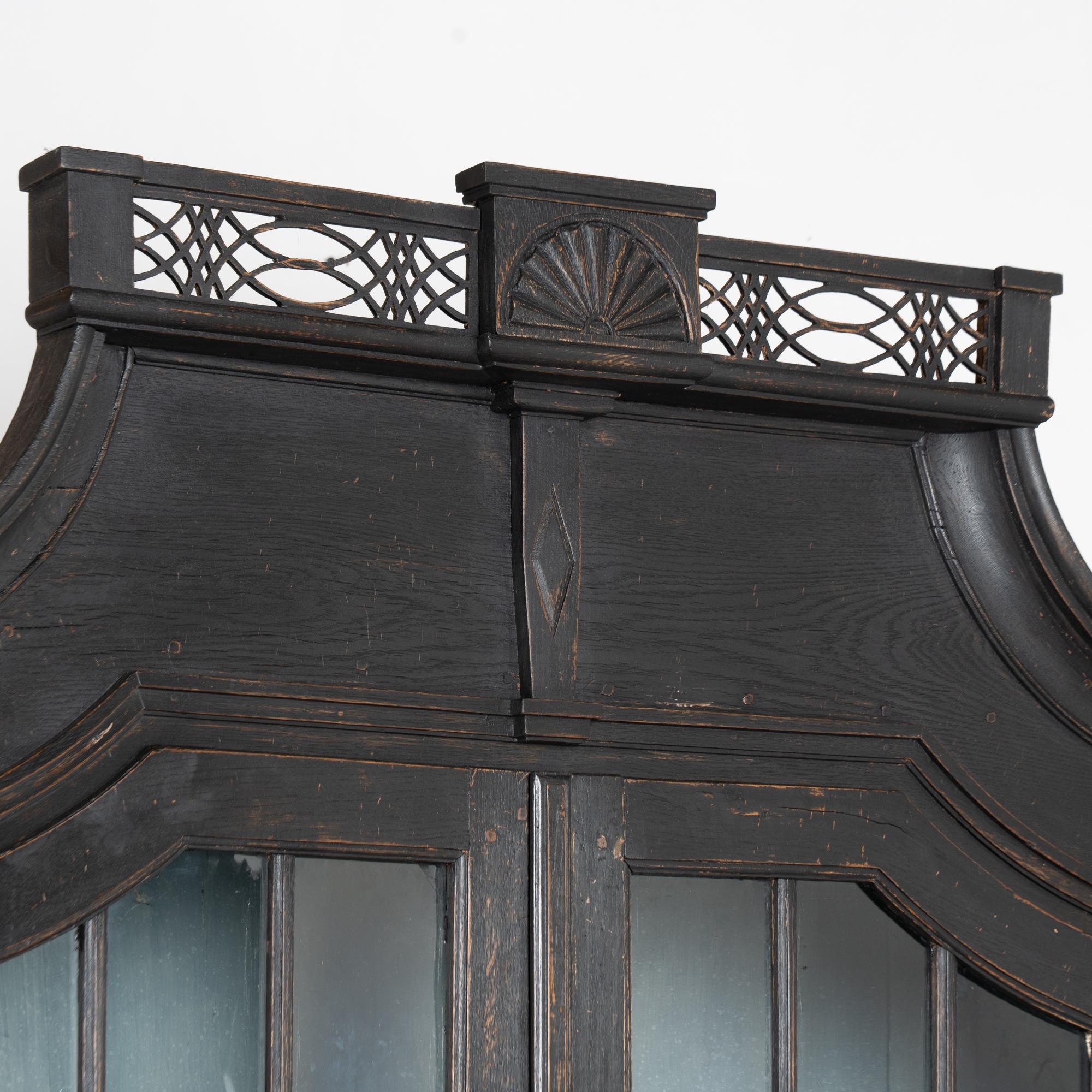 Notice in center of bottom cabinet, there are four small drawers and one upper shelf. This vitrine was likely used to display and store the family china and silver in a dining room of a well-to-do family.