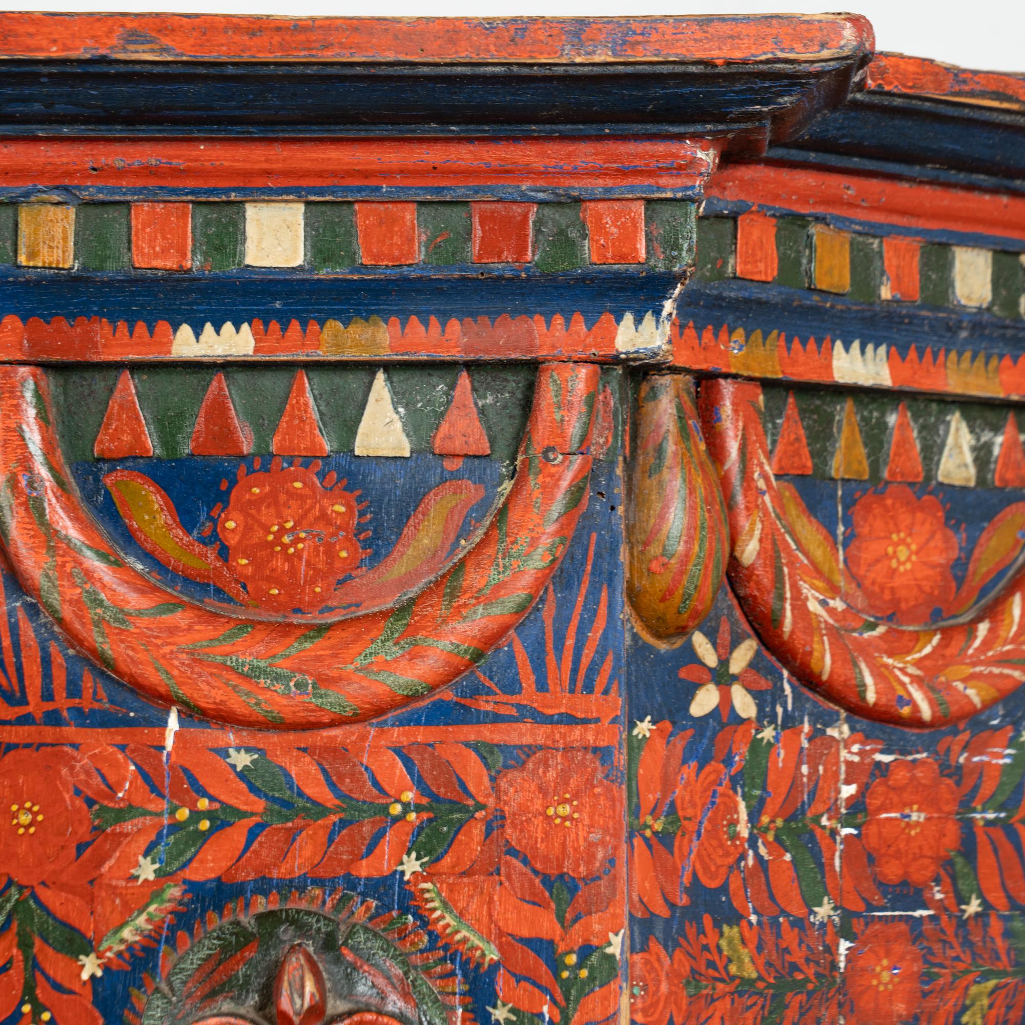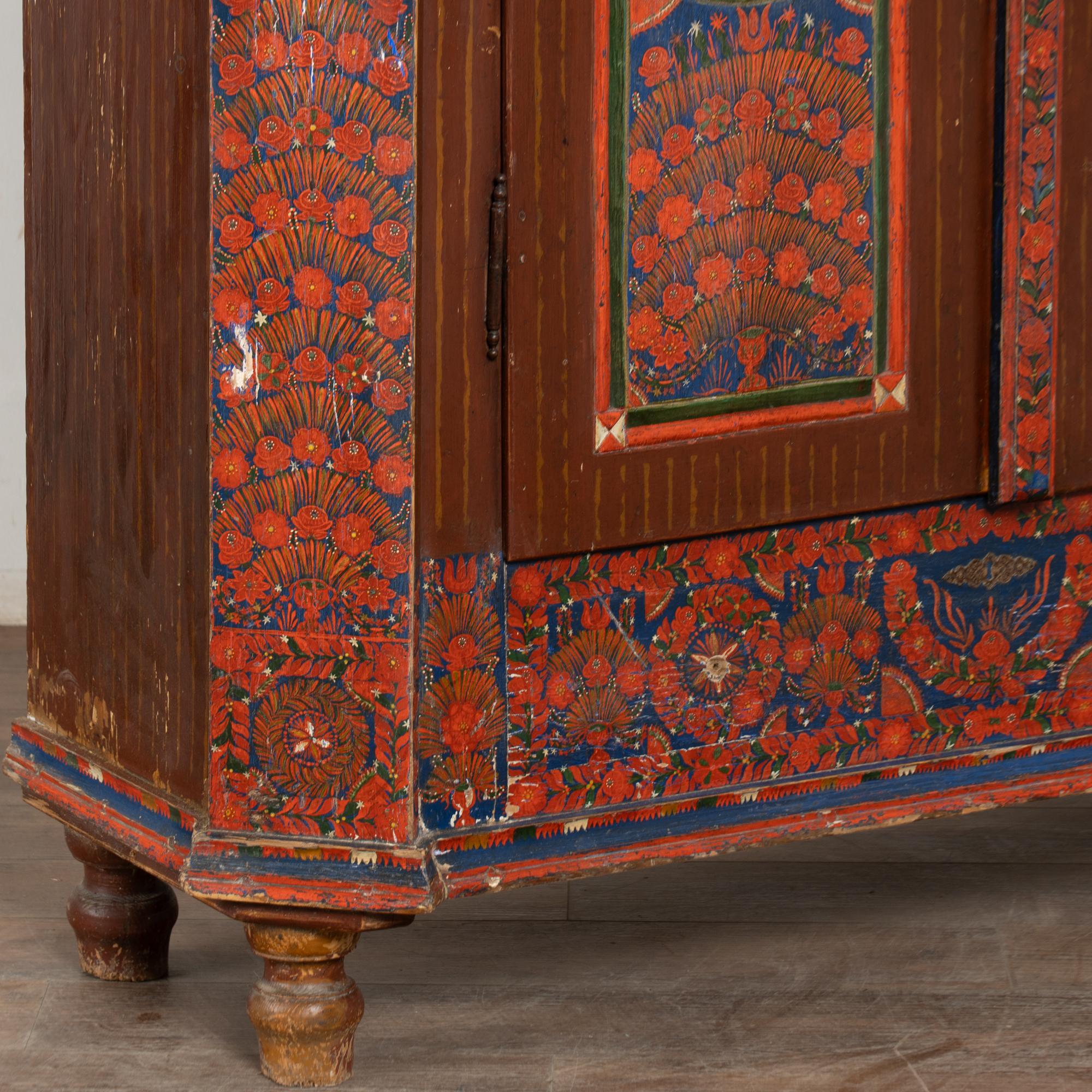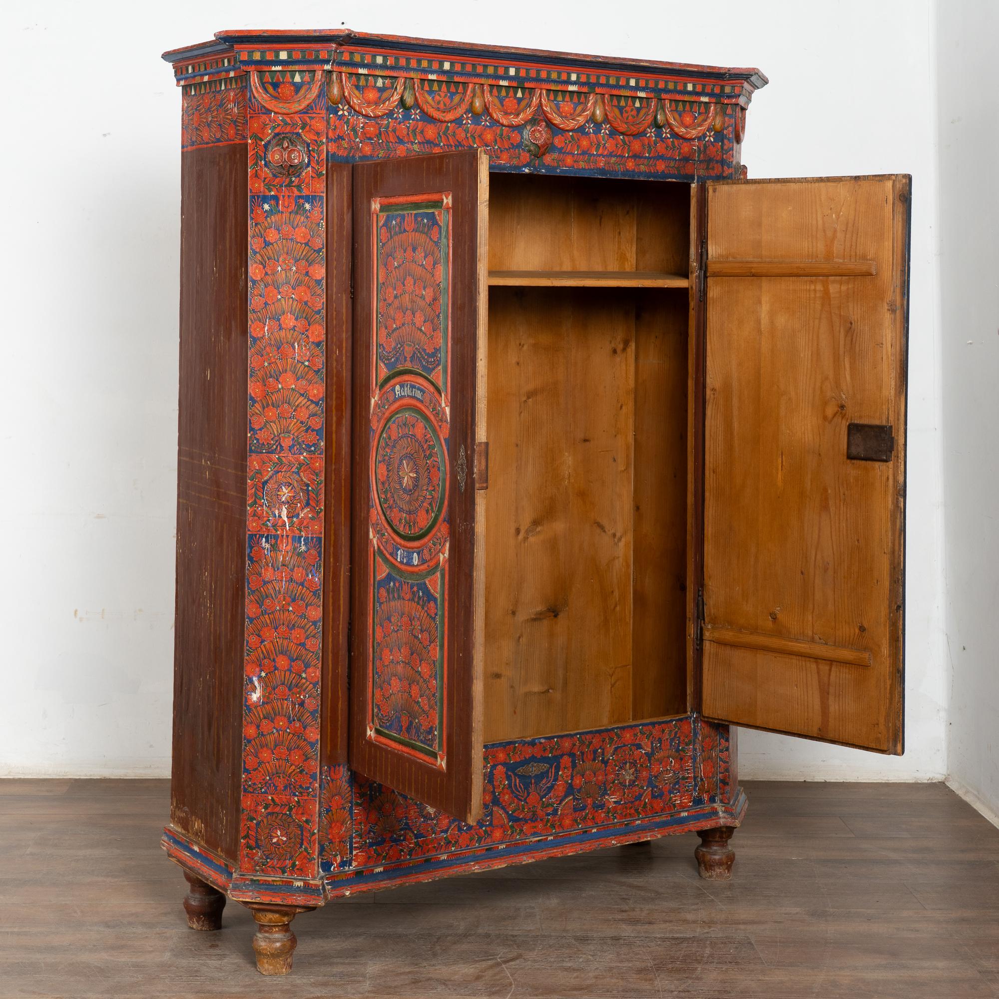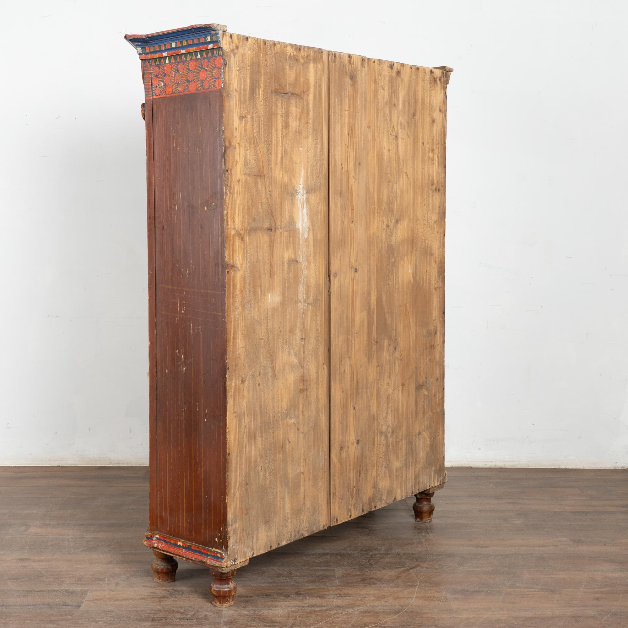 This painted pine armoire still maintains the quality and details of the elaborate hand-painted finish. The vibrant red and blue patterns were traditional Eastern European folk art style elements of the era. The many carved details elevate this armoire as a special find.