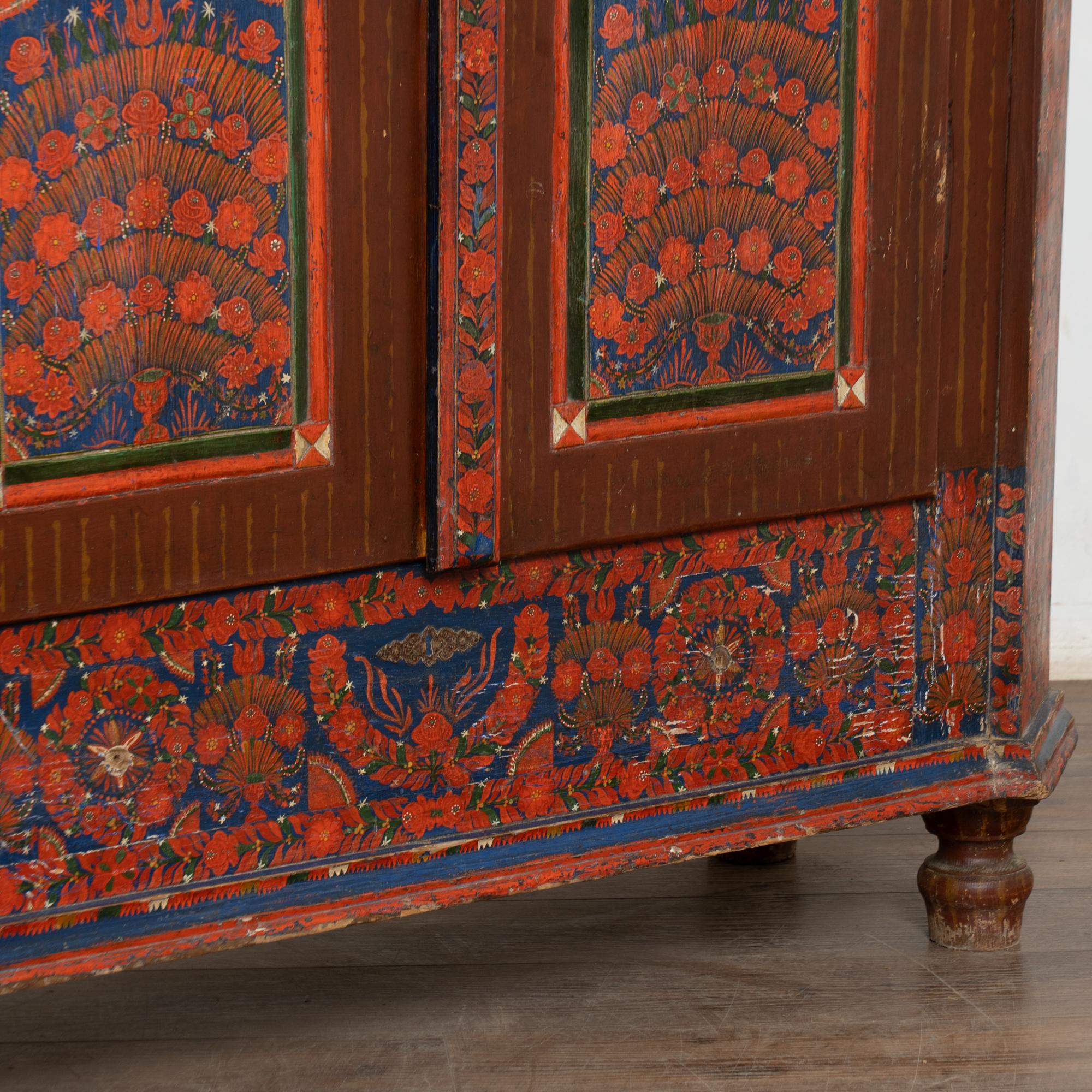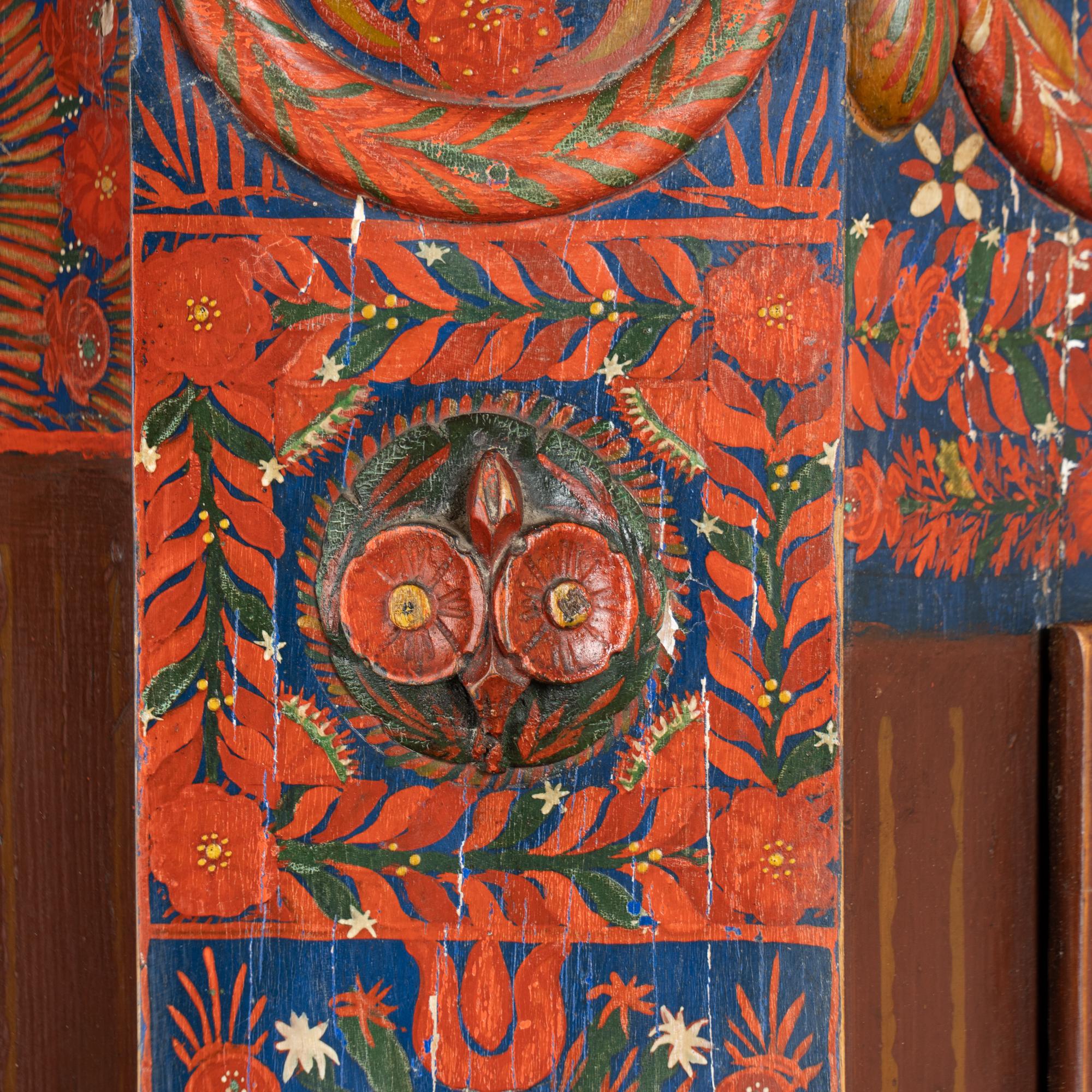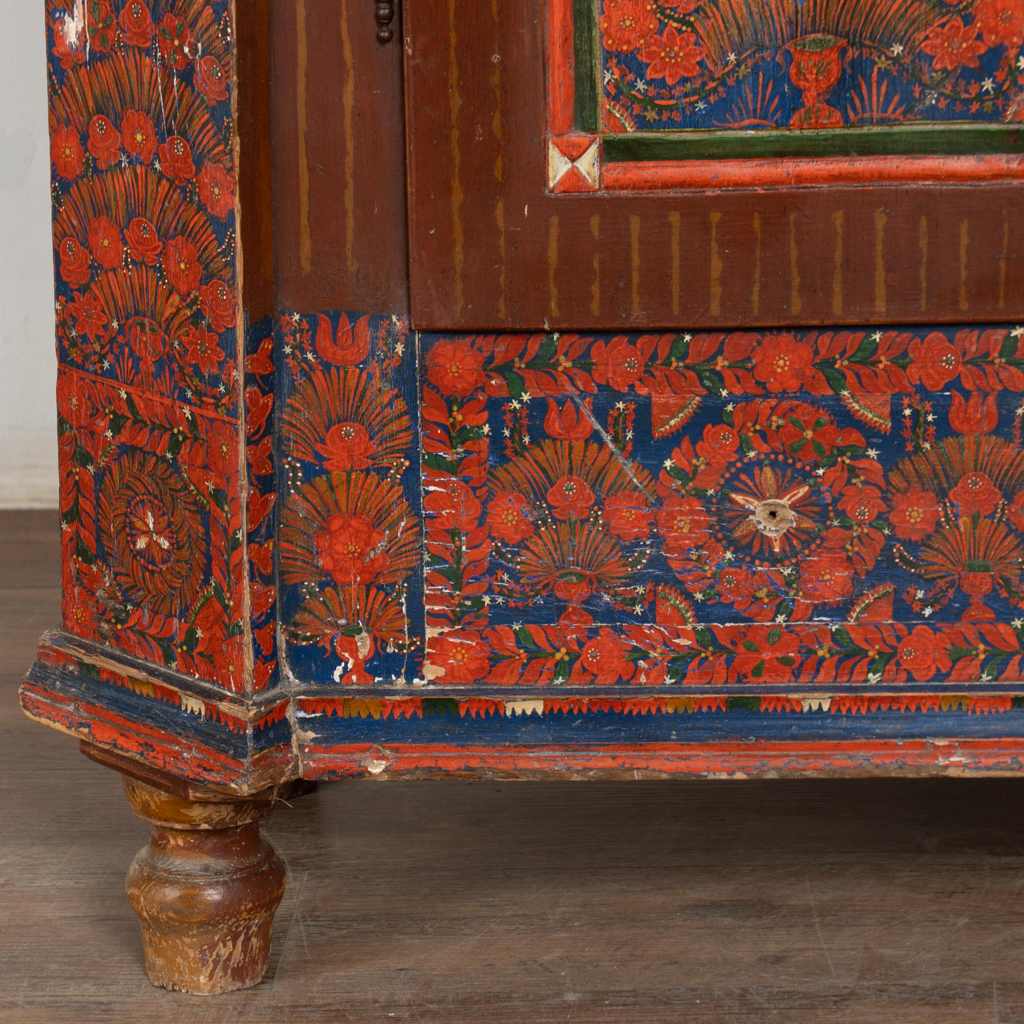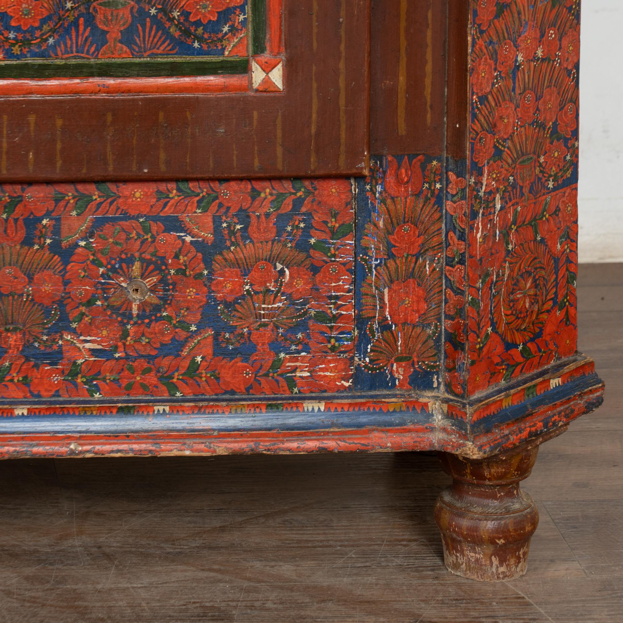 This painted pine armoire still maintains the quality and details of the elaborate hand-painted finish. The vibrant red and blue patterns were traditional Eastern European folk art style elements of the era. The many carved details elevate this armoire as a special find.
