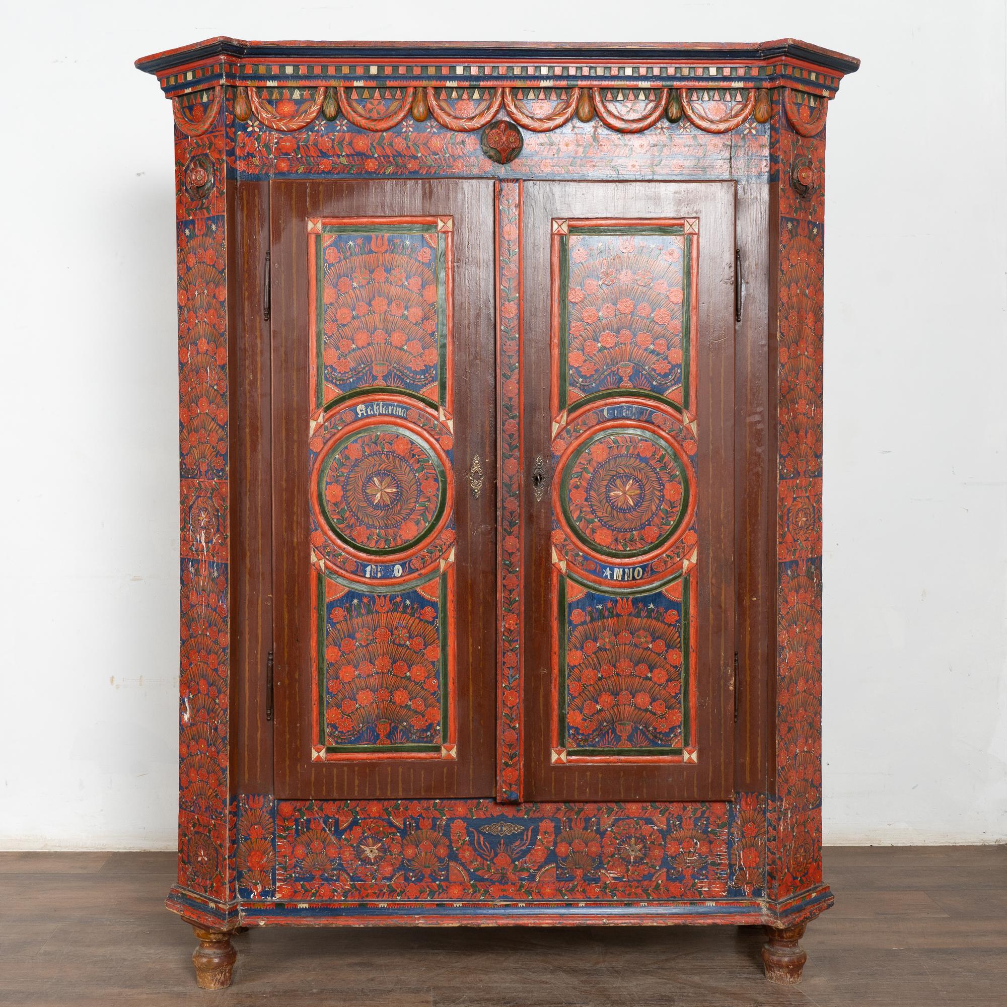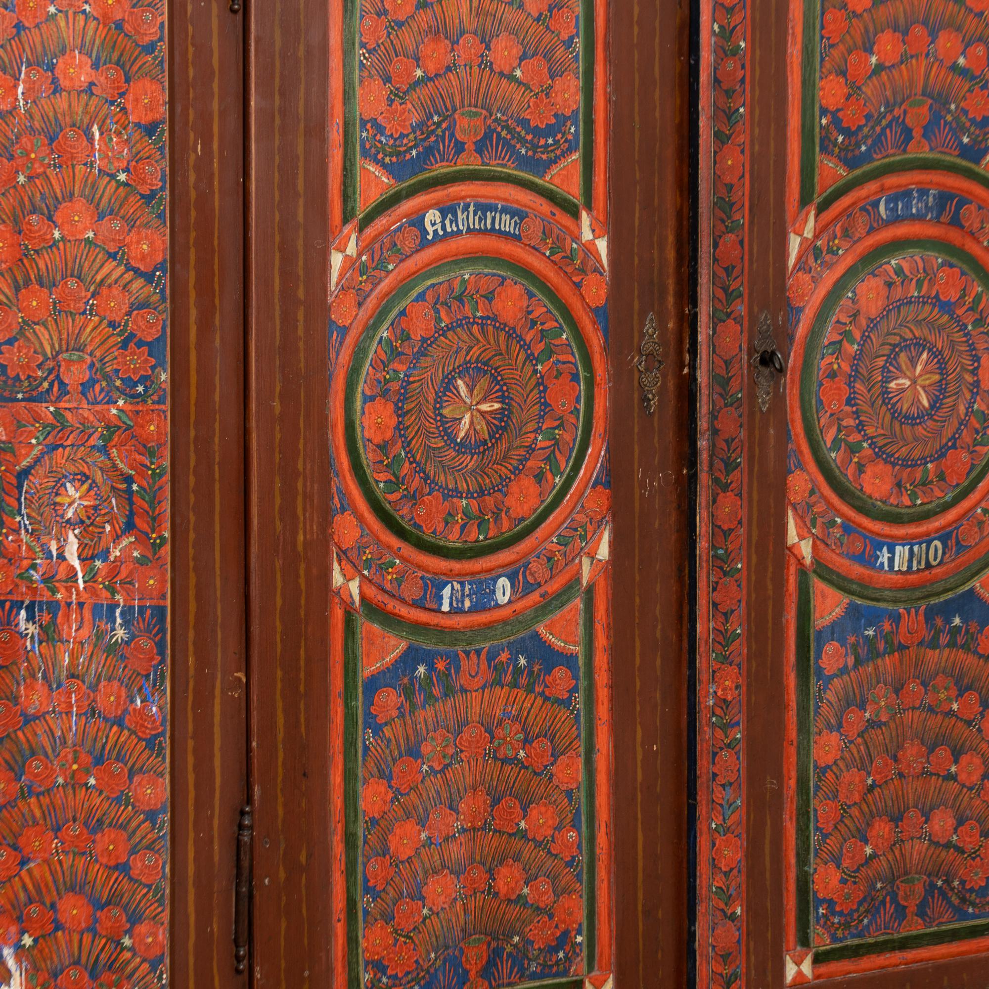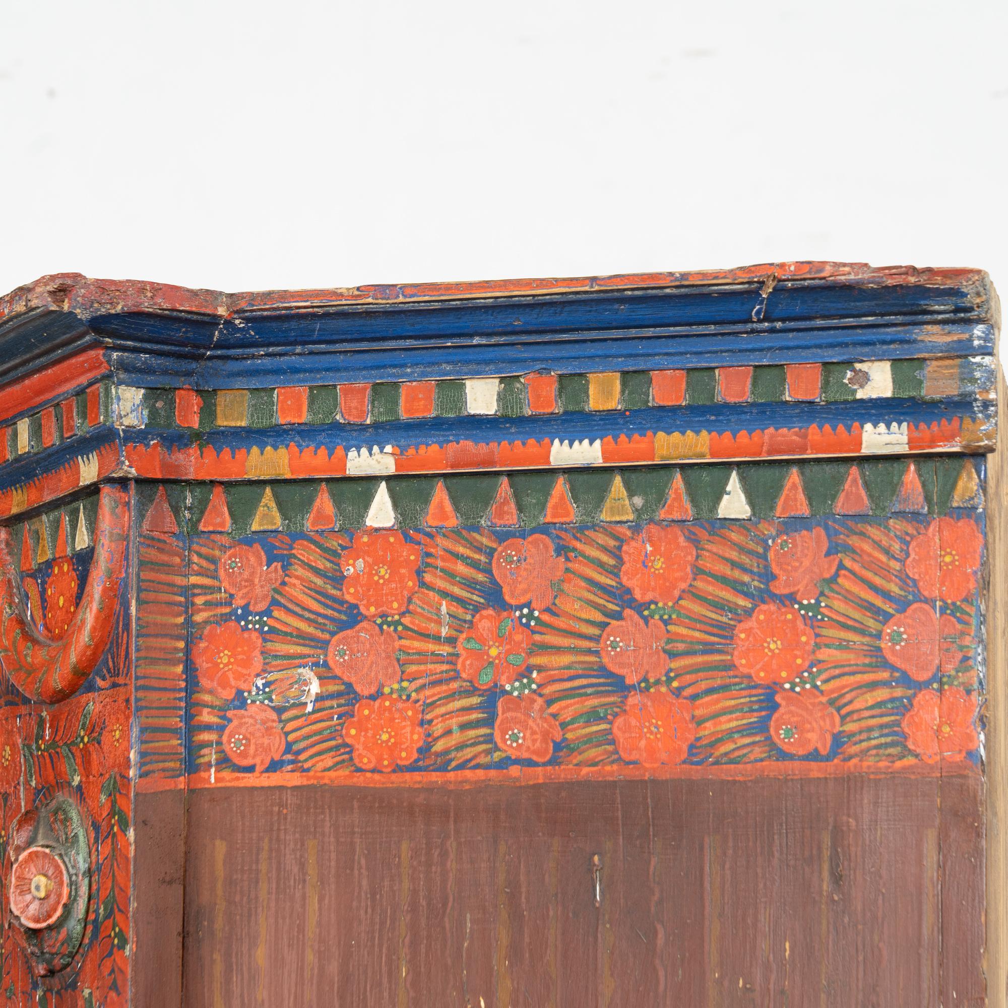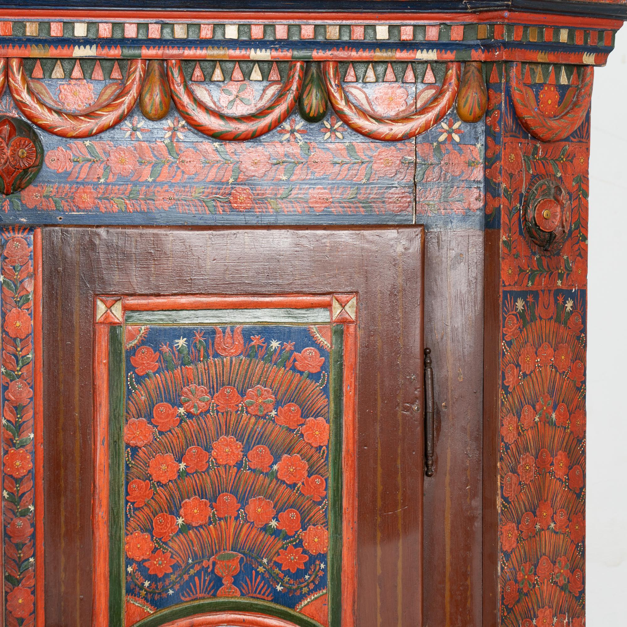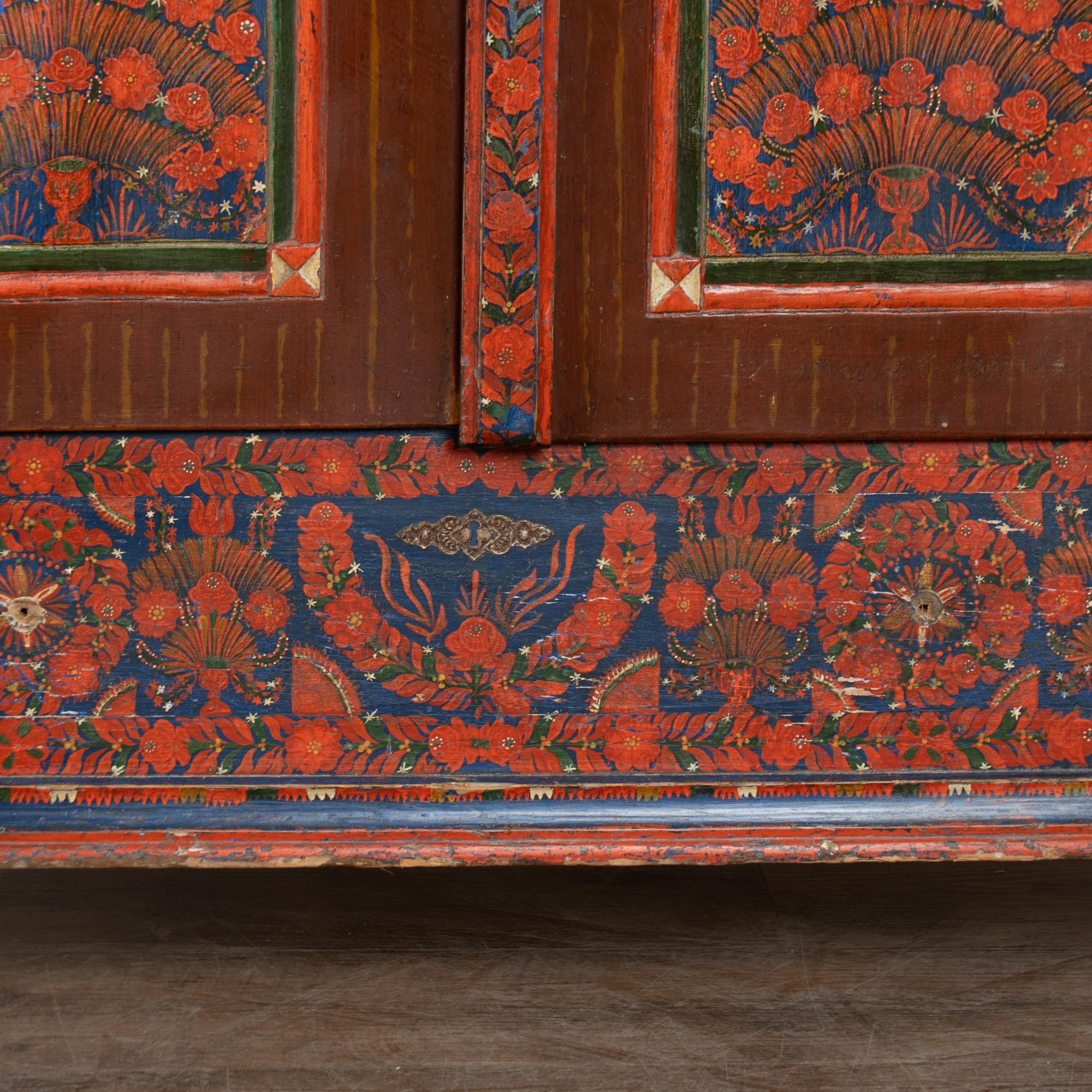 This painted pine armoire still maintains the quality and details of the elaborate hand-painted finish. The vibrant red and blue patterns were traditional Eastern European folk art style elements of the era. The many carved details elevate this armoire as a special find.