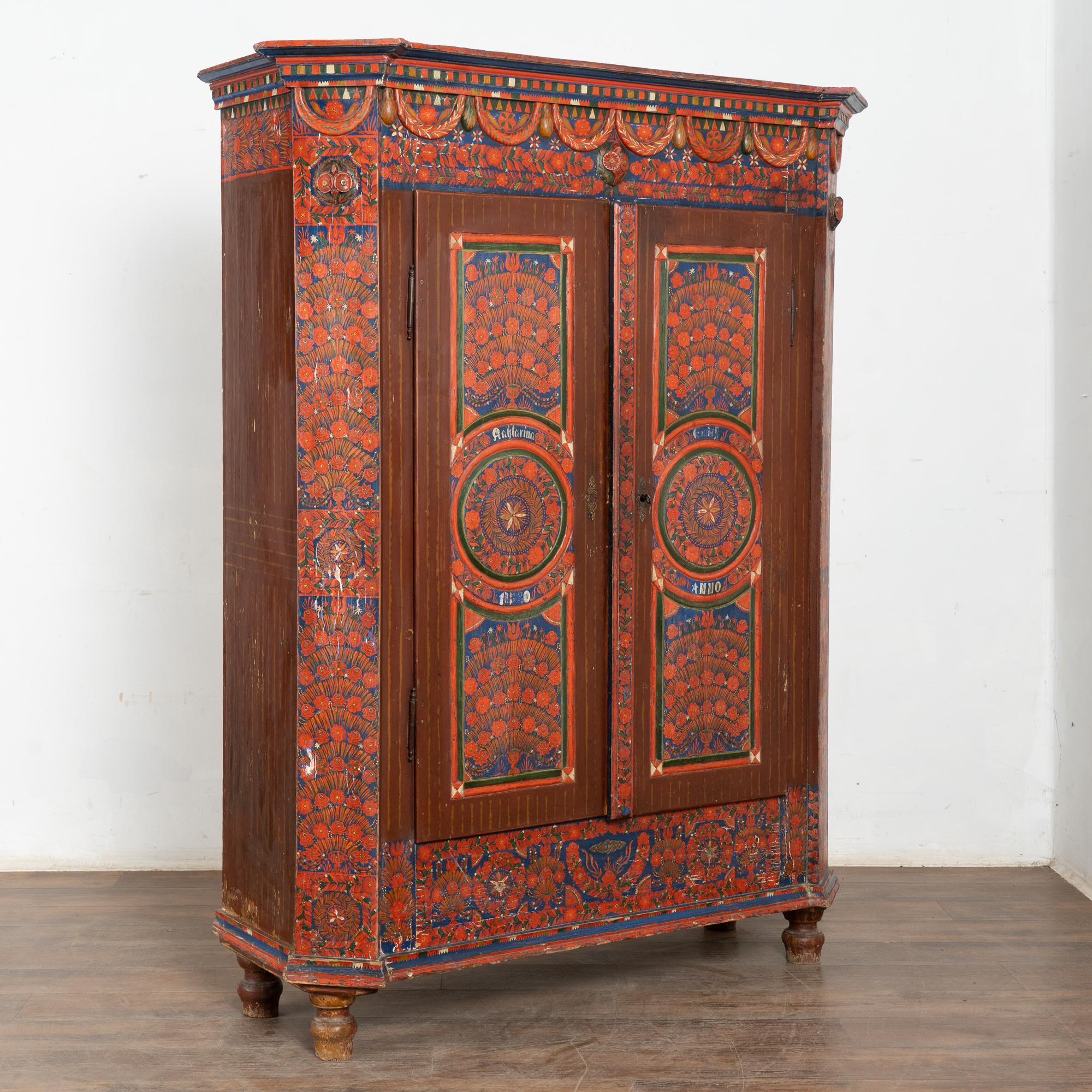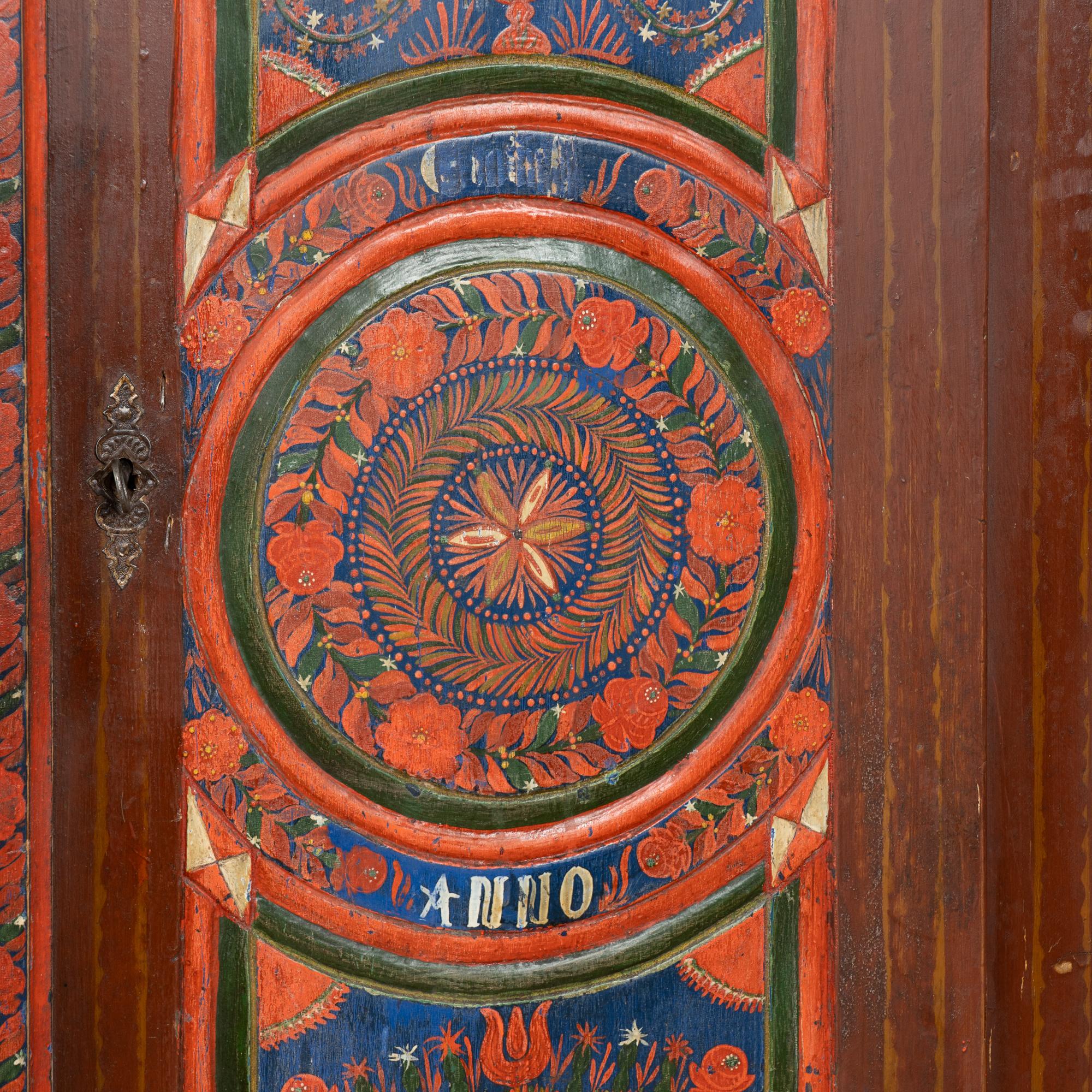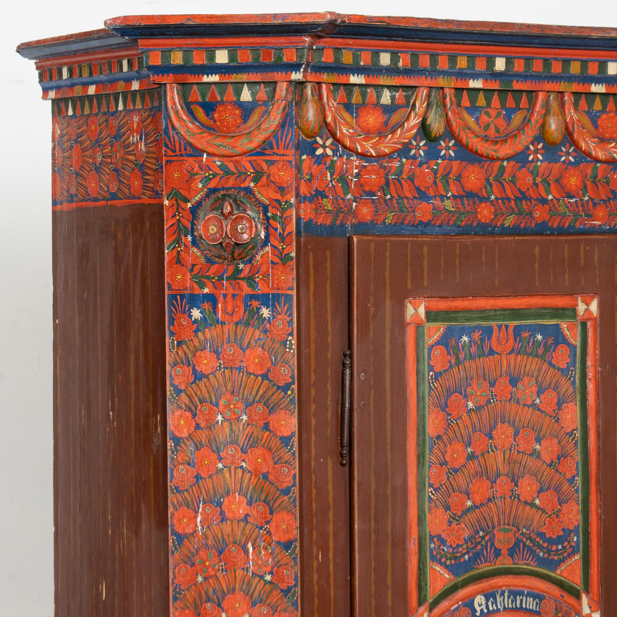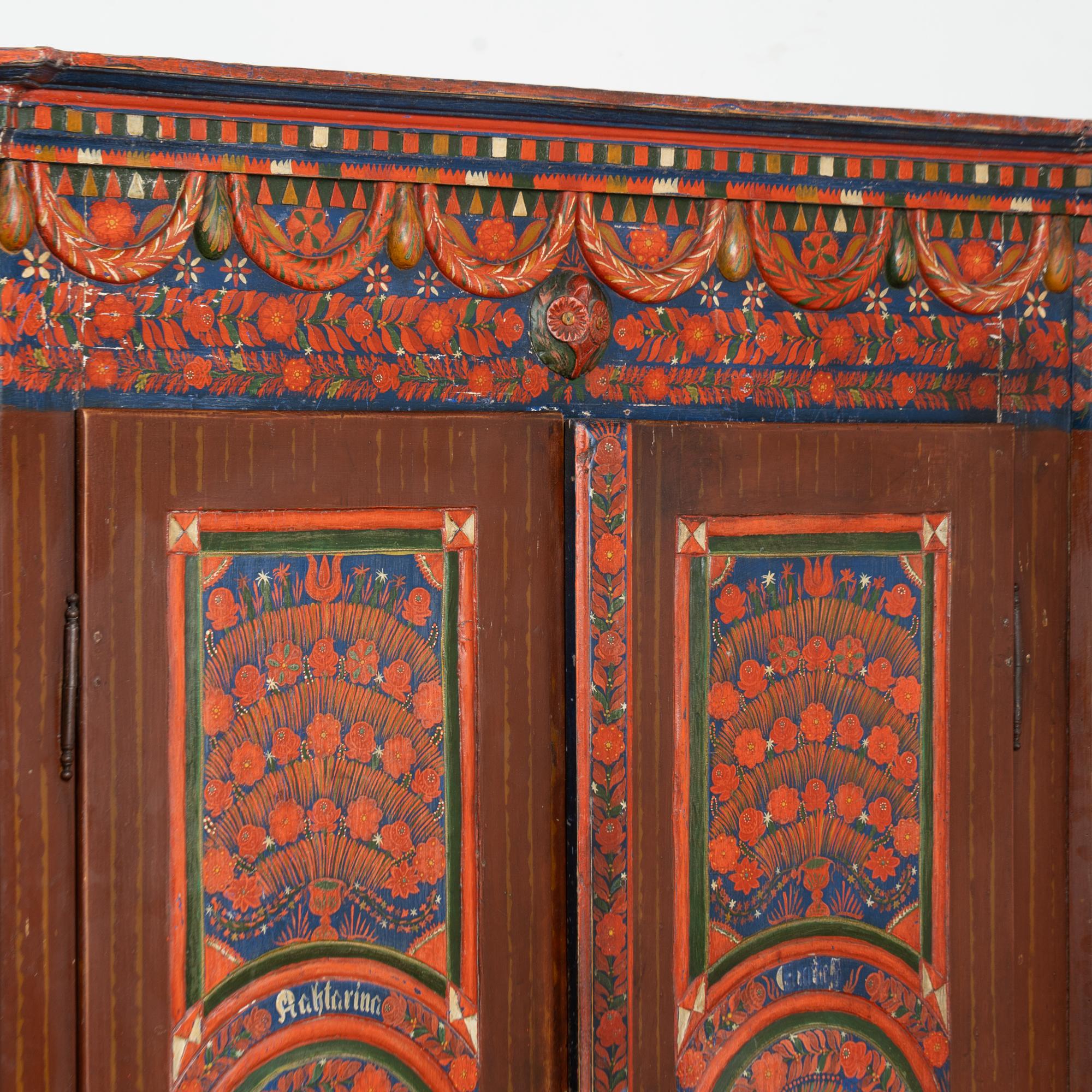 This painted pine armoire still maintains the quality and details of the elaborate hand-painted finish. The vibrant red and blue patterns were traditional Eastern European folk art style elements of the era. The many carved details elevate this armoire as a special find.