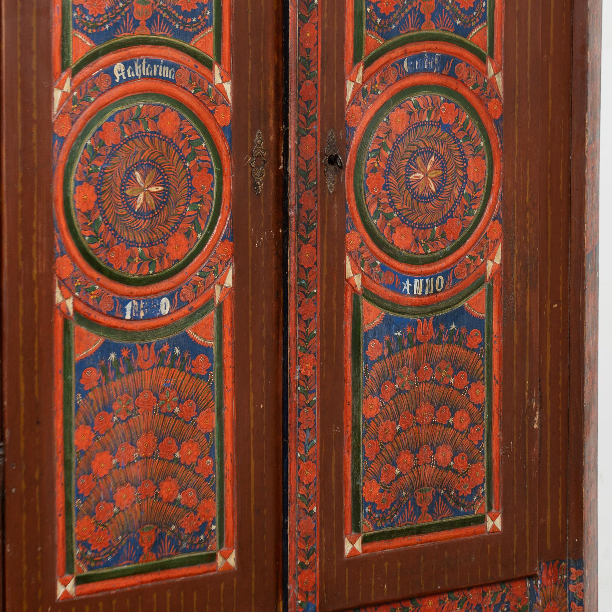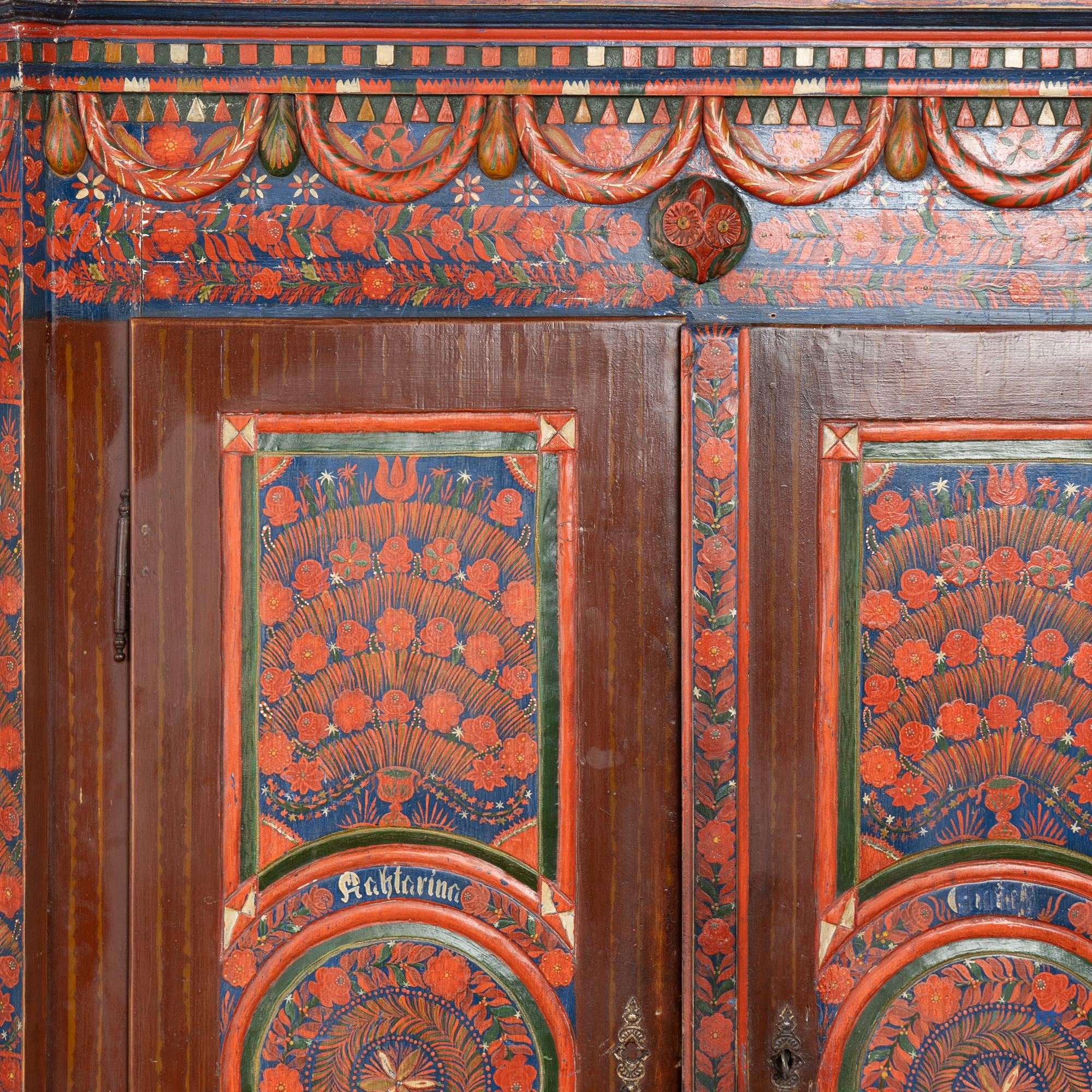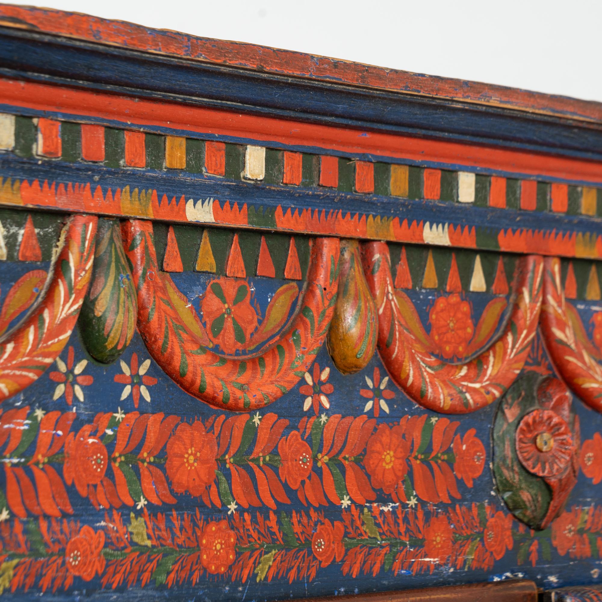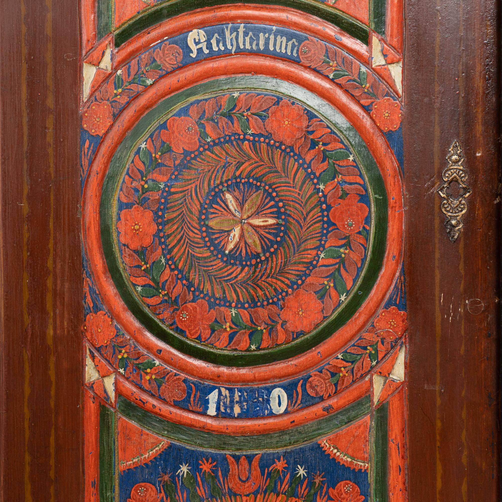 This painted pine armoire still maintains the quality and details of the elaborate hand-painted finish. The vibrant red and blue patterns were traditional Eastern European folk art style elements of the era. The many carved details elevate this armoire as a special find.