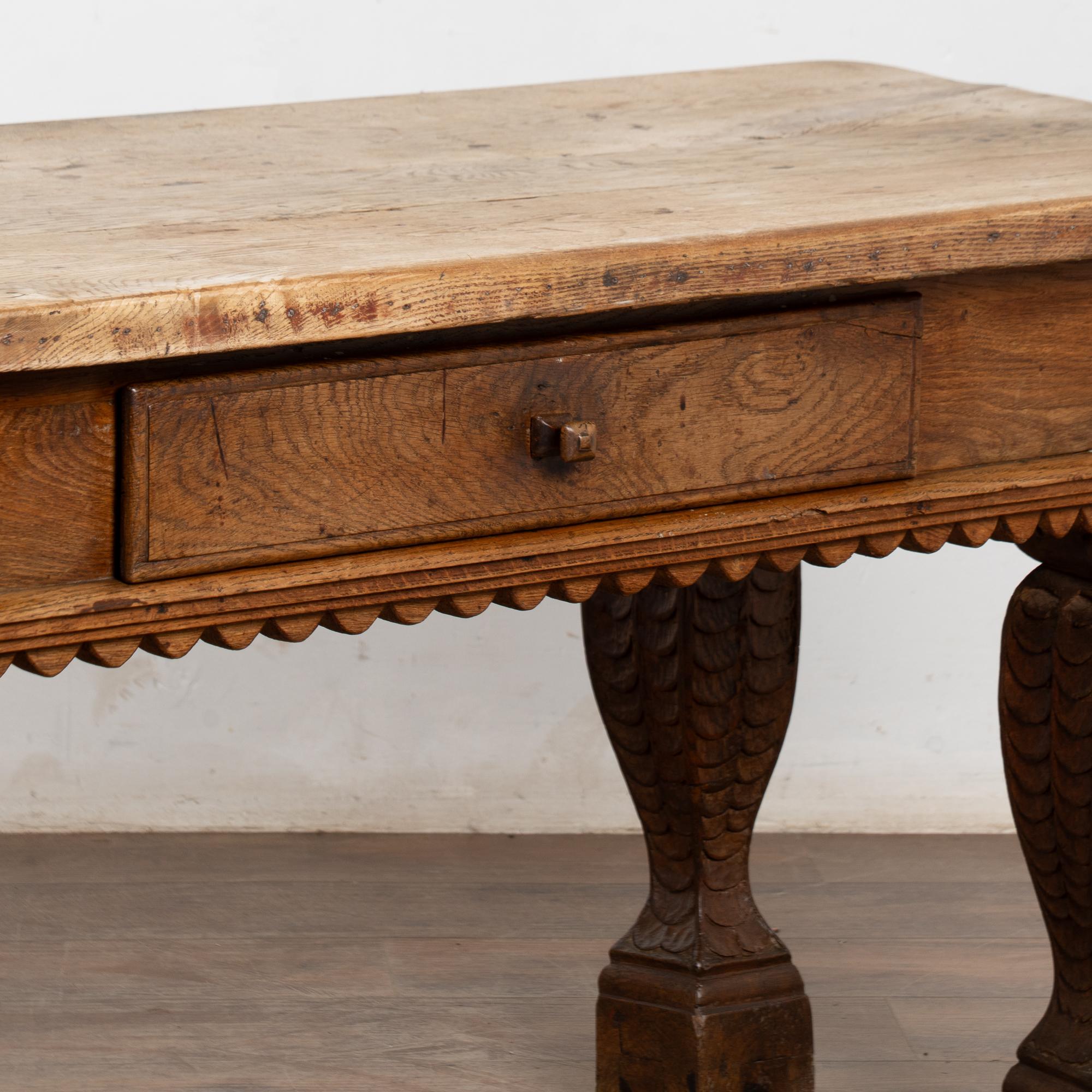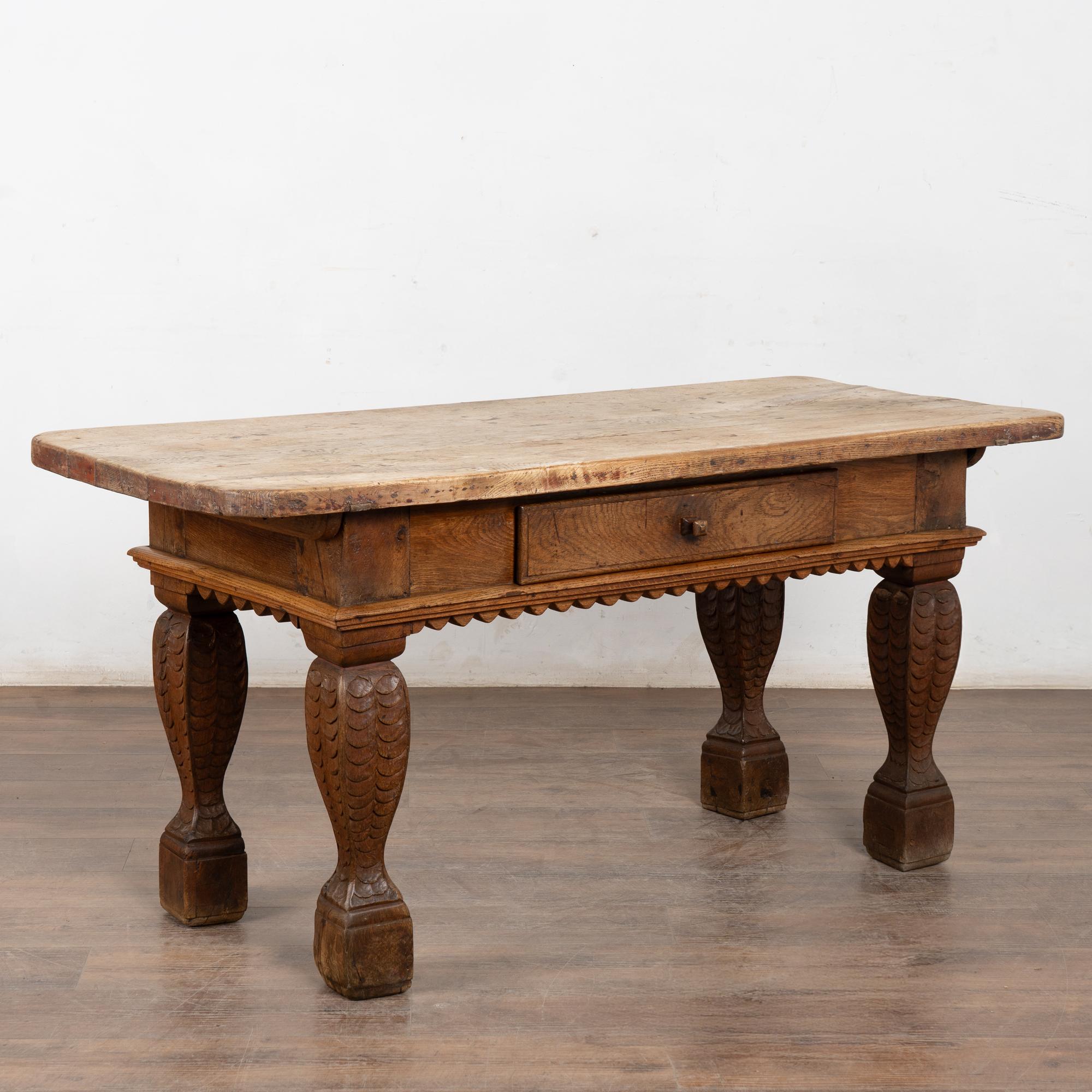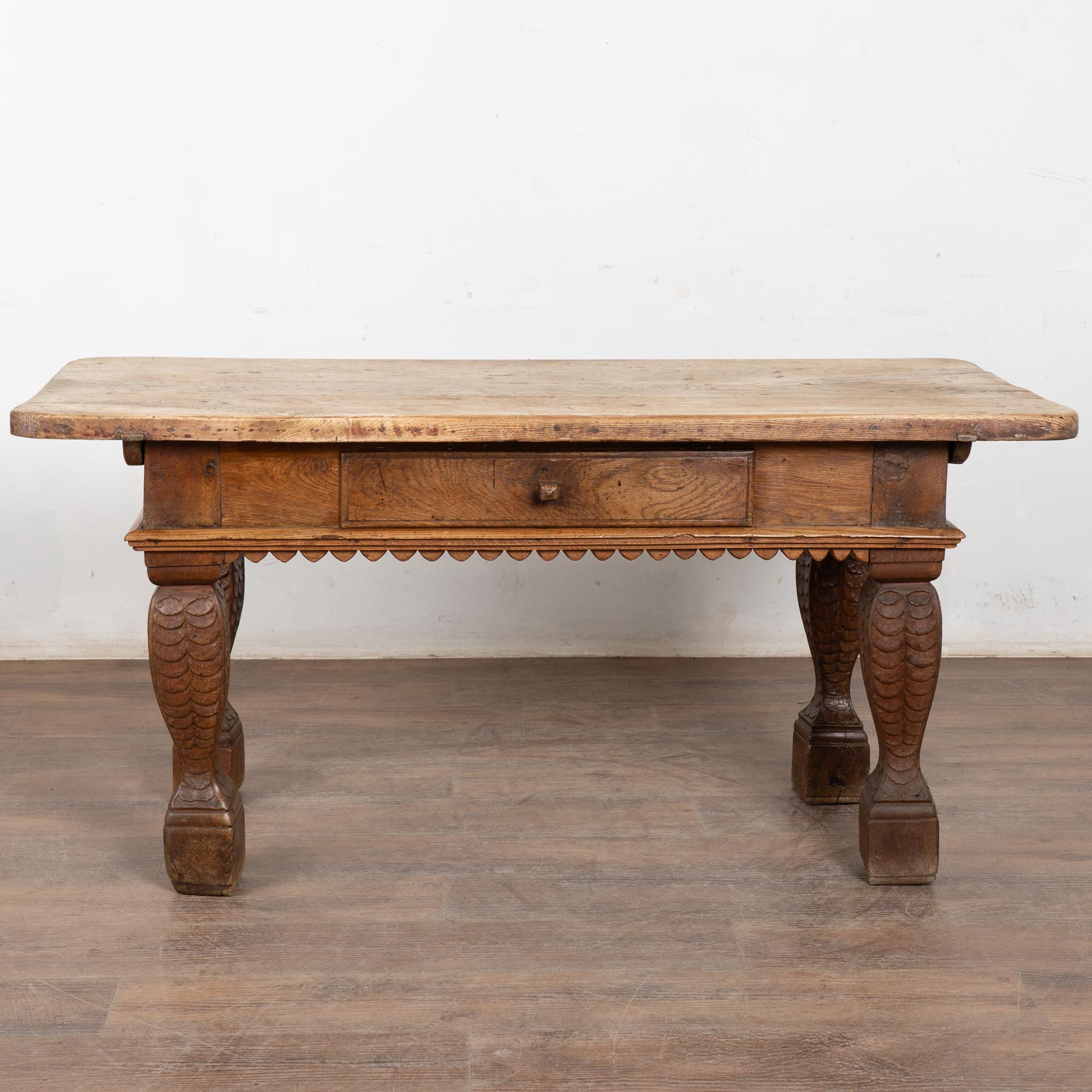 This handsome baroque style oak library table with one drawer has heavily turned and carved legs with scalloped skirt.