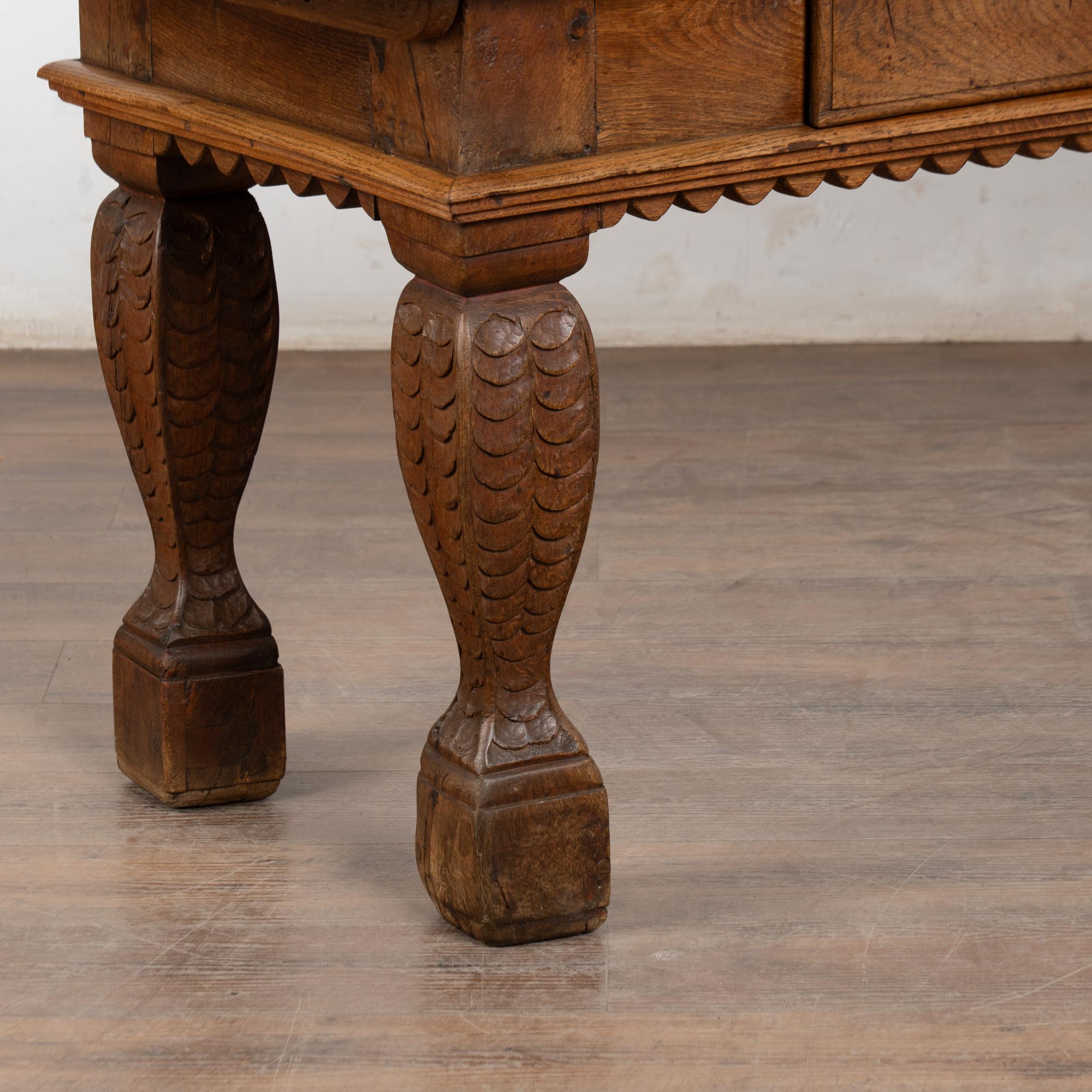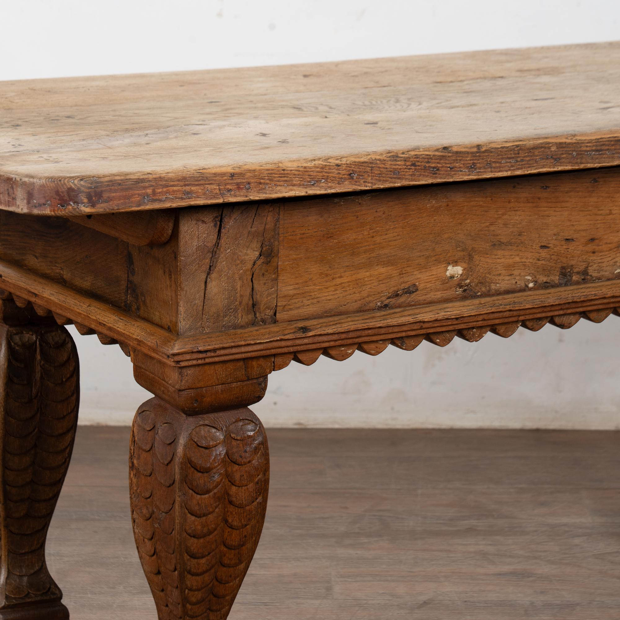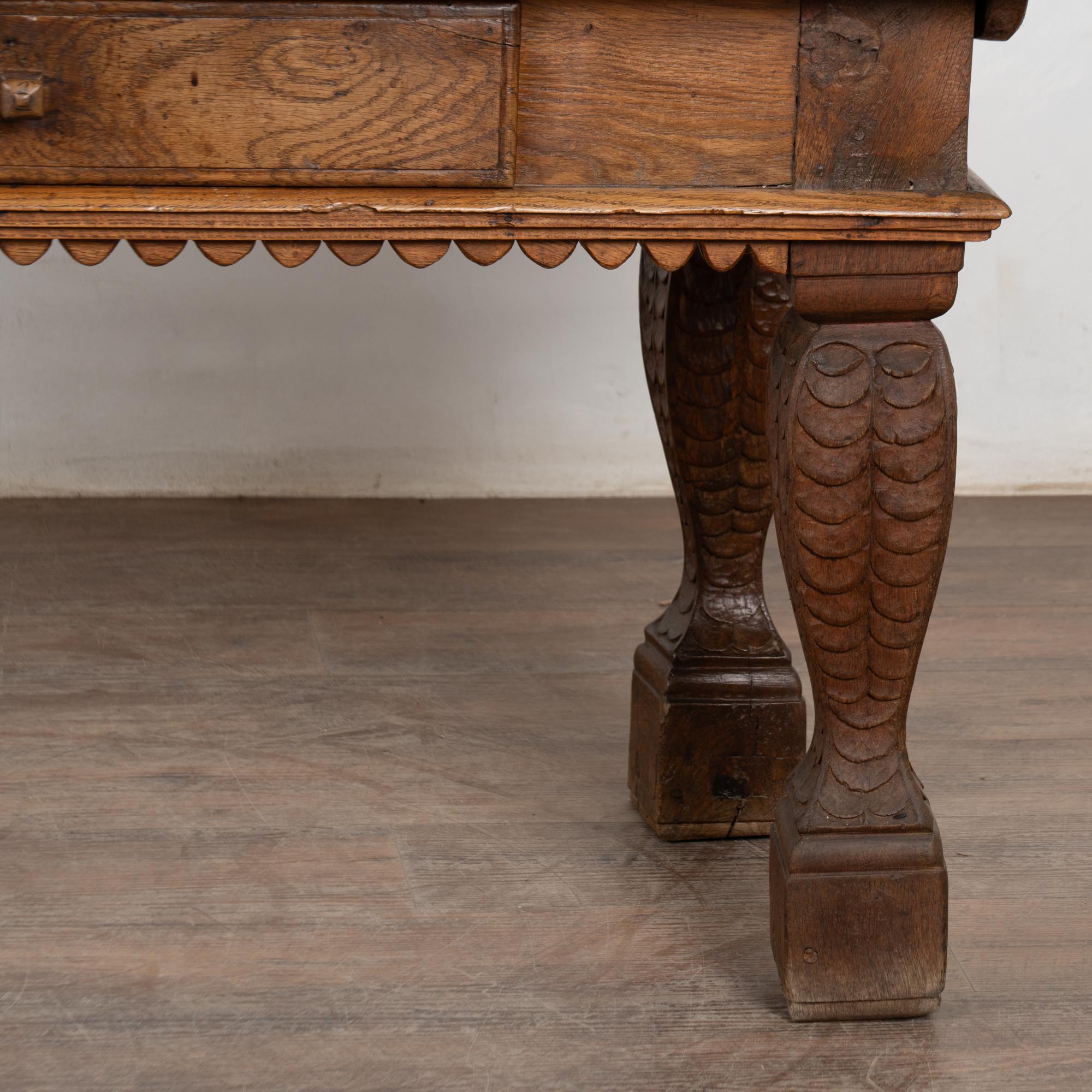 This handsome baroque style oak library table with one drawer has heavily turned and carved legs with scalloped skirt.