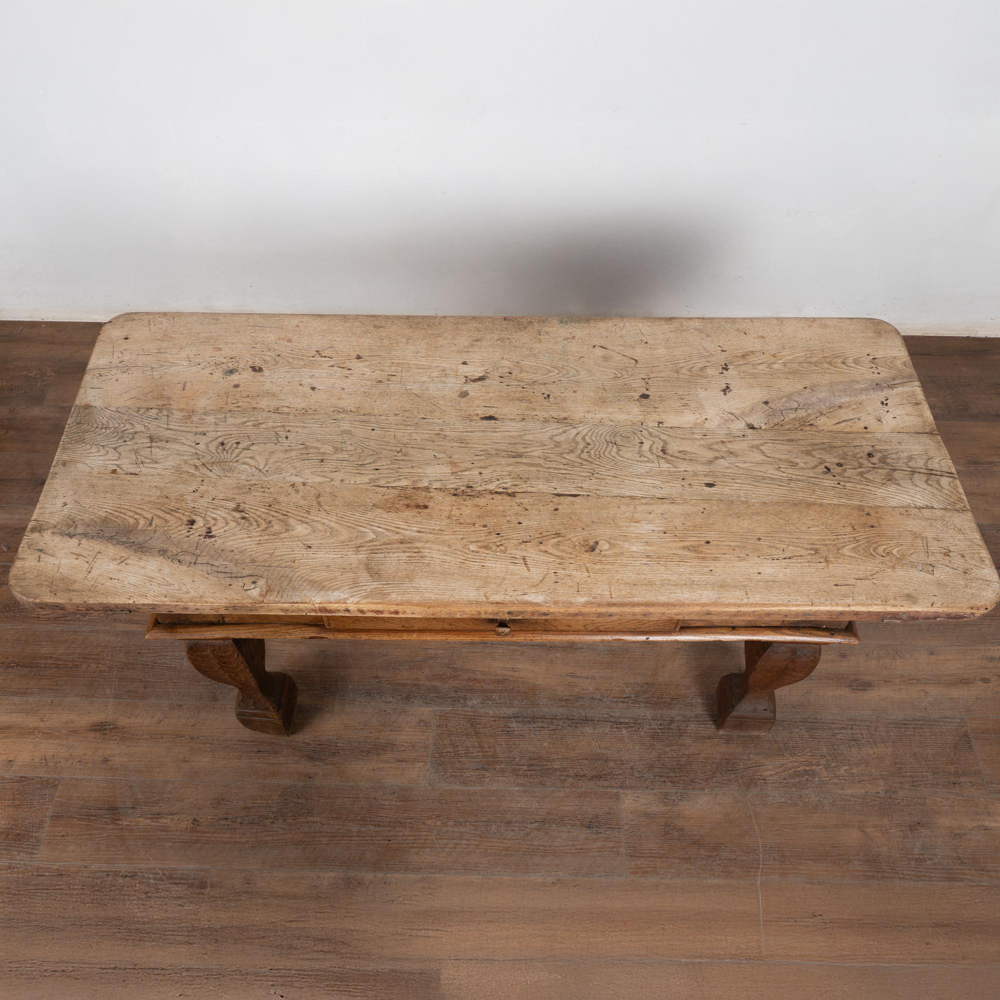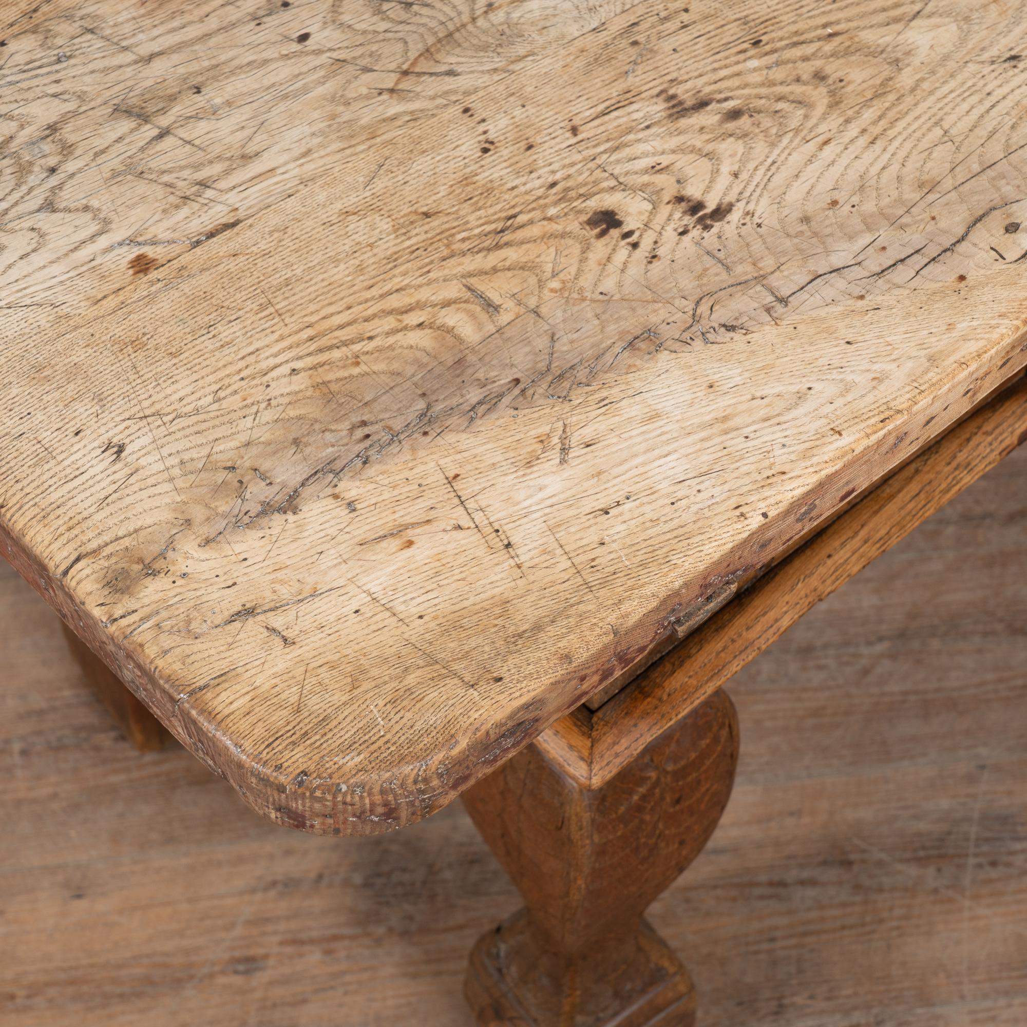 The top is all natural (lighter) oak with nicks, gouges, cracks and stains reflecting generations of use, likely as a work table.