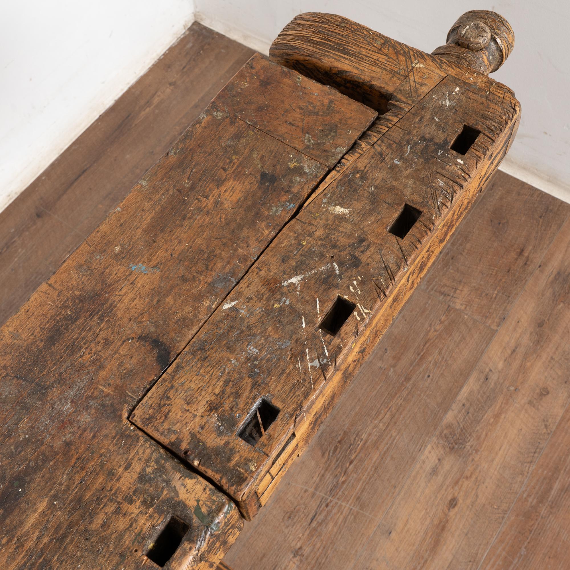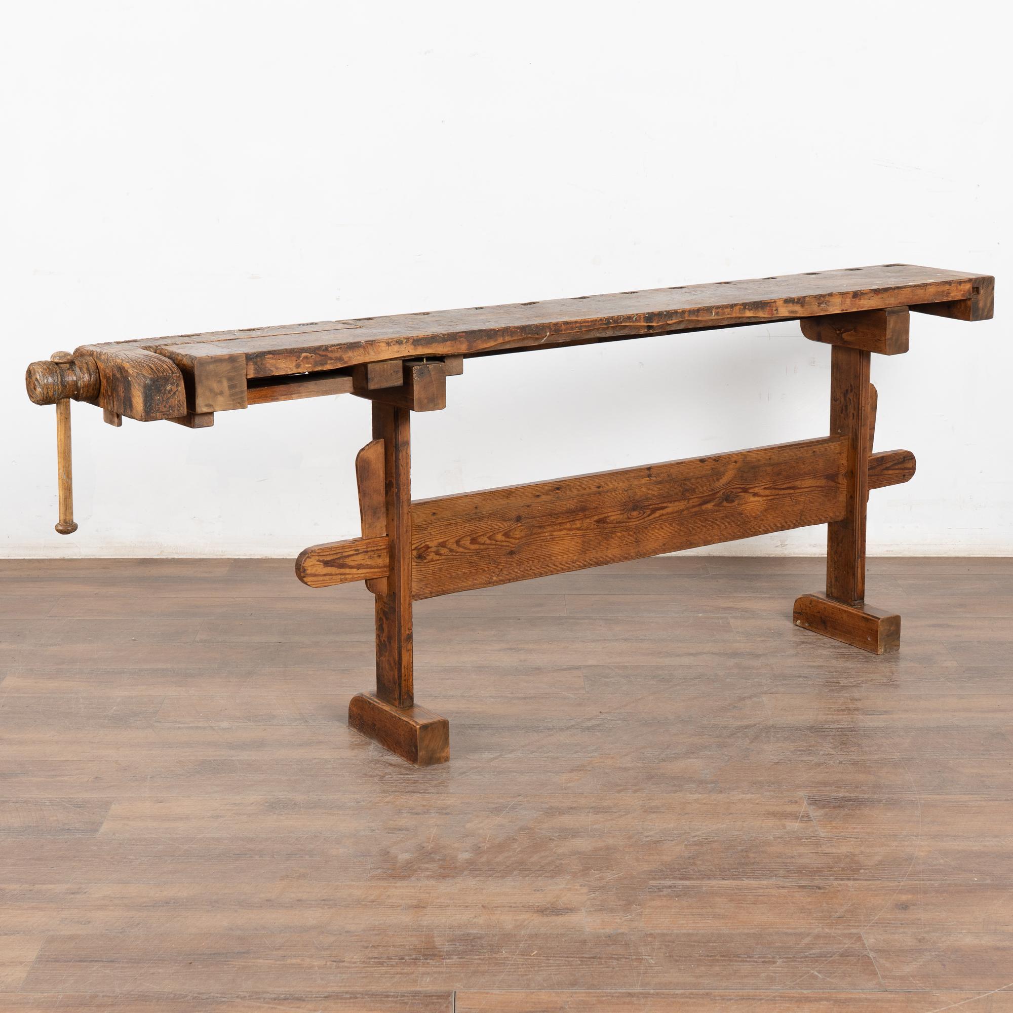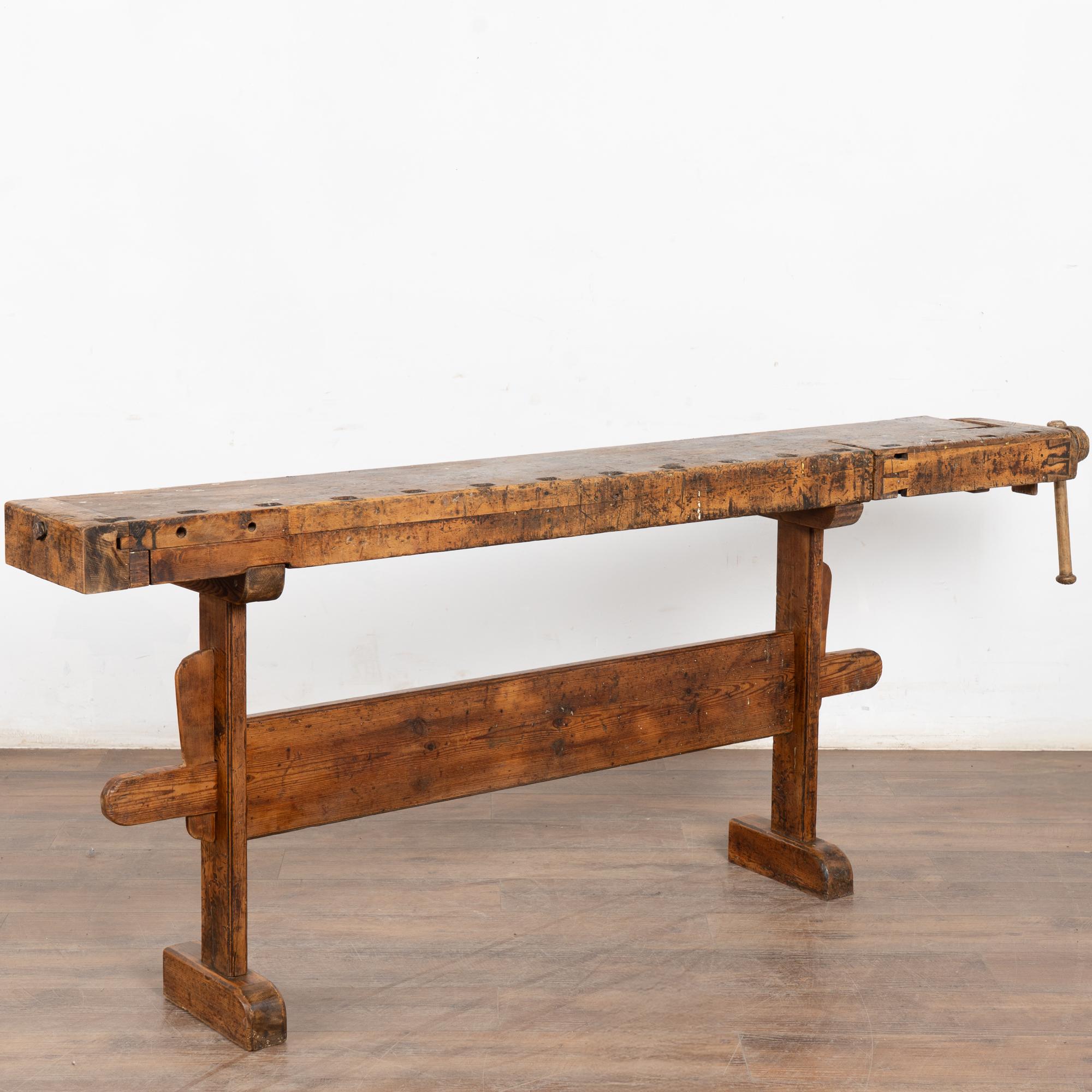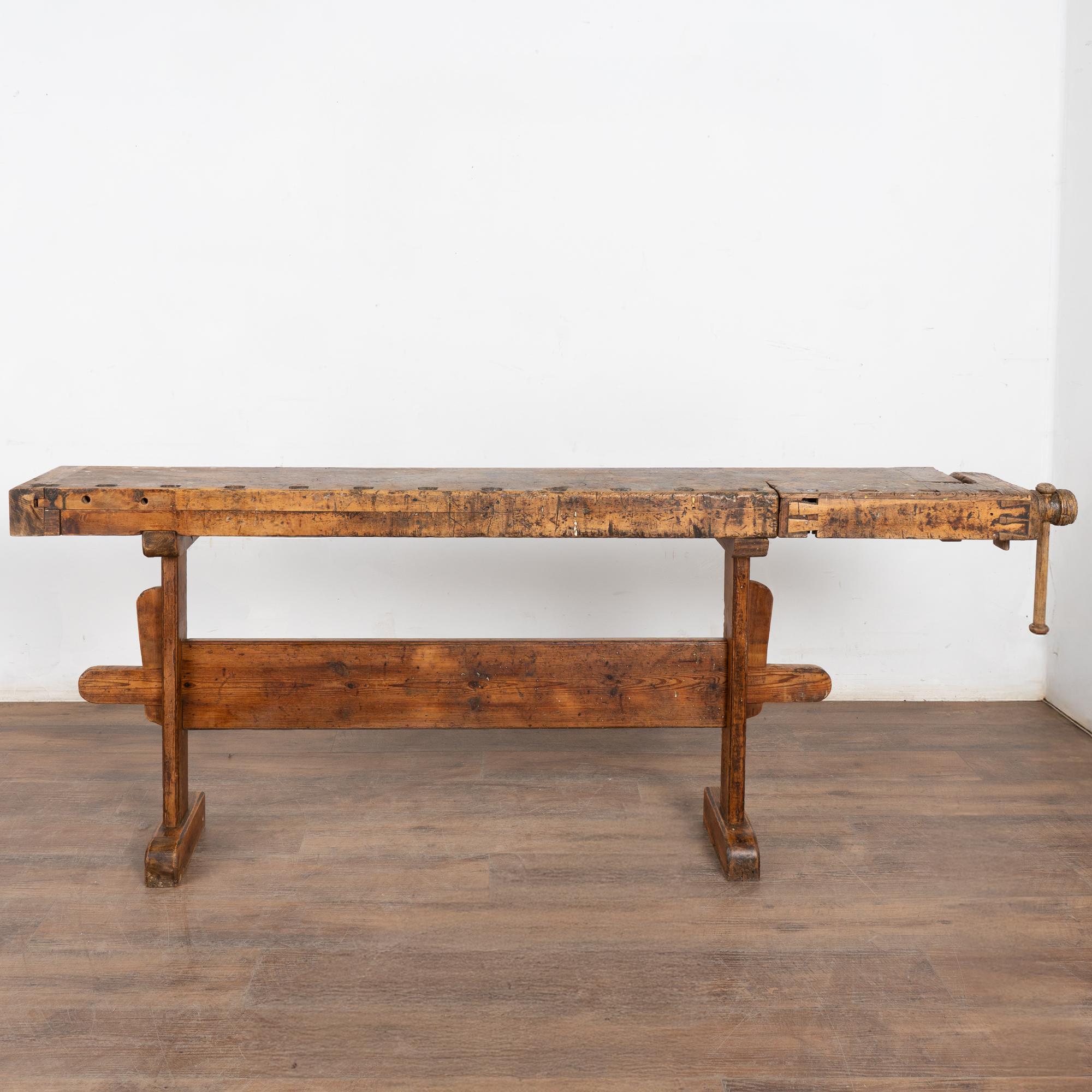The worn patina of this old carpenter's workbench is a reflection of its age and years of use. Every ding, scratch, deep gouge, paint spill and stain enrich its character and appeal. Please examine the close up photos to appreciate the patina, joints and old vice.
