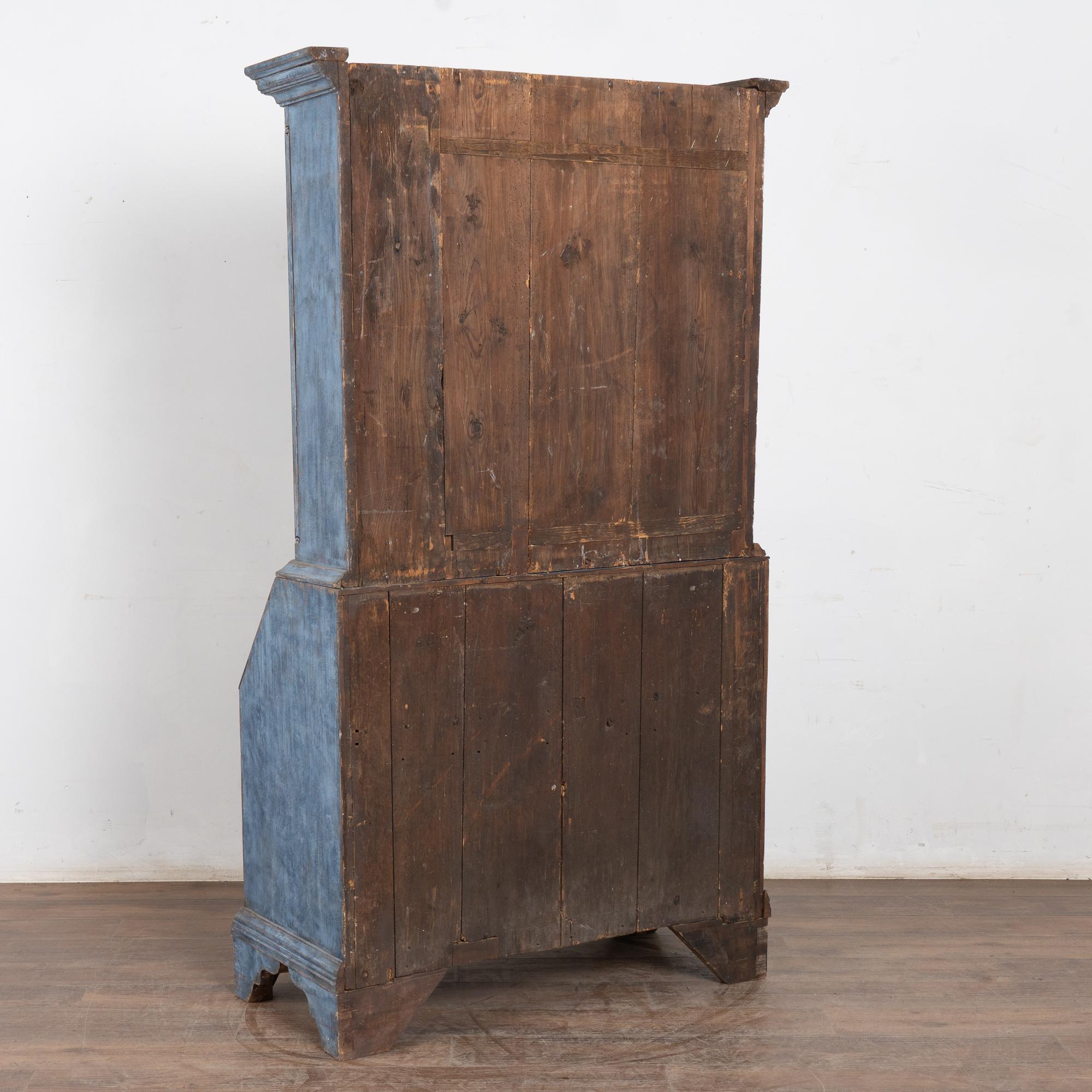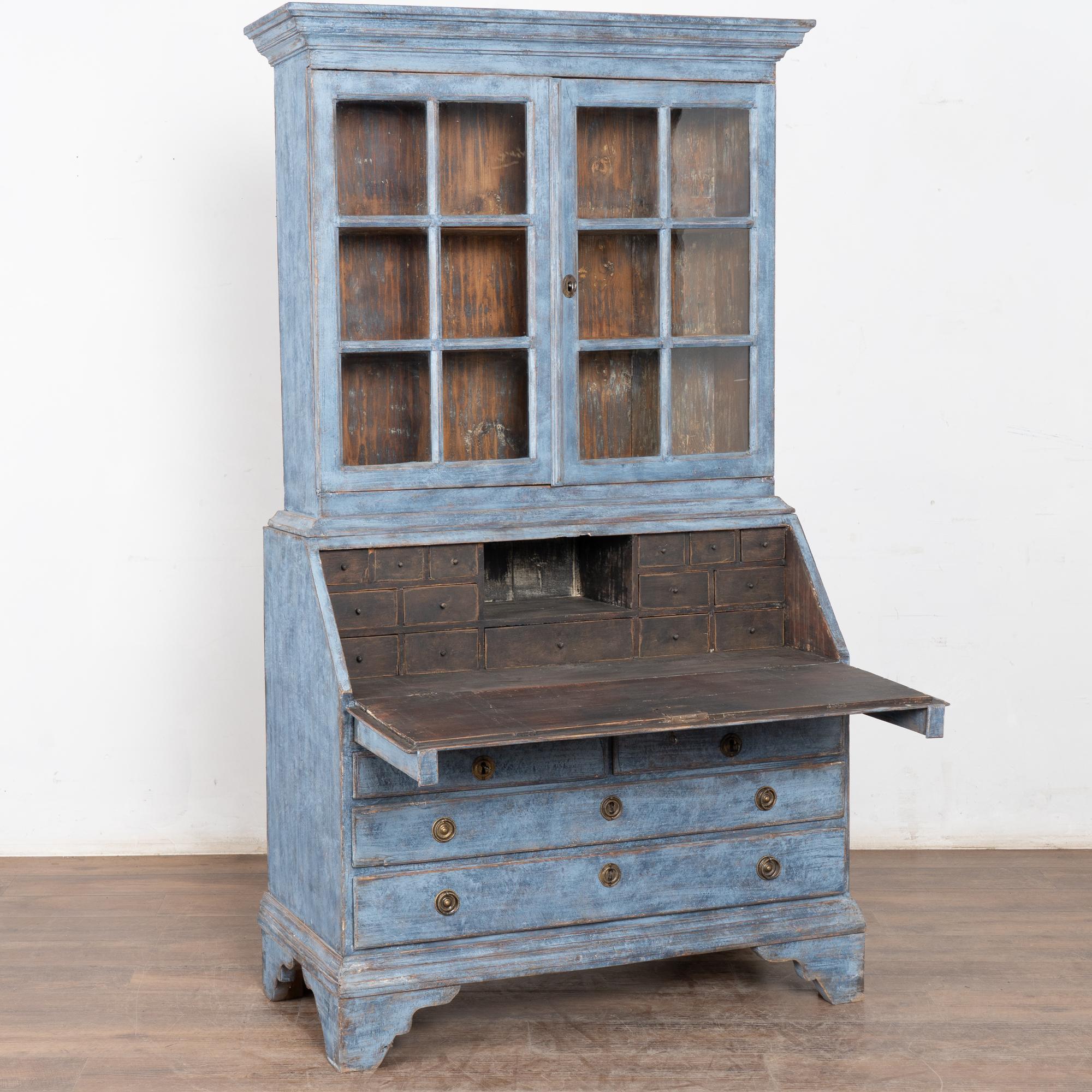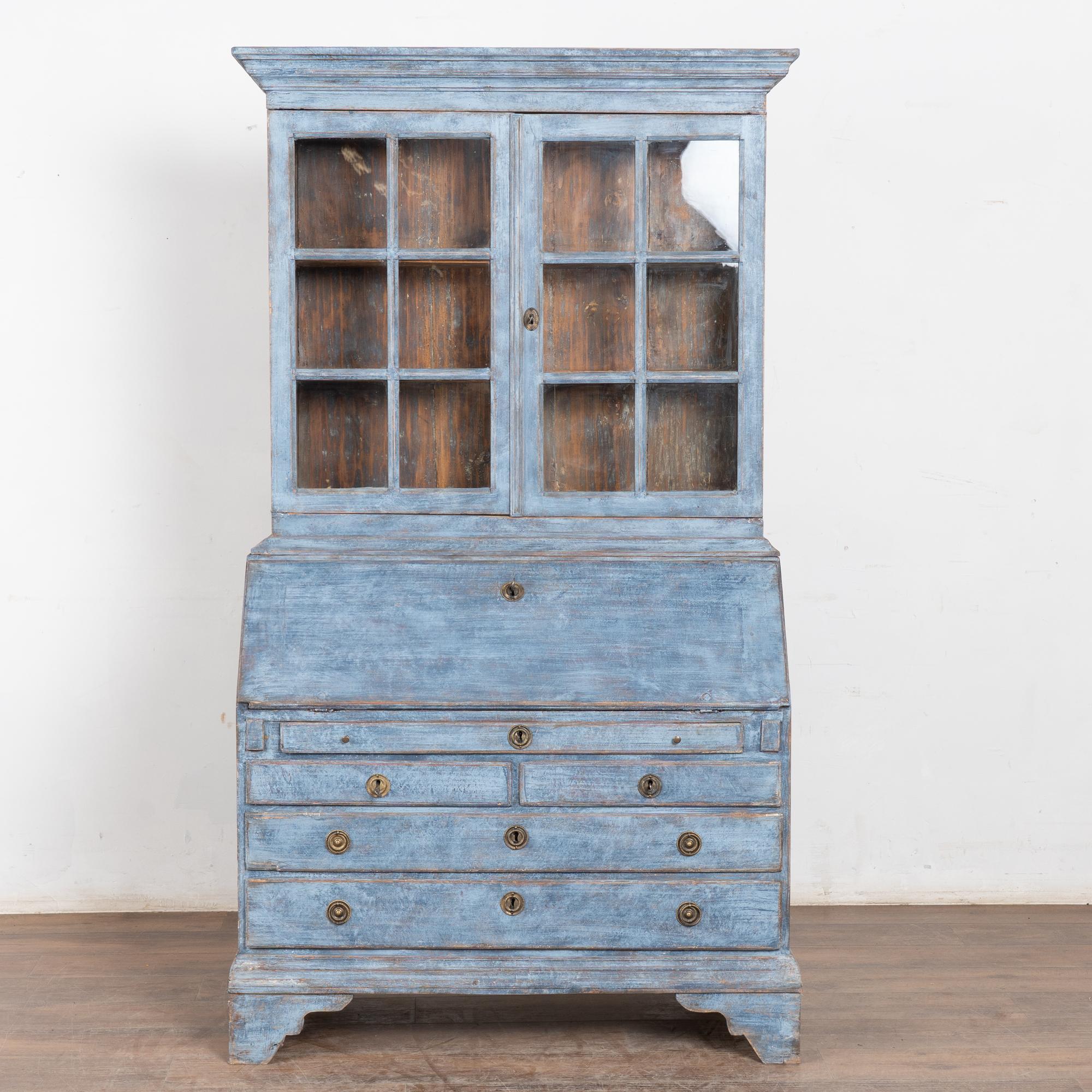 Mid 19th-century Swedish pine secretary with newer professionally applied layered blue exterior painted finish. Upper glass panes allow for beautiful display of any collection held within.