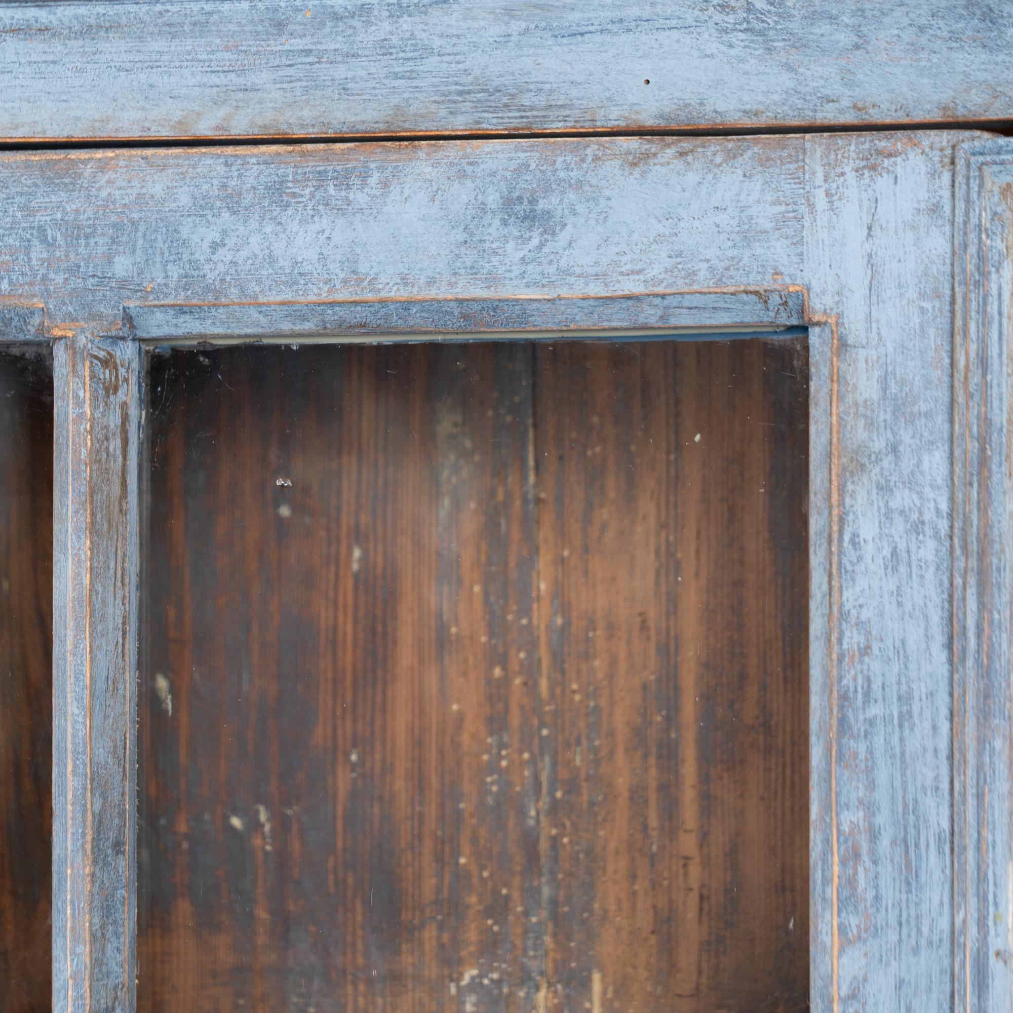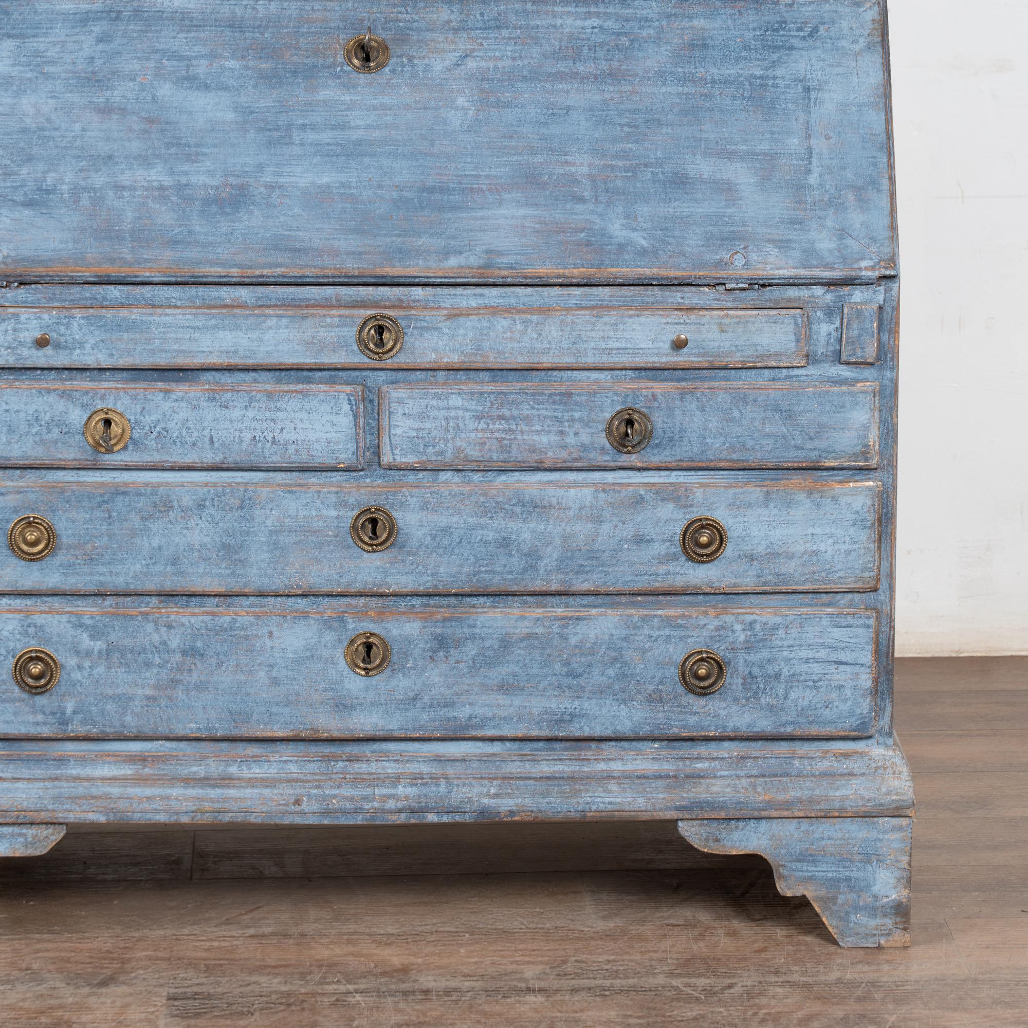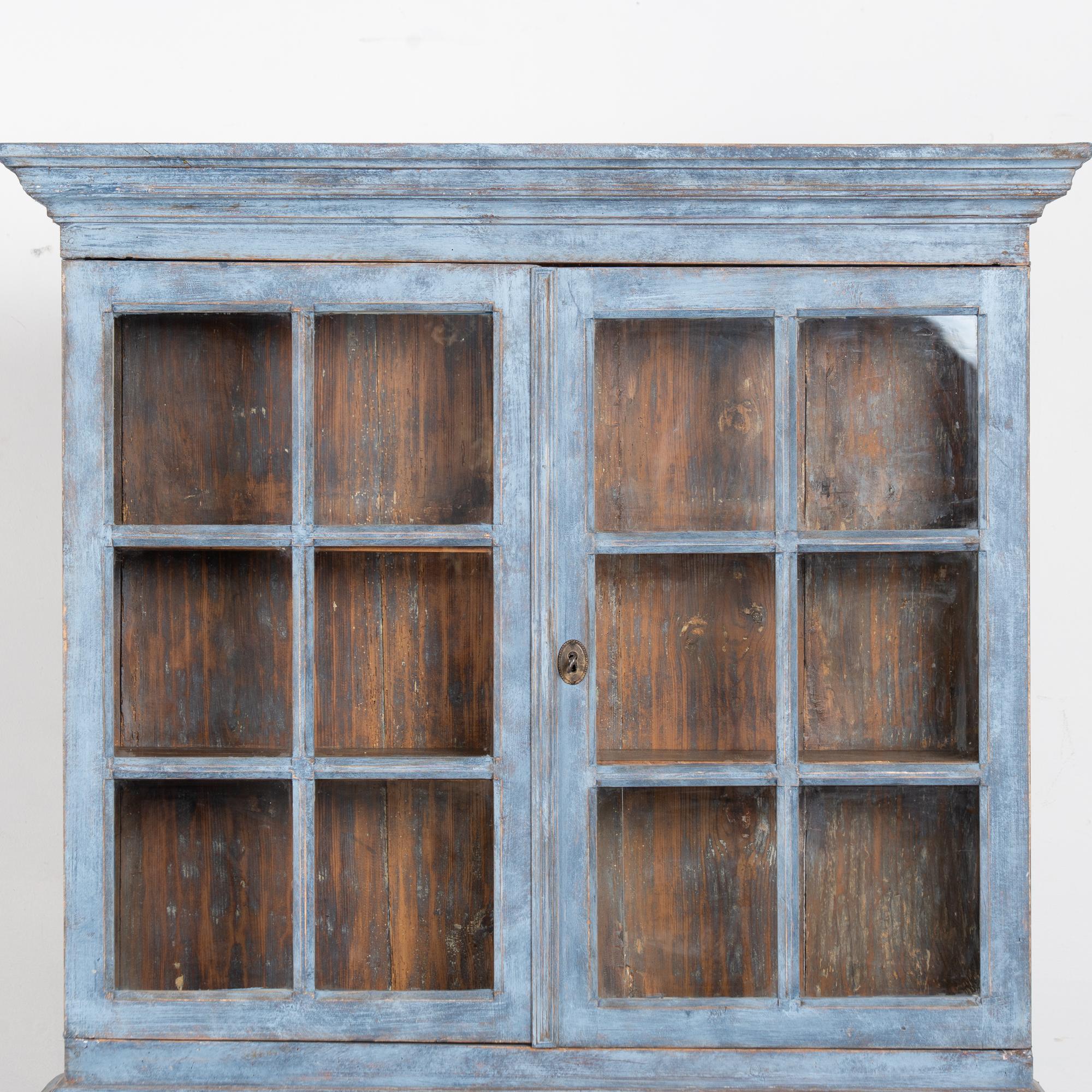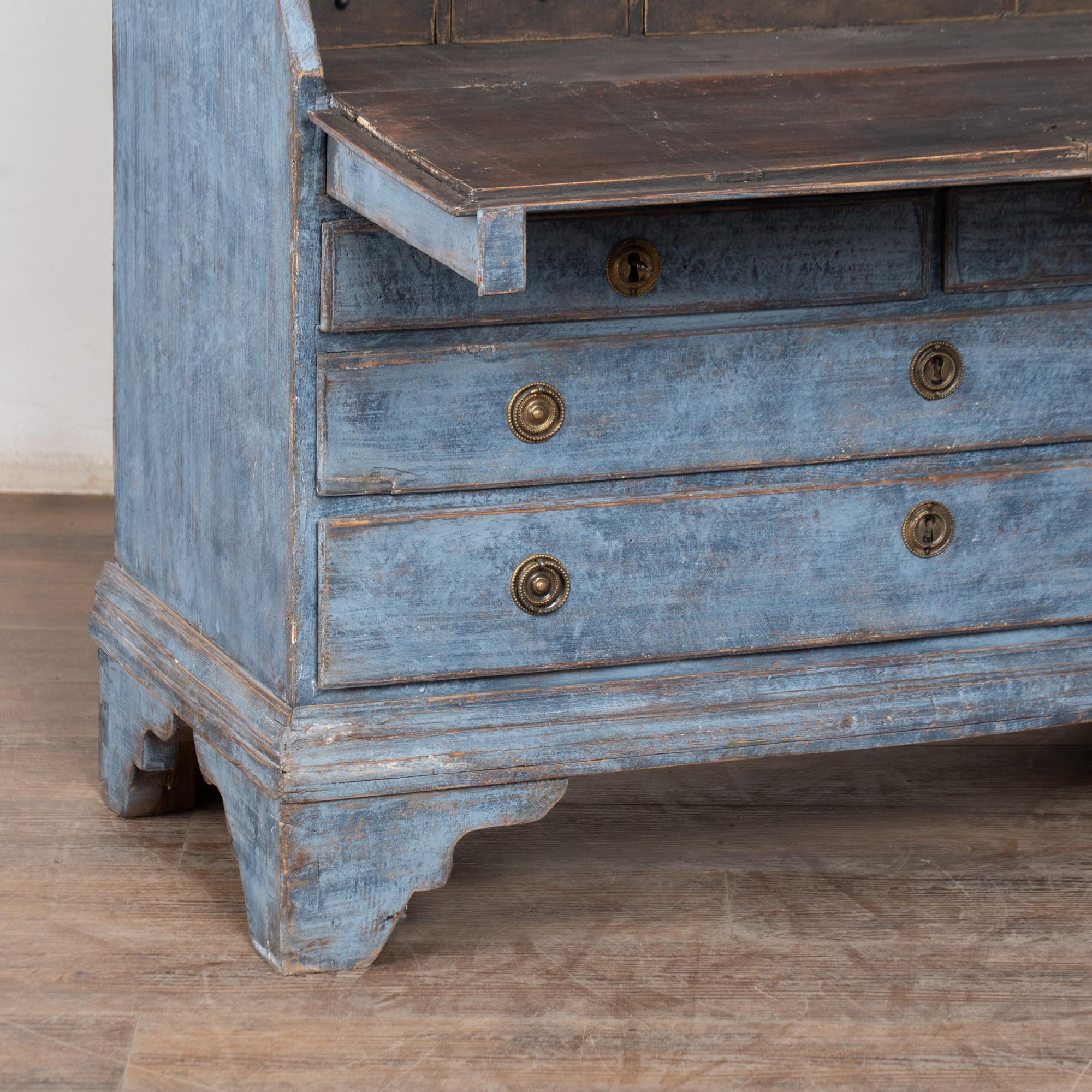 Mid 19th-century Swedish pine secretary with newer professionally applied layered blue exterior painted finish. Upper glass panes allow for beautiful display of any collection held within.