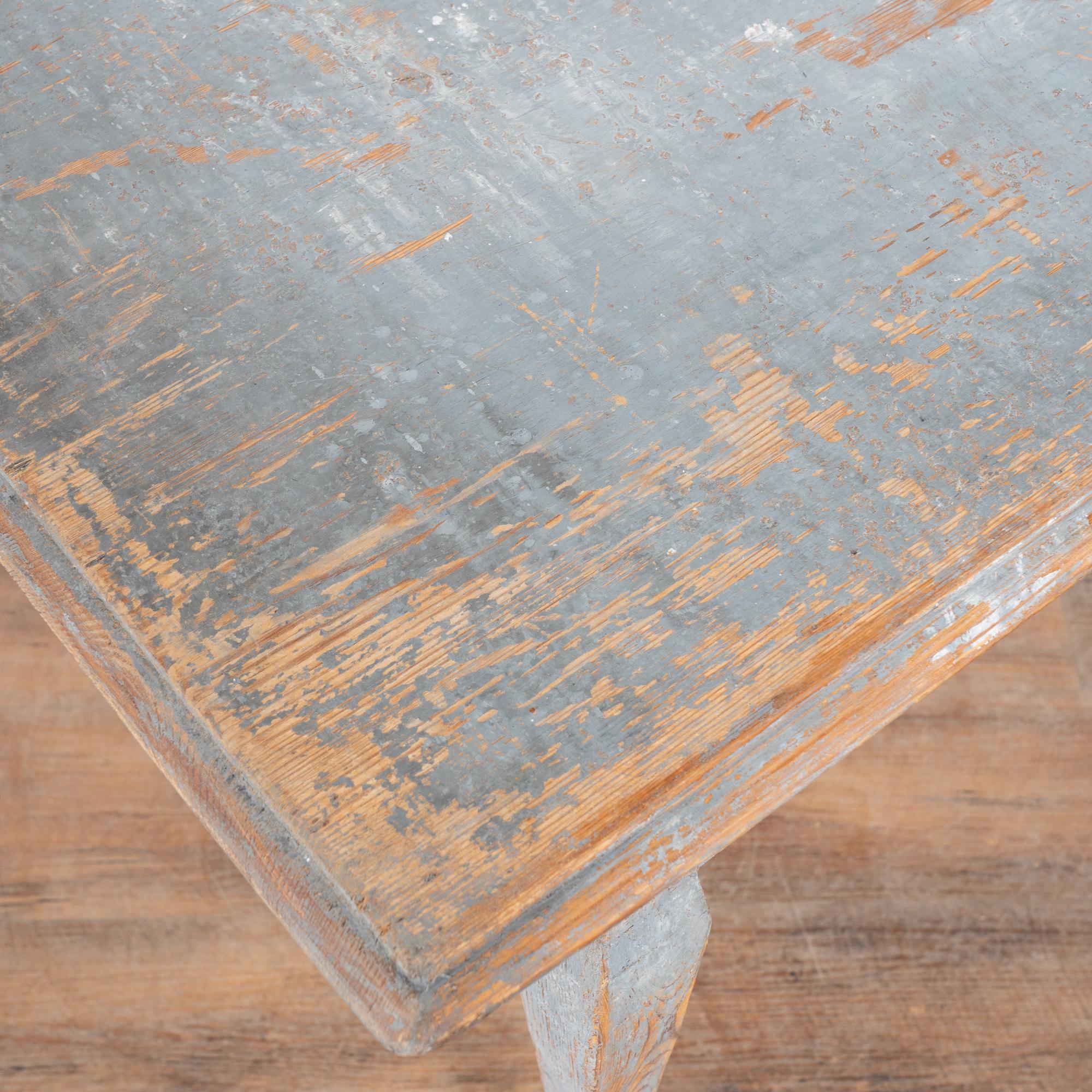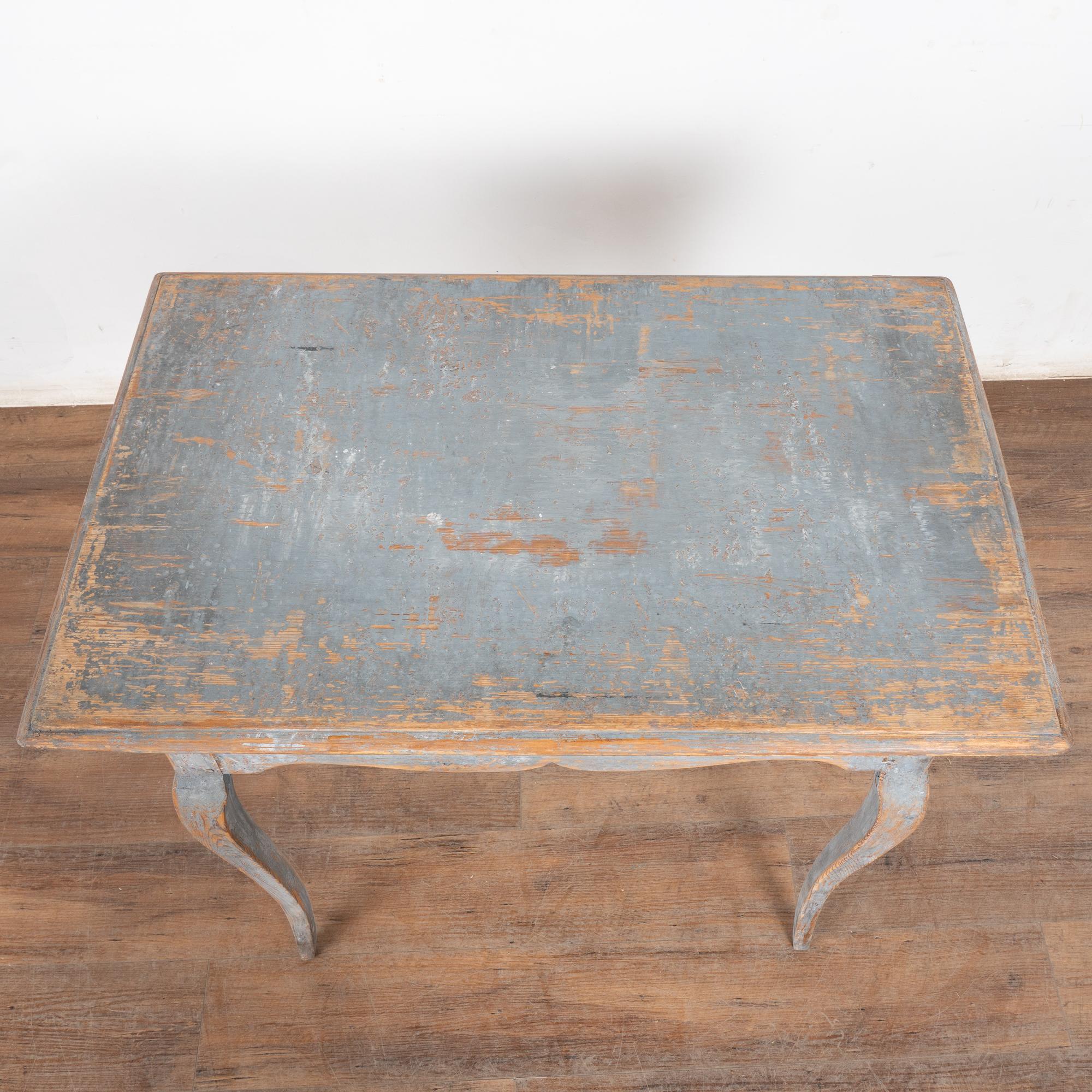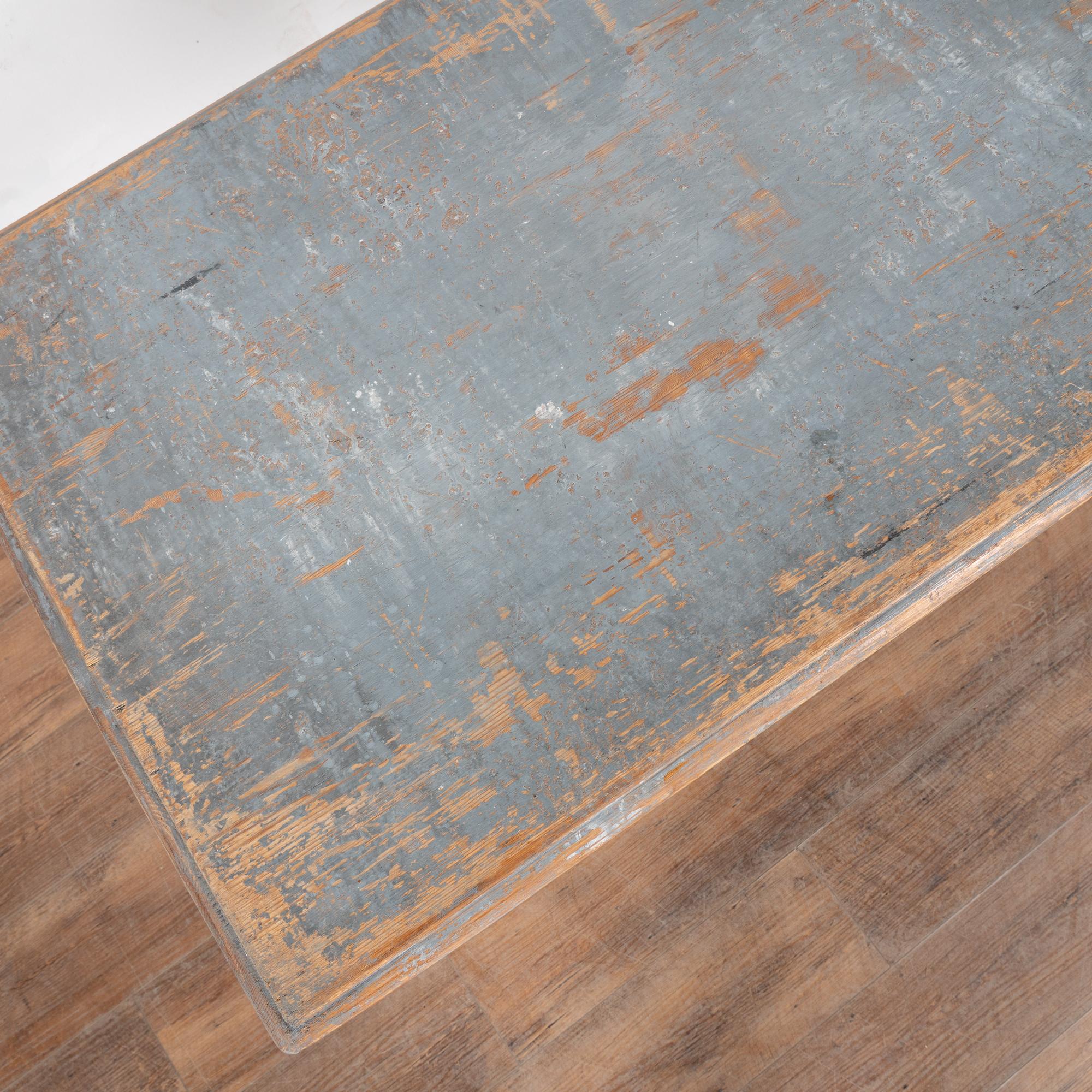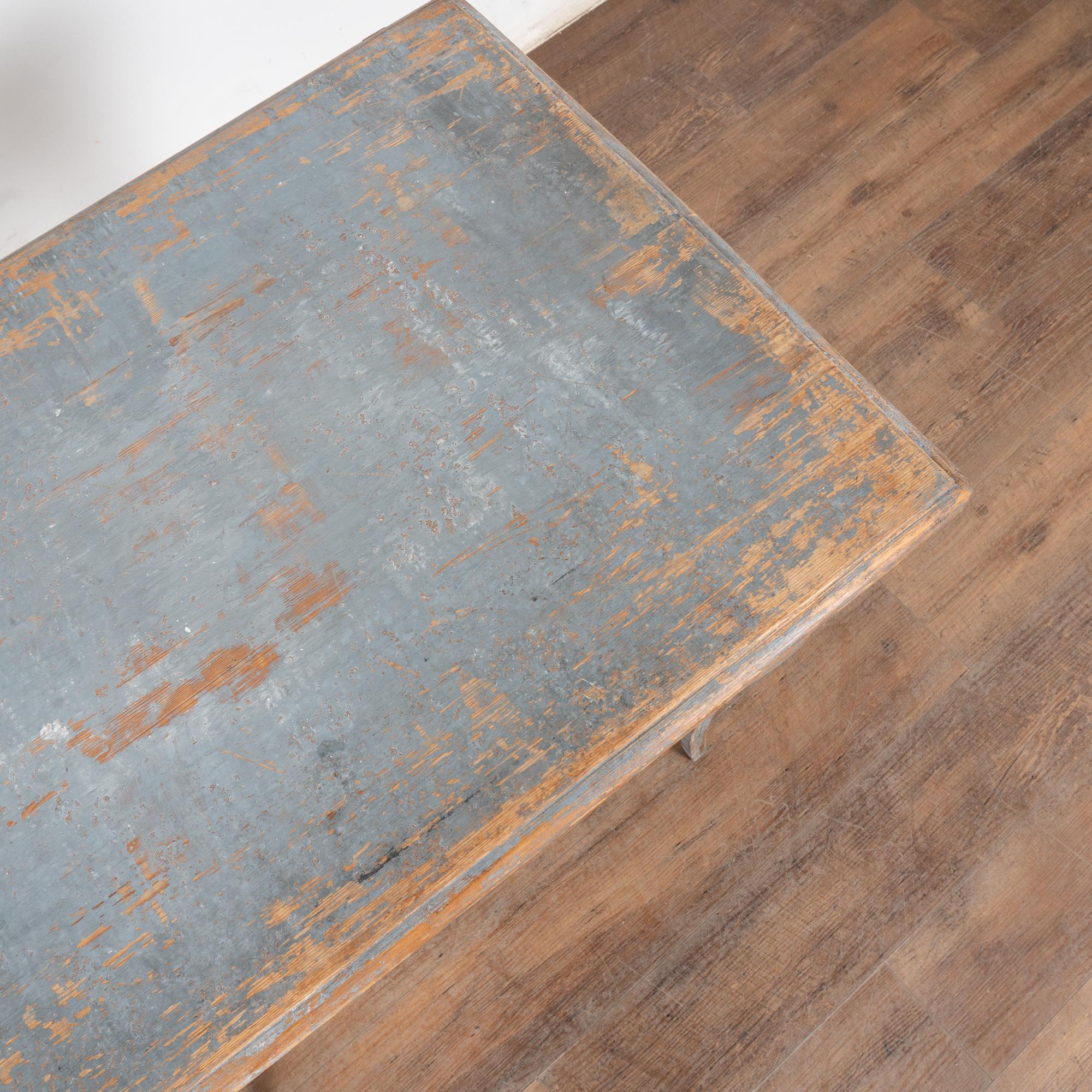 The original blue gray painted finish has been much distressed through generations of use, revealing the natural pine below. See top, legs, etc.