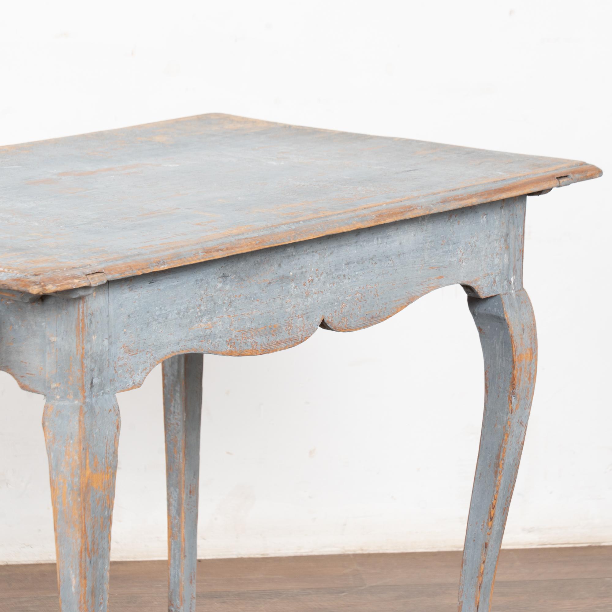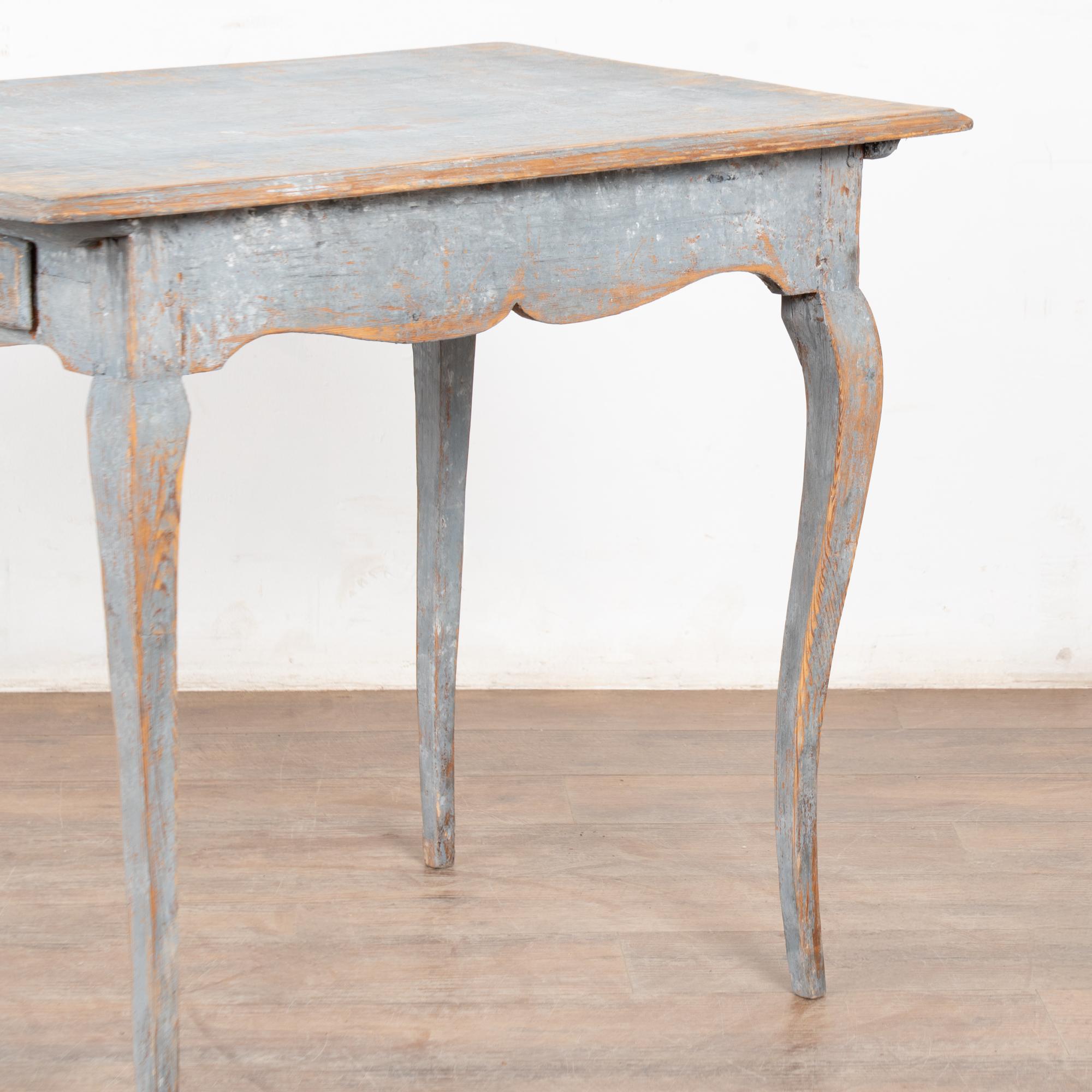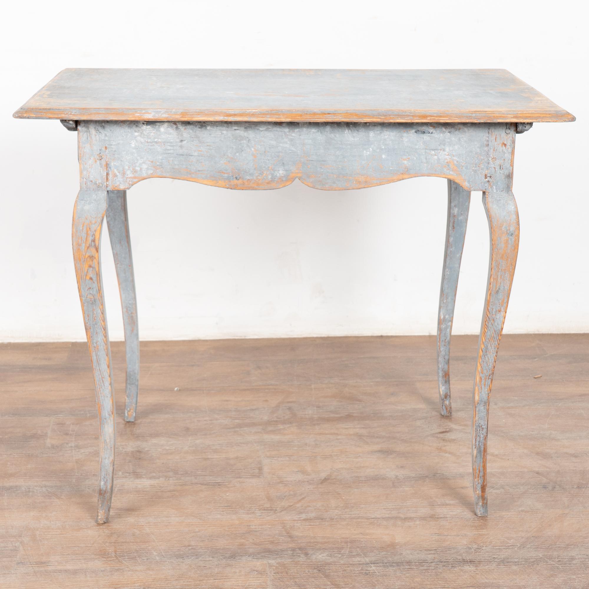 The original blue gray painted finish has been much distressed through generations of use, revealing the natural pine below. See top, legs, etc.