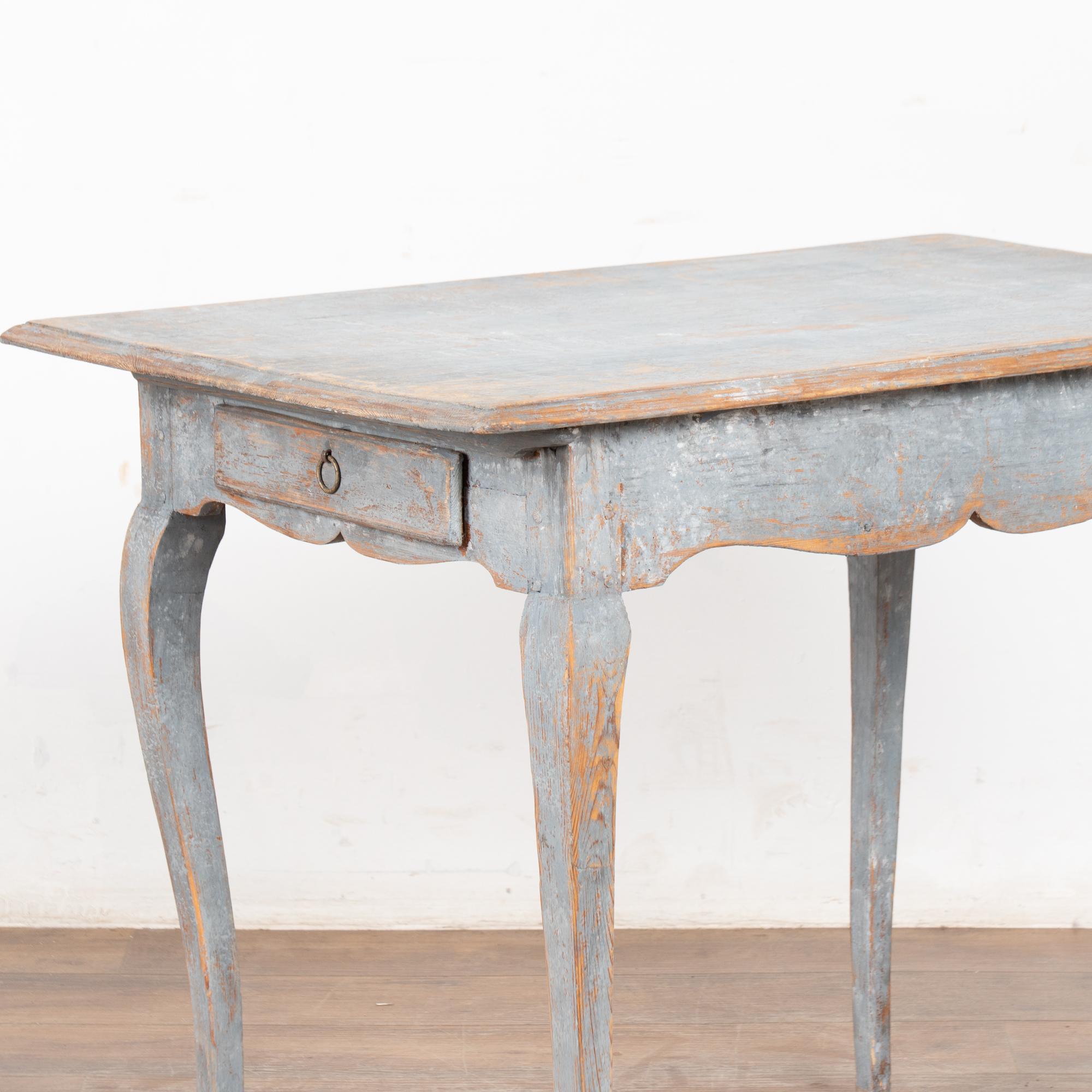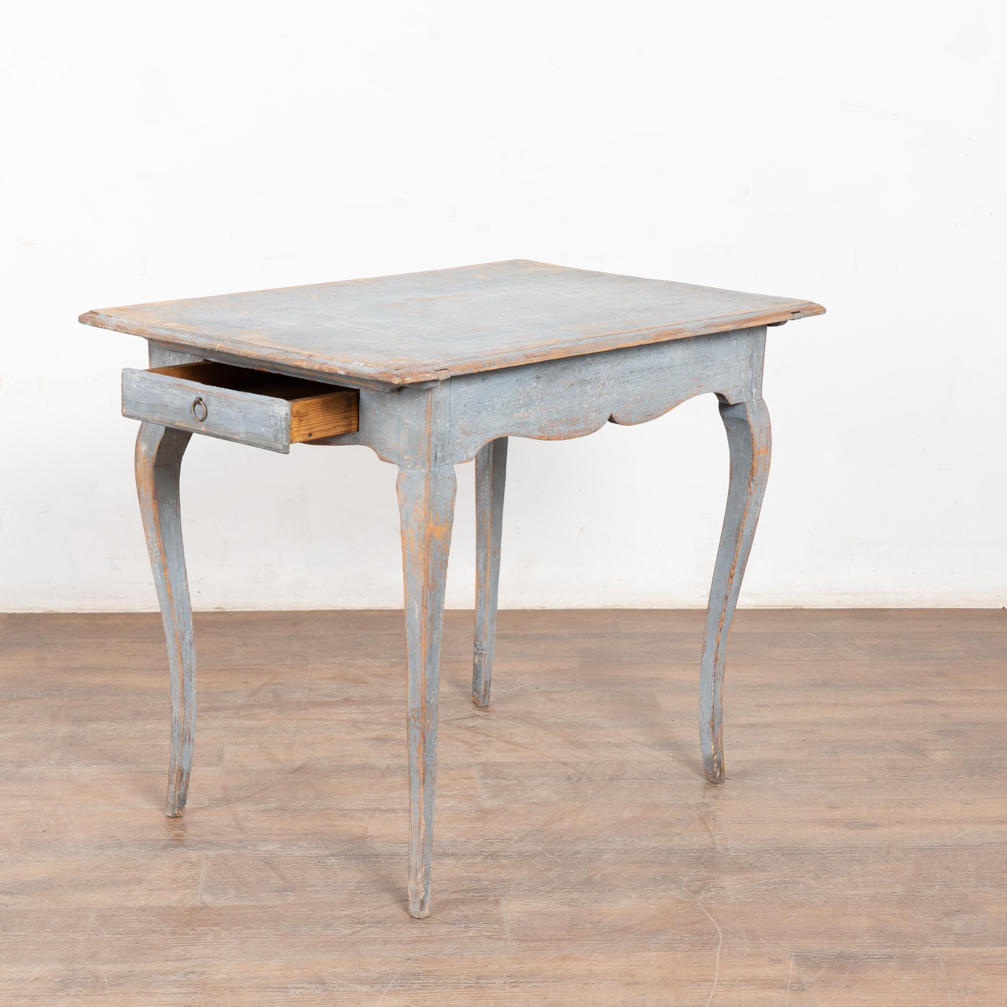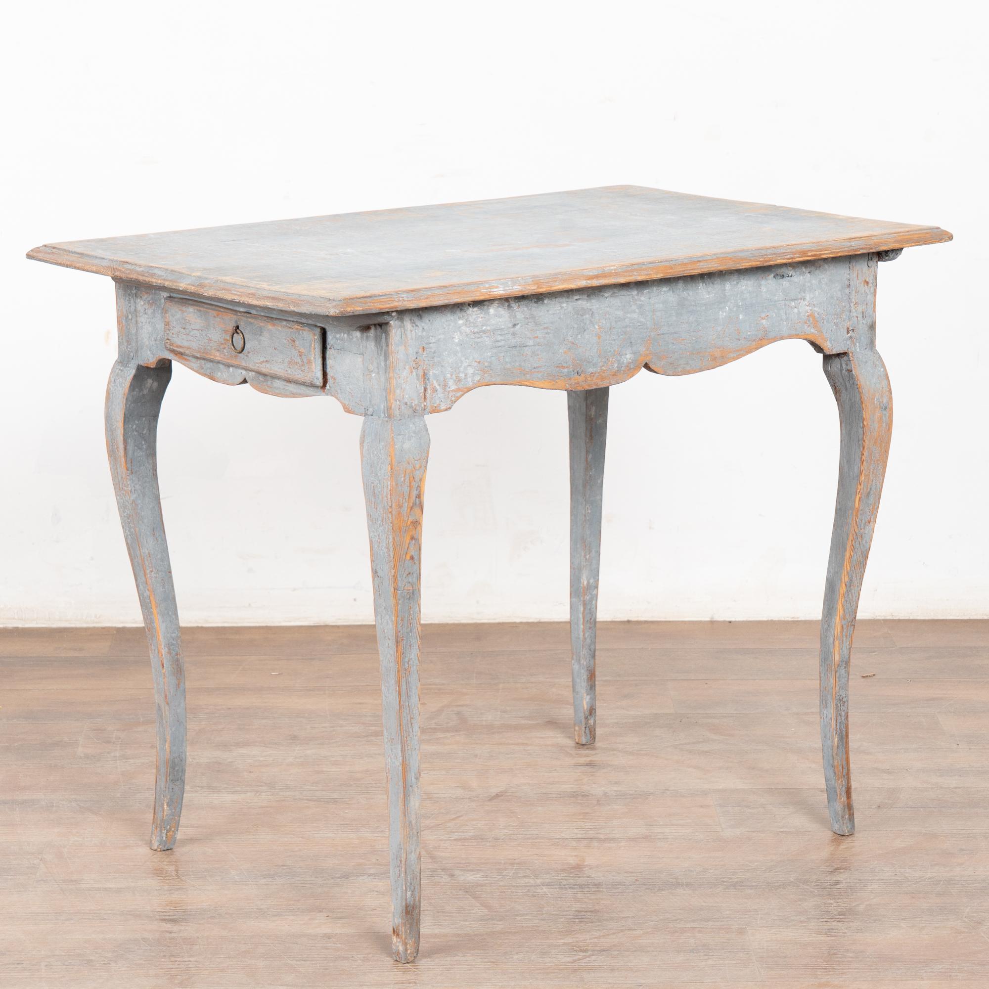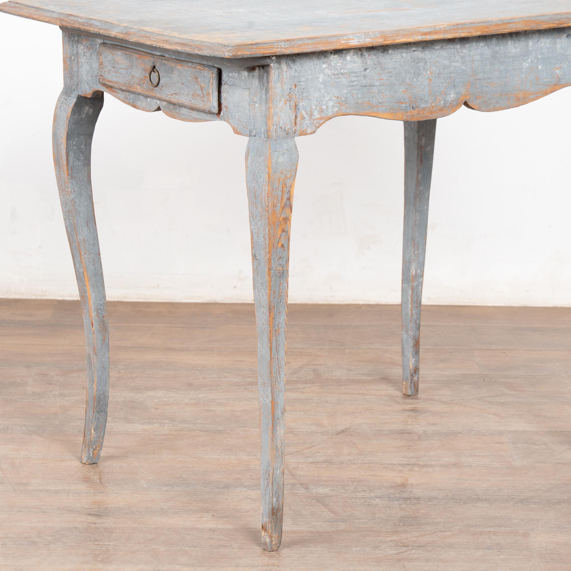 The original blue gray painted finish has been much distressed through generations of use, revealing the natural pine below. See top, legs, etc.