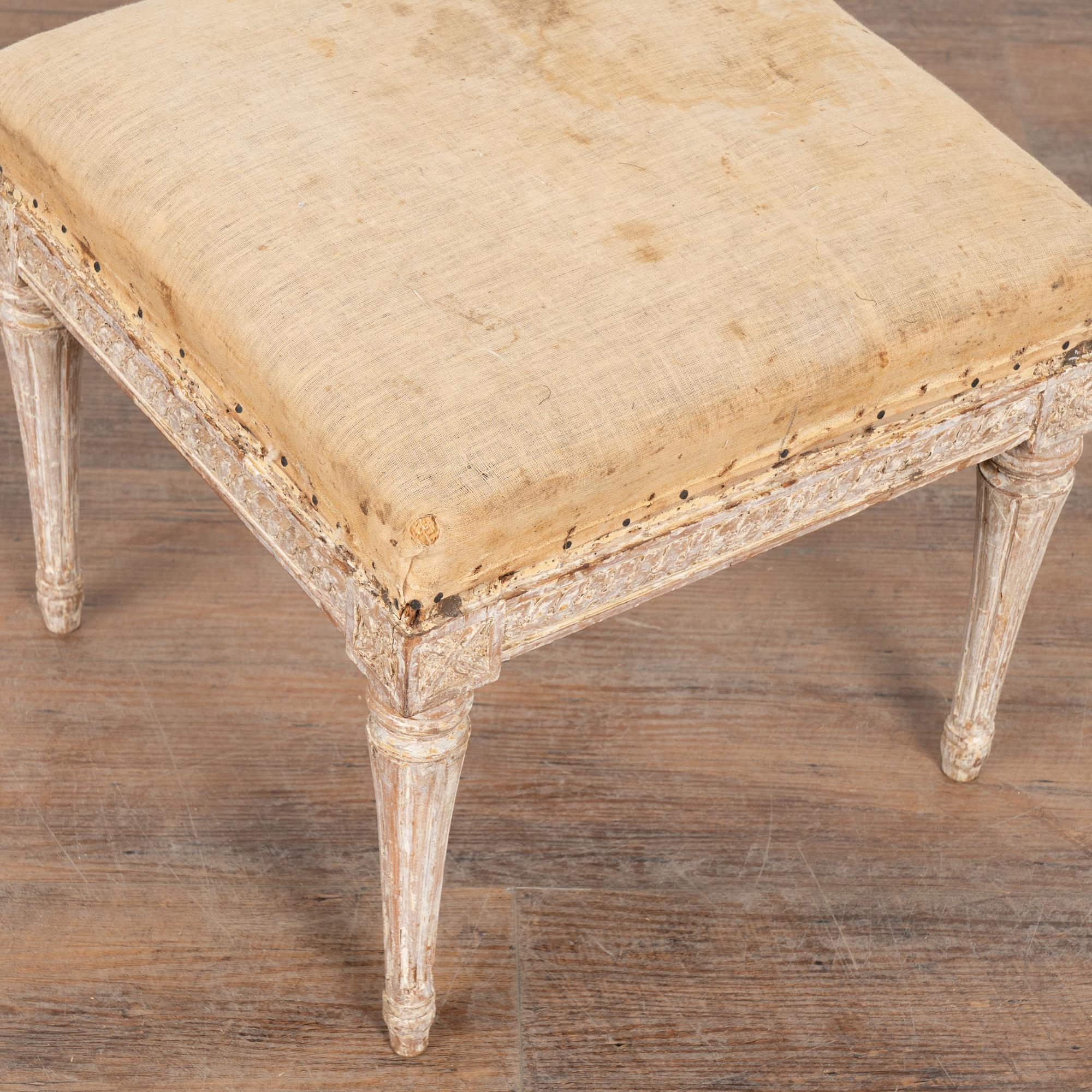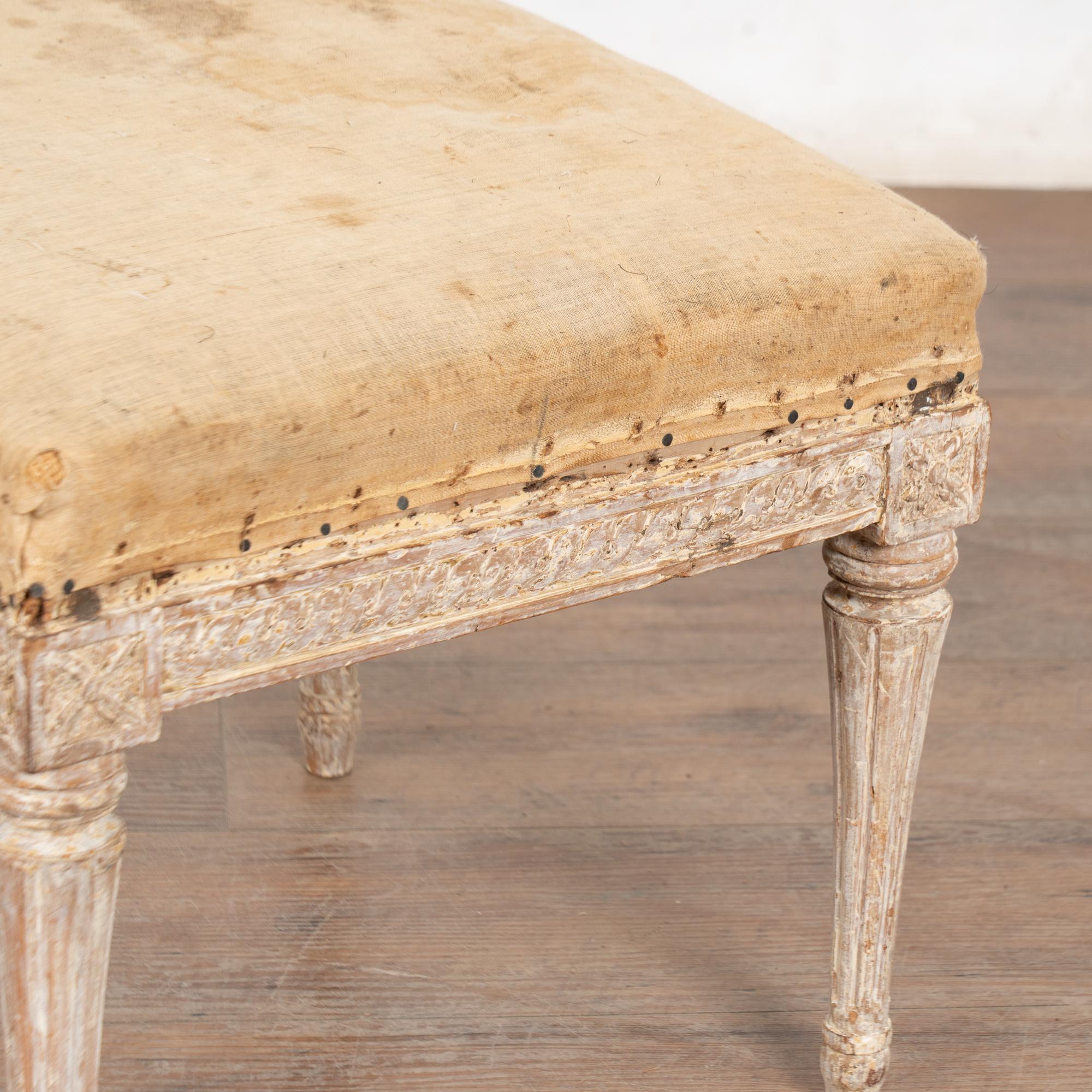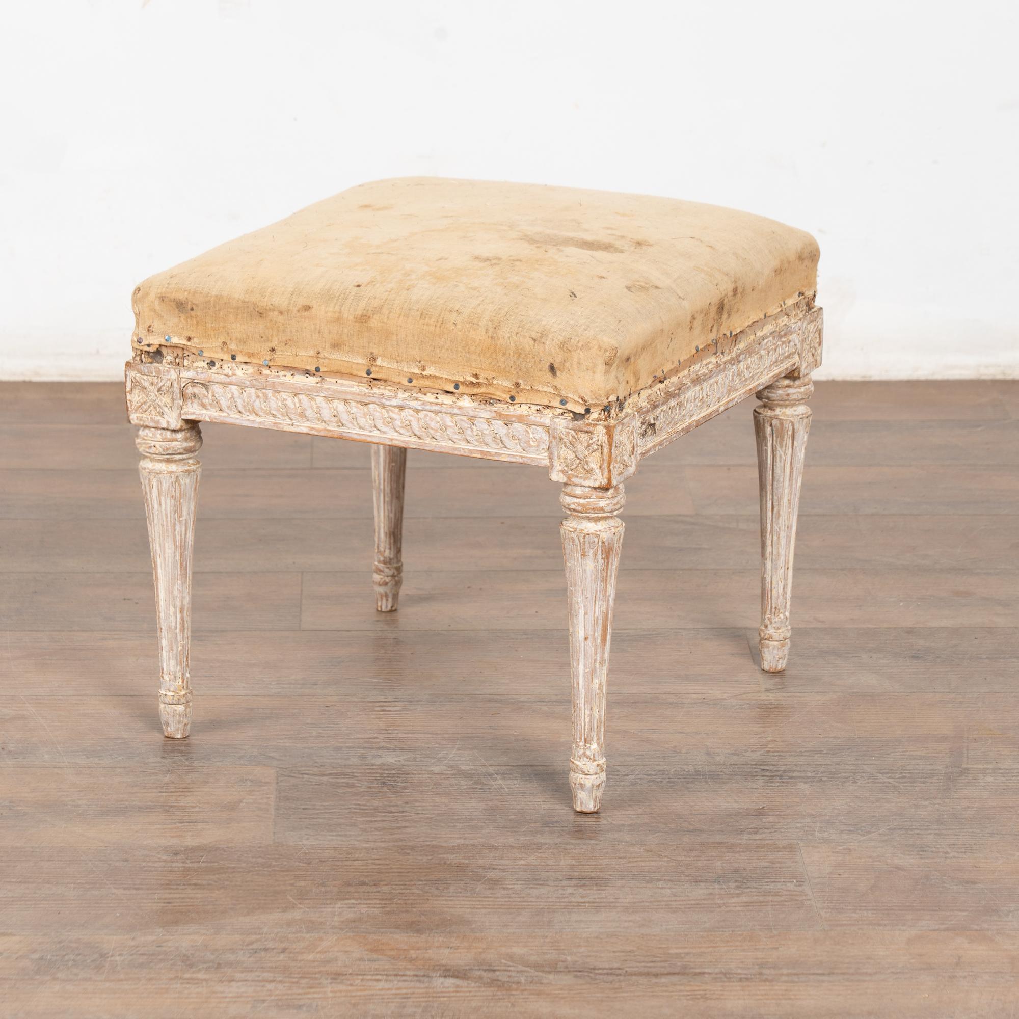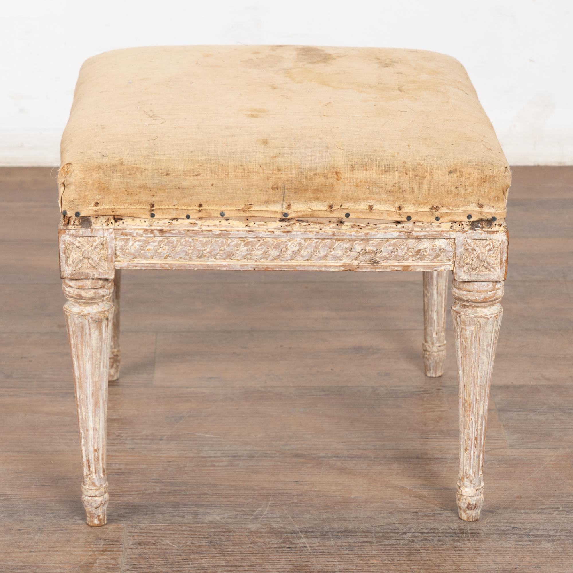 The antique white painted finish has been gently scraped and distressed fitting the age and romantic appeal of this Swedish stool.