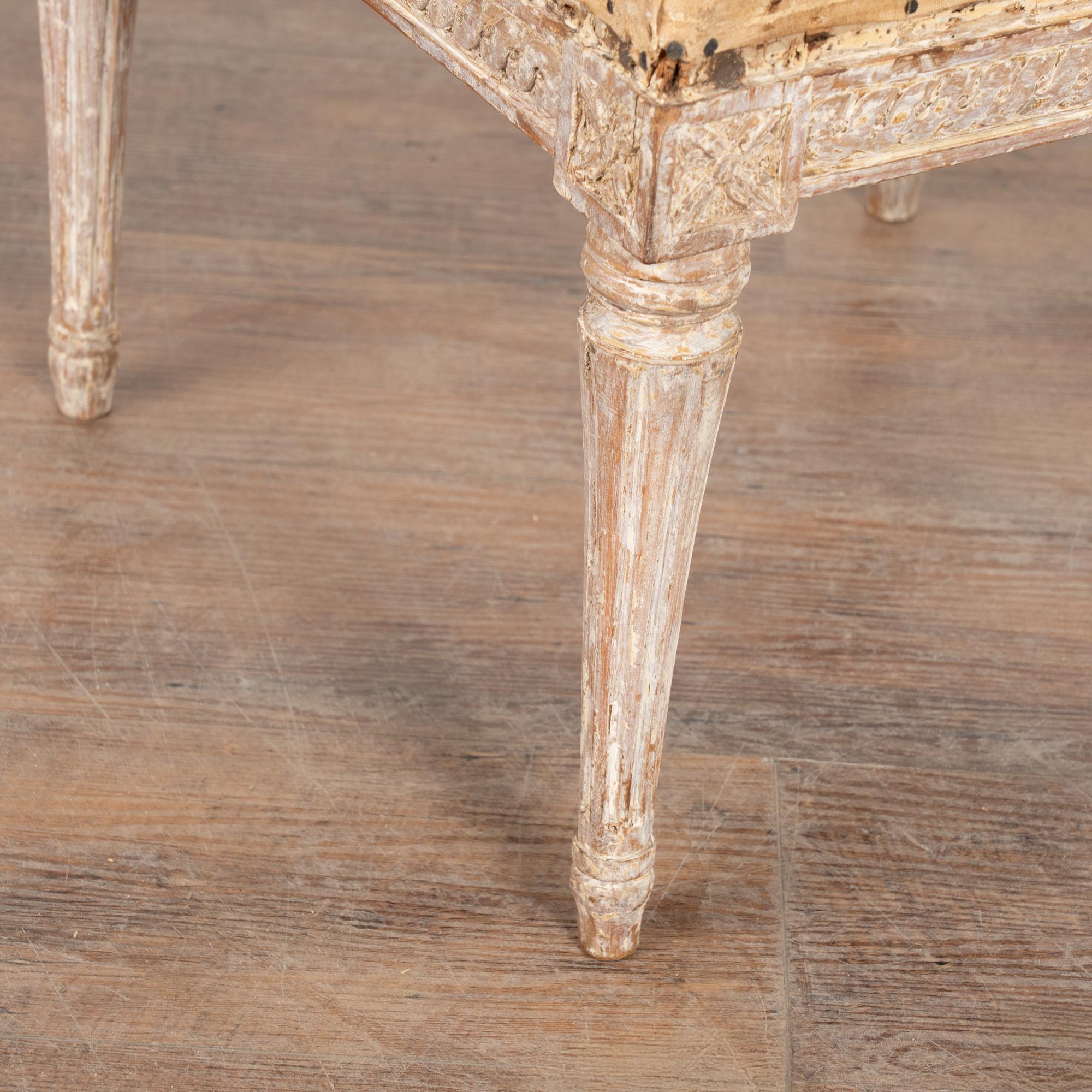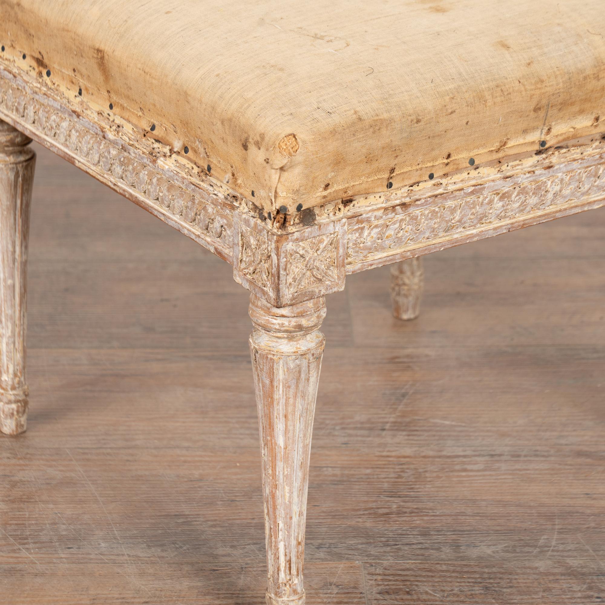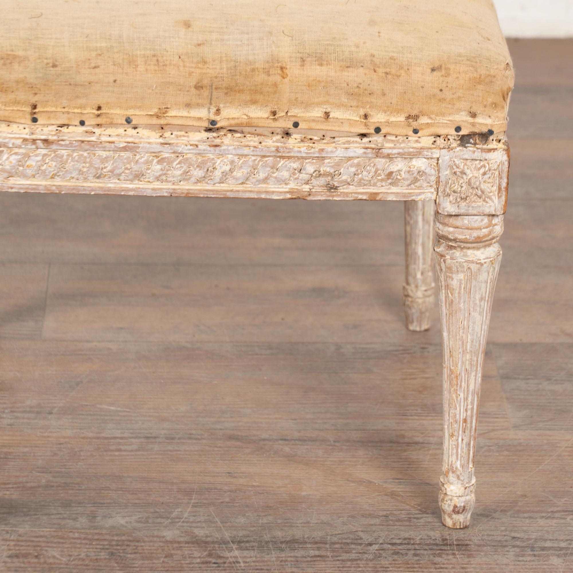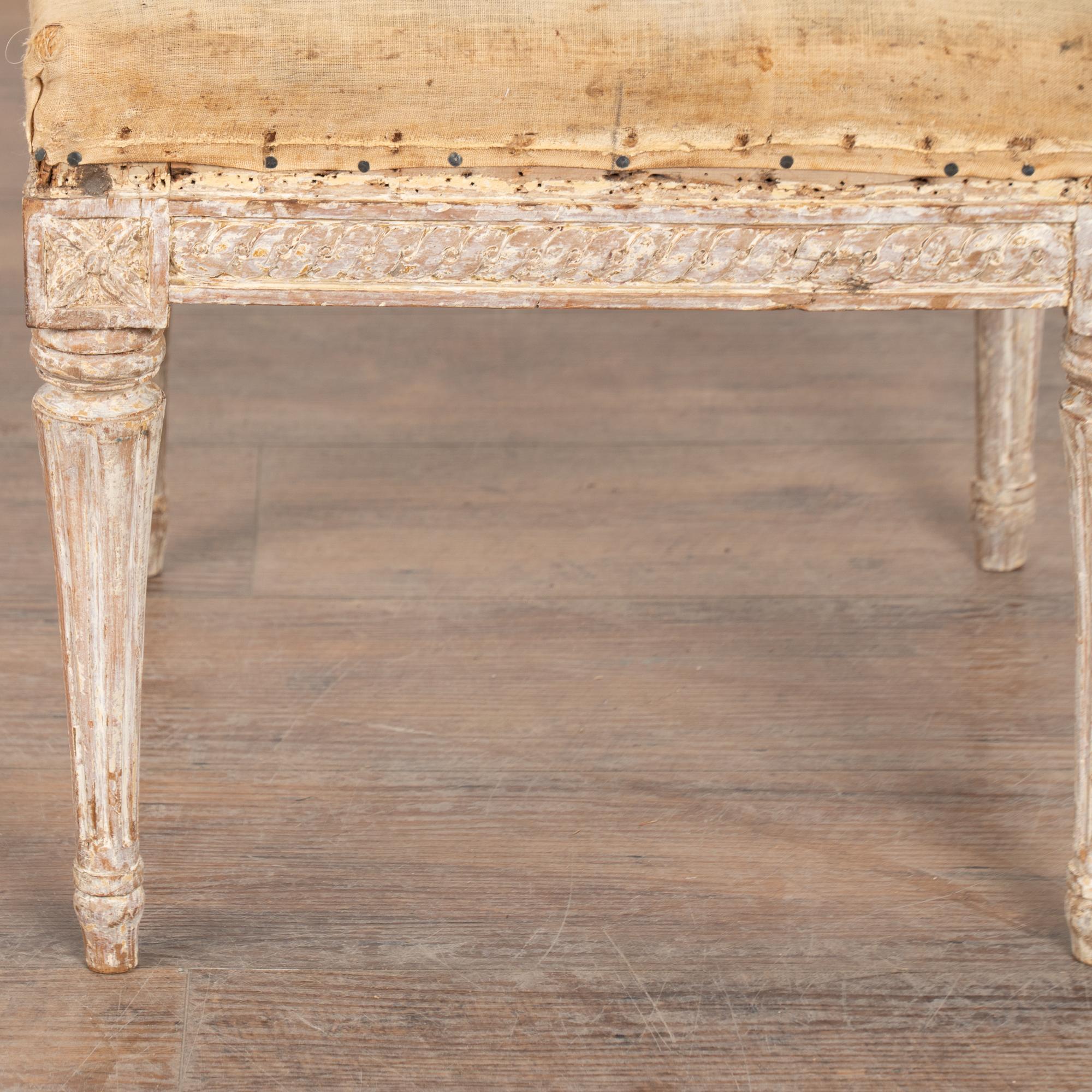 The antique white painted finish has been gently scraped and distressed fitting the age and romantic appeal of this Swedish stool.