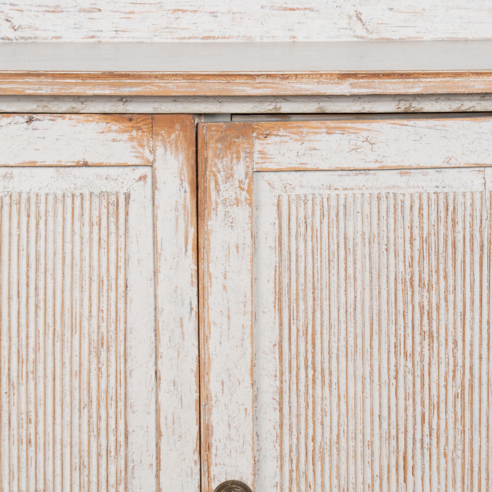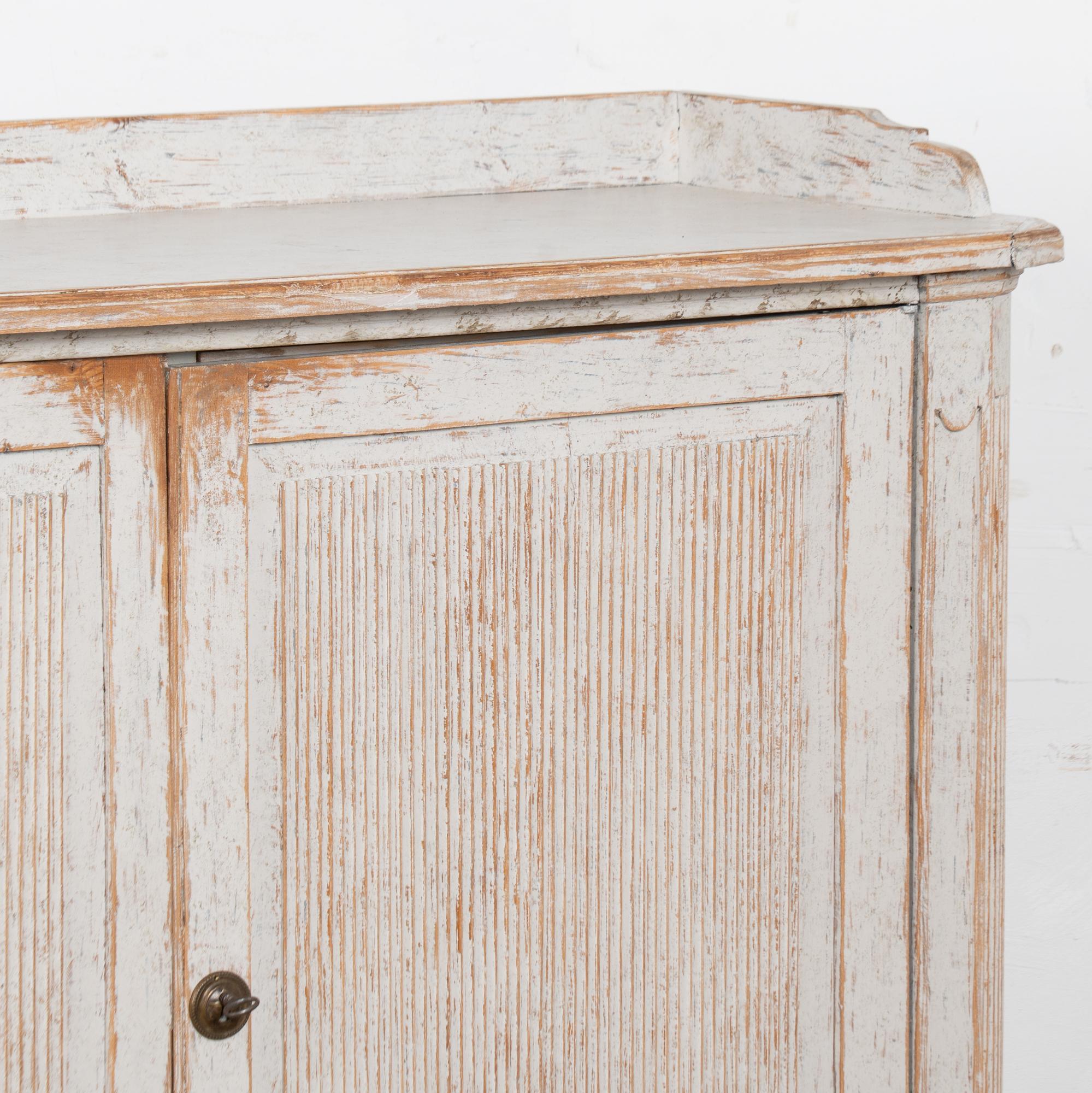 The attractive soft color pallet of this Swedish pine cabinet or sideboard comes from the original hand-painted light gray finish which has been gently scraped and softly distressed through generations of use, resulting in the warm aged patina of the natural pine revealed below.