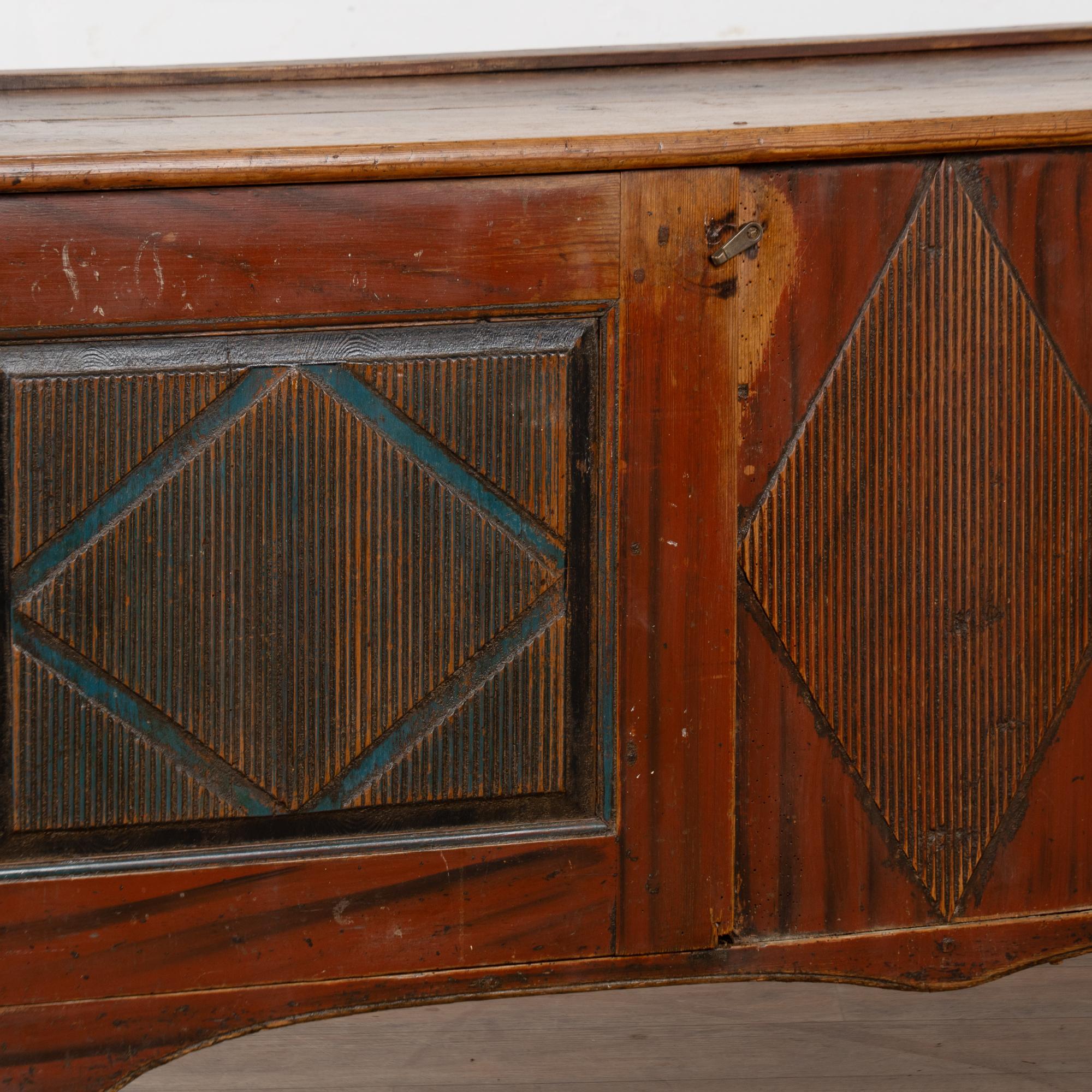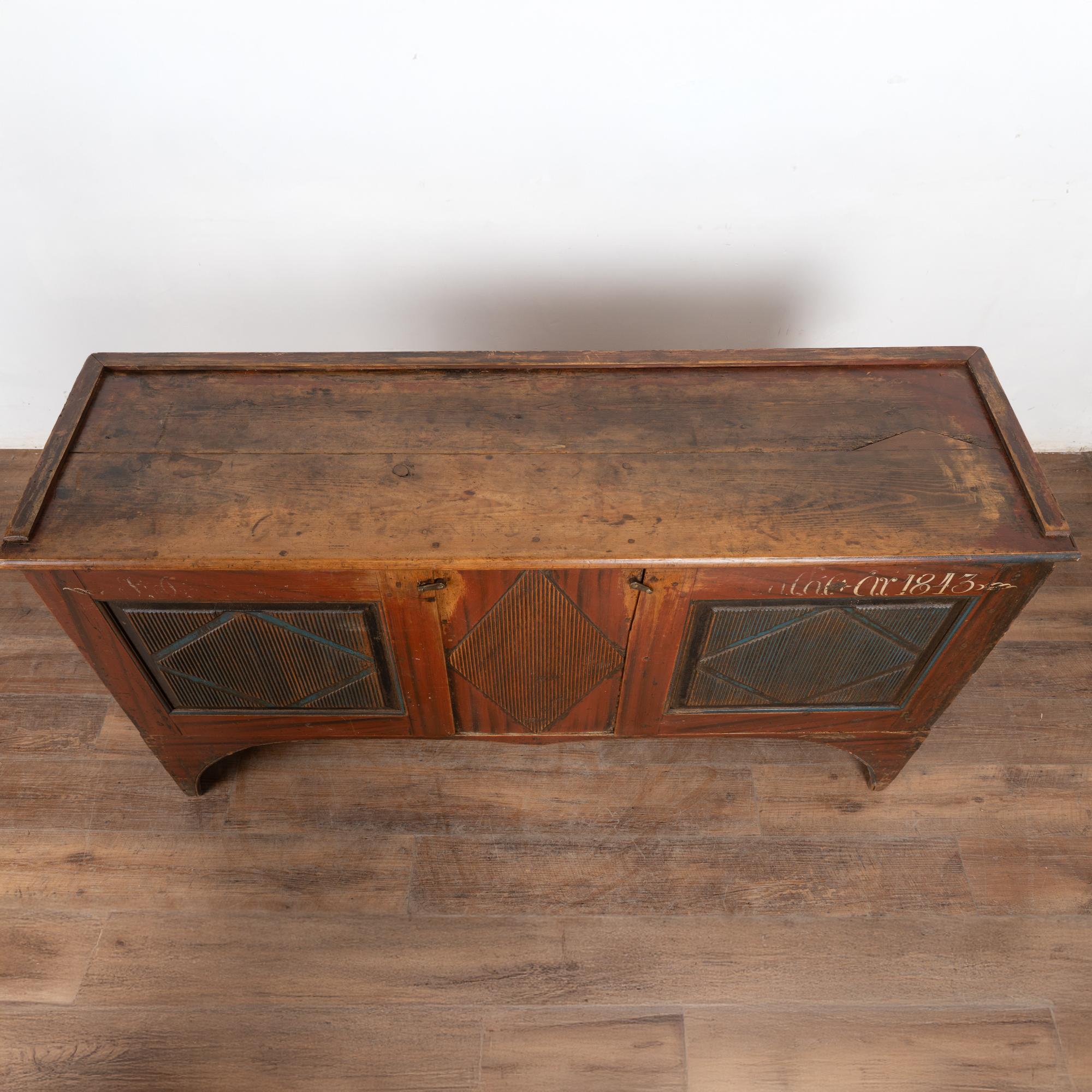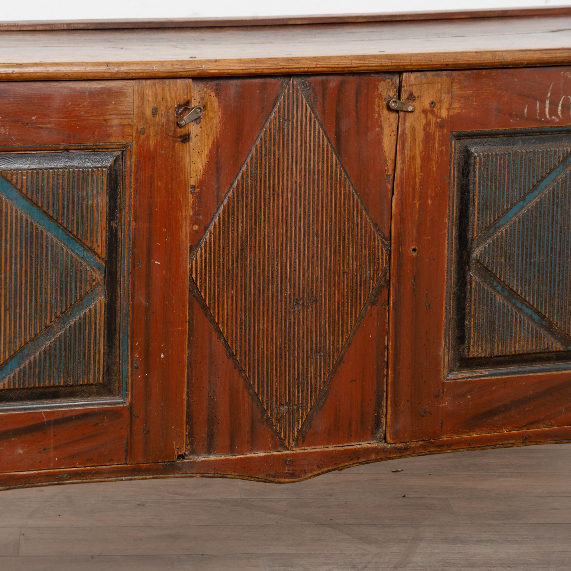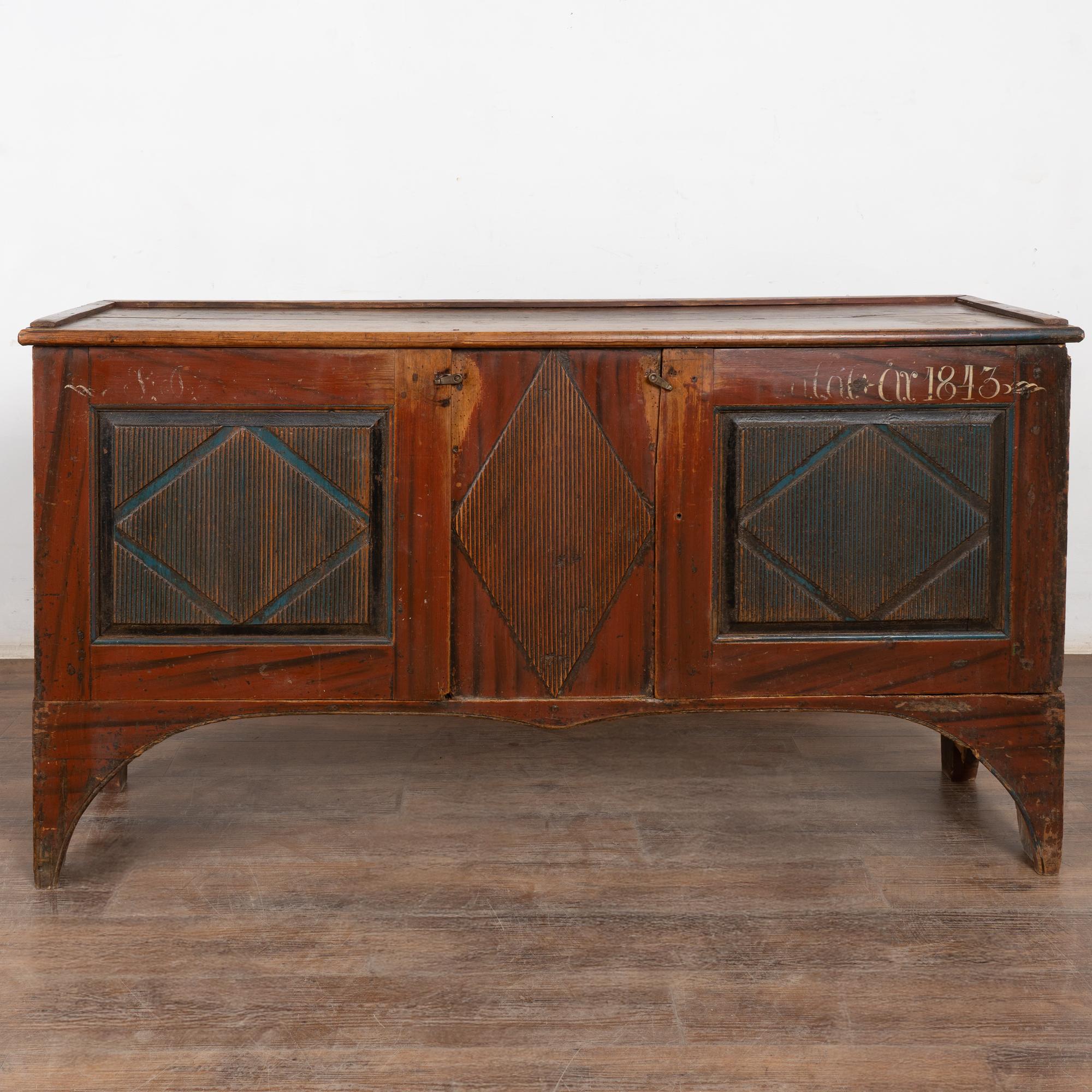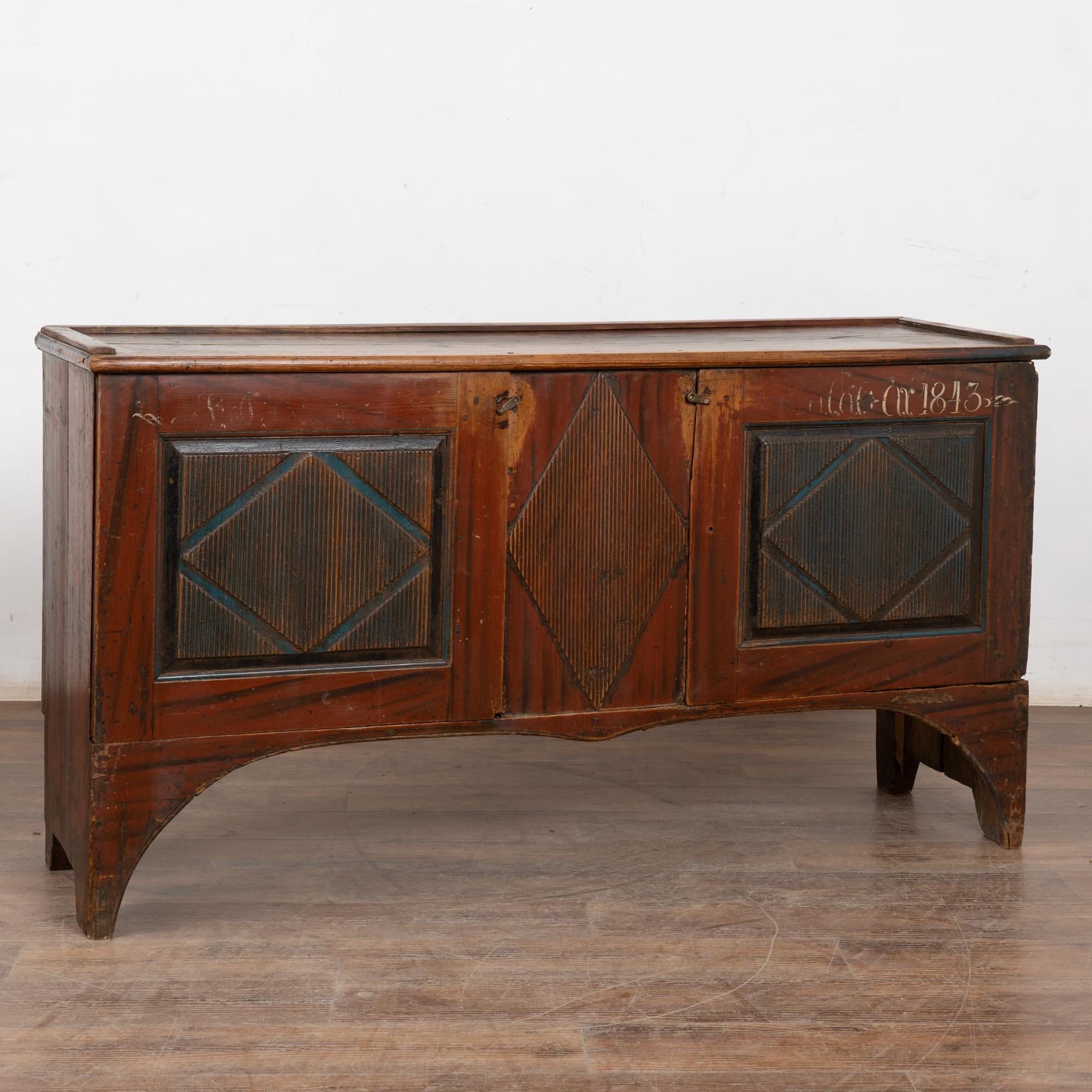 This original painted pine sideboard is a wonderful example of Swedish country craftsmanship with a warm, aged patina in the brick red painted finish with contrasting blue painted decorative diamonds. Note faded monogram and date of 1843 along right upper corner.