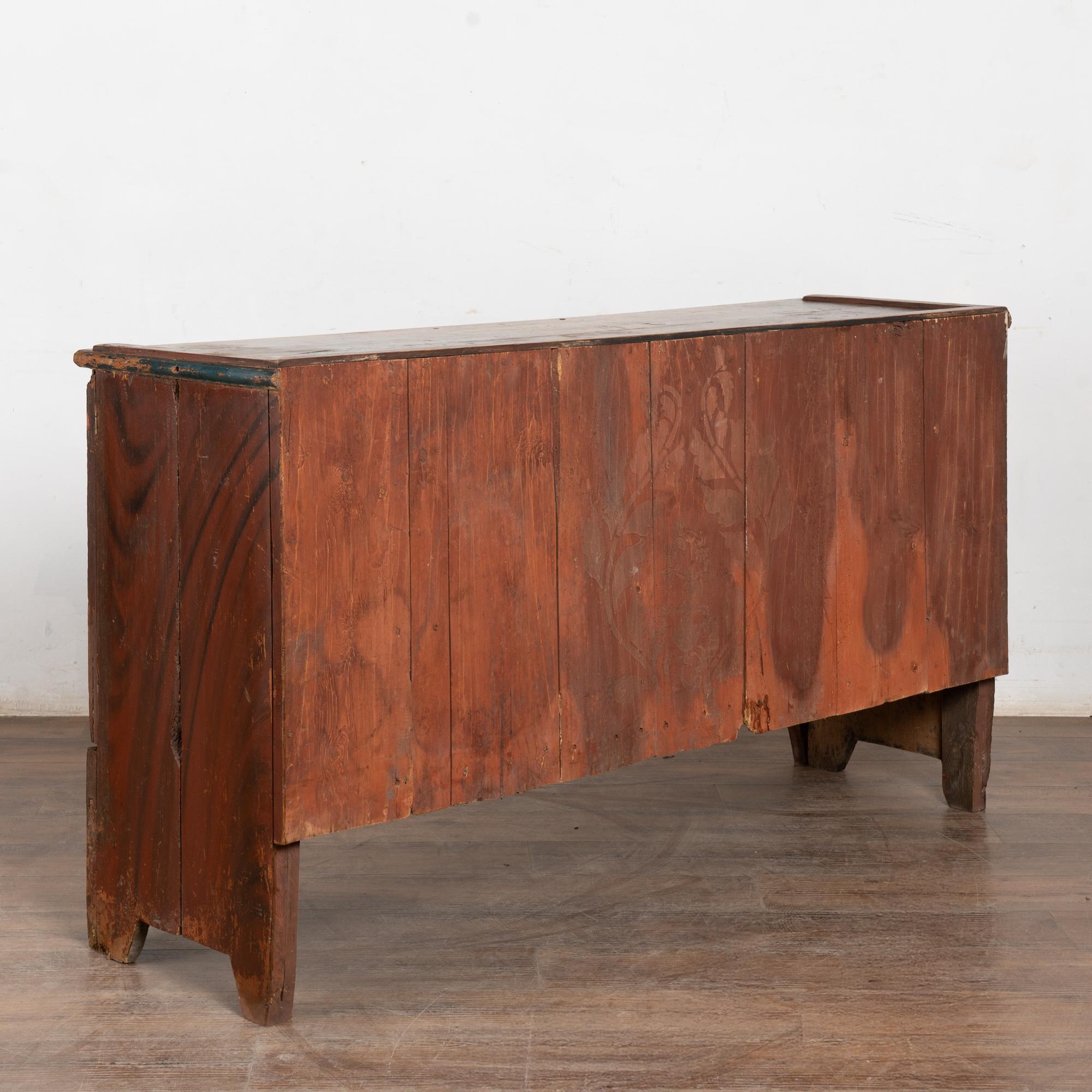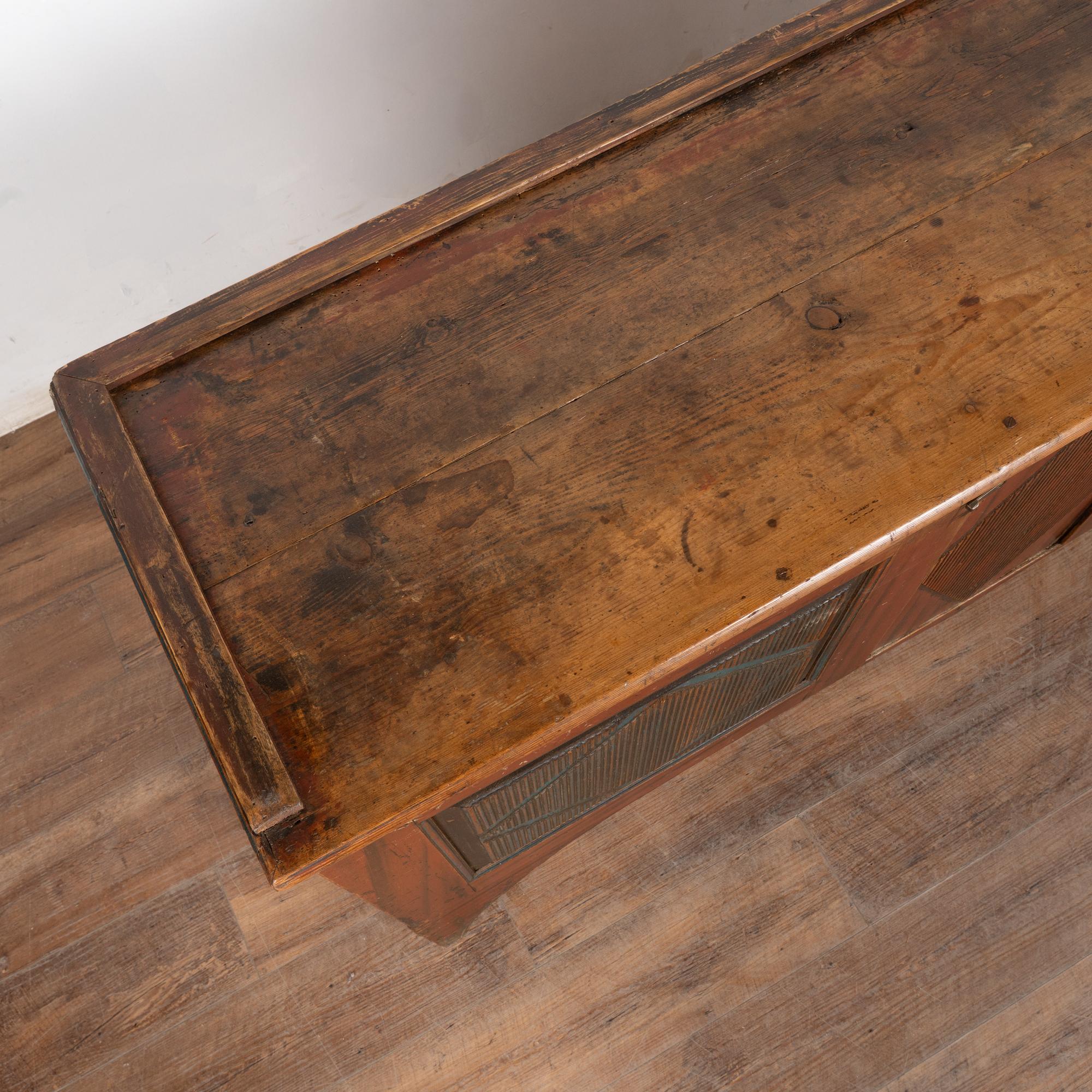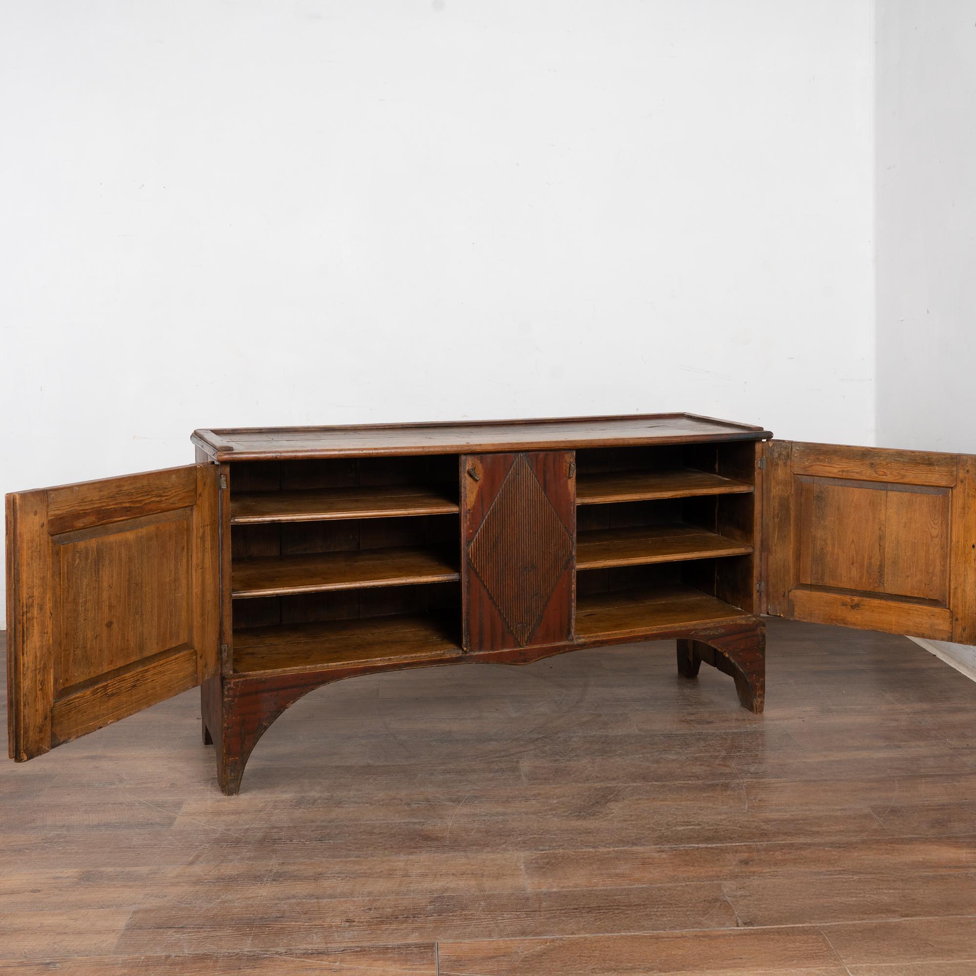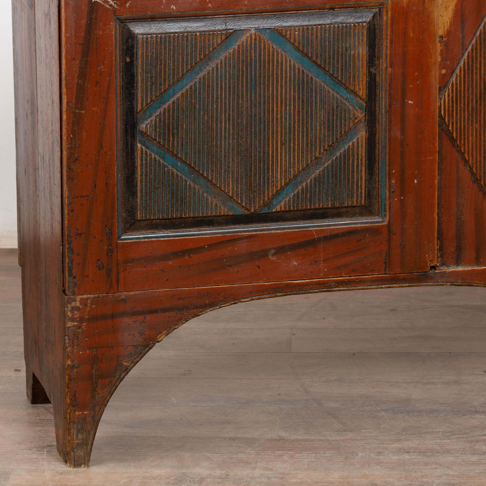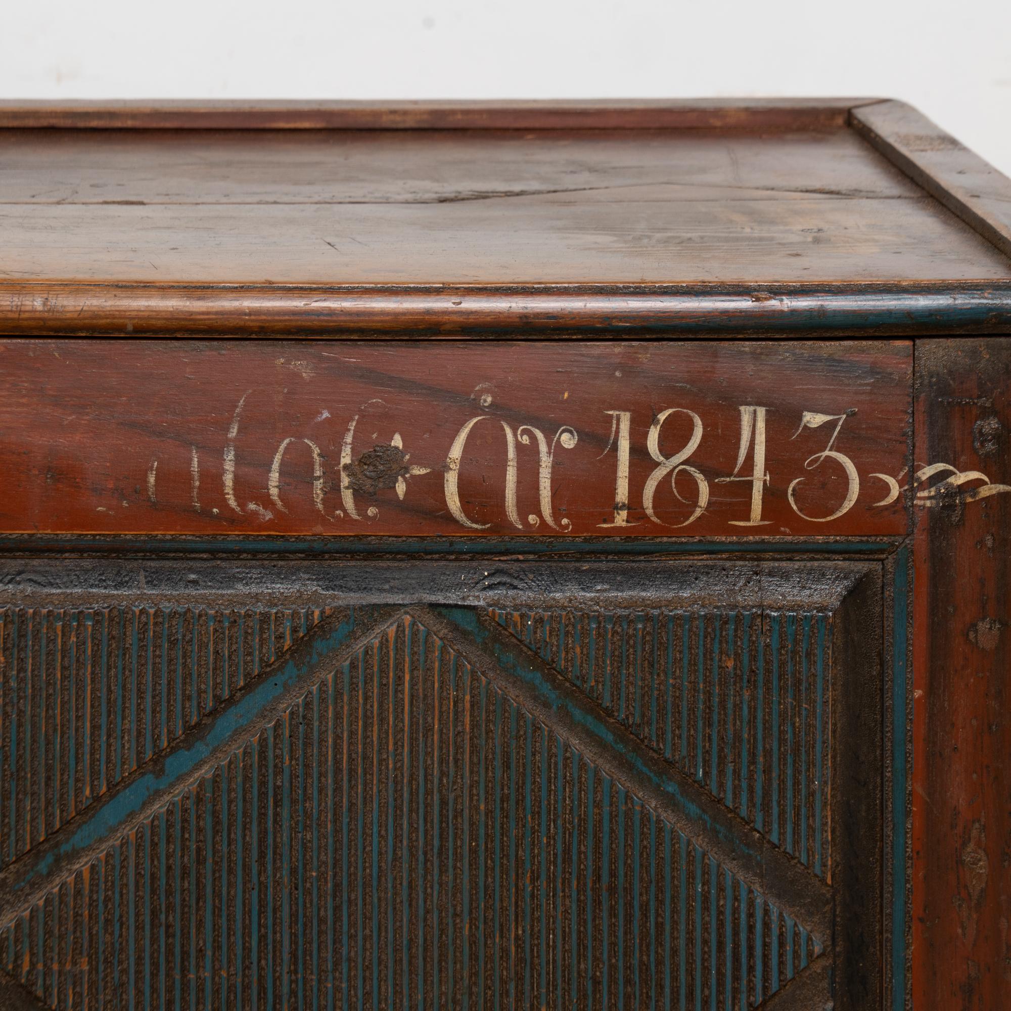This original painted pine sideboard is a wonderful example of Swedish country craftsmanship with a warm, aged patina in the brick red painted finish with contrasting blue painted decorative diamonds. Note faded monogram and date of 1843 along right upper corner.