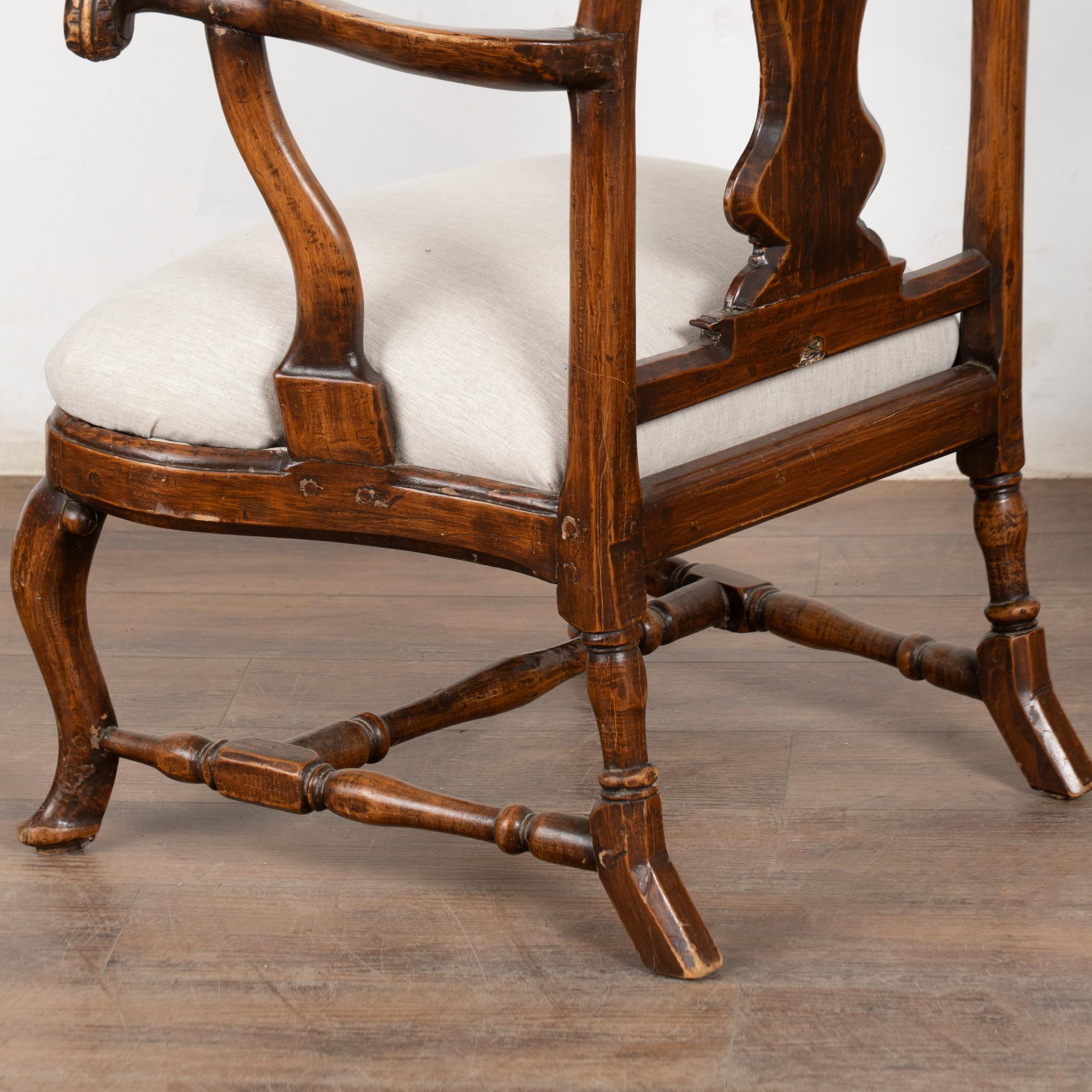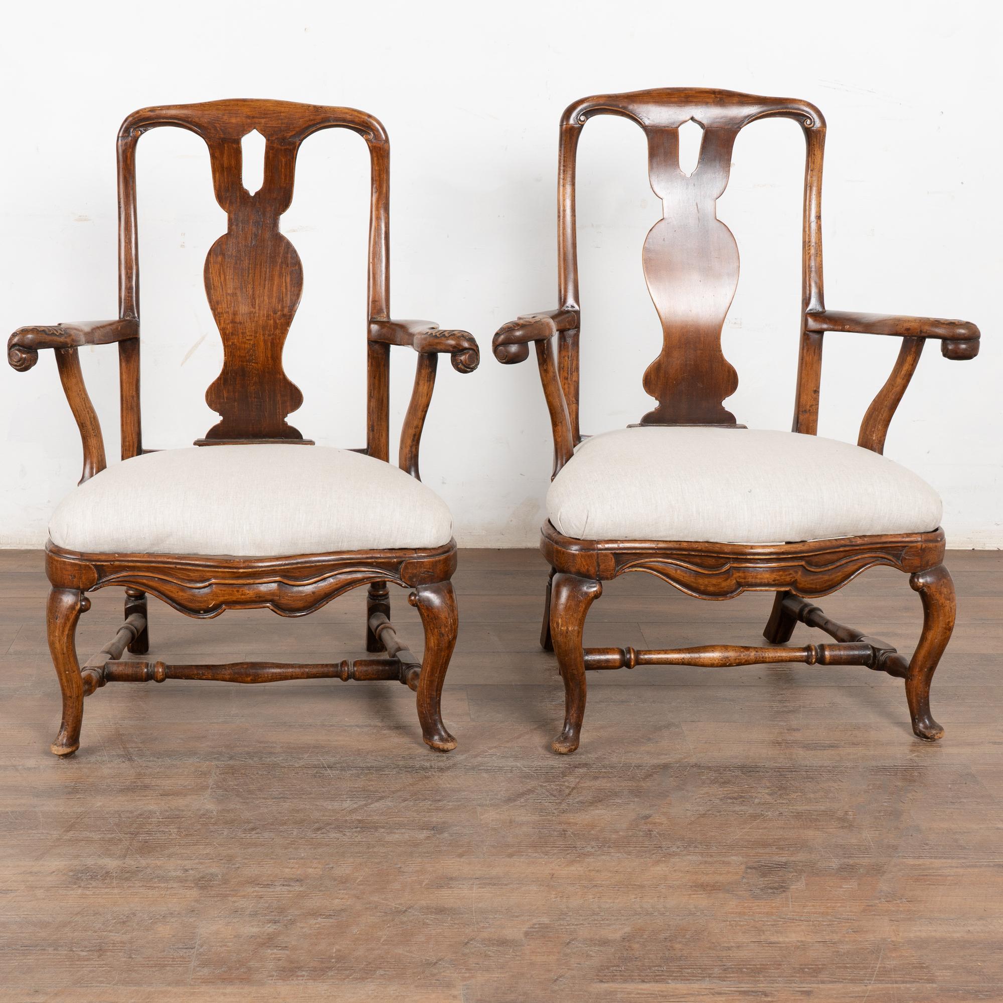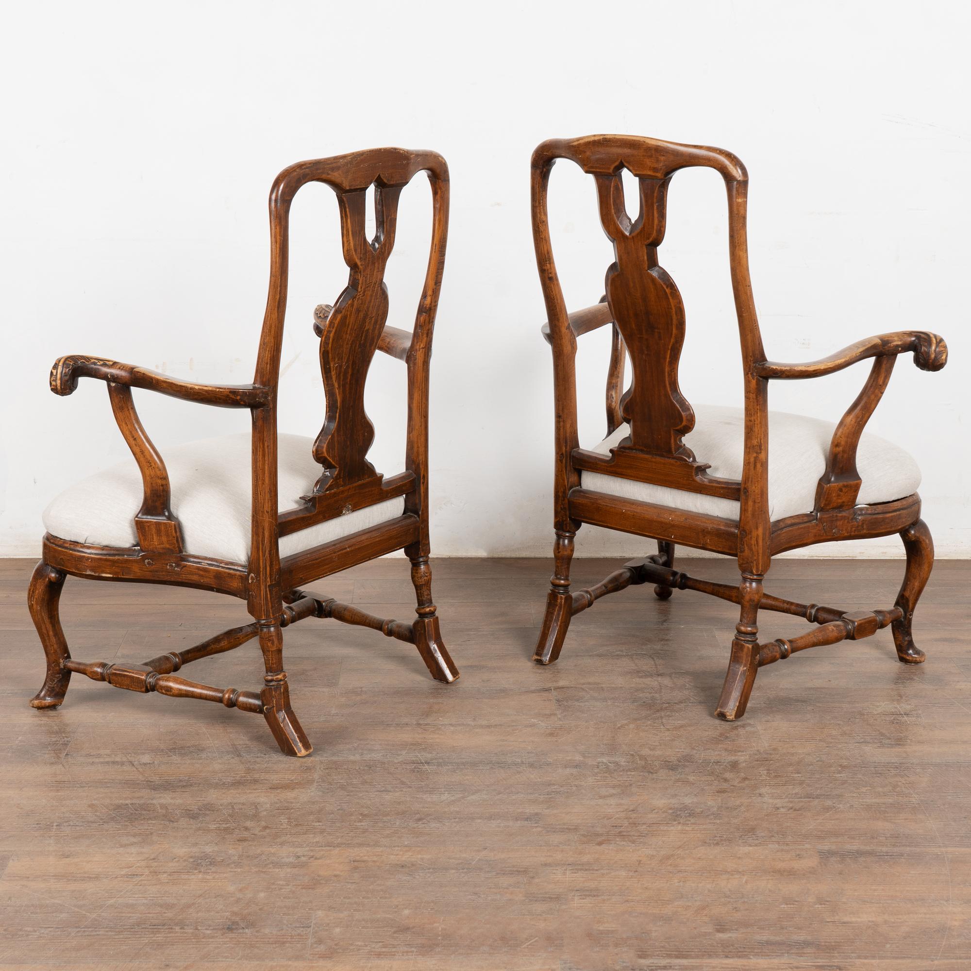 Pair of 18th-century Swedish Rococo walnut armchairs with a deep, rich brown patina. The sculpted arms and cabriole legs rest over a turned stretcher base, blending graceful form with stability. Old repairs are visible to the feet and arm joints, along with surface wear from generations of use adding to the aged patina. Upholstered in simple linen with two large removable seats that can be easily re-covered if desired. Restored, stable, and ready for placement.