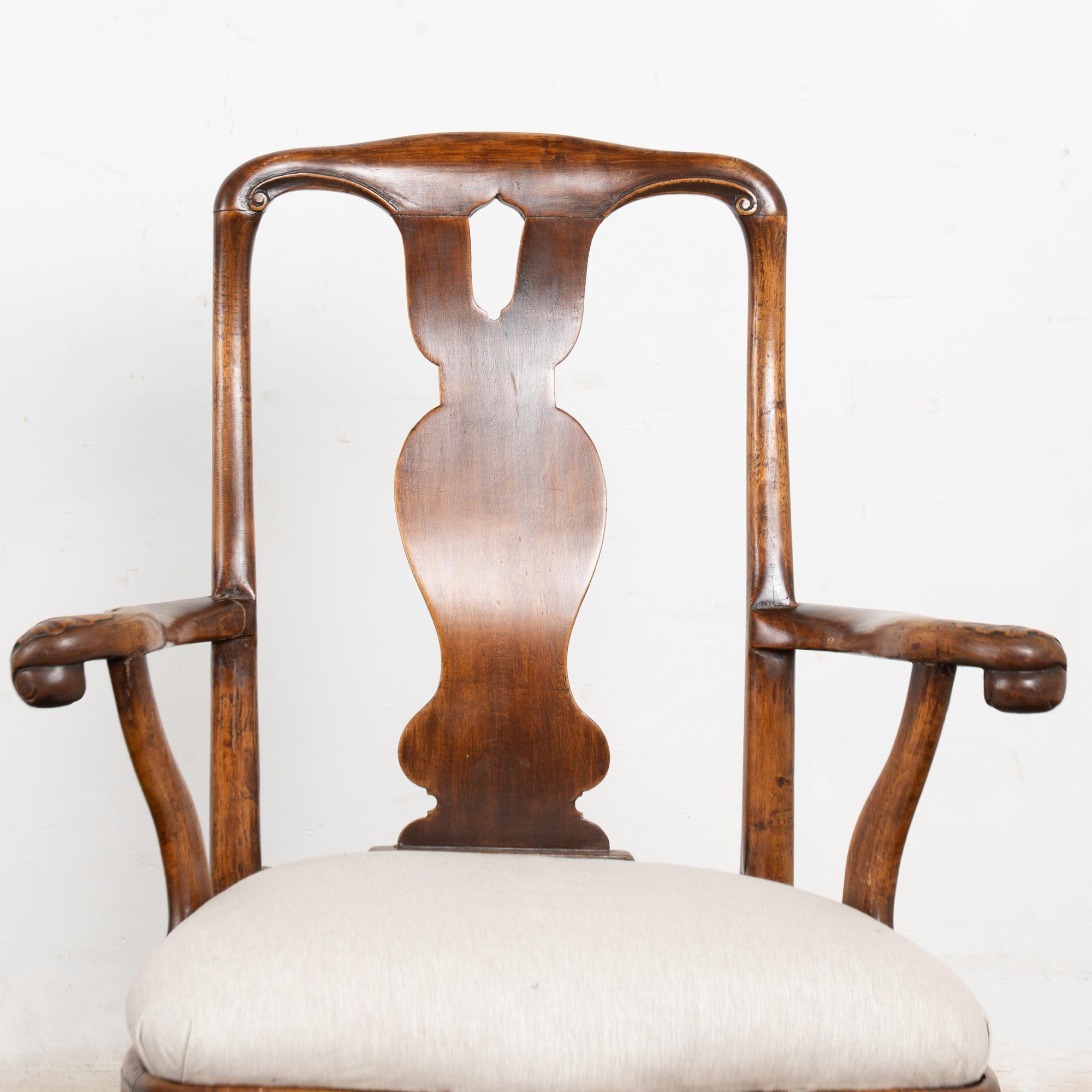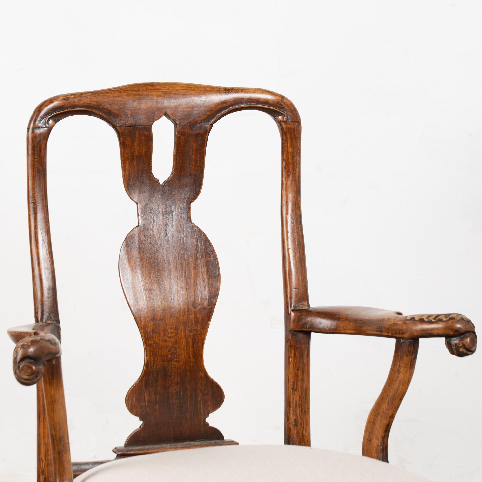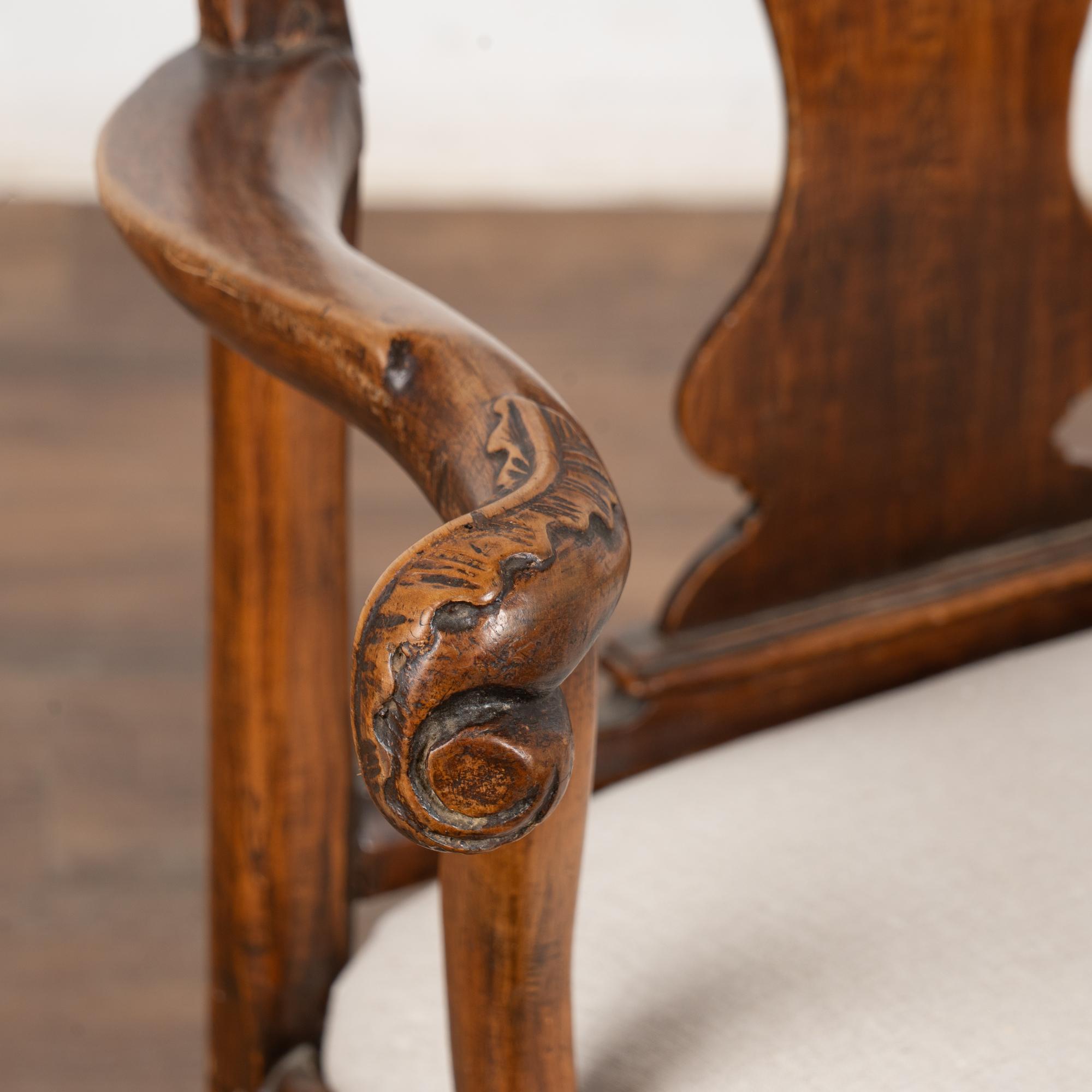 Pair of 18th-century Swedish Rococo walnut armchairs with a deep, rich brown patina. The sculpted arms and cabriole legs rest over a turned stretcher base, blending graceful form with stability. Old repairs are visible to the feet and arm joints, along with surface wear from generations of use adding to the aged patina. Upholstered in simple linen with two large removable seats that can be easily re-covered if desired. Restored, stable, and ready for placement.
