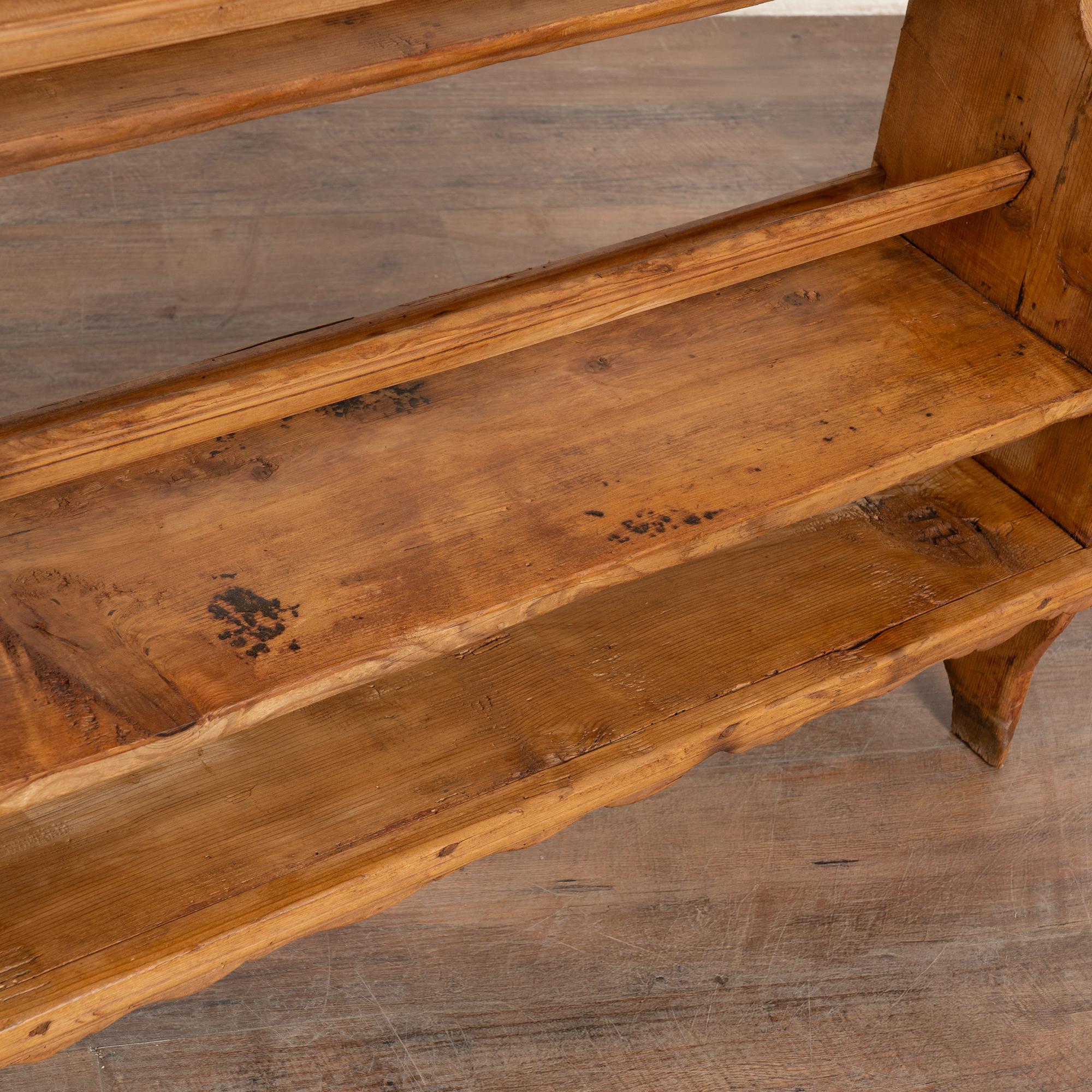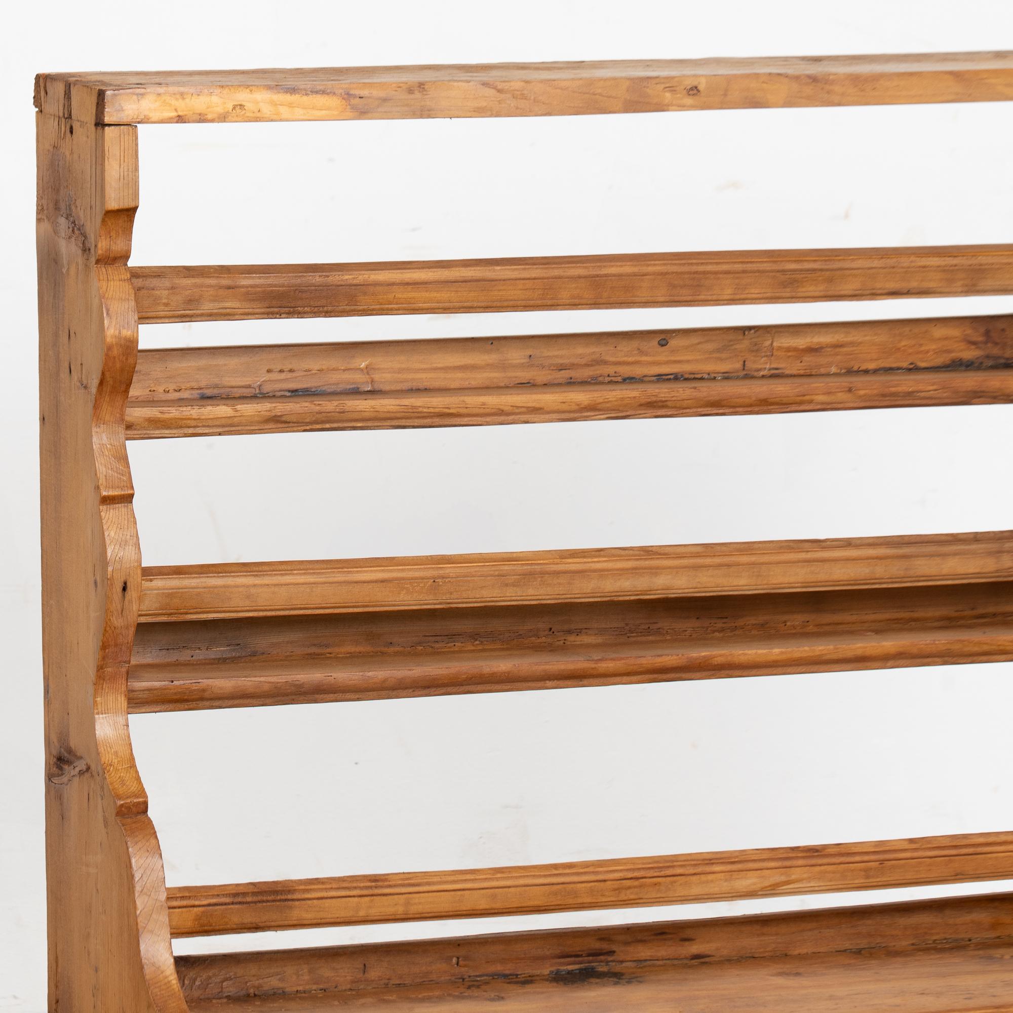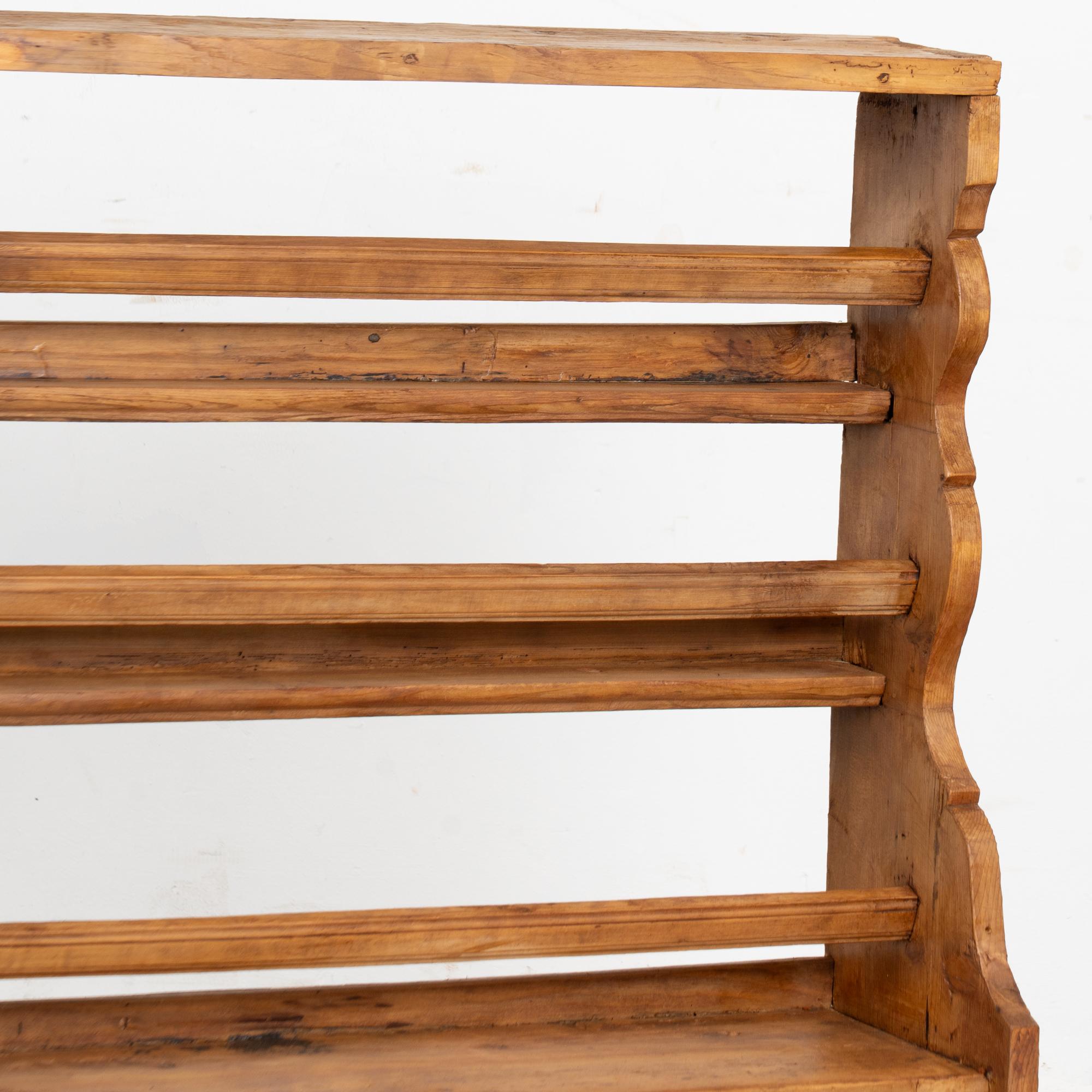 19th-century Danish plate rack shelf crafted in pine with narrow display shelves intended for plates or small objects. The form features gently curved sides and a slightly scalloped skirt. Versatile in use, it may be hung on the wall or placed on a counter or sideboard.