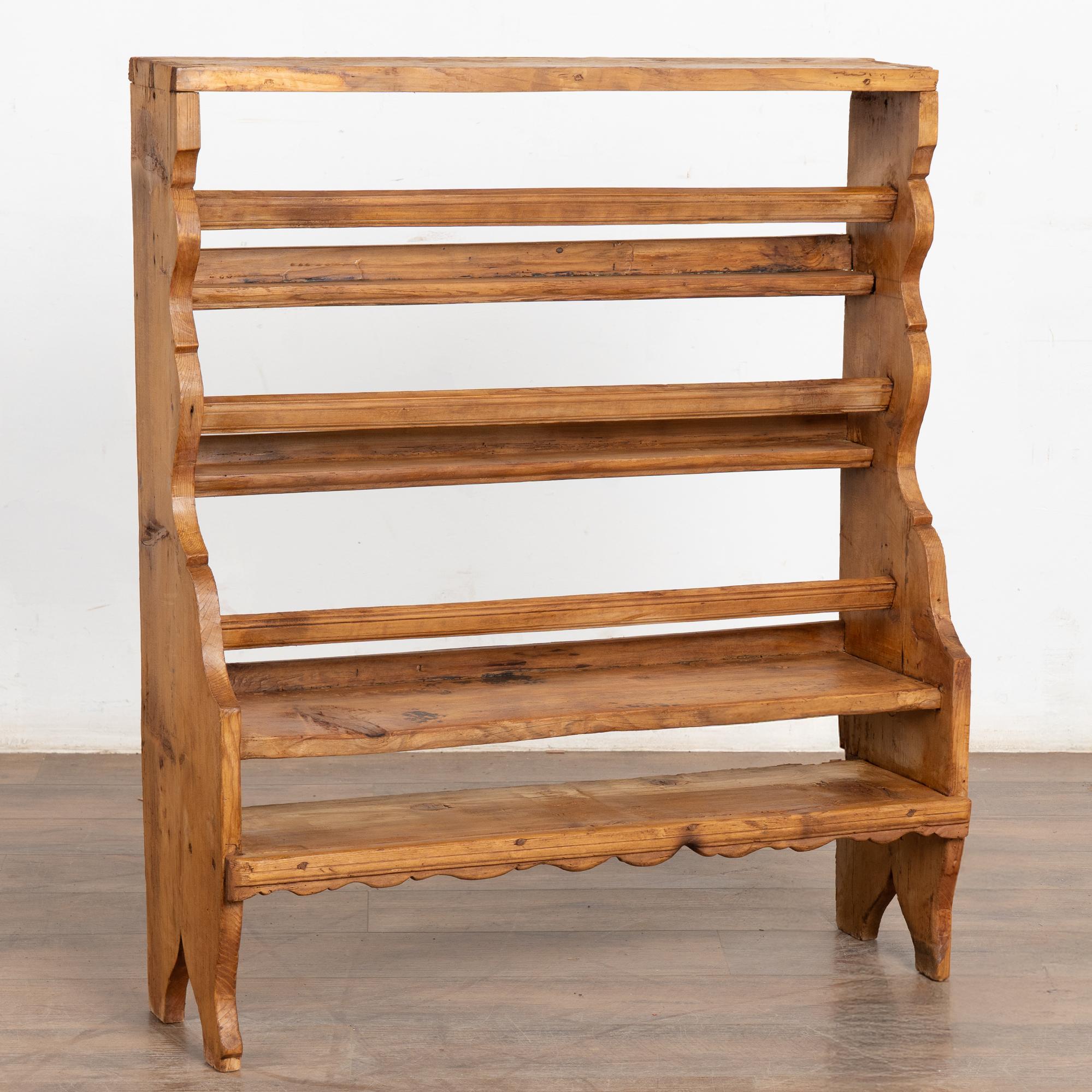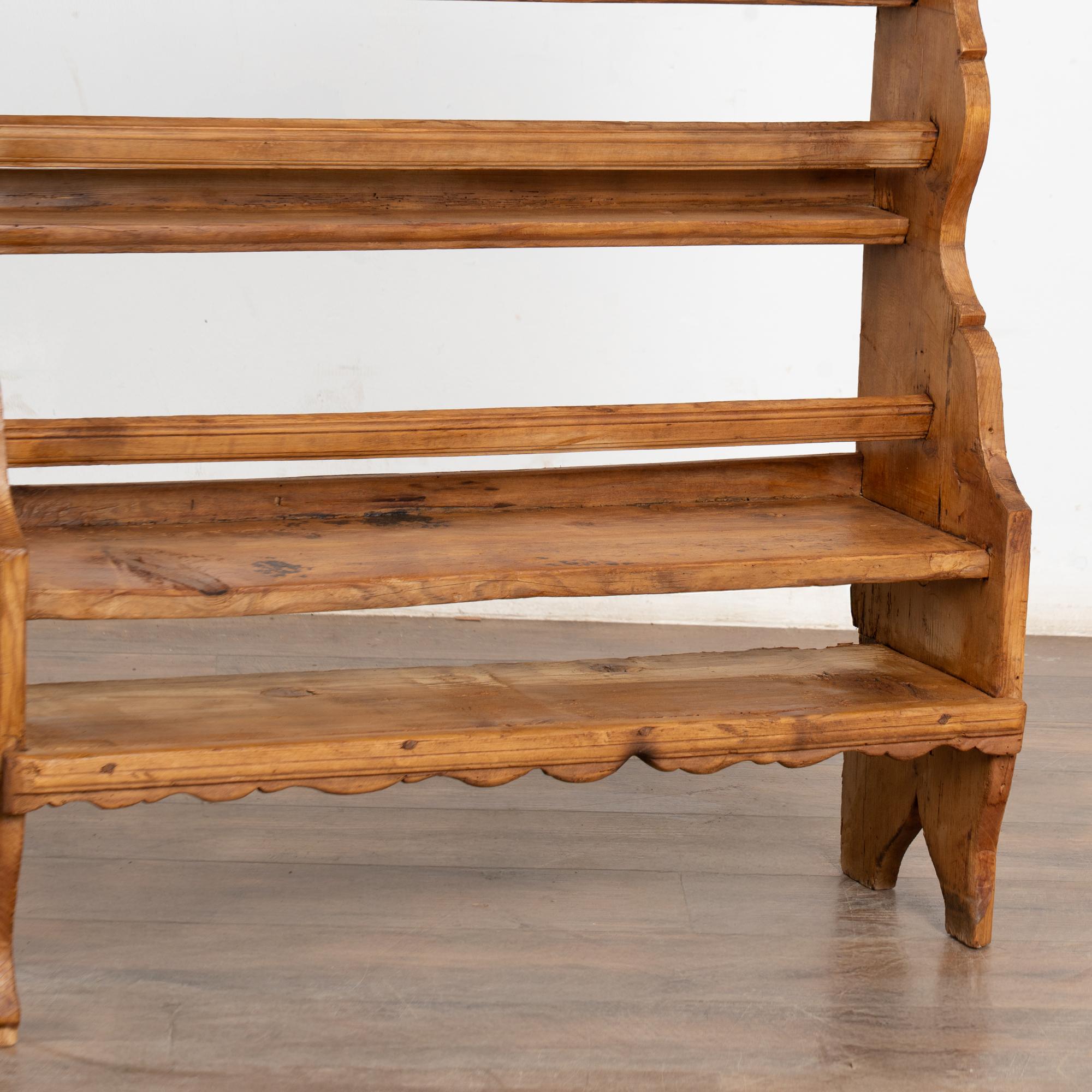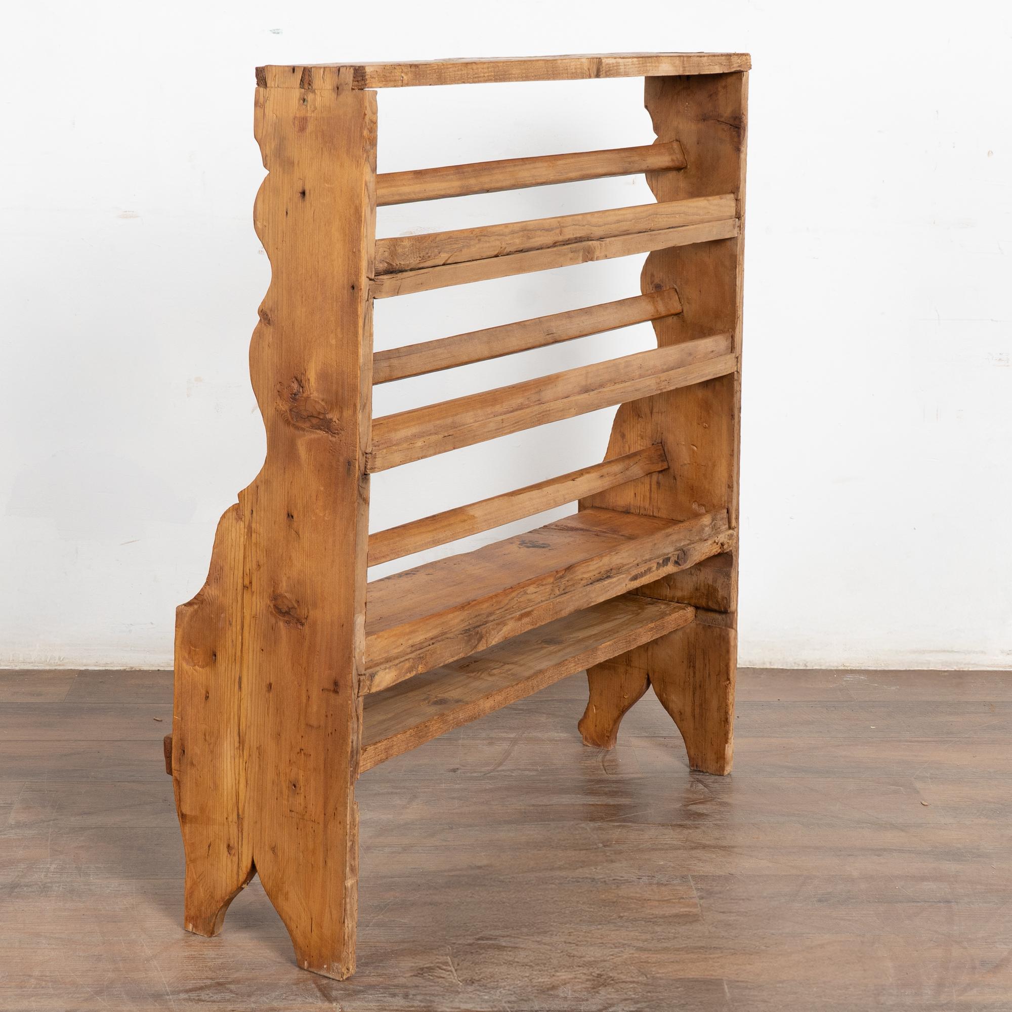 19th-century Danish plate rack shelf crafted in pine with narrow display shelves intended for plates or small objects. The form features gently curved sides and a slightly scalloped skirt. Versatile in use, it may be hung on the wall or placed on a counter or sideboard.