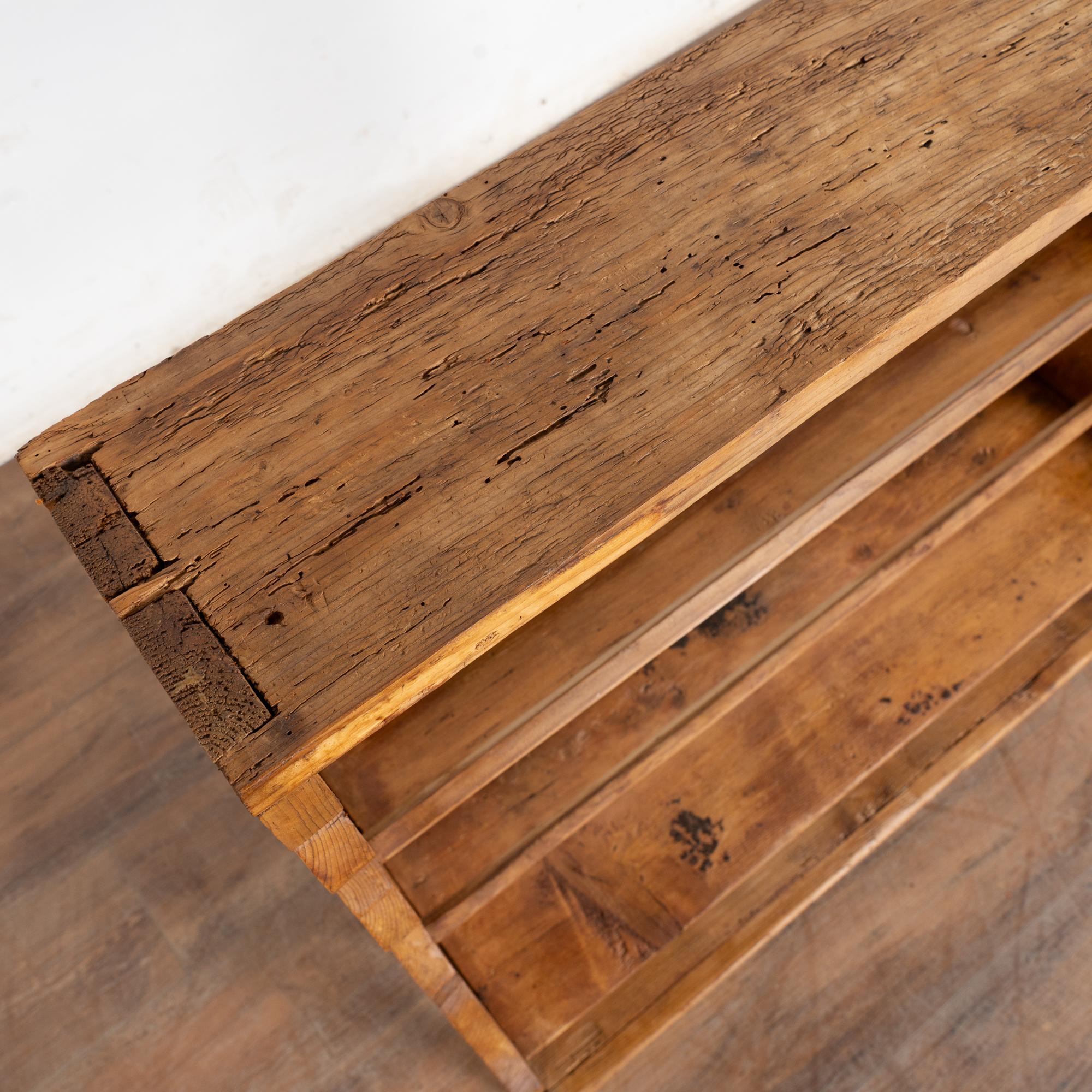 Age and use are visible in the surface, including stains, scratches, nicks, and signs of old dried wormhole activity. The shelf has been restored, is stable, and is ready to hang or place for display. Finished with a light natural wax that enhances the pine grain and tone.