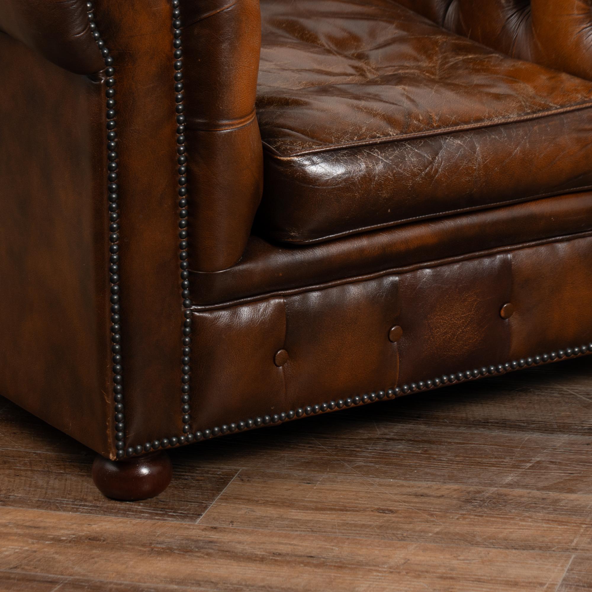 Set of vintage Chesterfield-style seating including one sofa and two matching club chairs. Brown tufted leather upholstery with nailhead trim and wood bun feet. Visible wear includes scuffs, creases, and surface abrasions—especially across arms and seat cushions—reflecting age and authentic use. Cushion covers feature zipper closures for easy replacement or filling adjustment. Classic Chesterfield design suits a variety of interiors, from refined living rooms to lodge or speakeasy settings. Structurally sound, and comfortable.