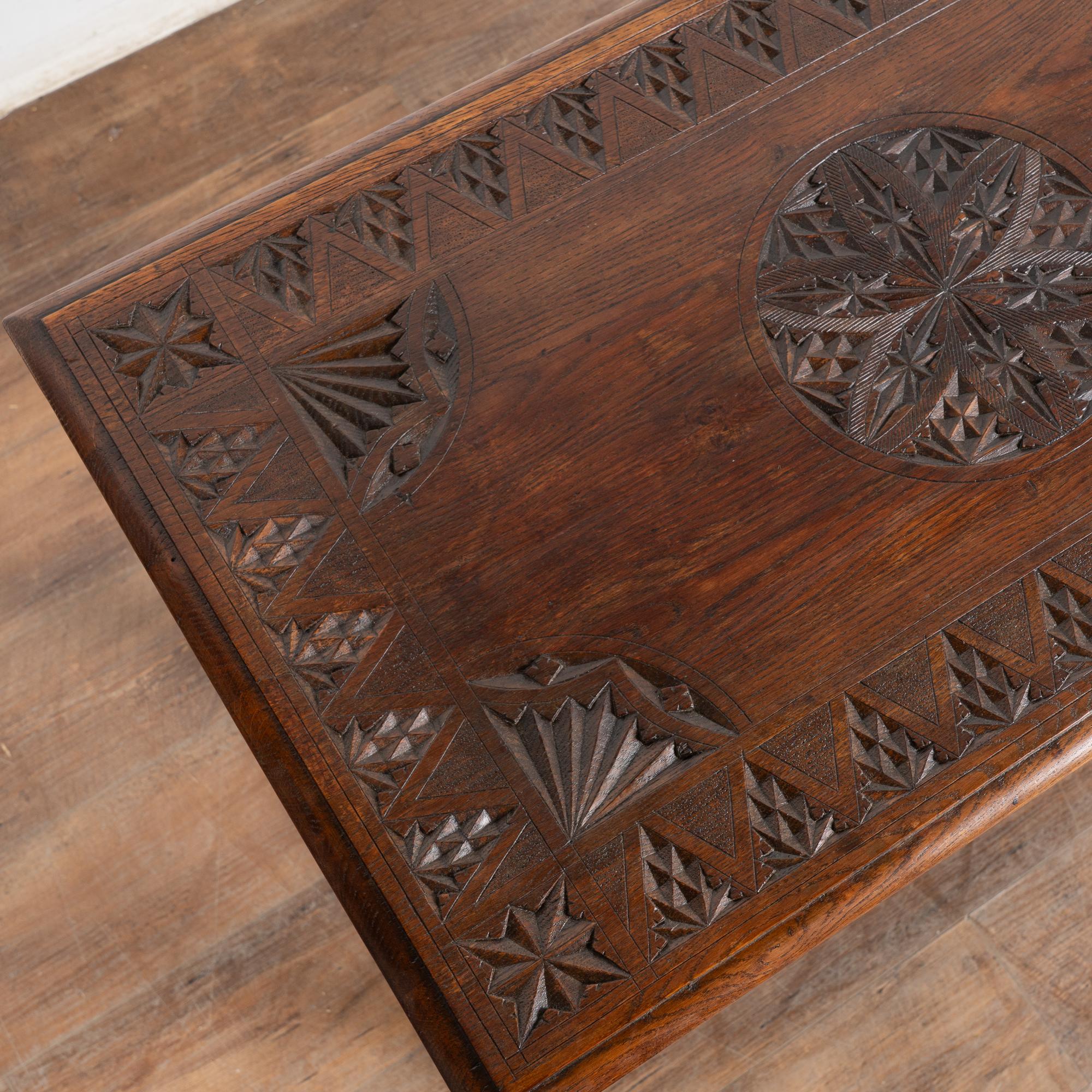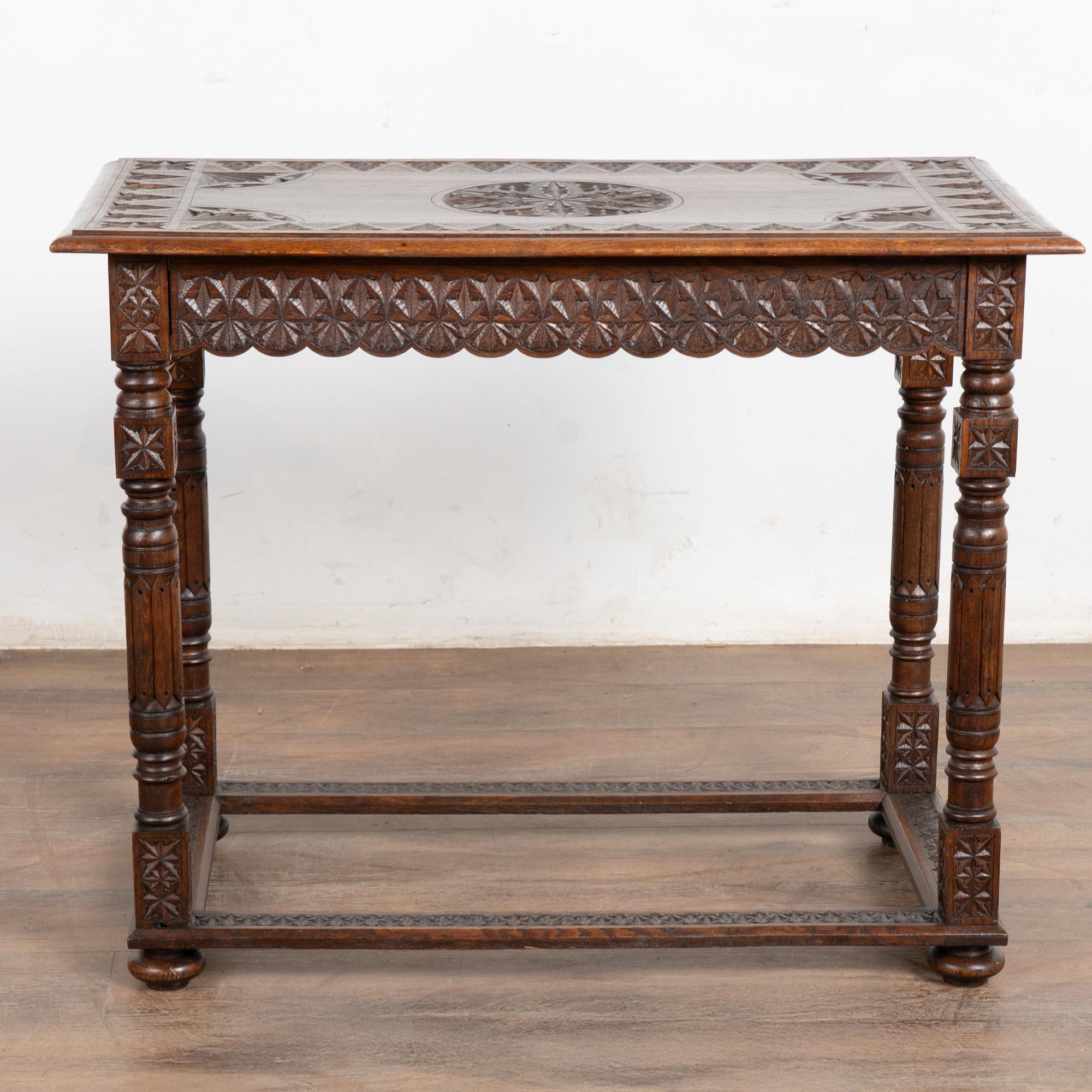 Decorative carving abounds in the top, skirt, legs and even stretcher base.