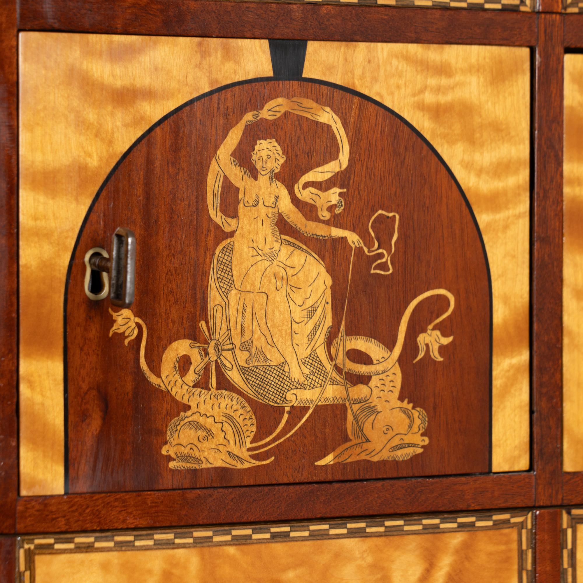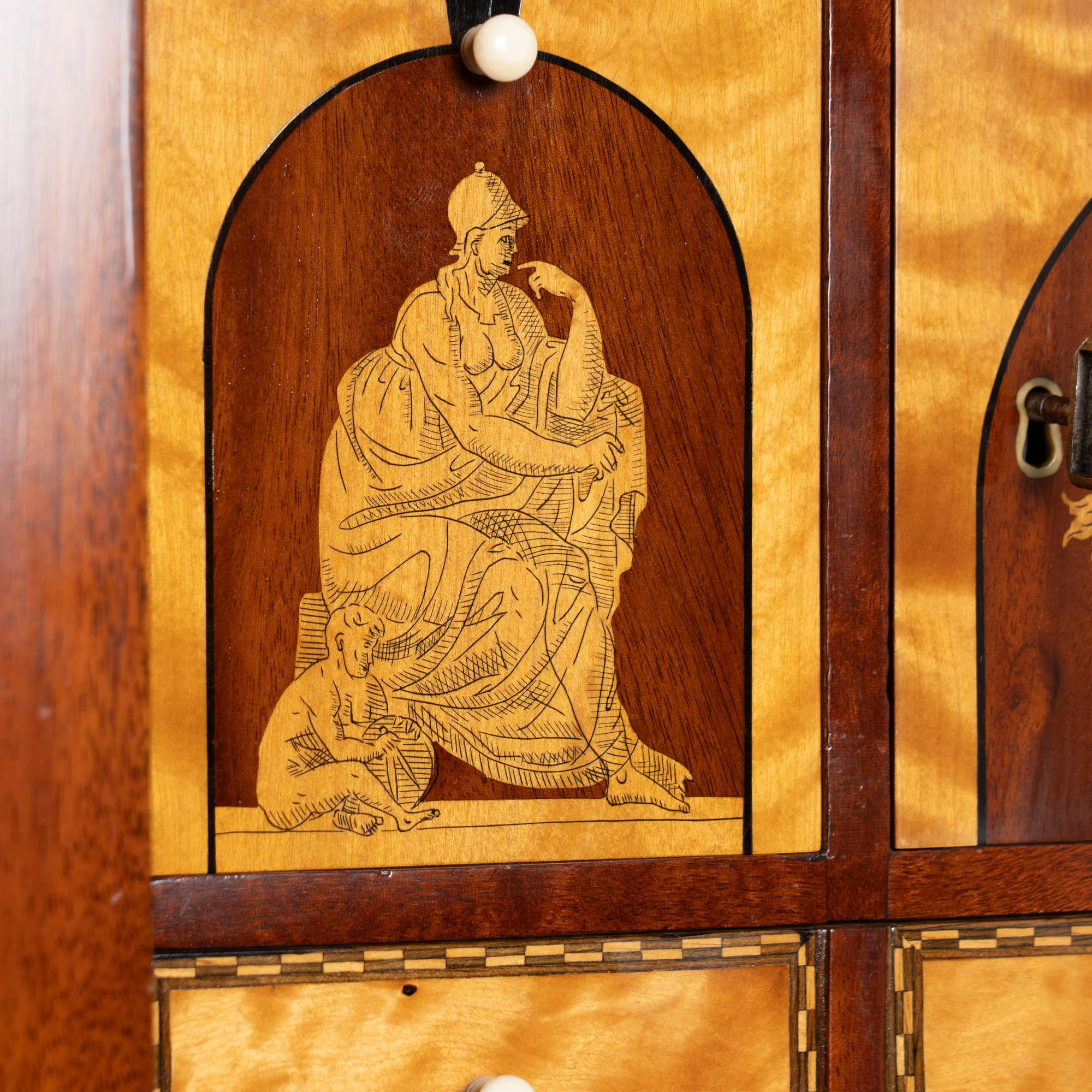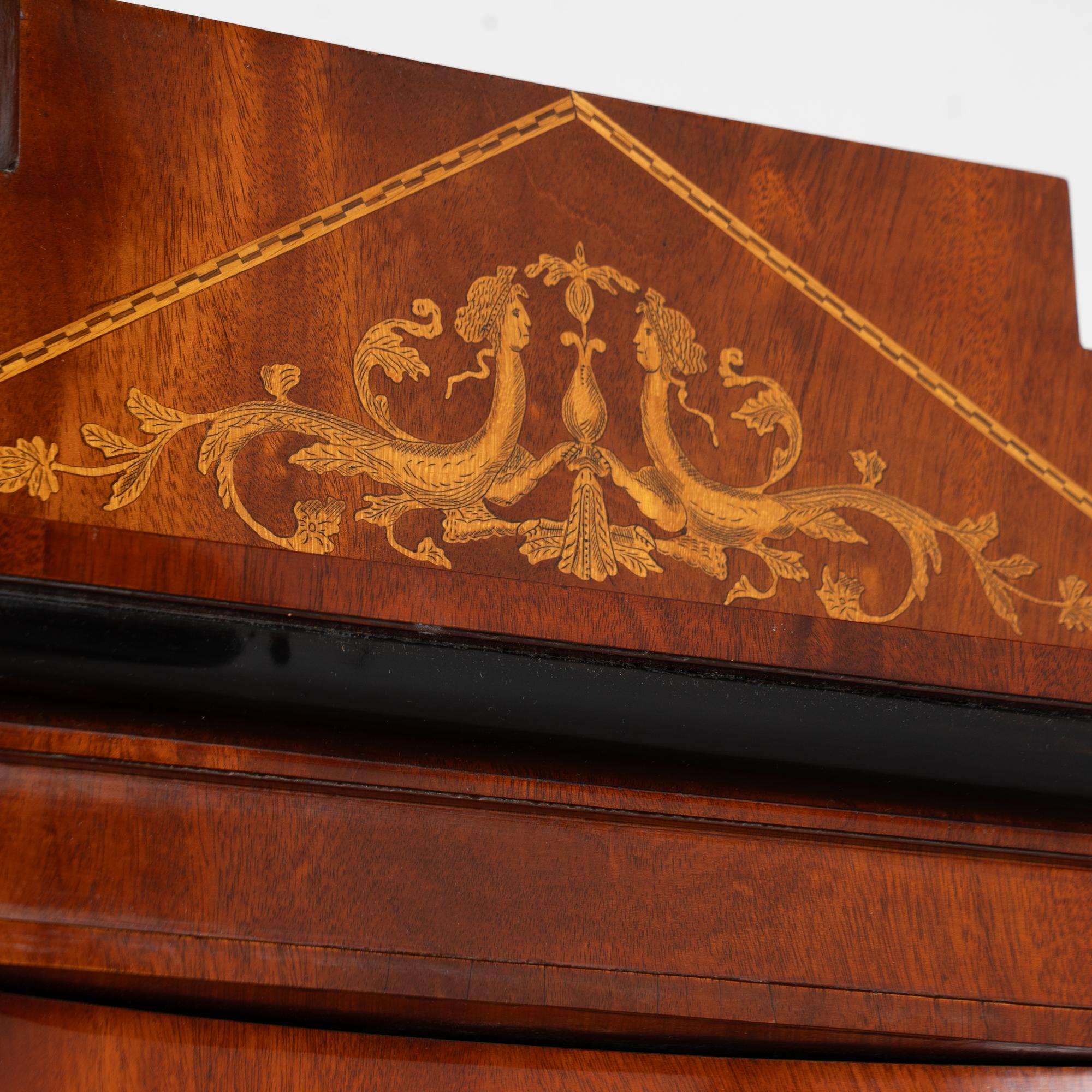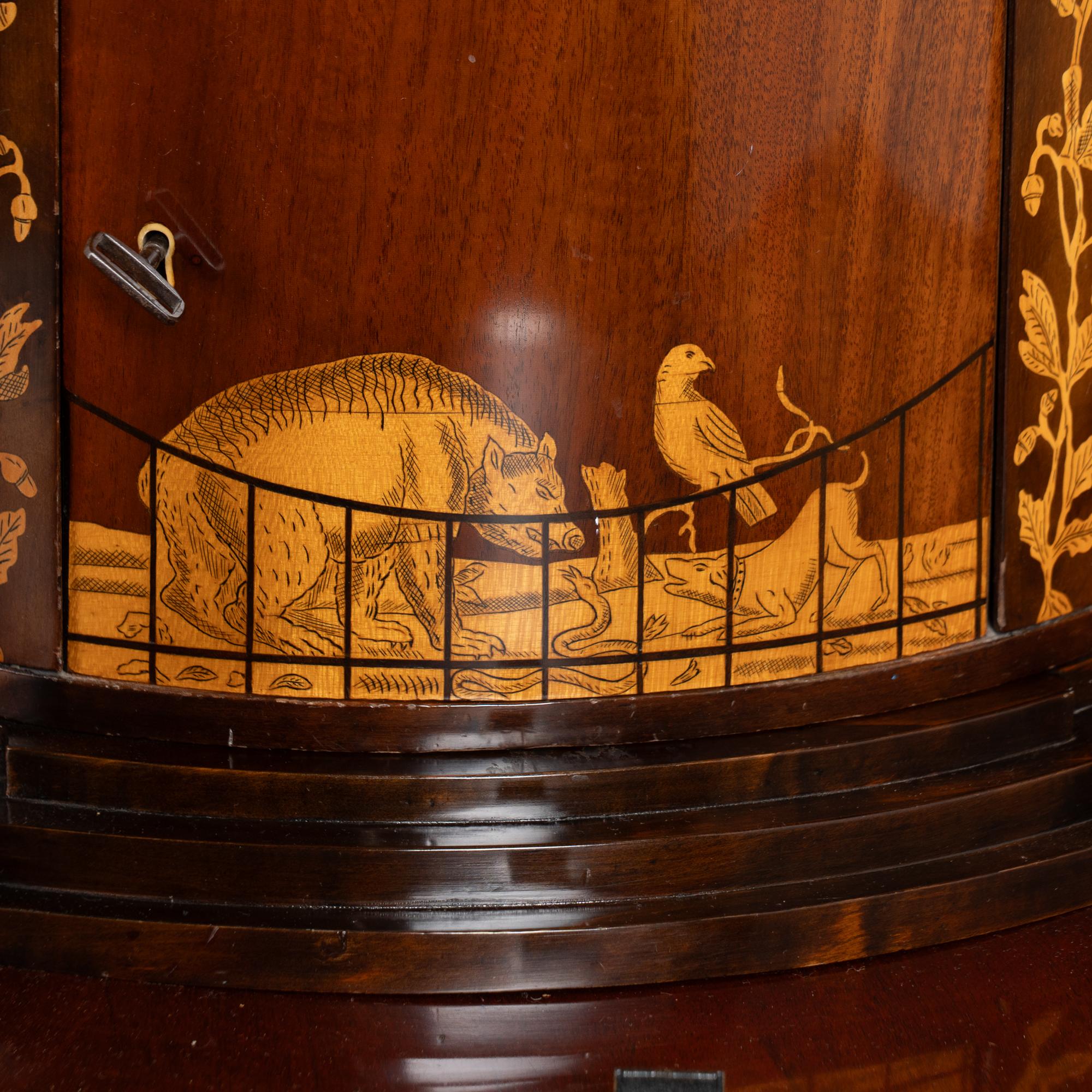 Early 19th-century Danish Empire secretary bureau crafted in mahogany veneer with both bowfront and concave cabinet doors. The piece features elaborate inlay and marquetry throughout, including Grecian figures, animals, and decorative motifs. Interior details include bear, snake, bird, and dog depicted on the central cubby door.