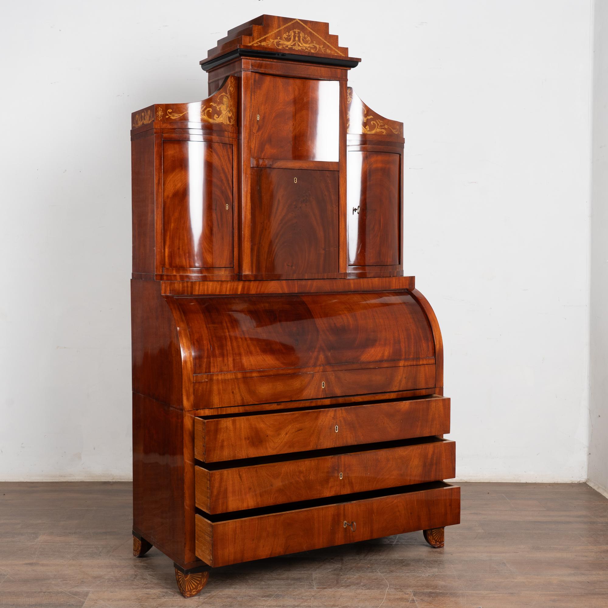 The cabinet is constructed in three sections for easier transportation and installation. Minor surface nicks, scratches, and old repairs are visible, consistent with age. The glowing mahogany veneer highlights the exceptional craftsmanship from crown to feet. Restored, strong, stable, and ready for use.