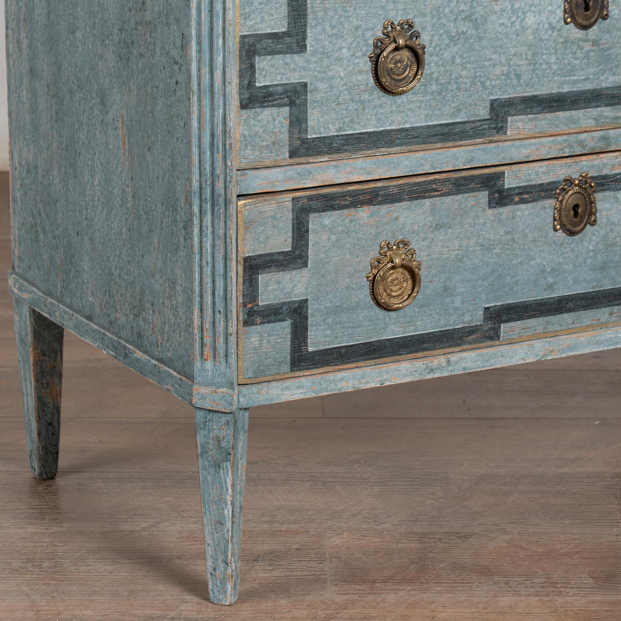 Restored, later professionally painted in layered shades of blue with notes of seafoam, teal and mottled white, all lightly distressed to fit the age and grace of this lovely chest.