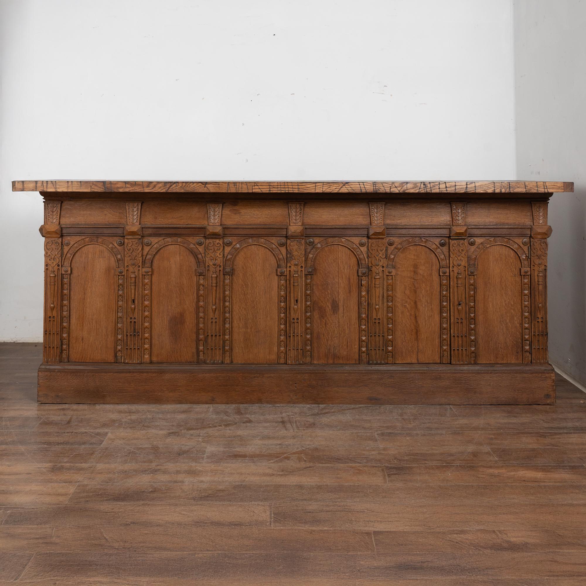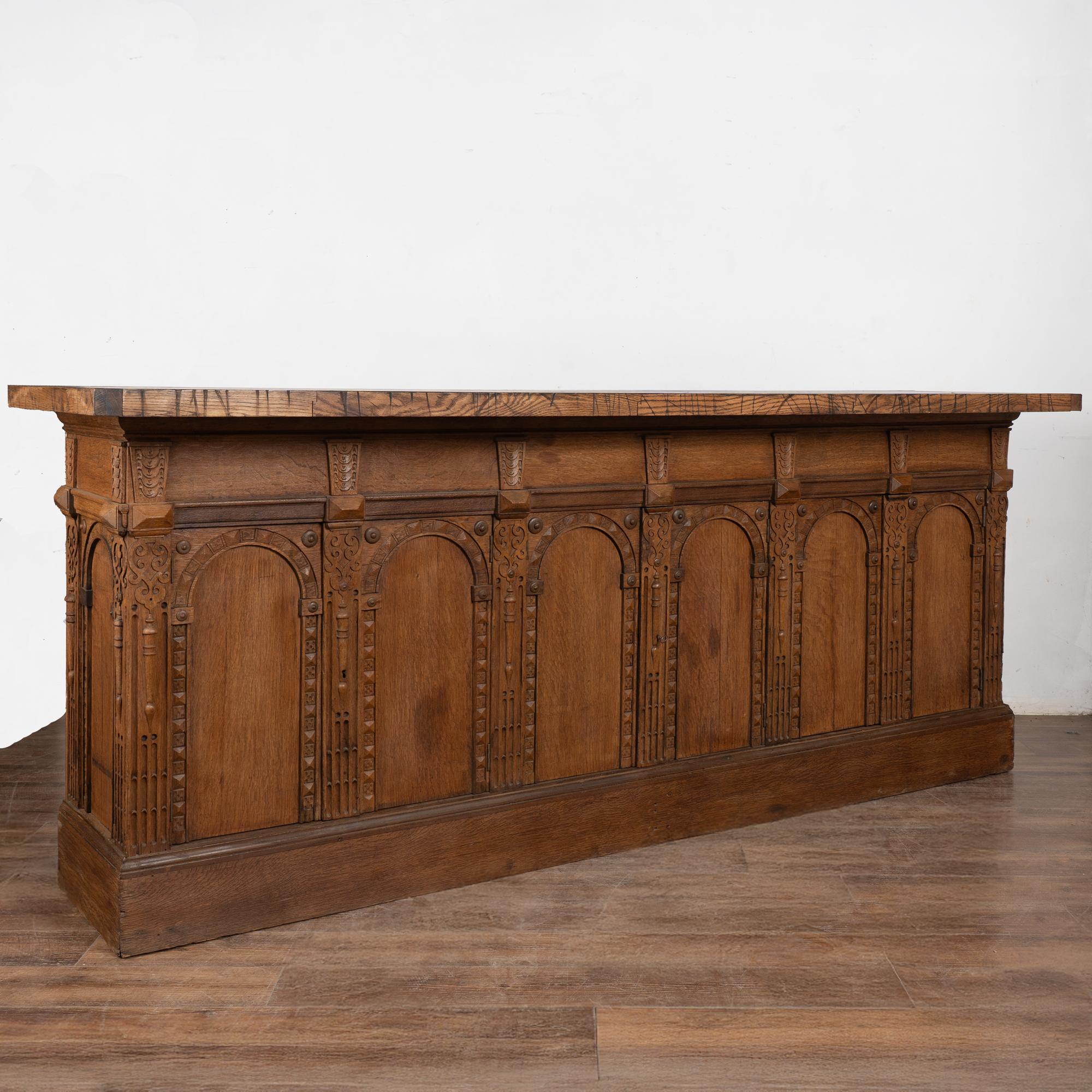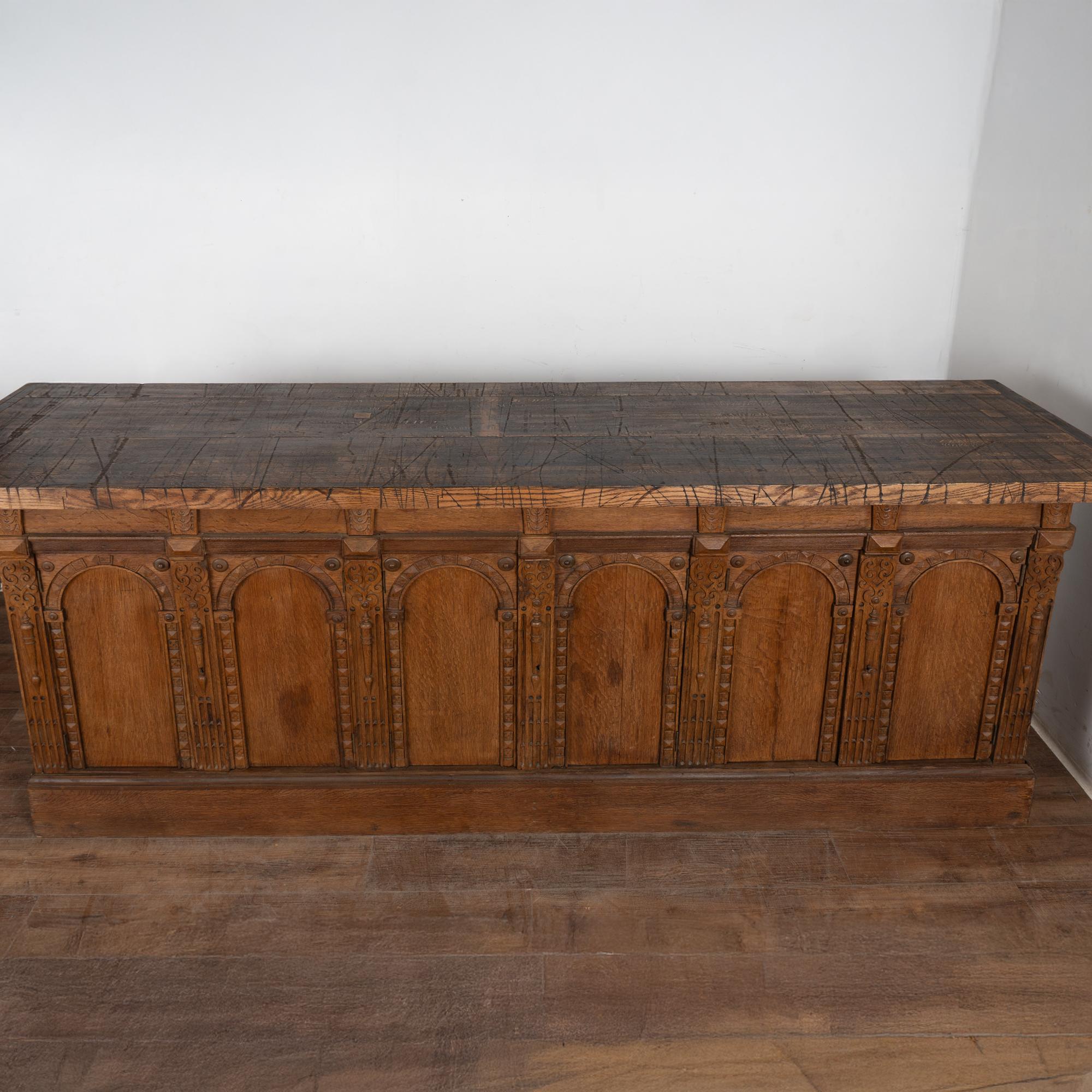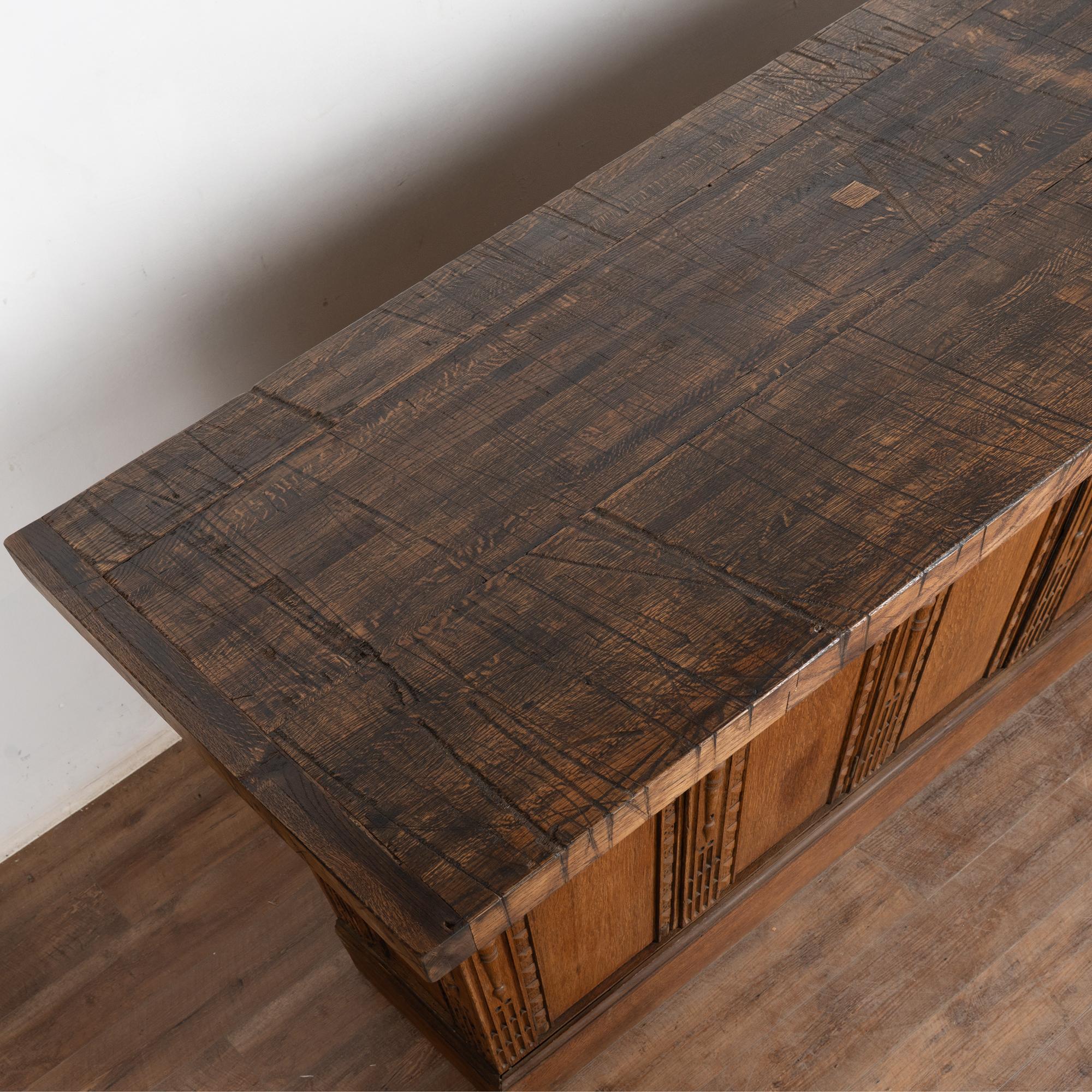 Late 19th-century French oak sideboard converted into a unique 9' long standing bar. Features carved arches, half-column details, and dark oak finish with rich patina. The added bar top is made from old boxcar flooring, bearing deep gouges and scratches that tell its industrial past. Interior shelving, base, and back have been replaced with pine for reinforcement over time. One key included for cabinet a (old locks may work inconsistently, key/s may also be used as pulls only).
