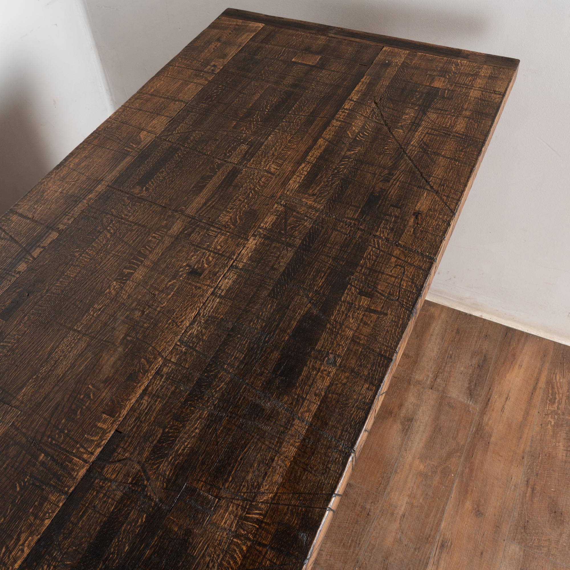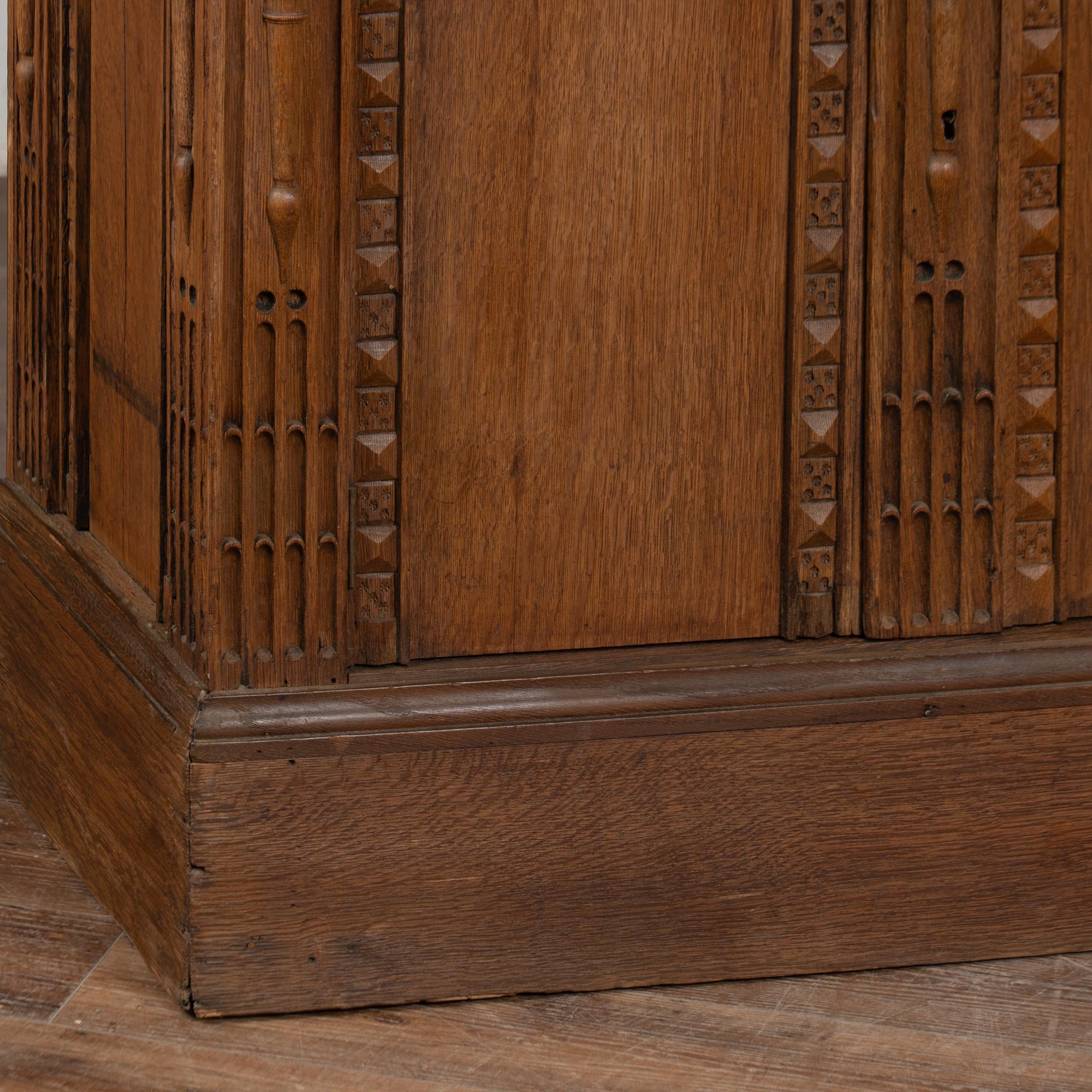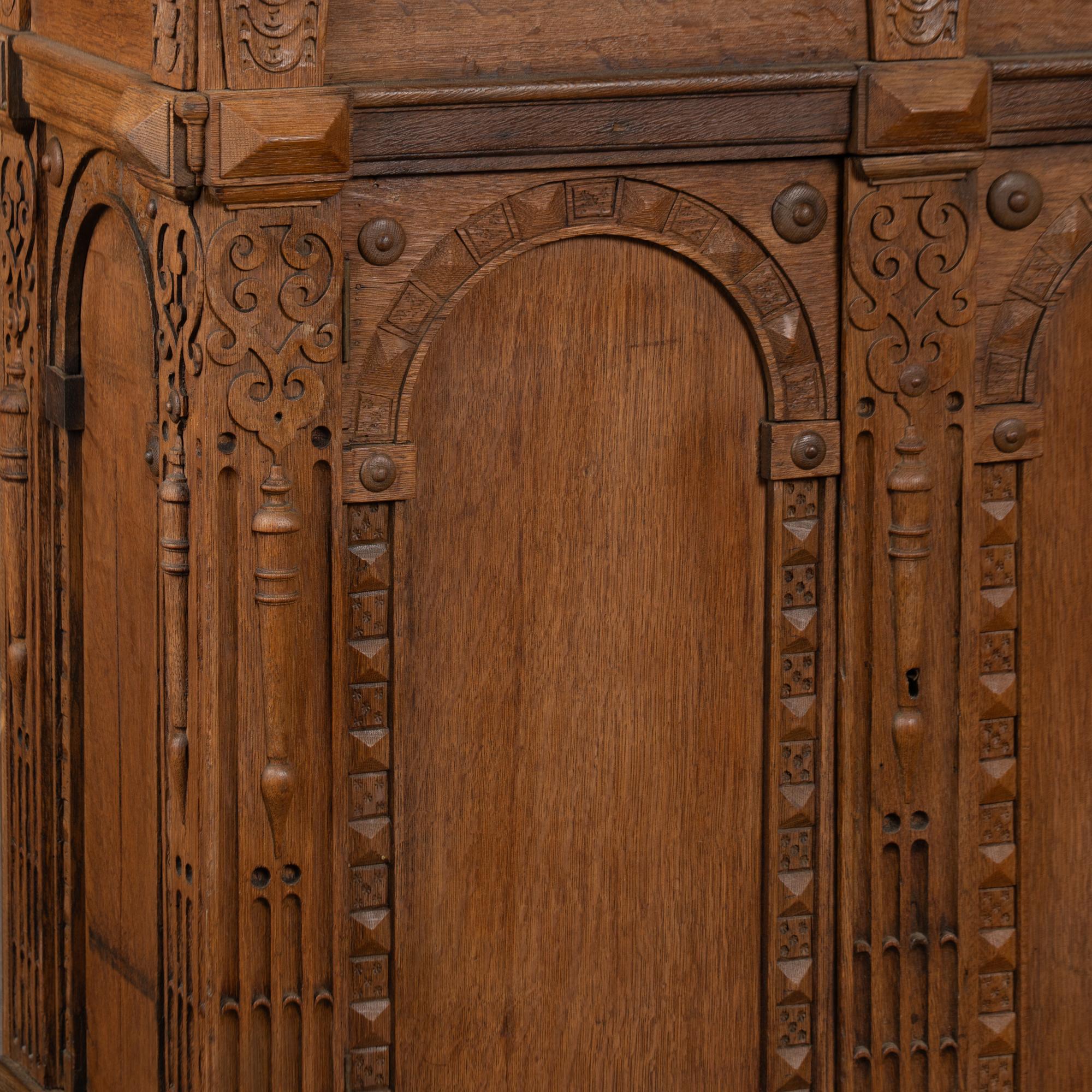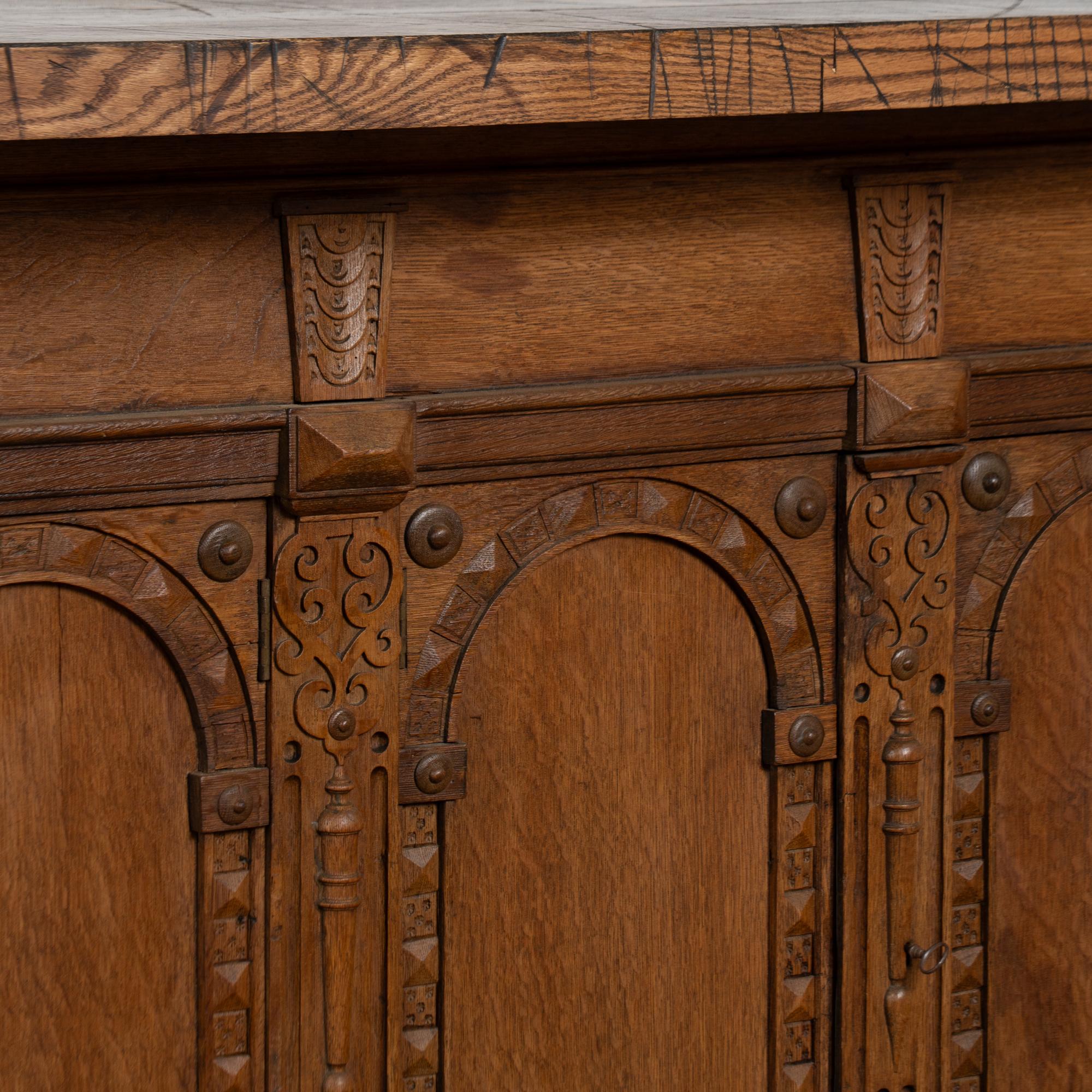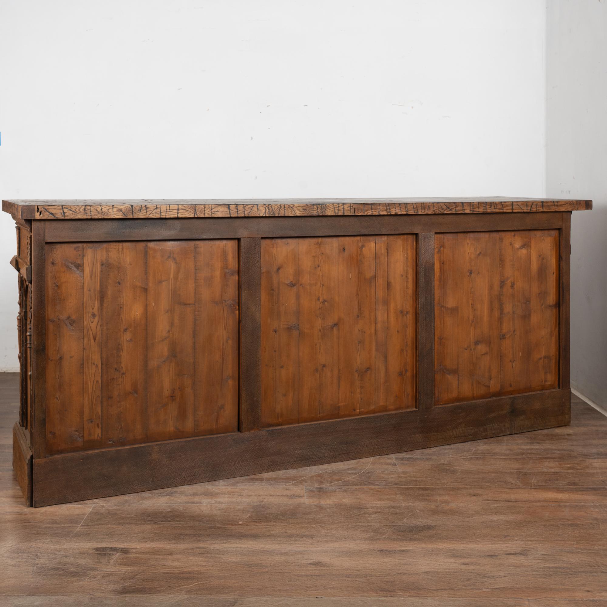Late 19th-century French oak sideboard converted into a unique 9' long standing bar. Features carved arches, half-column details, and dark oak finish with rich patina. The added bar top is made from old boxcar flooring, bearing deep gouges and scratches that tell its industrial past. Interior shelving, base, and back have been replaced with pine for reinforcement over time. One key included for cabinet a (old locks may work inconsistently, key/s may also be used as pulls only).