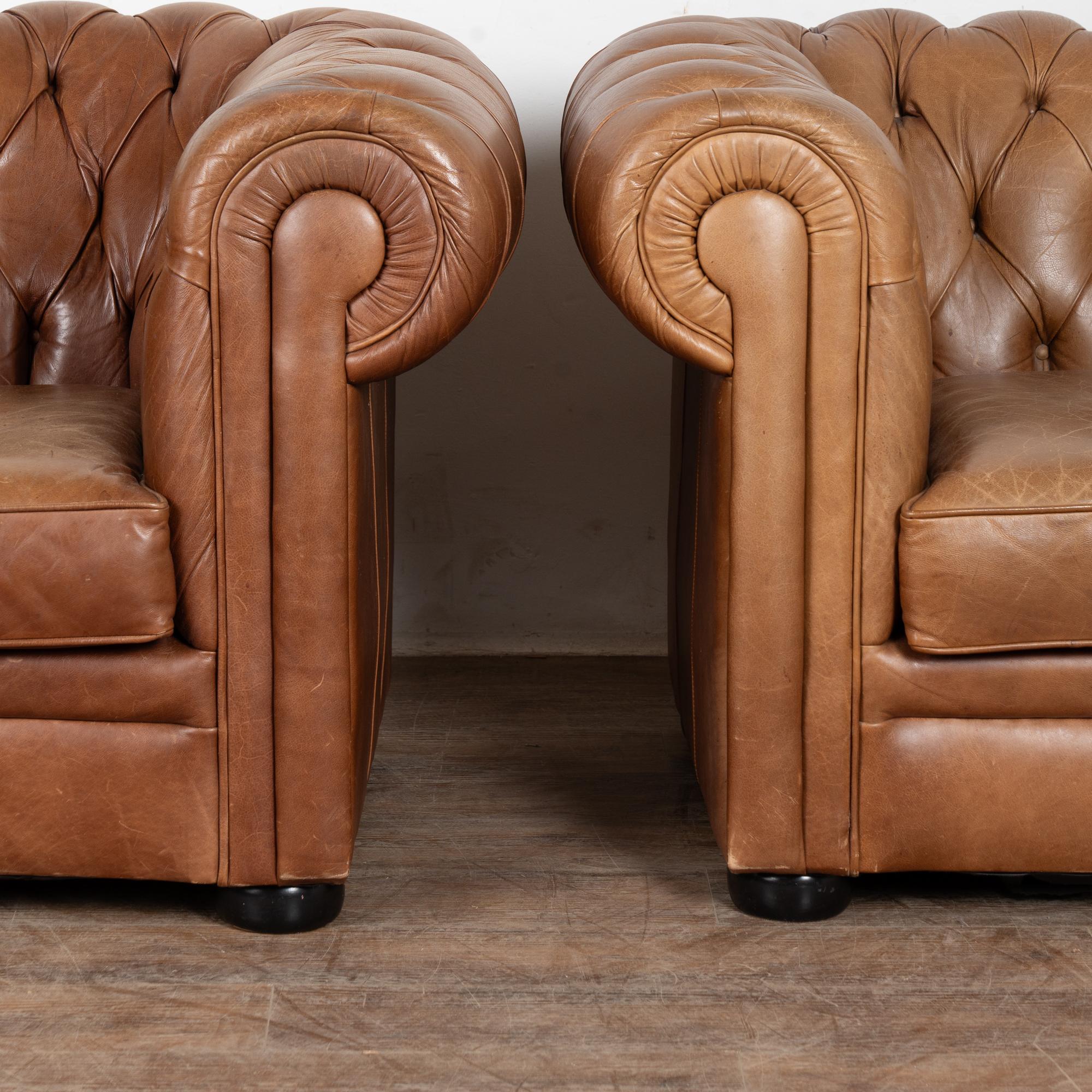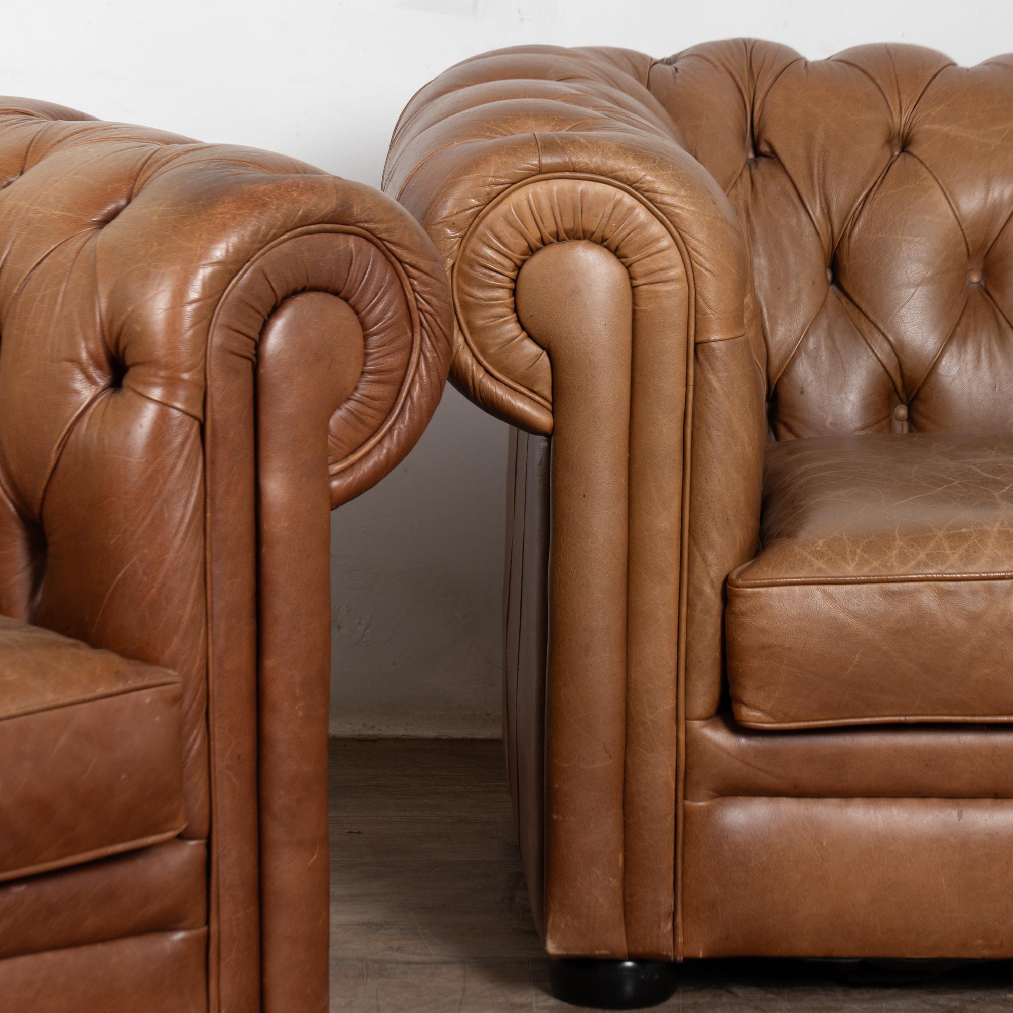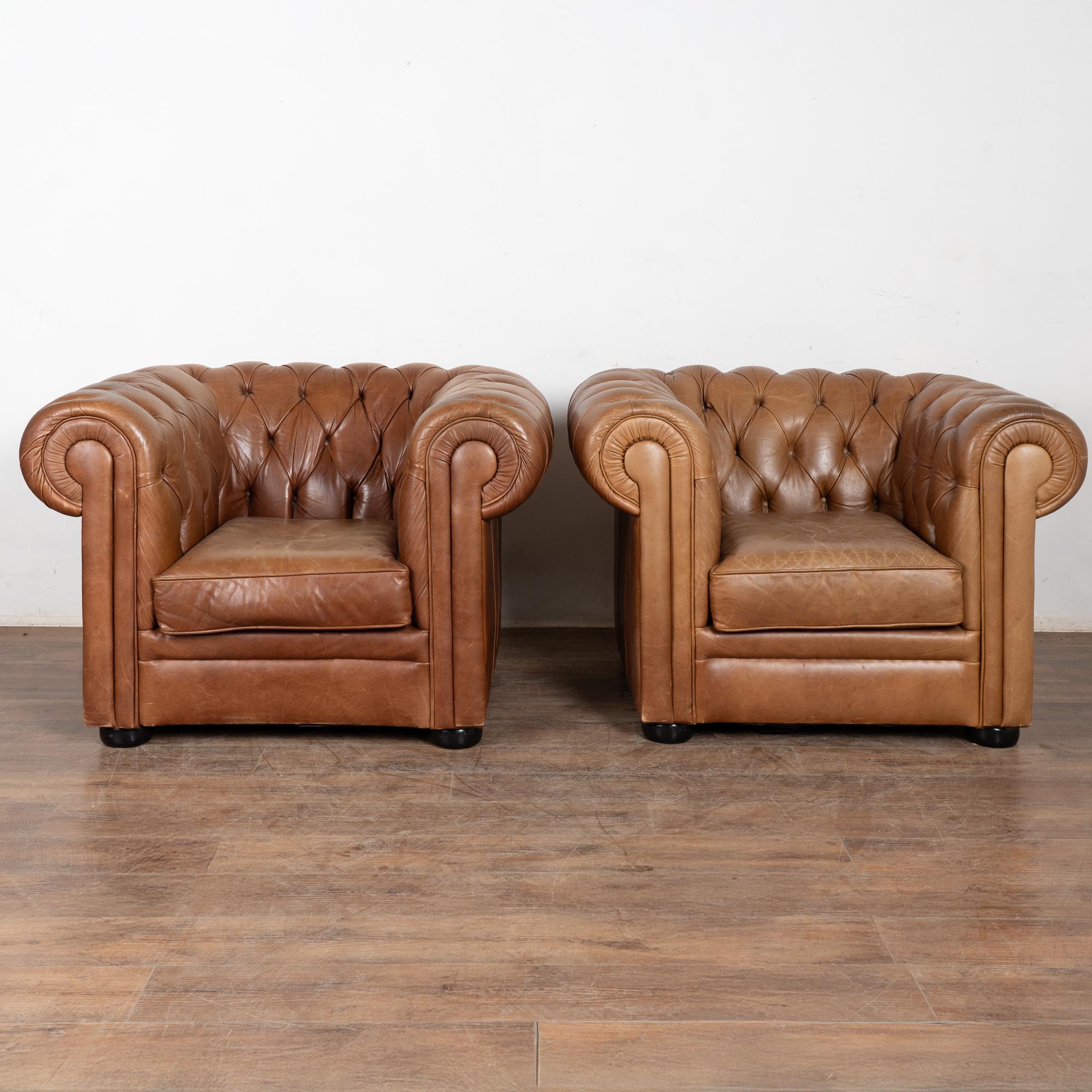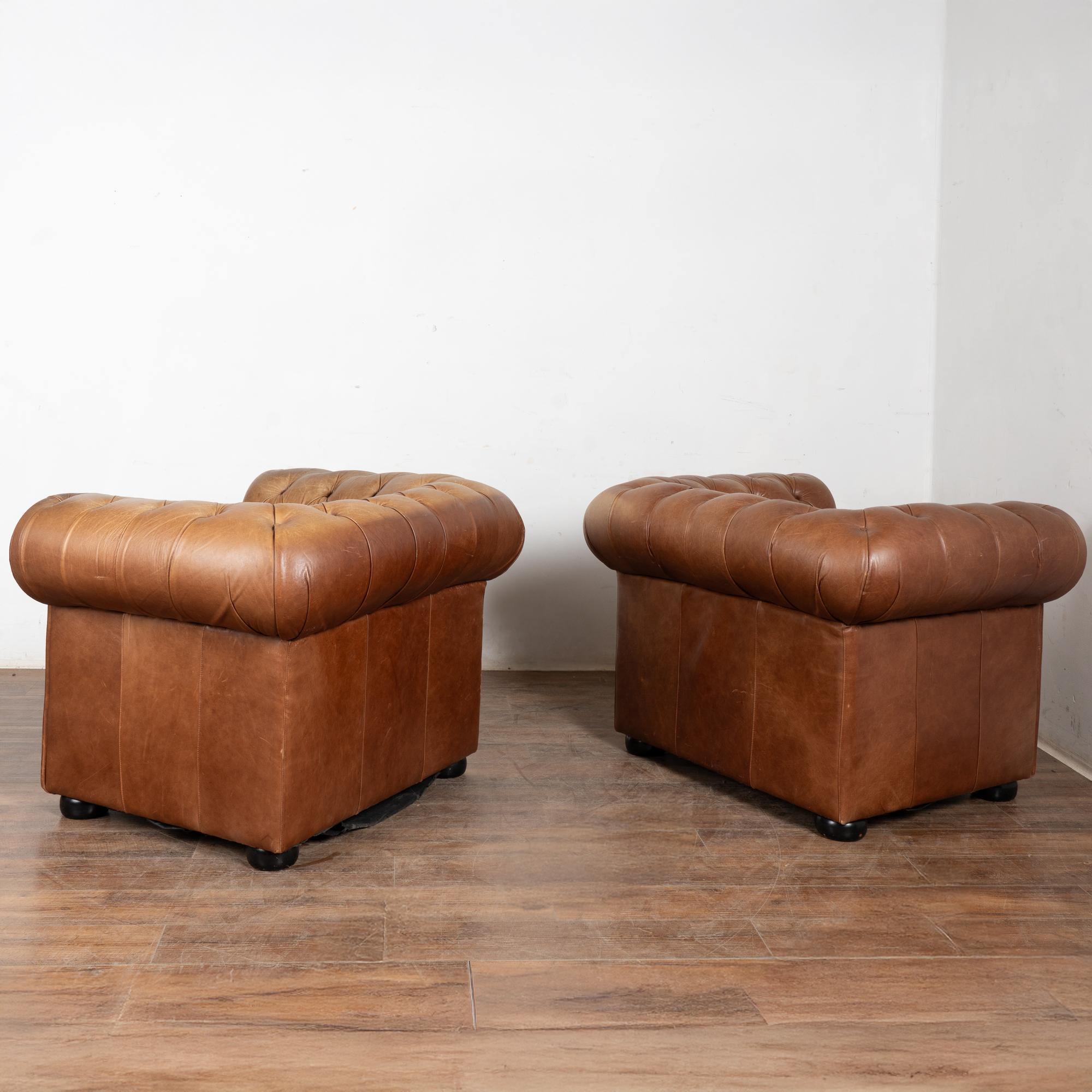 Pair of 20th-century vintage brown leather Chesterfield club chairs featuring tufted backs, self-piping, and wood bun feet. Leather shows expected aged wear including scuffs, crackles, stains, surface scratches and scuffs. One chair presents slightly lighter from sun exposure; the darker shows more distress on armrests. Cushions include zipper closures for easy filling or replacement. Classic low-seat design offers comfortable lounging with timeless style suited for study, den, or lounge.