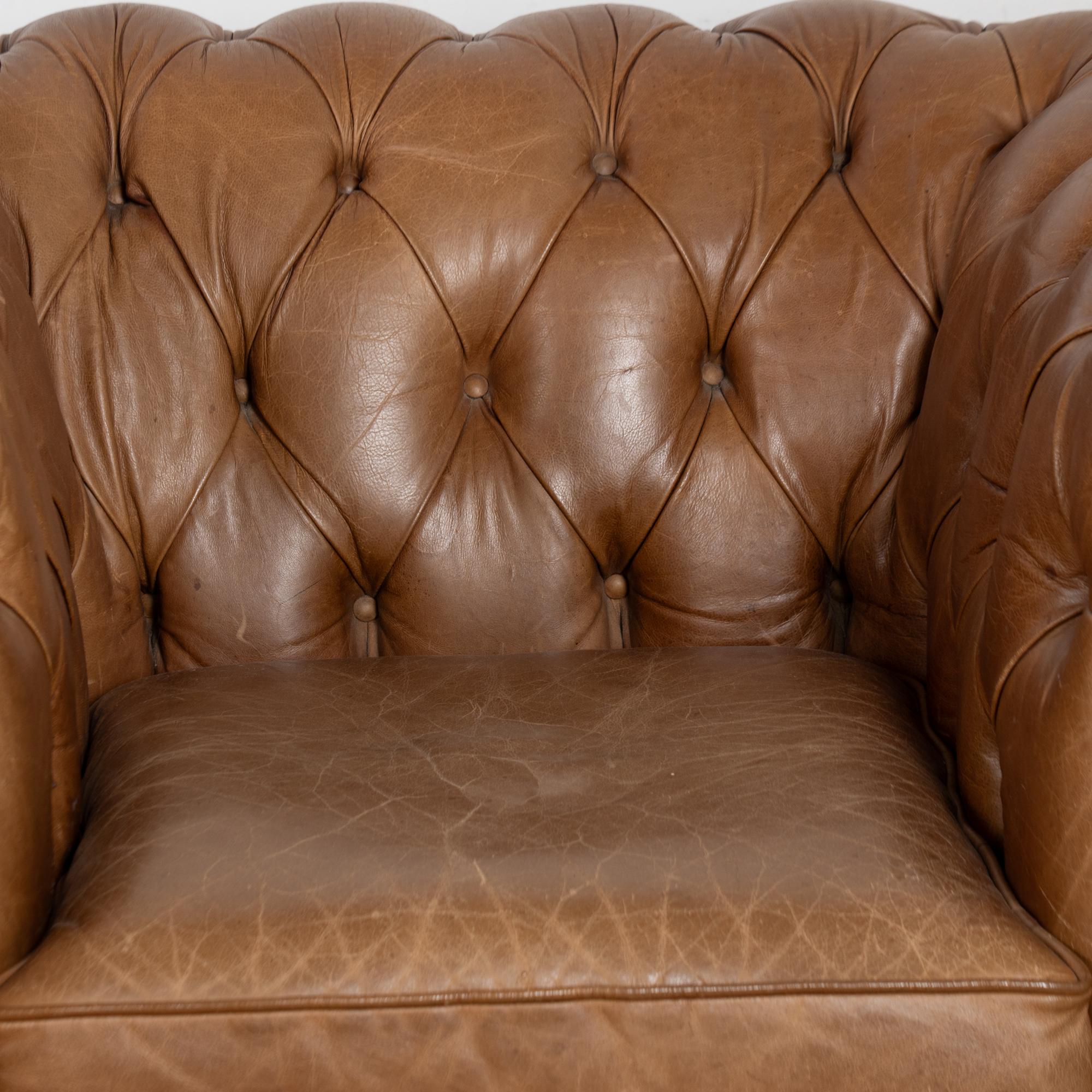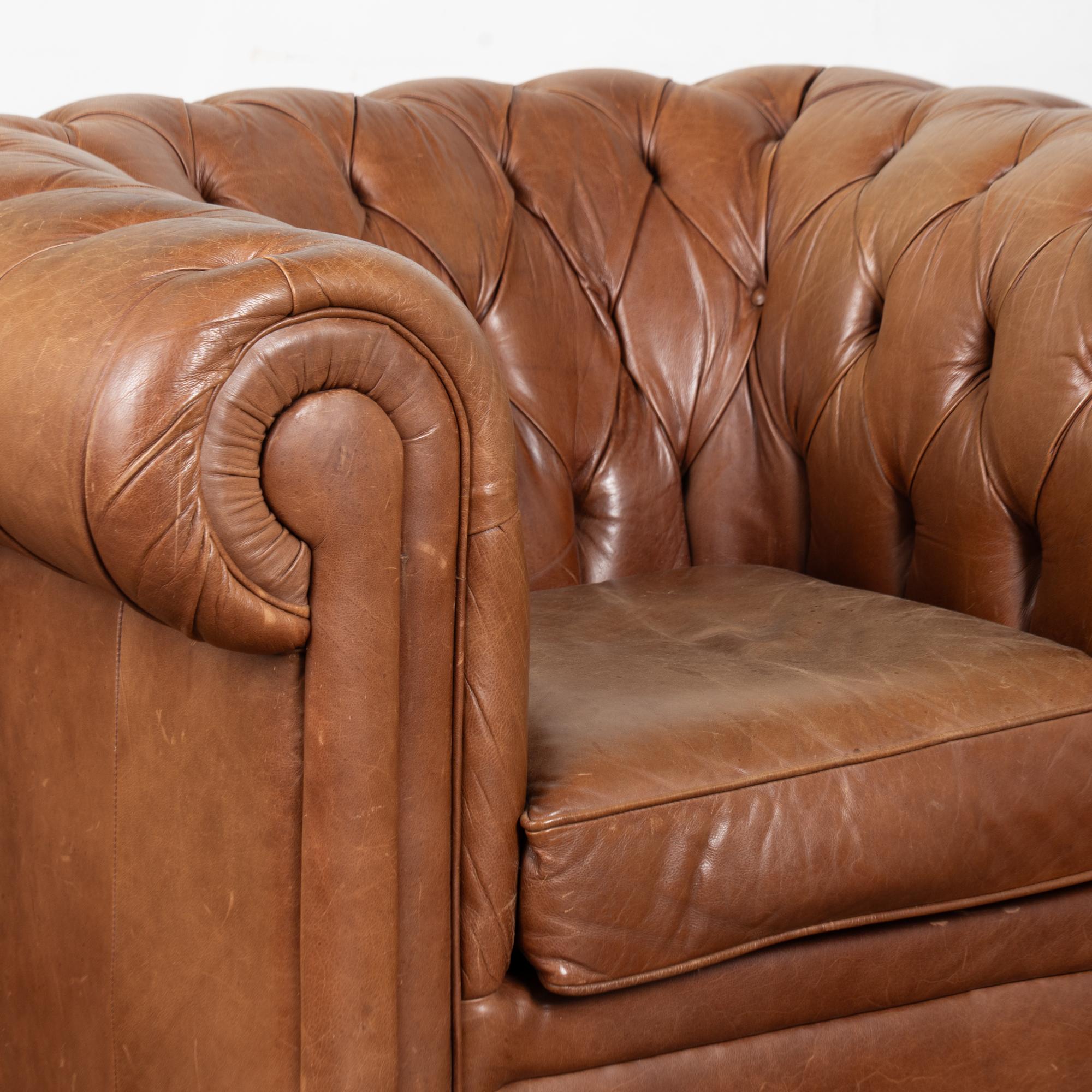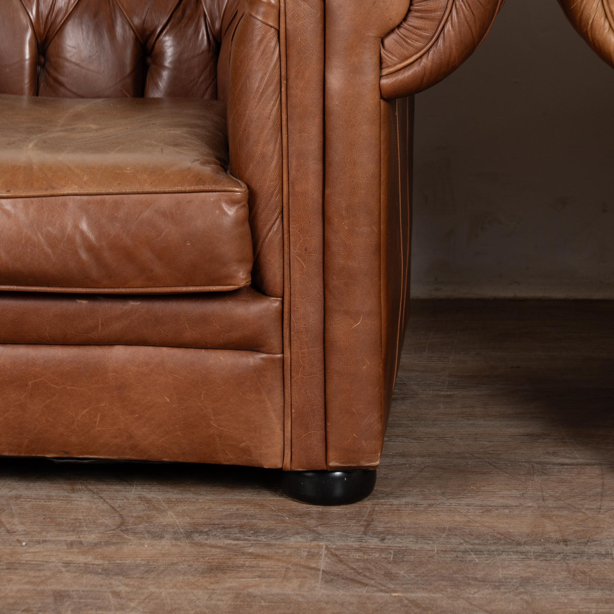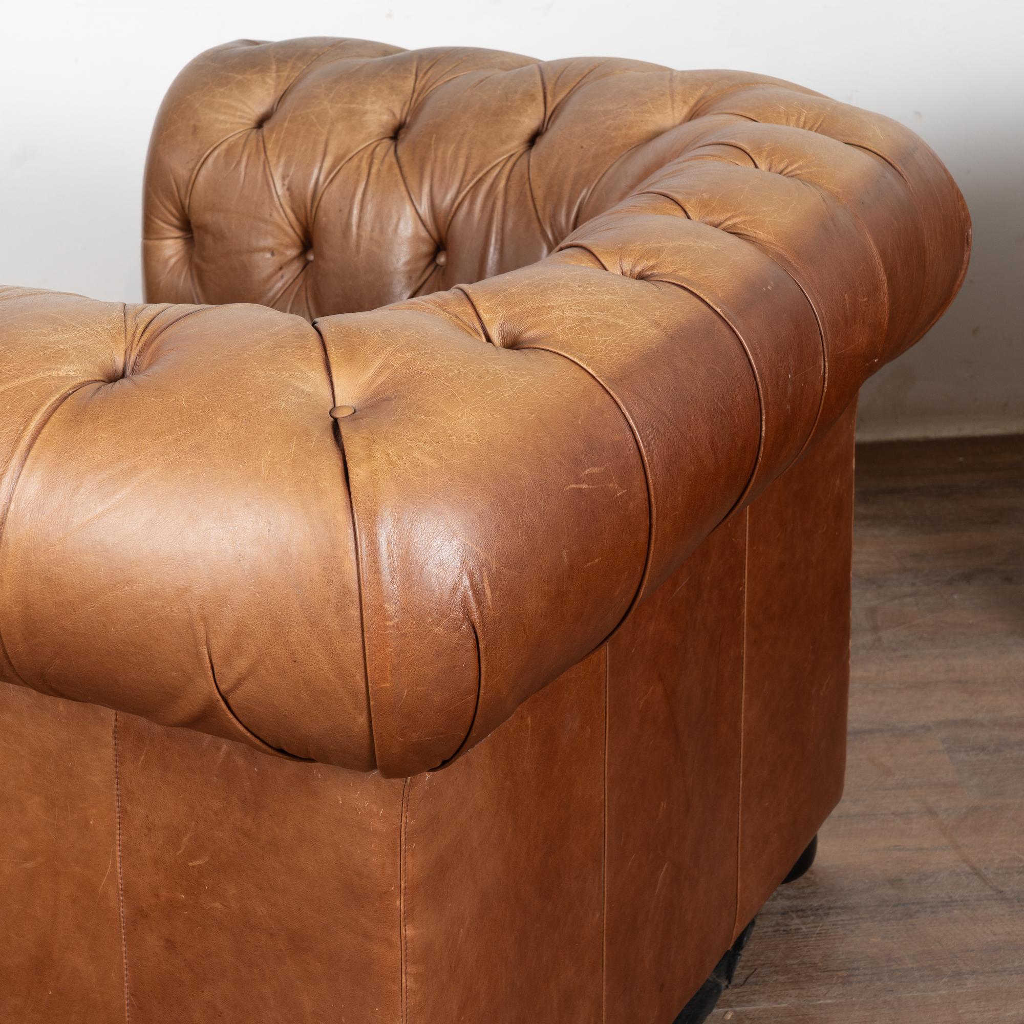 Pair of 20th-century vintage brown leather Chesterfield club chairs featuring tufted backs, self-piping, and wood bun feet. Leather shows expected aged wear including scuffs, crackles, stains, surface scratches and scuffs. One chair presents slightly lighter from sun exposure; the darker shows more distress on armrests. Cushions include zipper closures for easy filling or replacement. Classic low-seat design offers comfortable lounging with timeless style suited for study, den, or lounge.