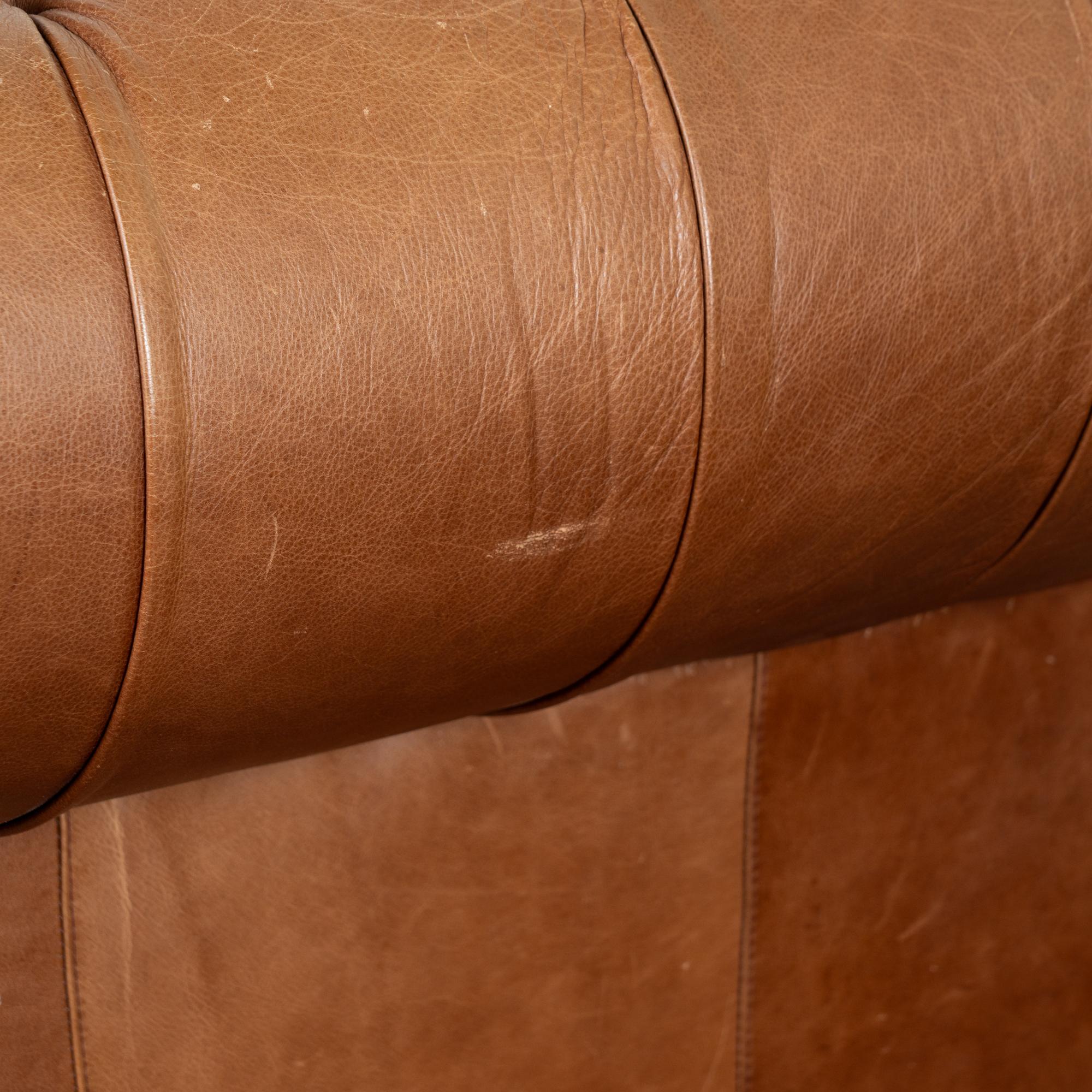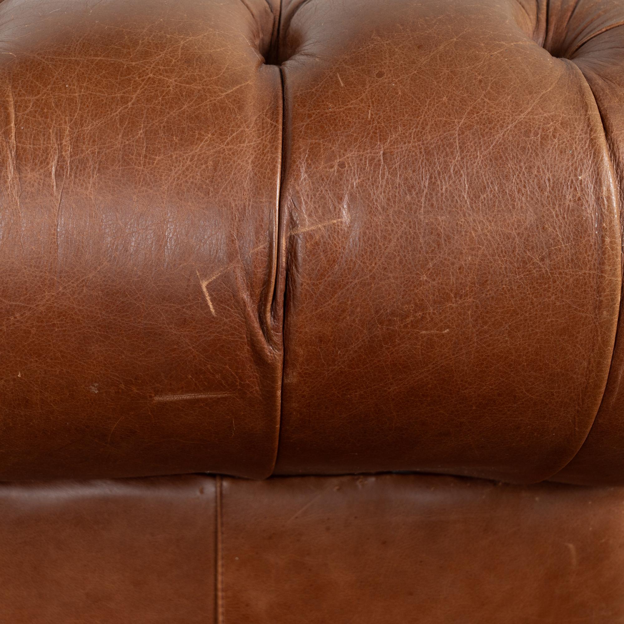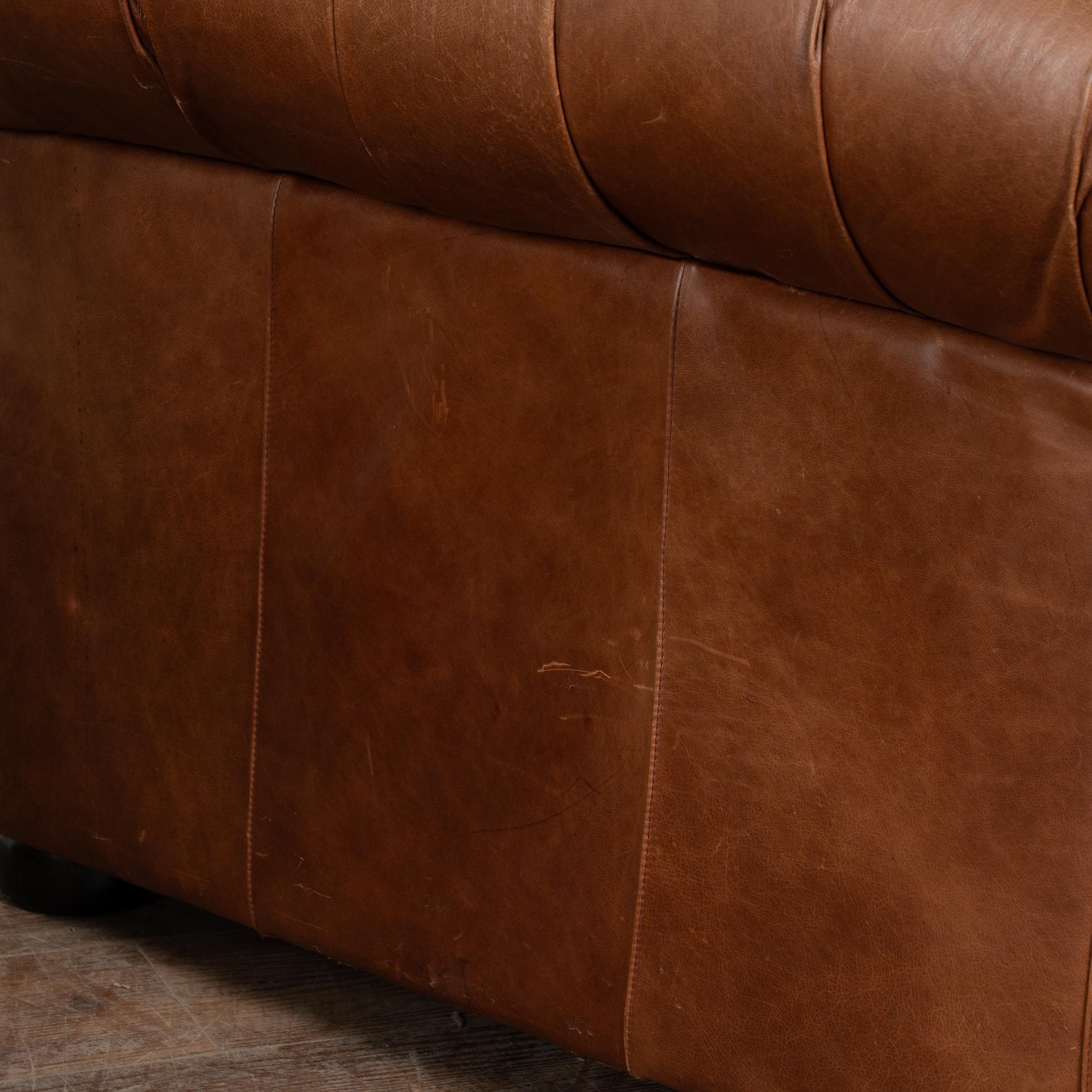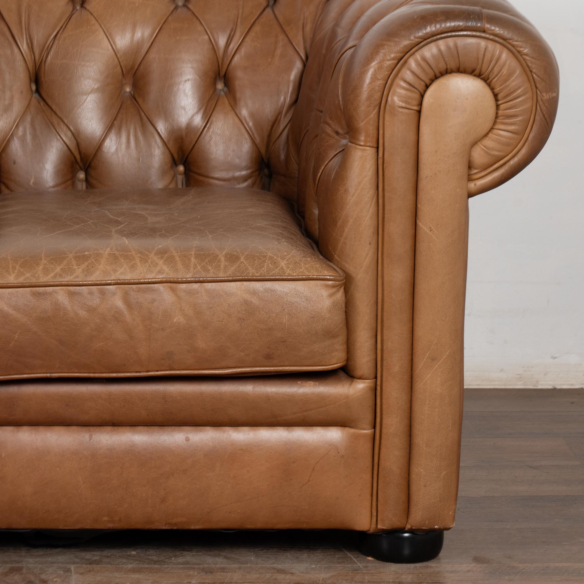 Pair of 20th-century vintage brown leather Chesterfield club chairs featuring tufted backs, self-piping, and wood bun feet. Leather shows expected aged wear including scuffs, crackles, stains, surface scratches and scuffs. One chair presents slightly lighter from sun exposure; the darker shows more distress on armrests. Cushions include zipper closures for easy filling or replacement. Classic low-seat design offers comfortable lounging with timeless style suited for study, den, or lounge.