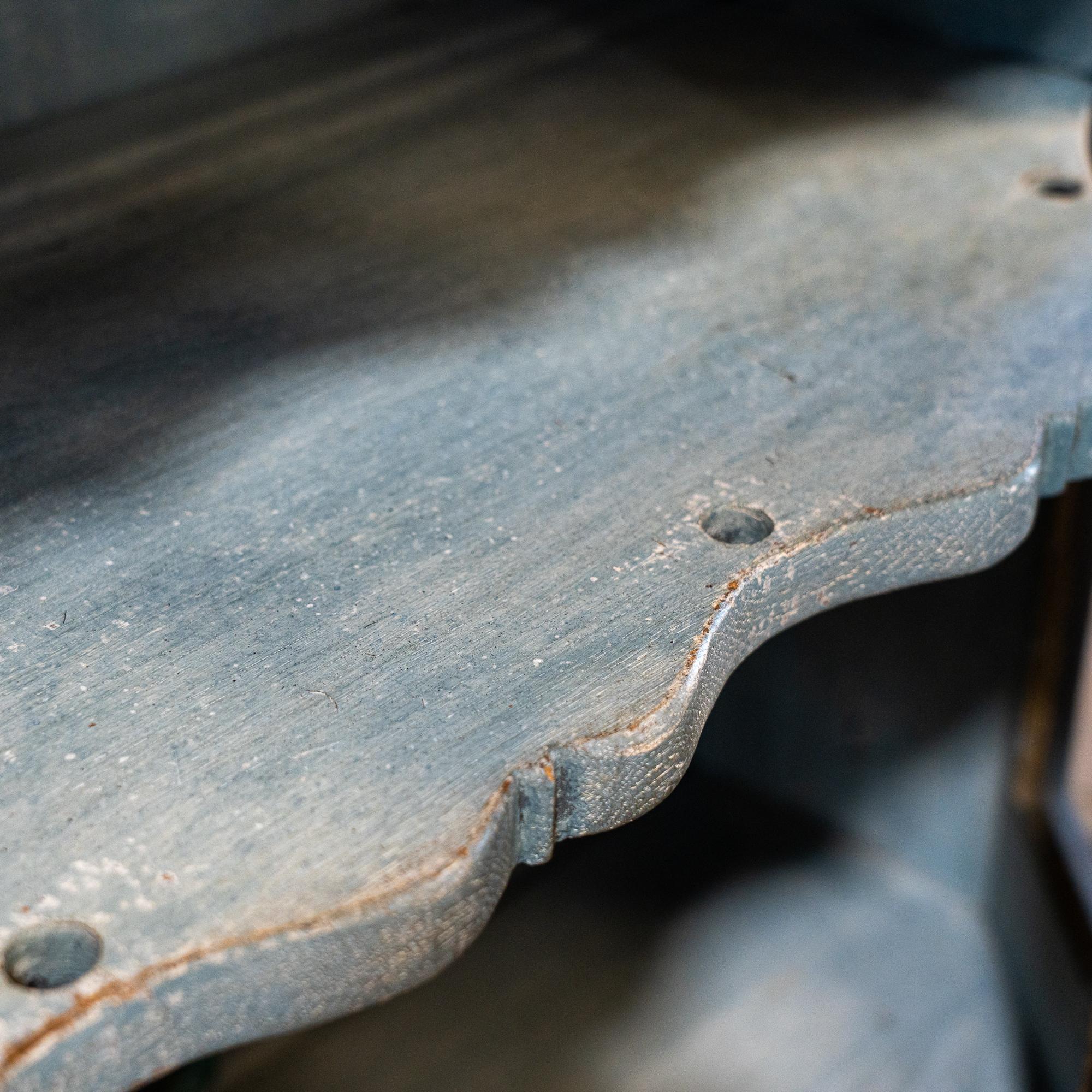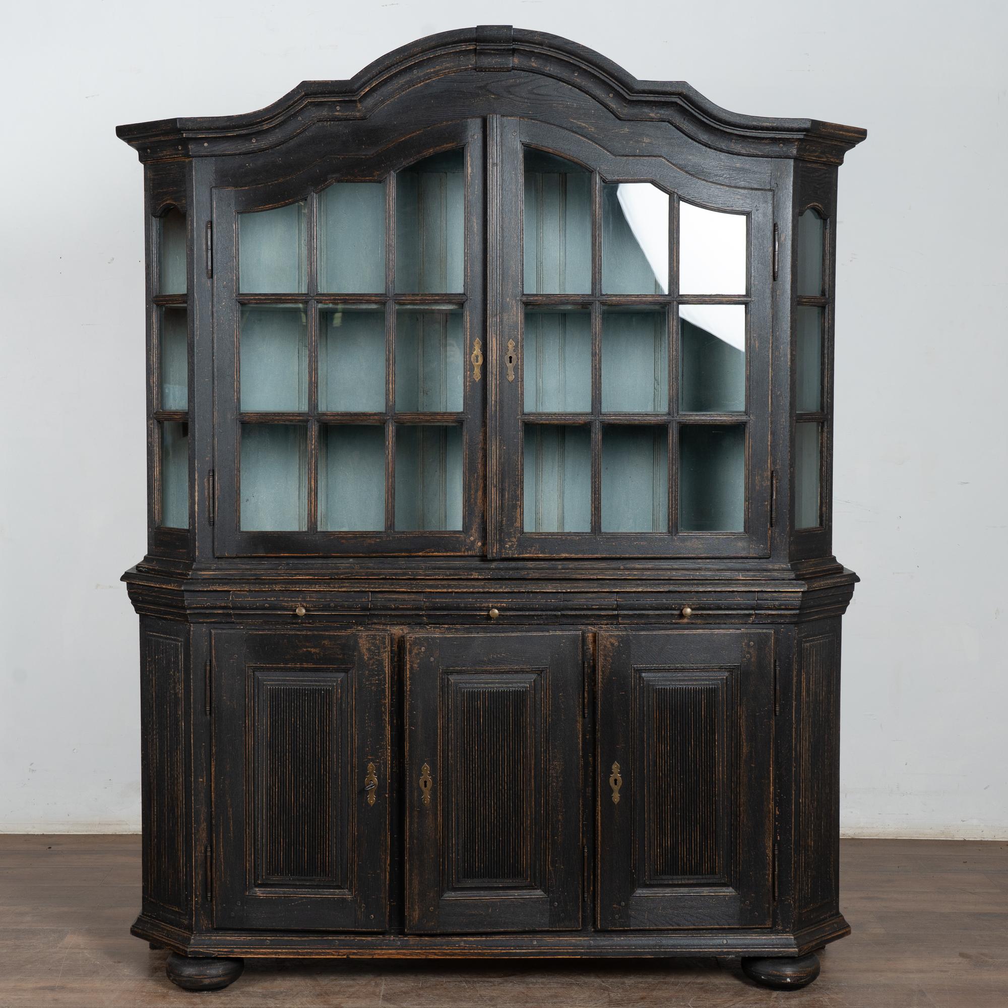 The newer professionally applied black painted finish is lightly distressed to fit the age and grace of the cabinet. The contrasting interior is painted in blue, creating a great background for displayed items.
