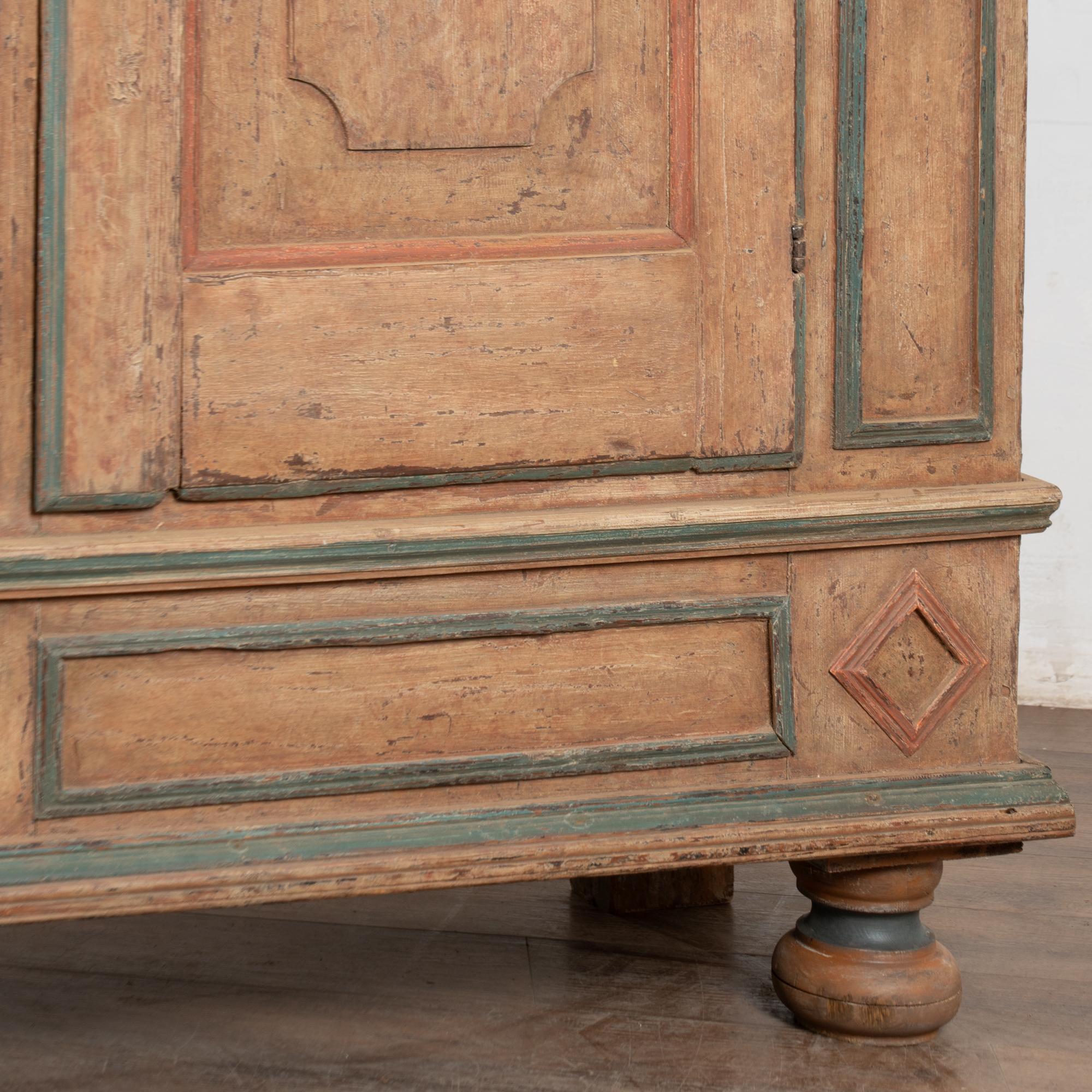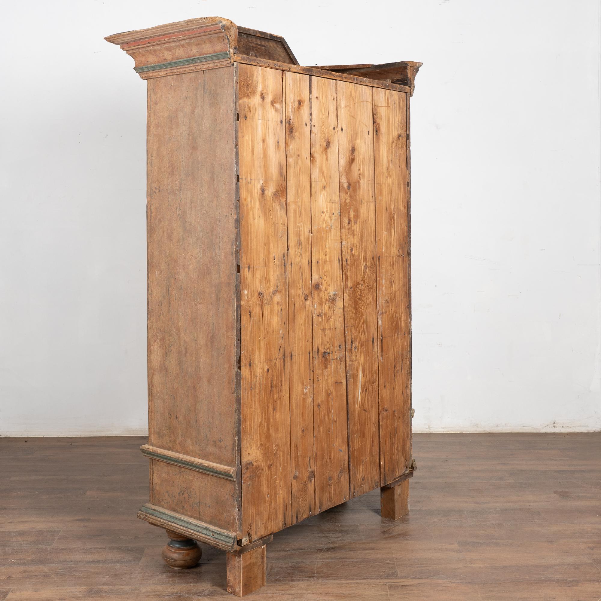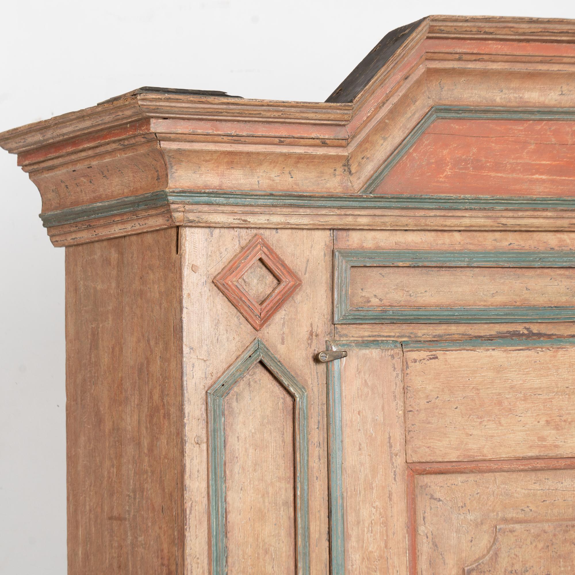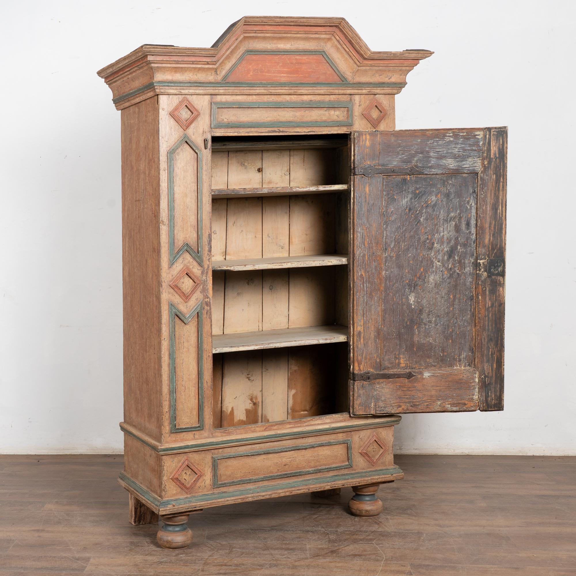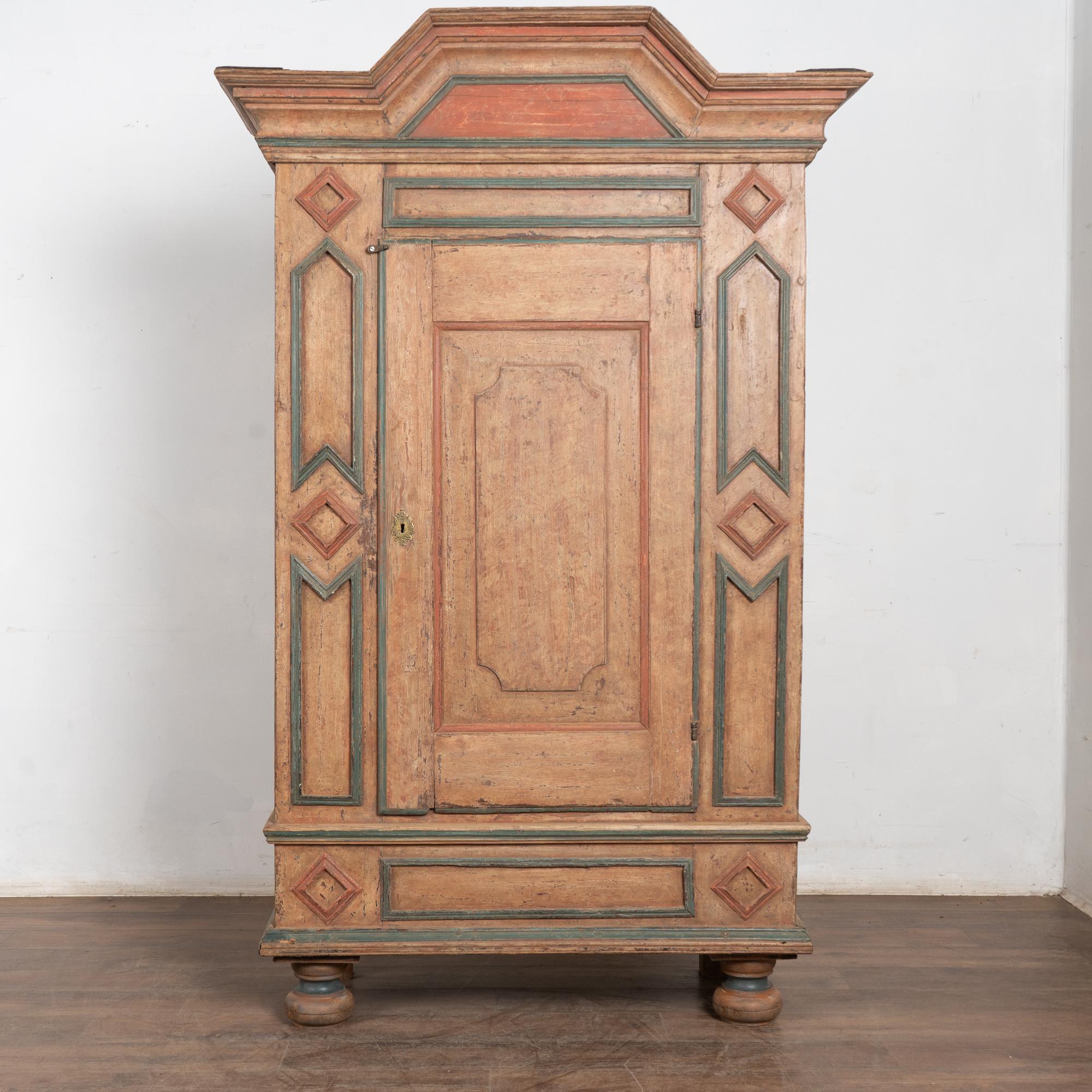 This single door pine armoire still maintains its original hand-painted finish. Layers of paint reveal tan, cream, and even a touch of rust in the background, with trim details in contrasting teal and aged-brick red.