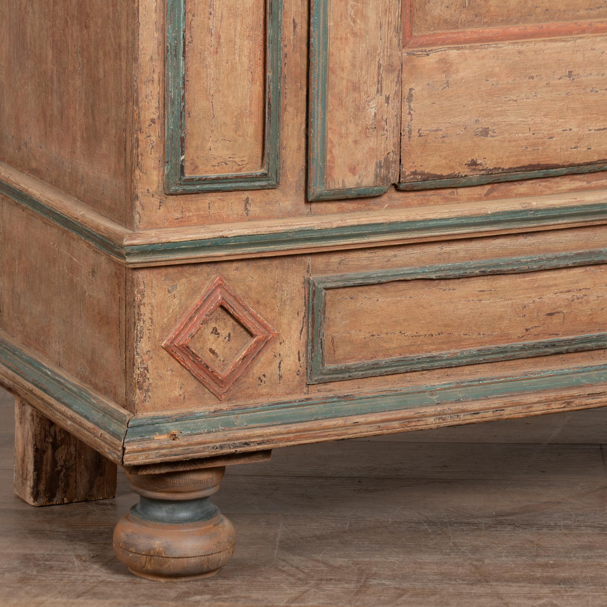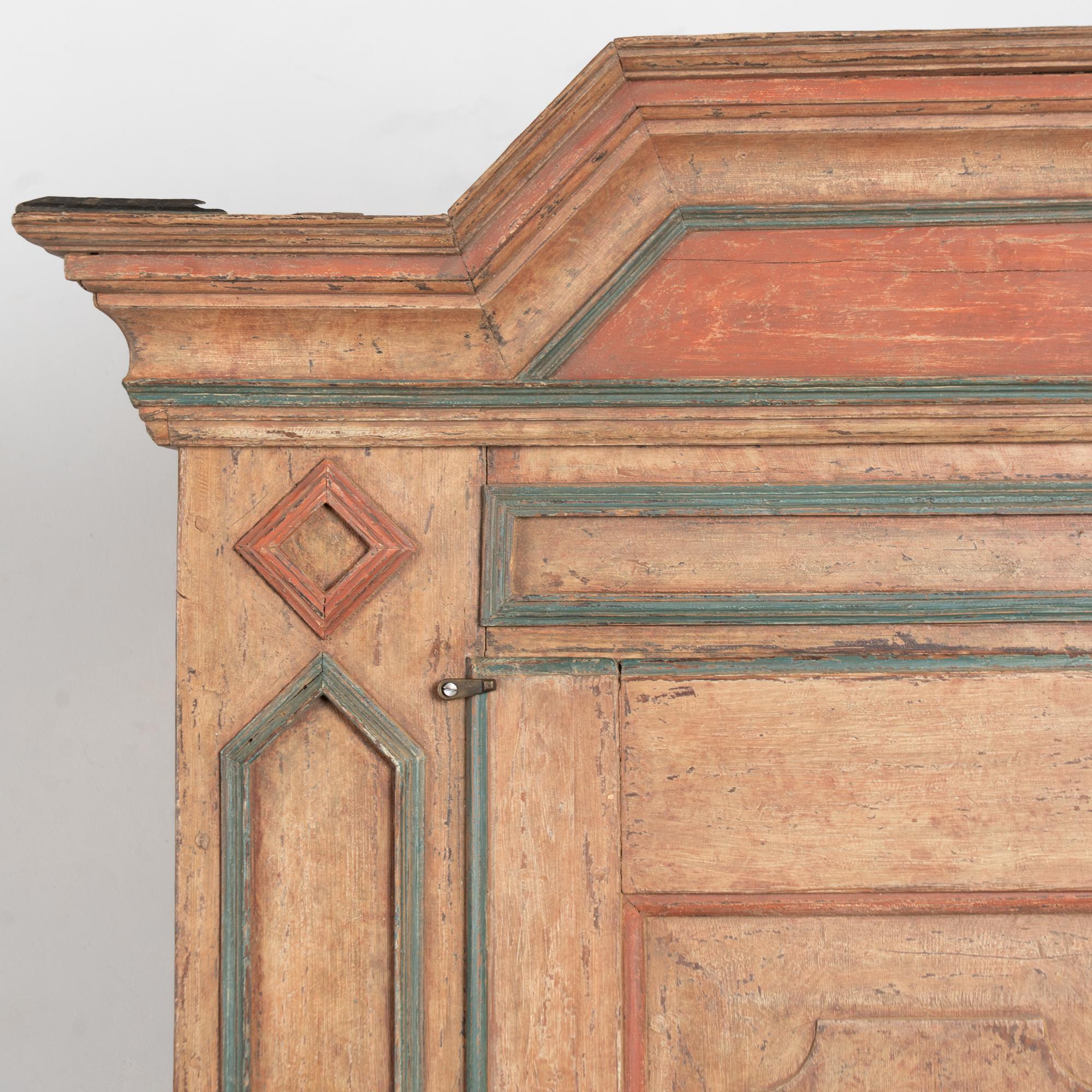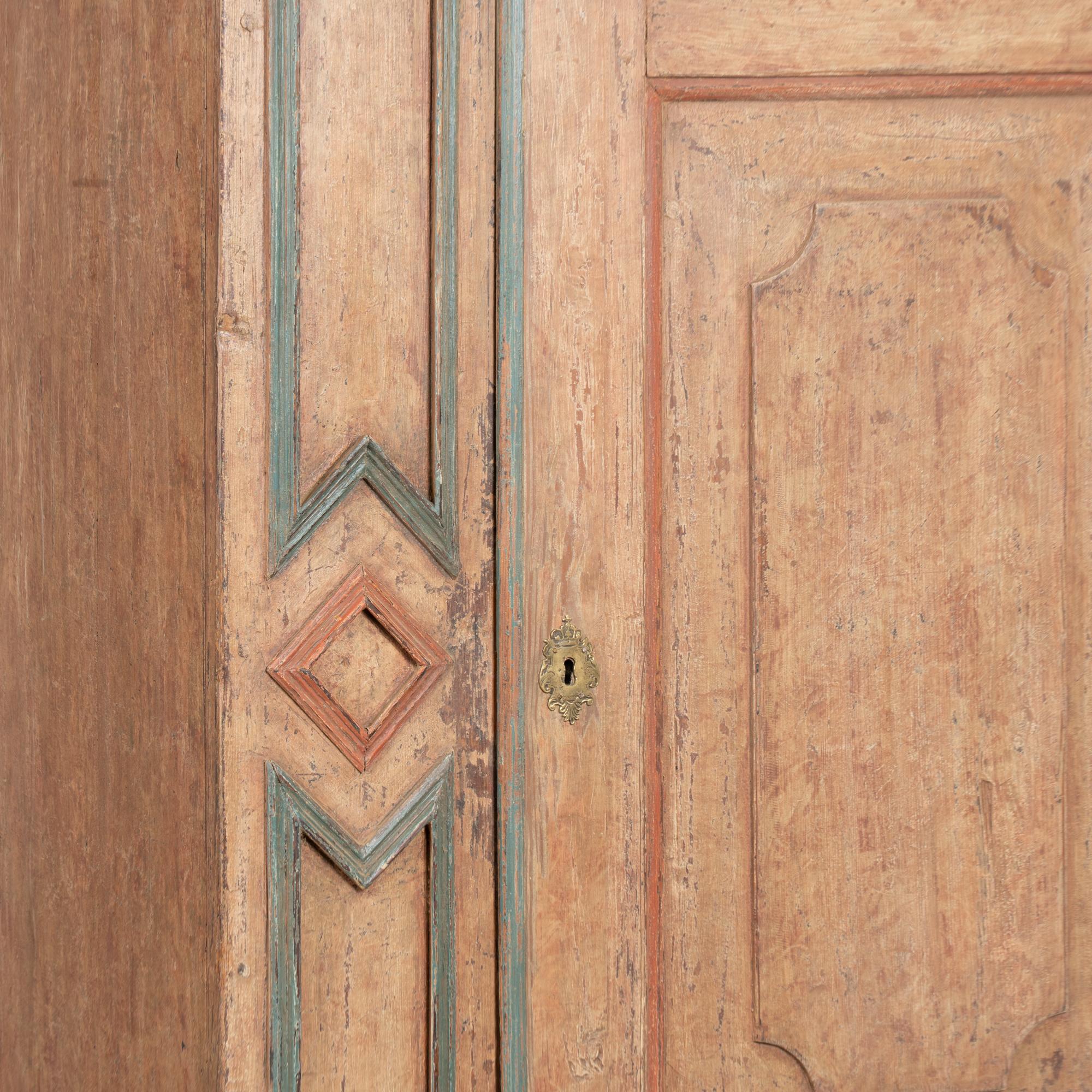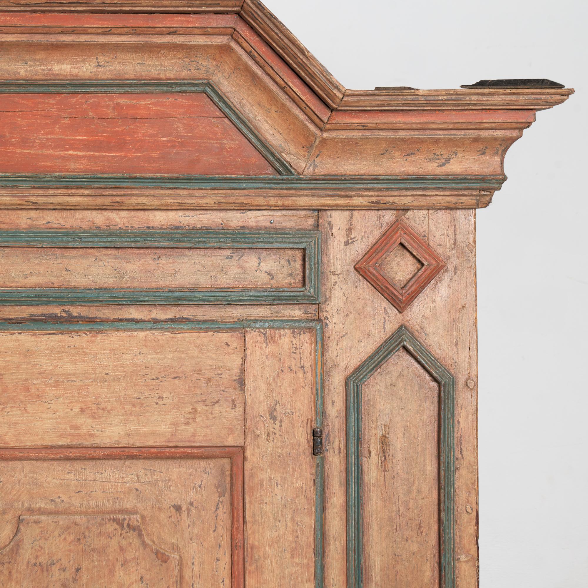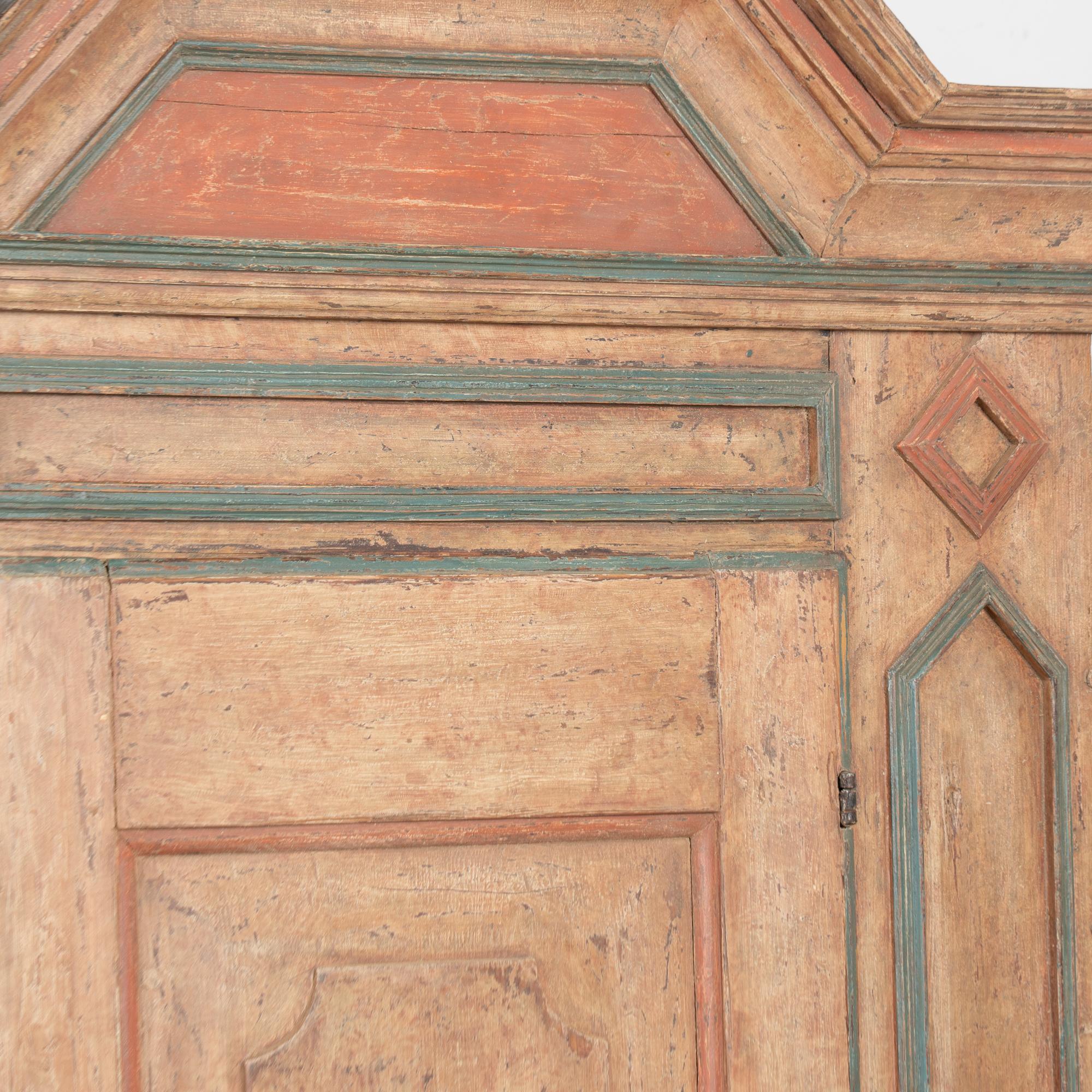 This single door pine armoire still maintains its original hand-painted finish. Layers of paint reveal tan, cream, and even a touch of rust in the background, with trim details in contrasting teal and aged-brick red.