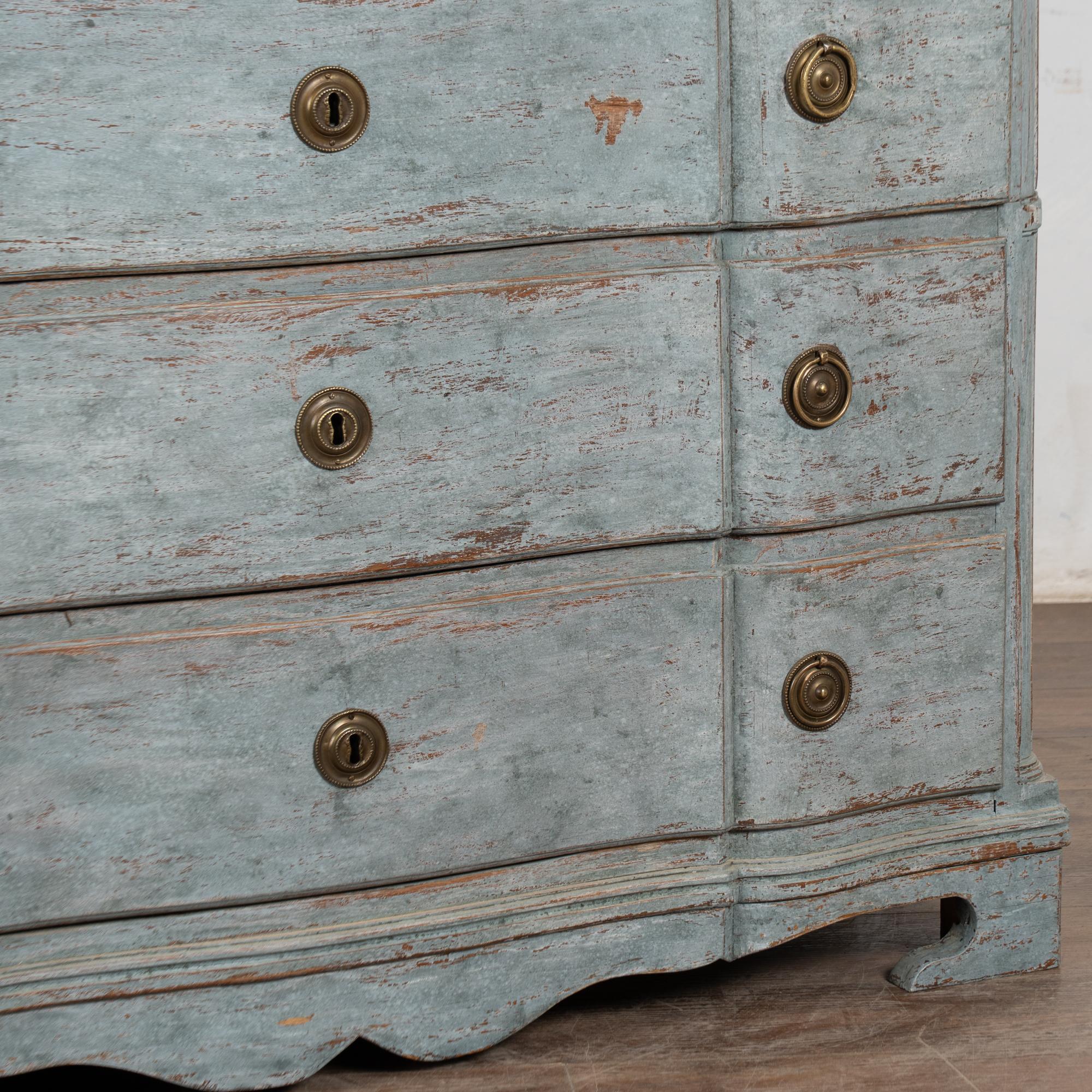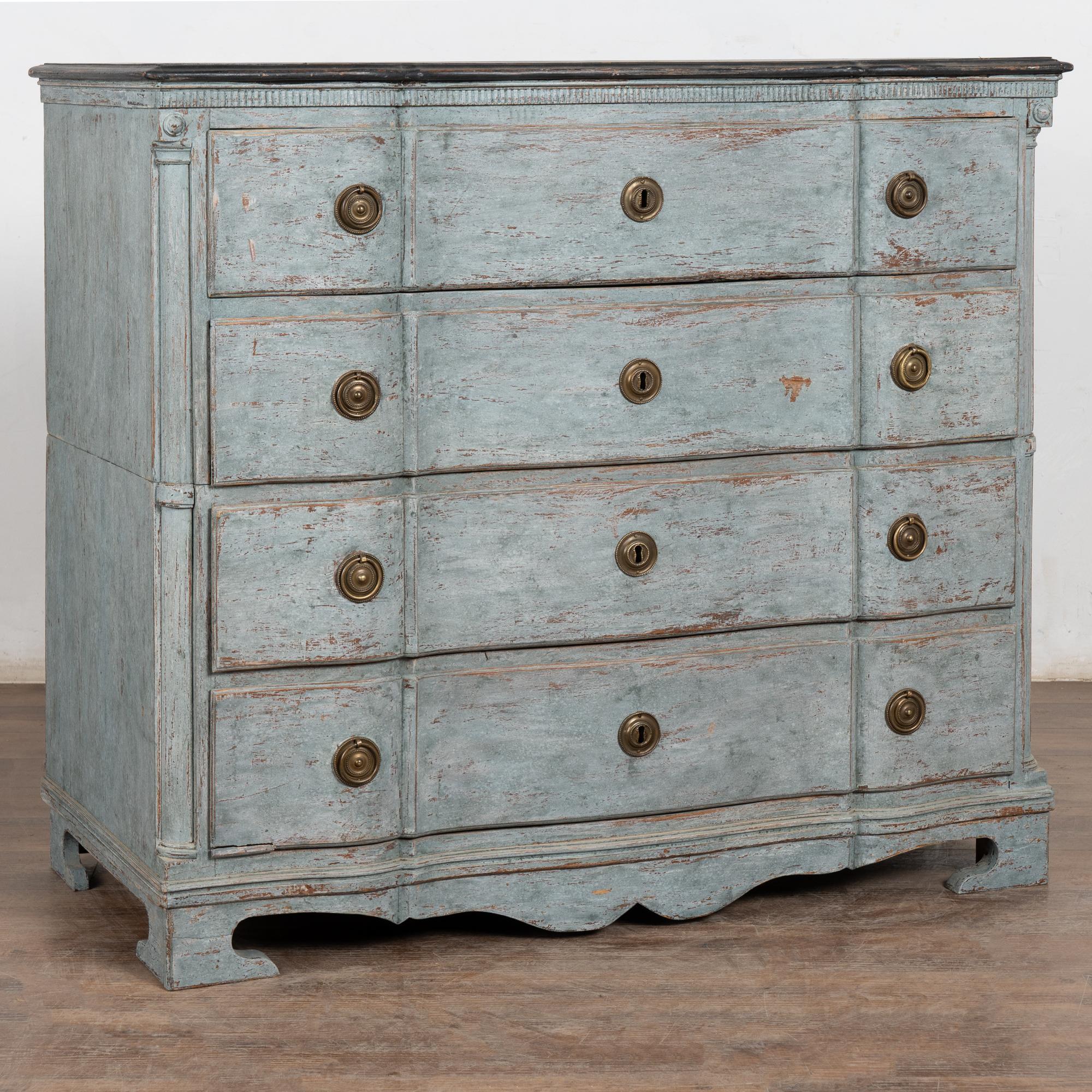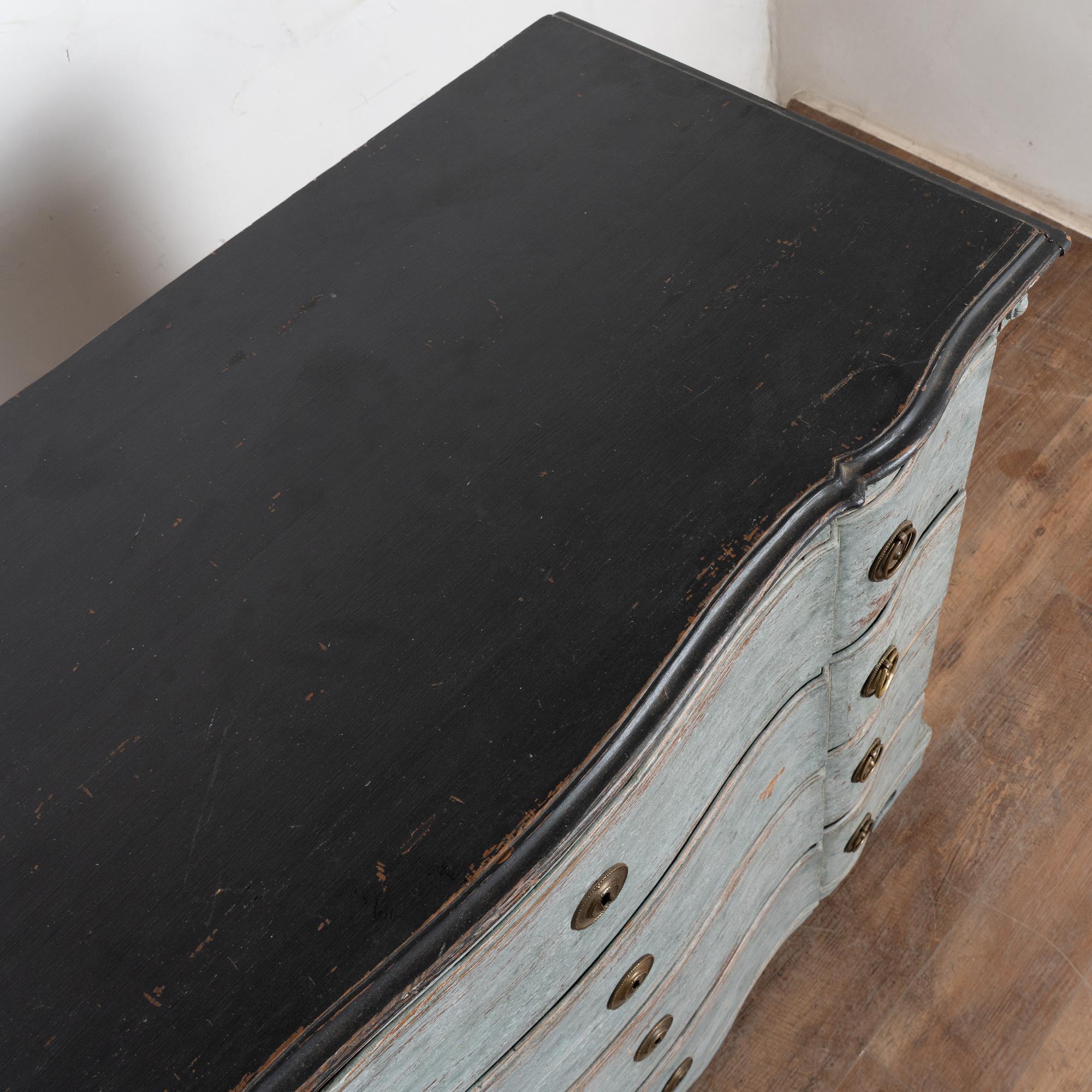 The newer, professionally applied and layered blue painted finish is gently scraped and distressed, revealing the natural wood below while complimenting the age and curved lines of the chest. Contrasting black painted top is also distressed revealing the wood below.