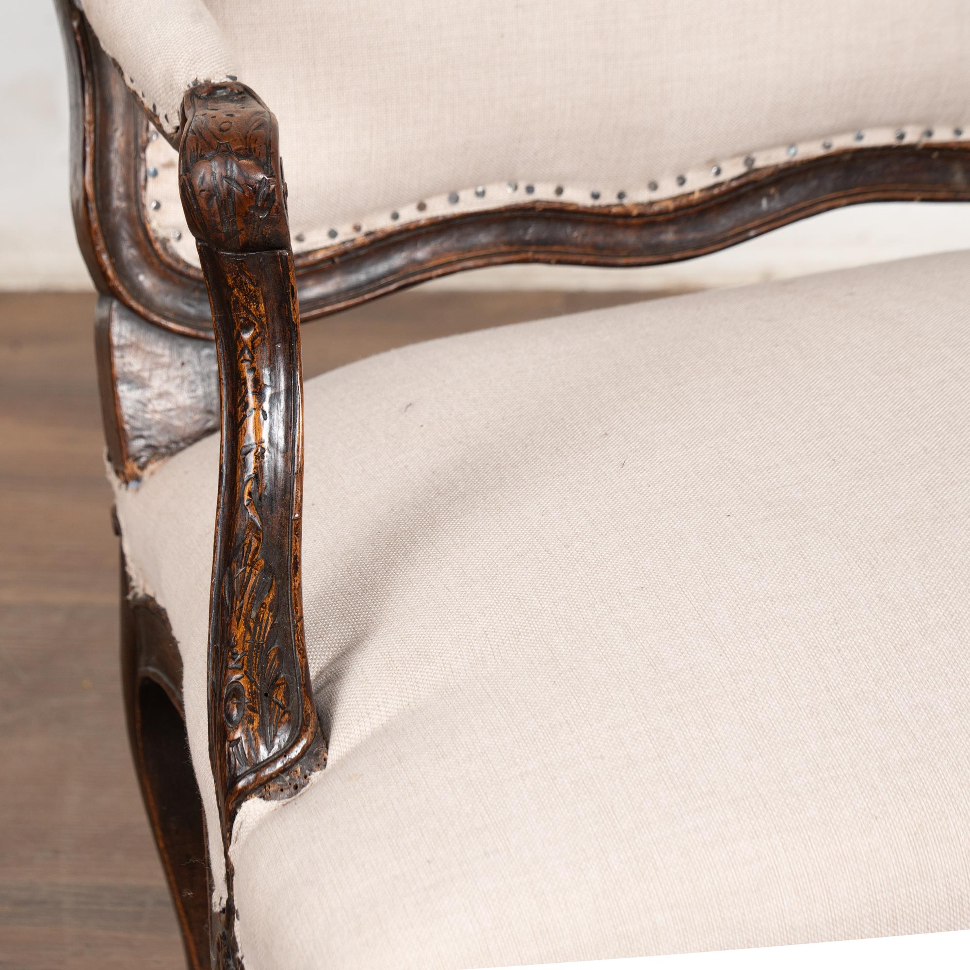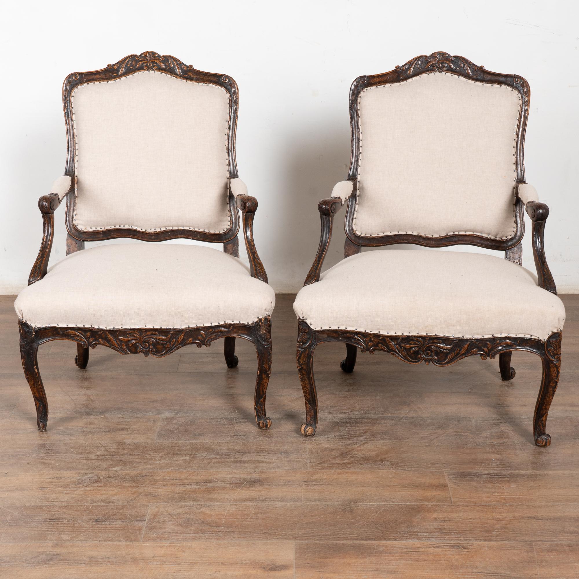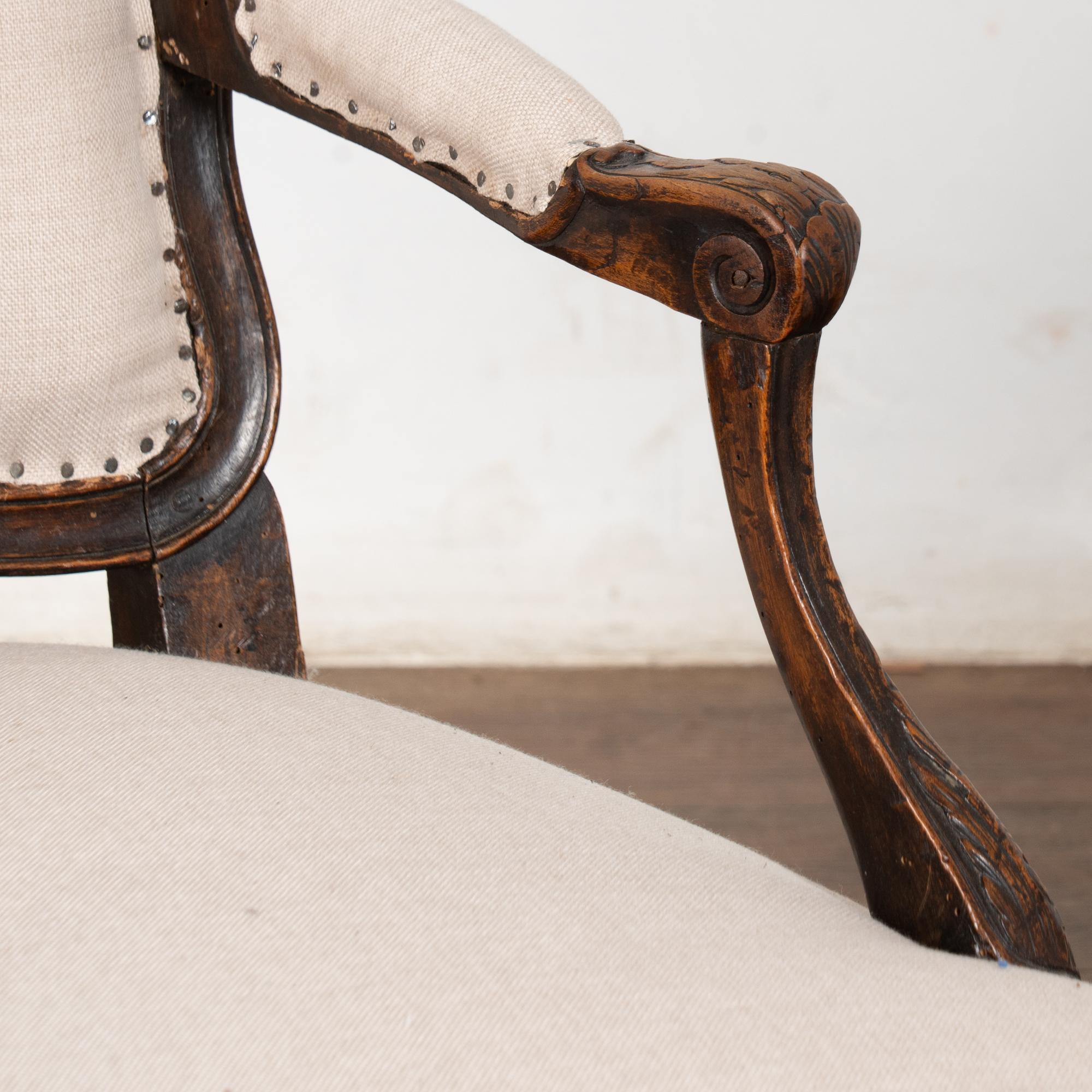 The seats are upholstered in a newer linen fabric, tacked down with exposed nails and staples for an informal, deconstructed appearance. The chairs sit firm and comfortable and may be used as-is, or the upholstery may be replaced at the buyer’s discretion for a more formal or contemporary look.