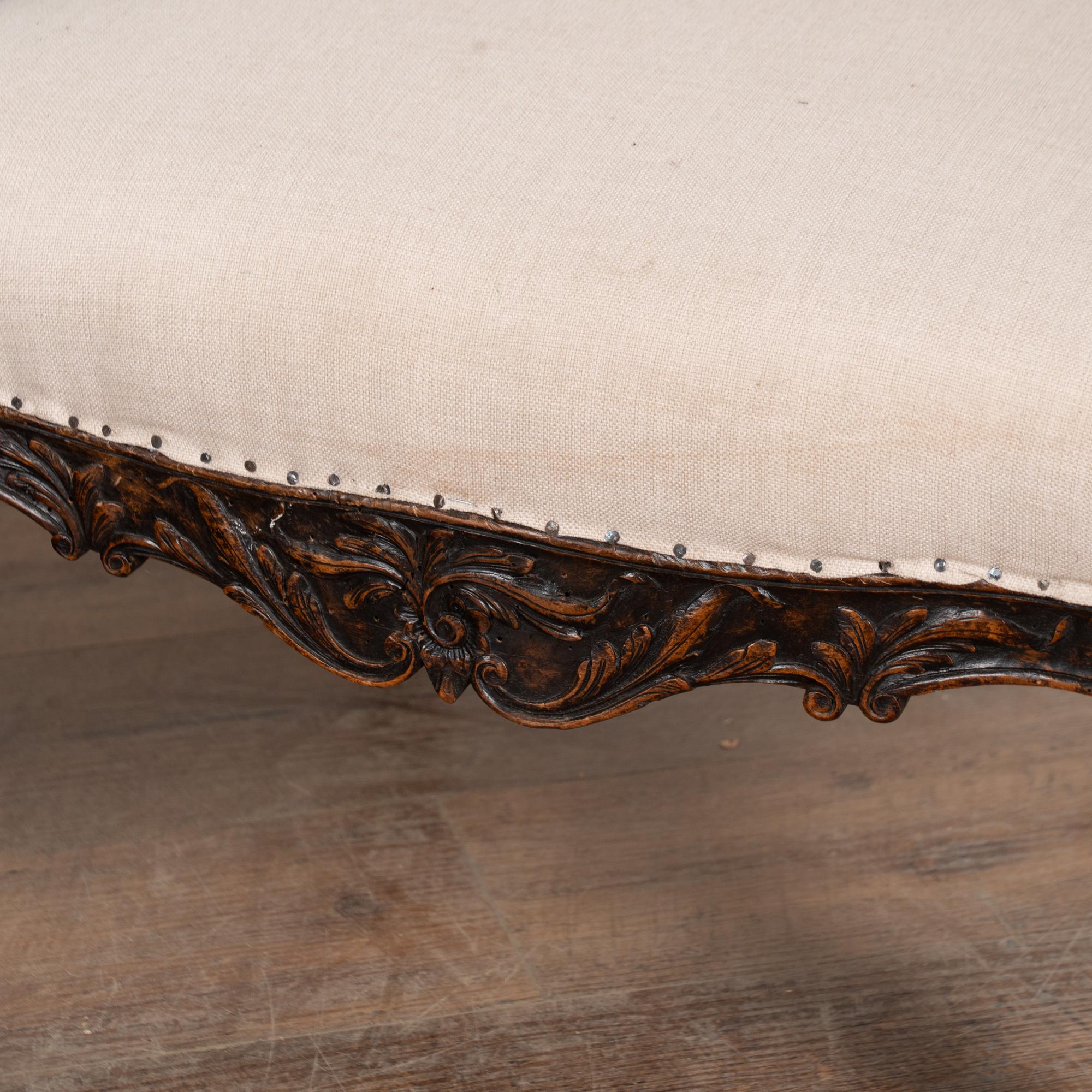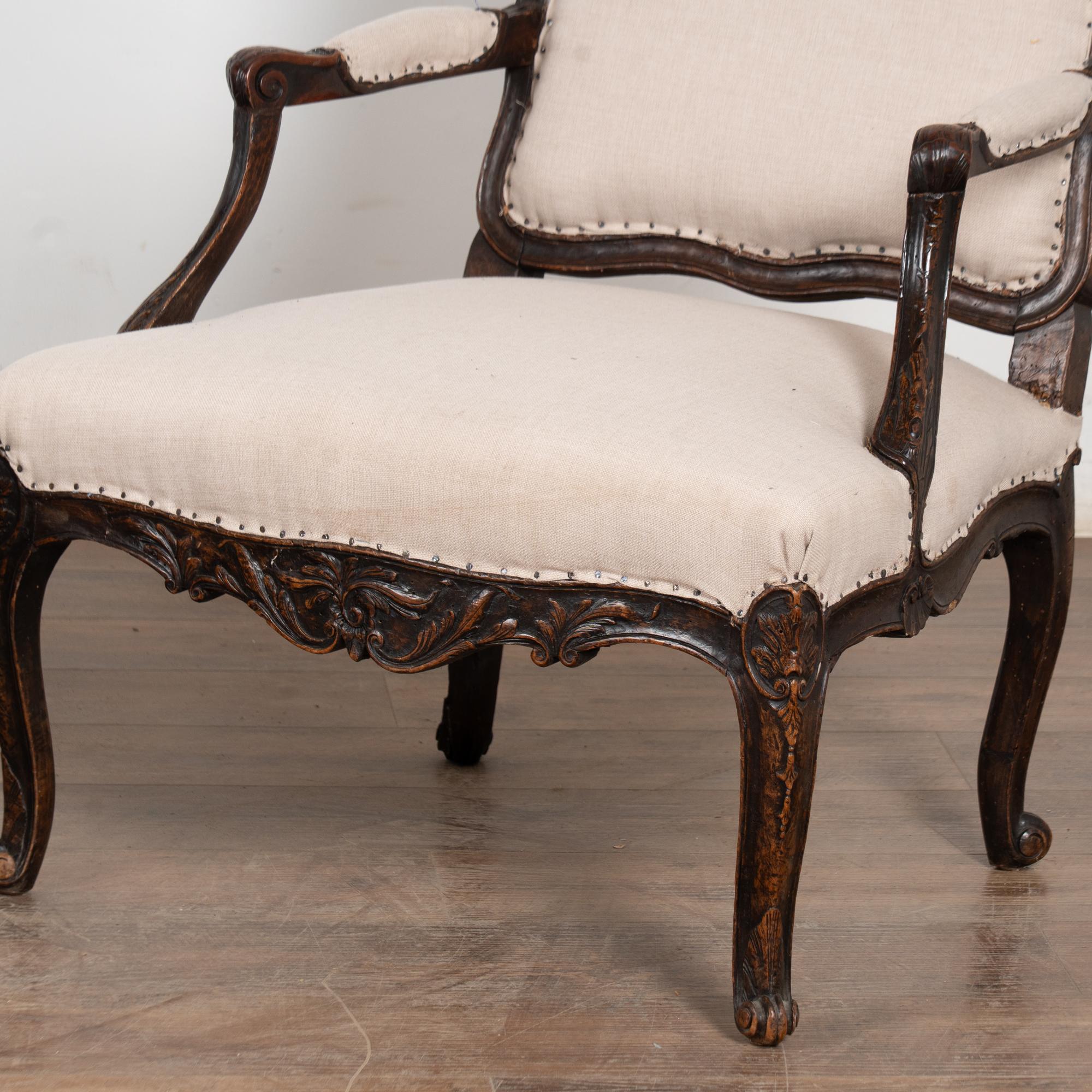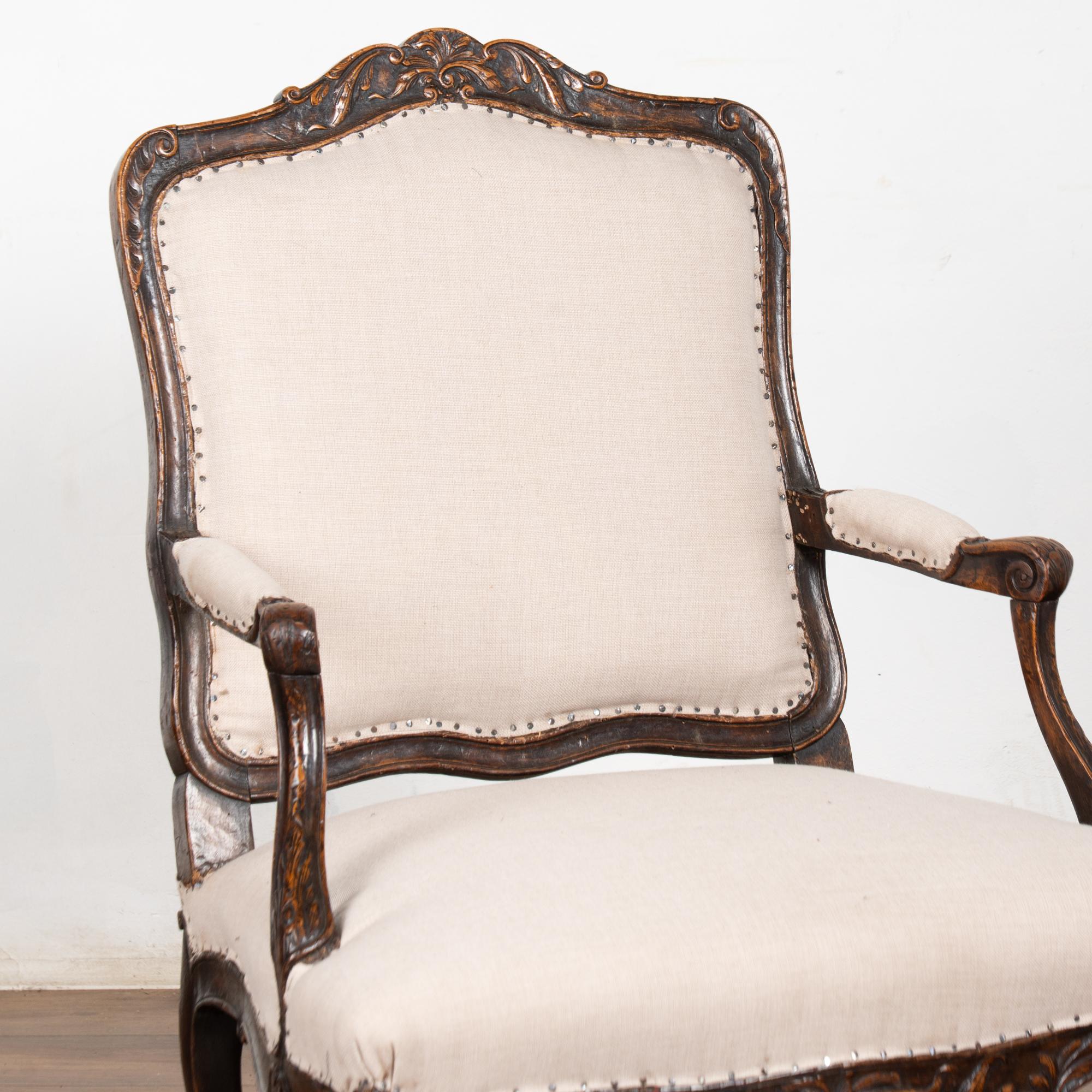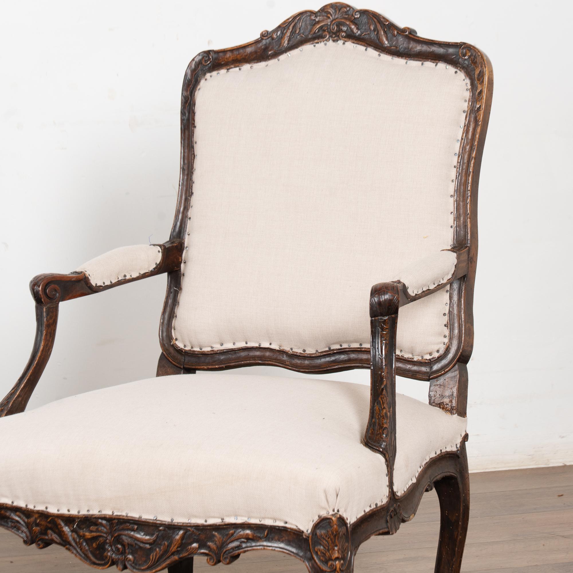 The seats are upholstered in a newer linen fabric, tacked down with exposed nails and staples for an informal, deconstructed appearance. The chairs sit firm and comfortable and may be used as-is, or the upholstery may be replaced at the buyer’s discretion for a more formal or contemporary look.