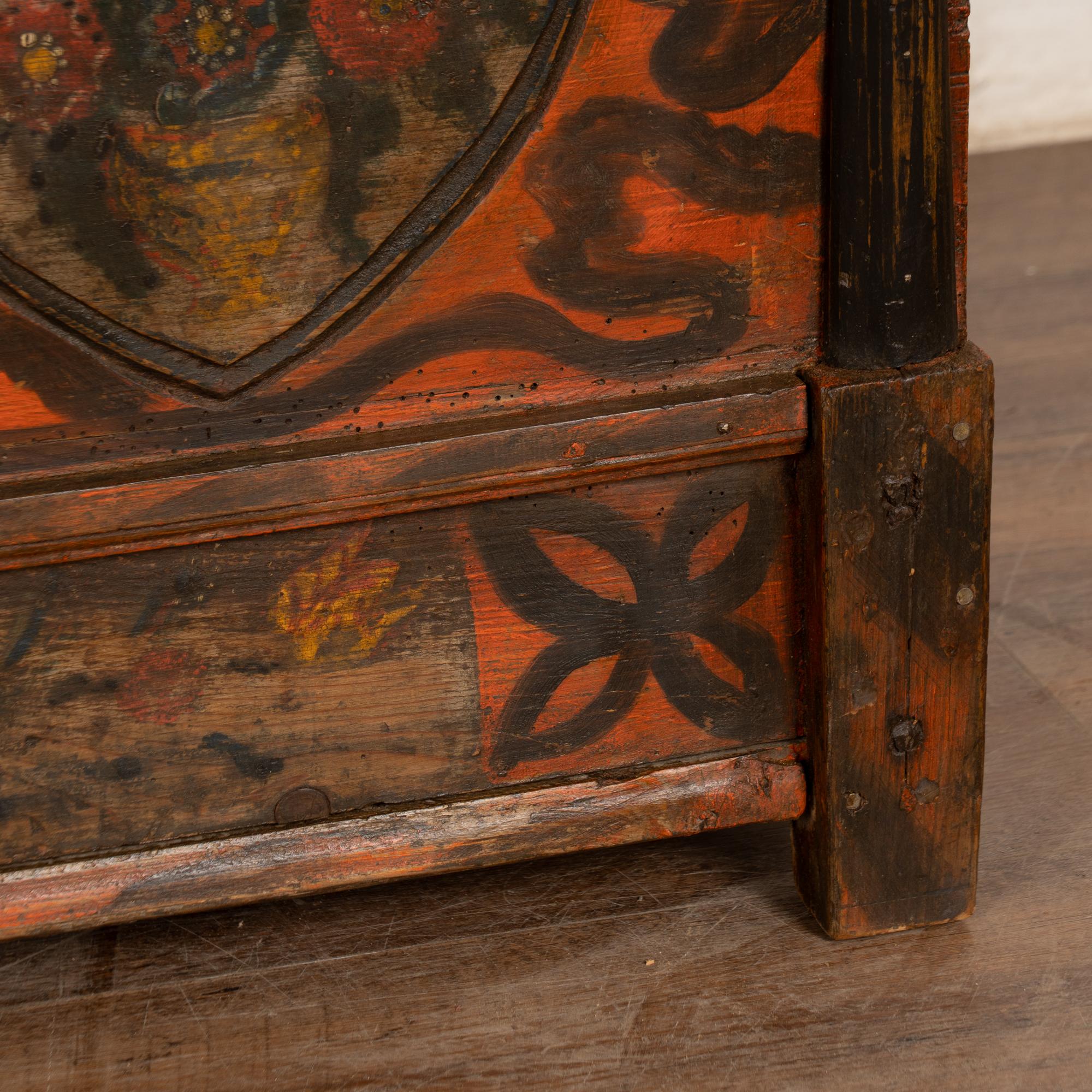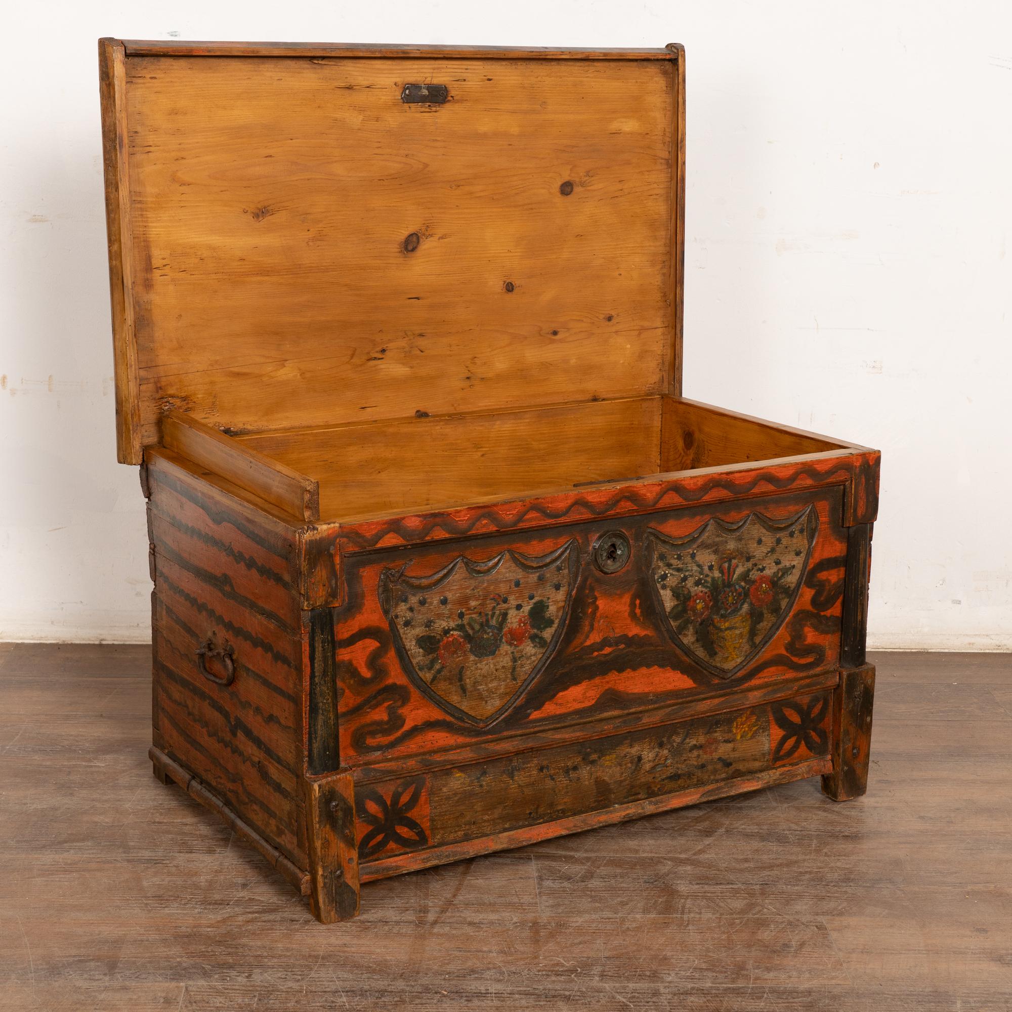 Late 19th-century Hungarian pine flat top trunk with original folk-art painted finish in shades of red-orange.