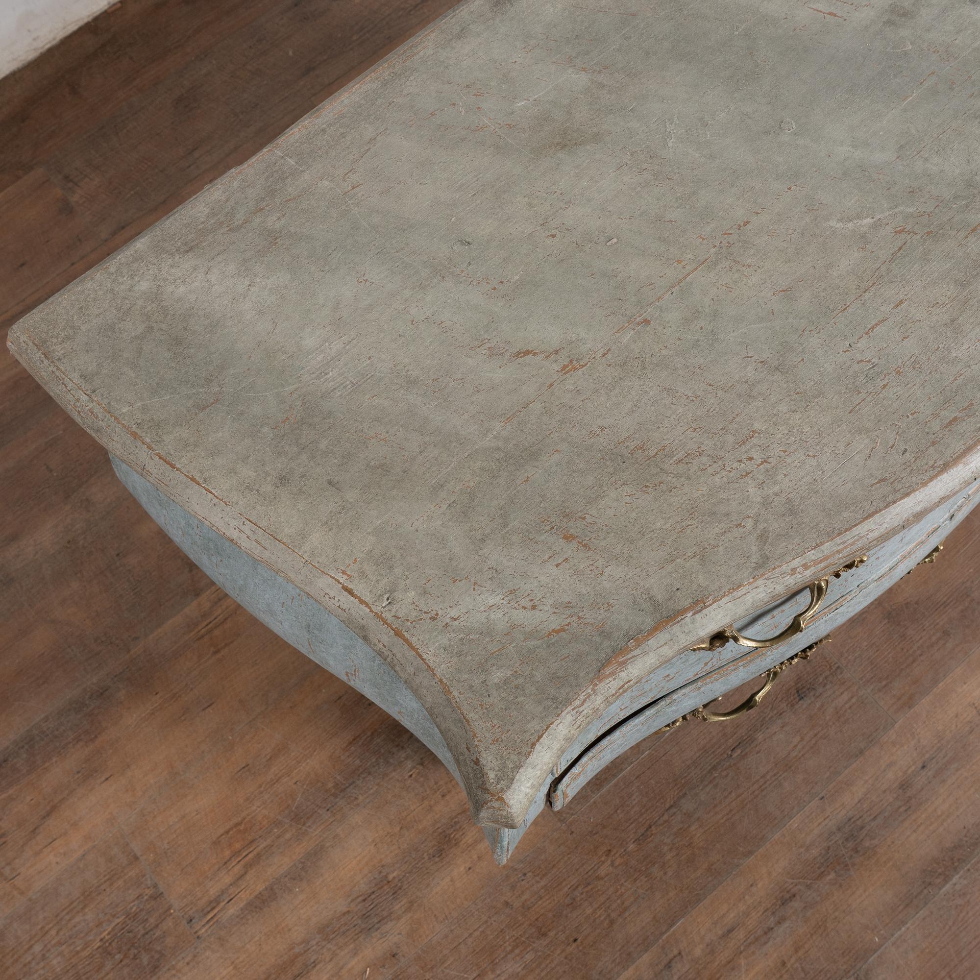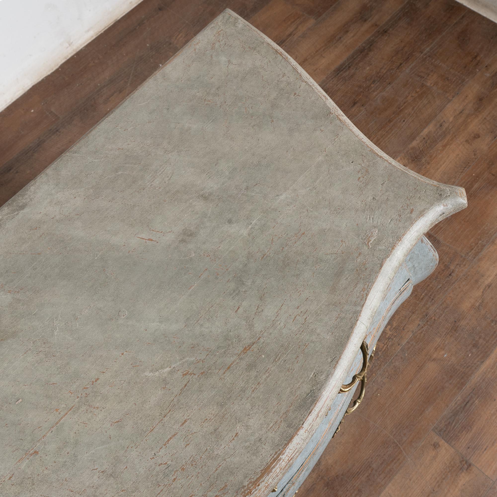 Later professionally painted in layered soft shades of blue and lightly distressed to fit the age and grace of this elegant pine commode. Contrasting top has distressed faux marble finish, typical of the orginal era with antique white, gray, and blue tones.