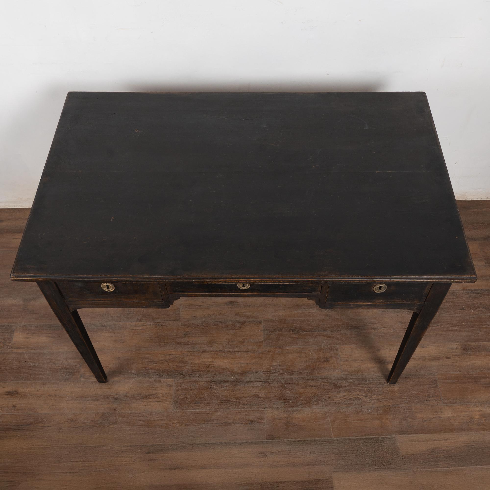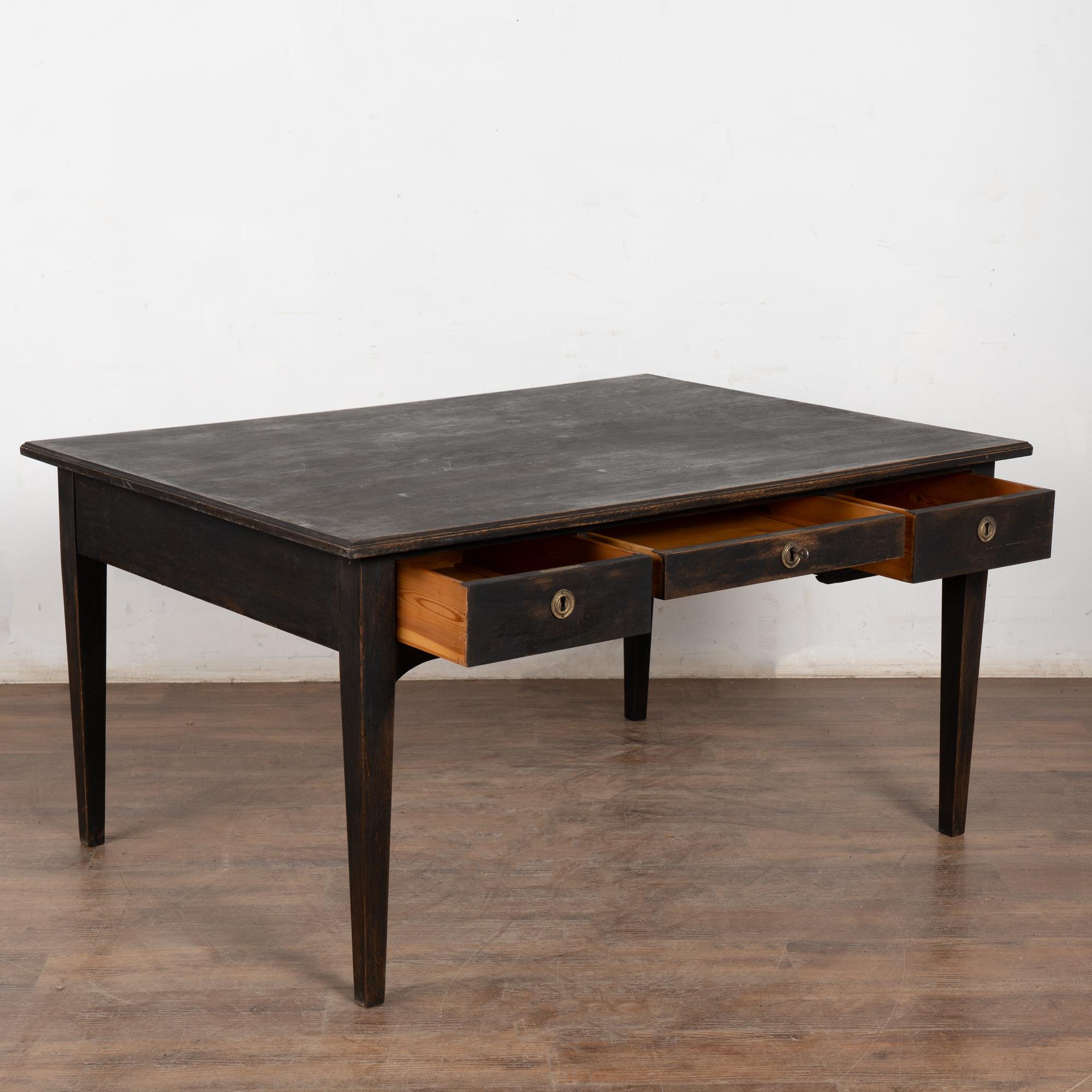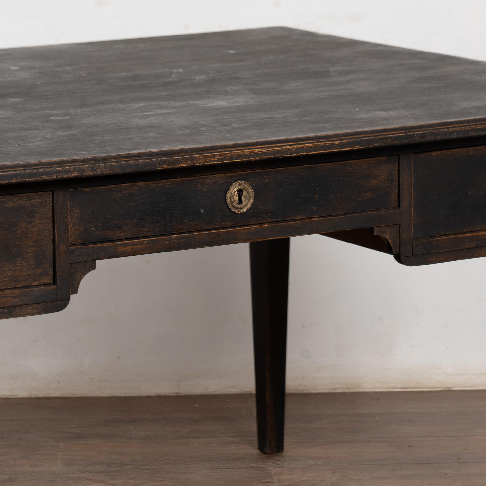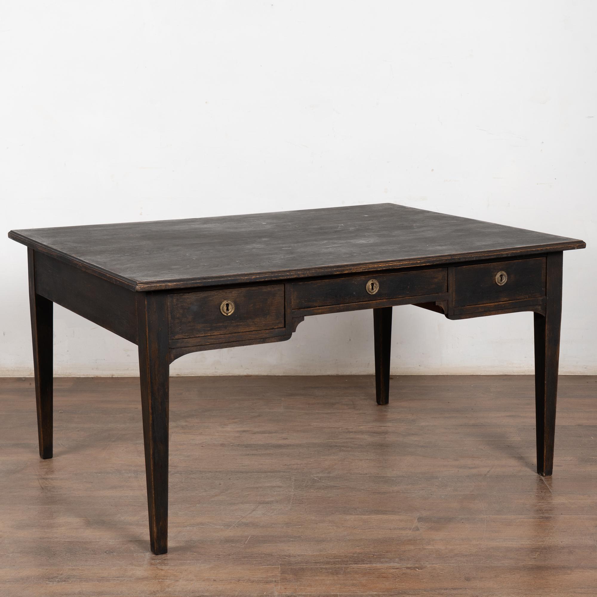 19th-century pine partner’s desk with a newer black painted finish, gently distressed to reveal natural pine beneath and suit the age and character of the piece.