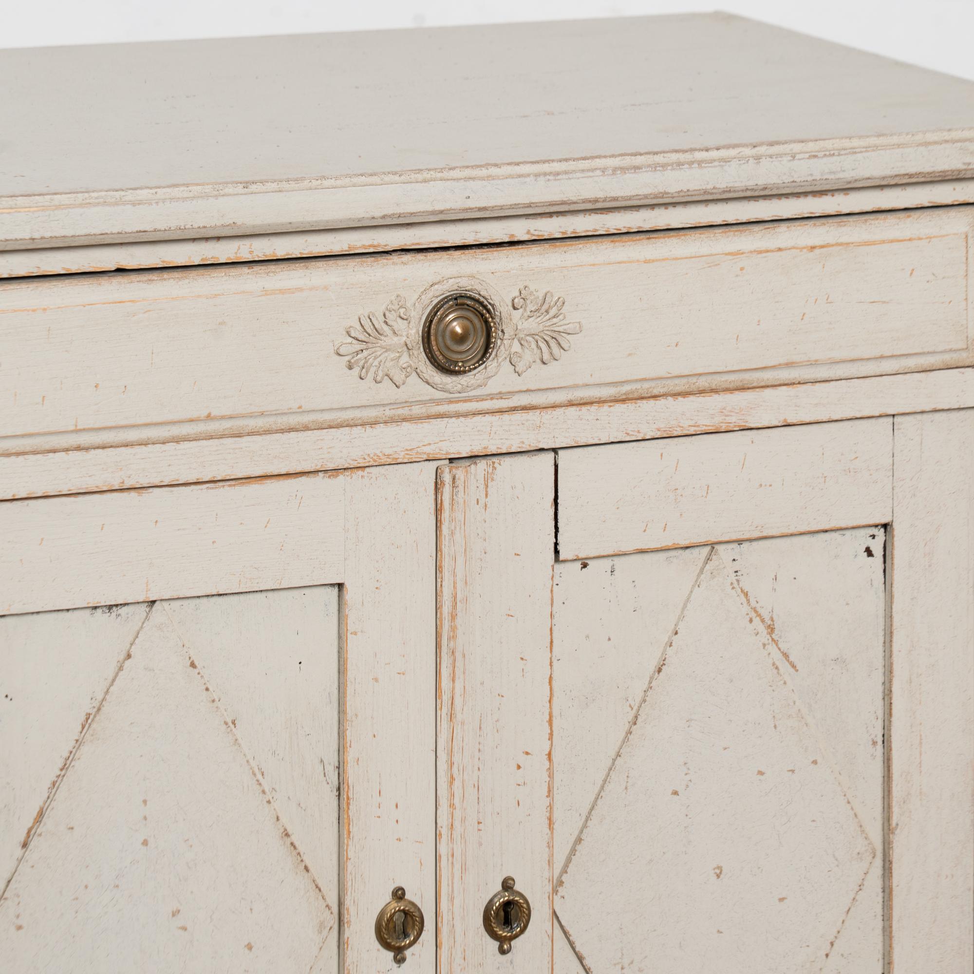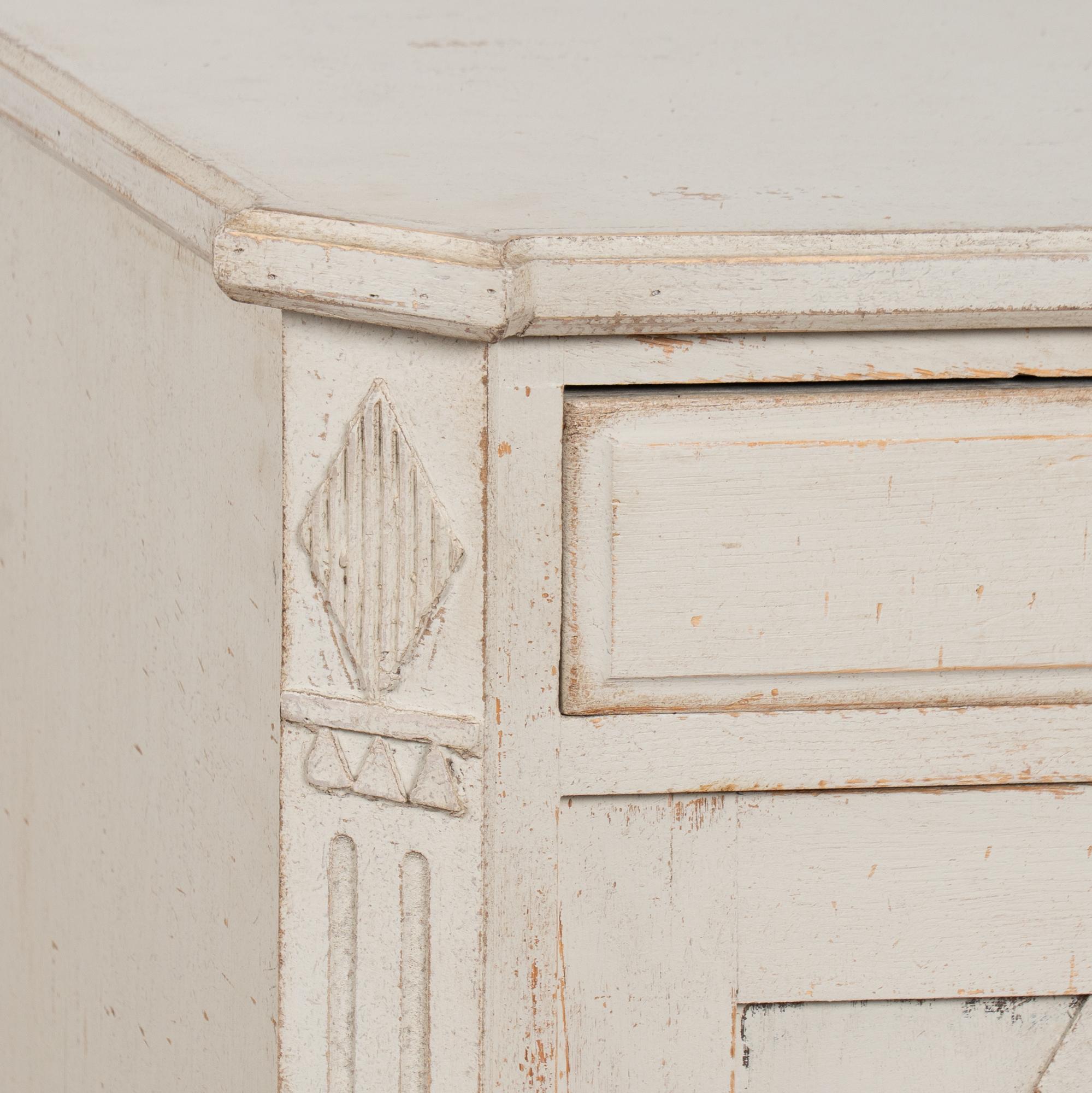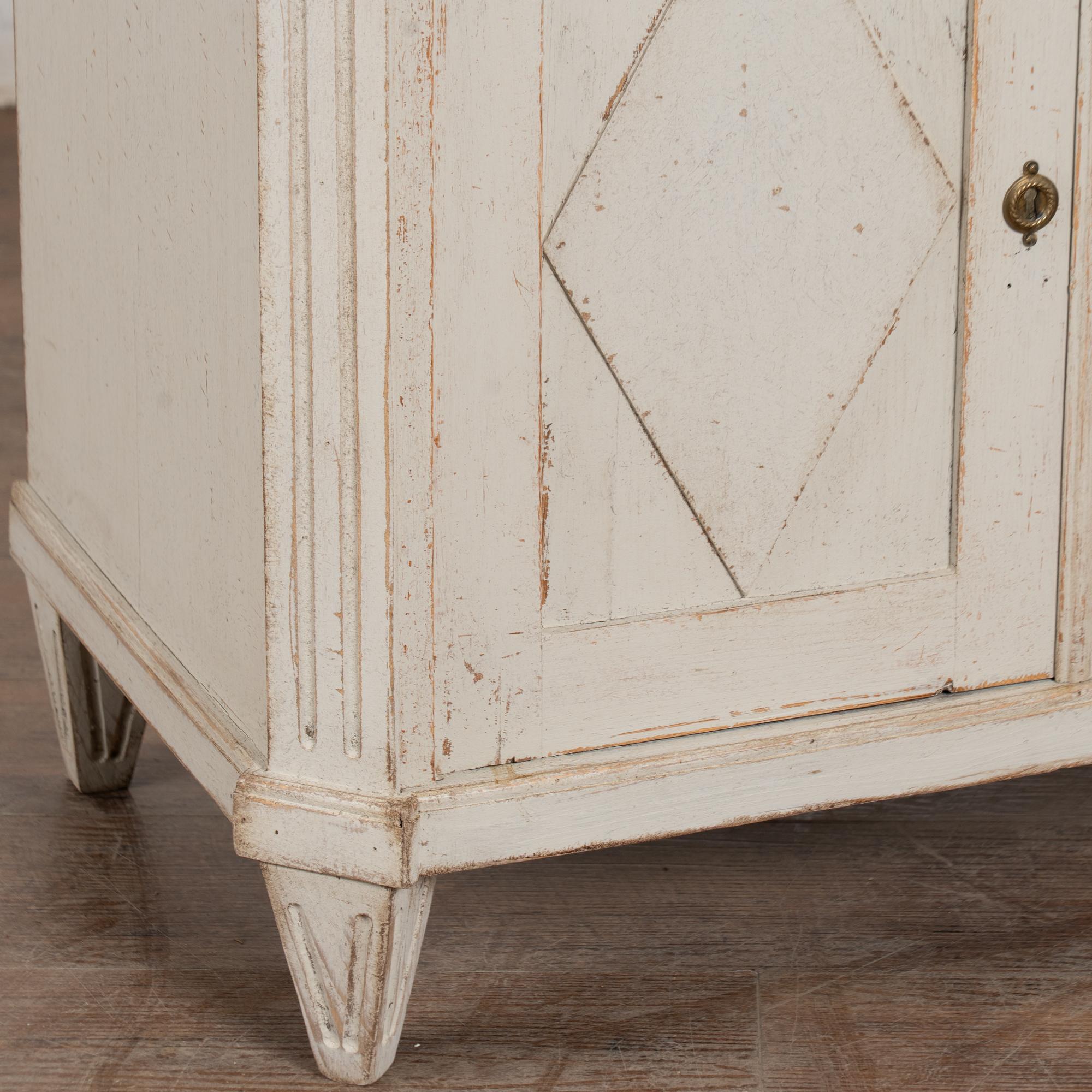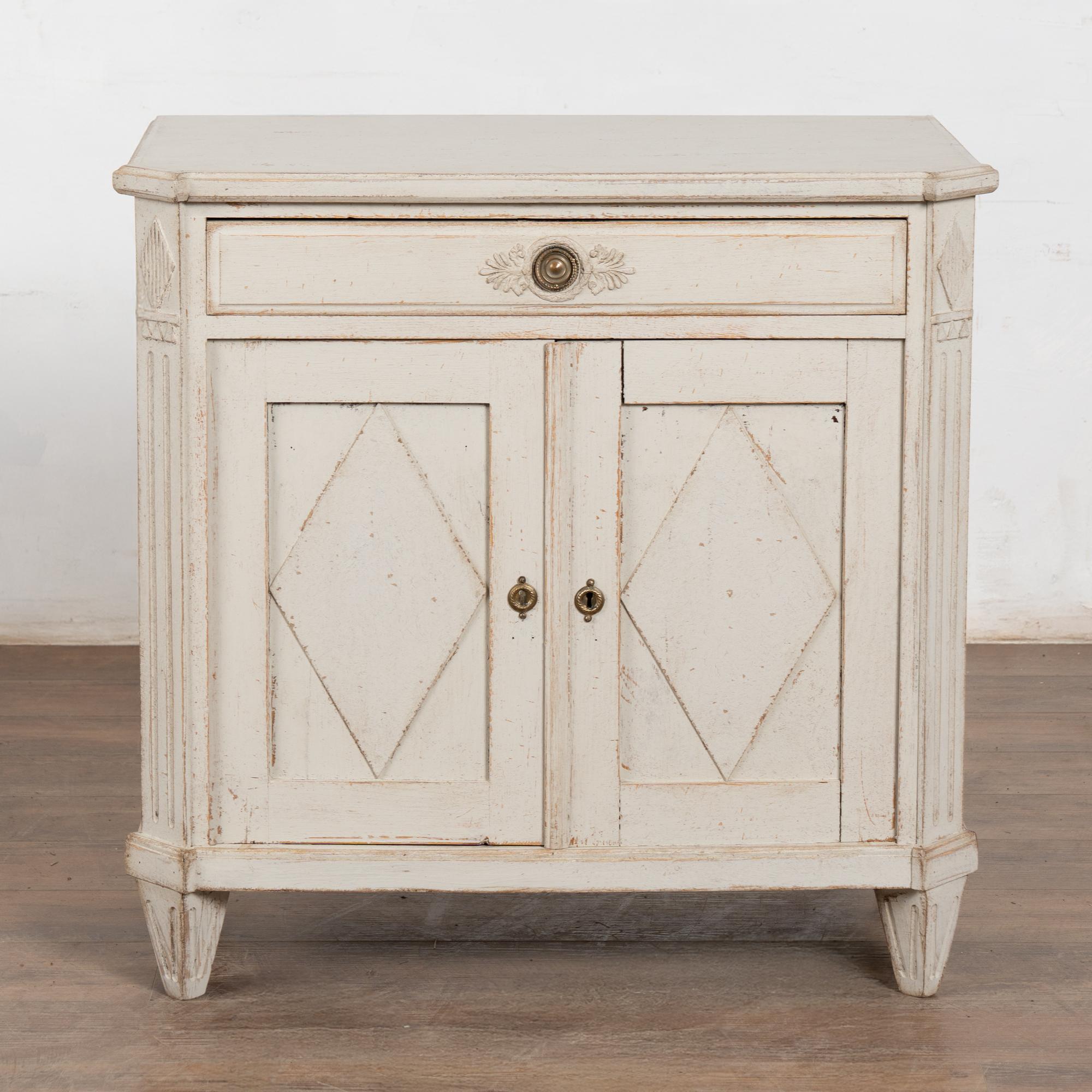Mid-19th-century Swedish Gustavian-style sideboard cabinet crafted from oak and pine. The newer professionally applied antique white painted finish has light gray undertones and subtle distressing that enhances the form’s graceful simplicity. Features one top drawer with brass pull and a left cabinet door that latches internally (no working lock or key; a skeleton key is included for use as a pull). Fluted sides and diamond accents, entire cabinet rest on tapered fluted legs.