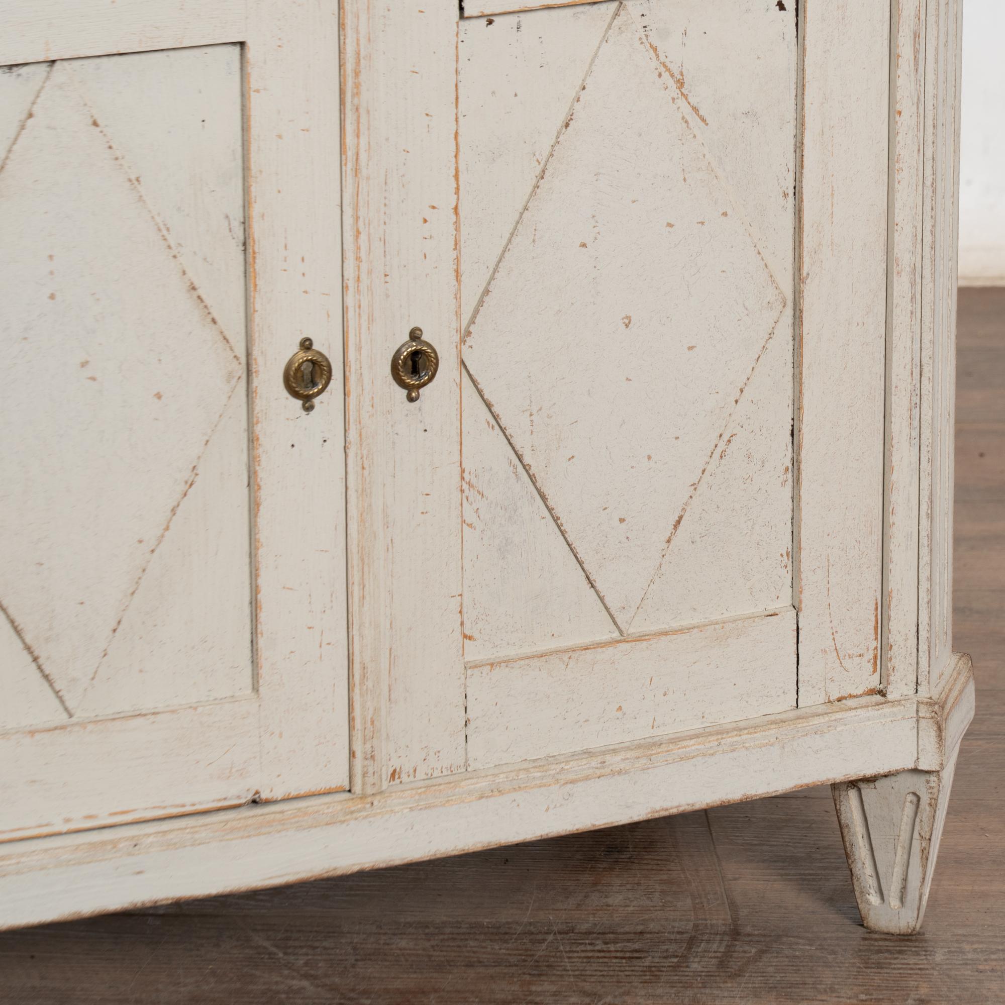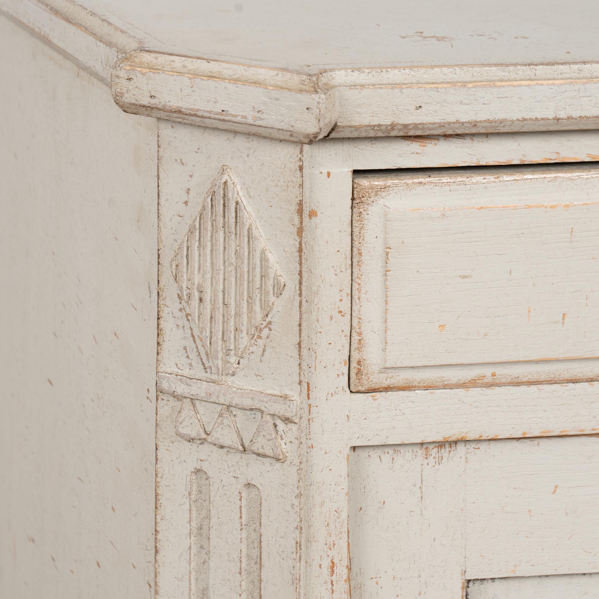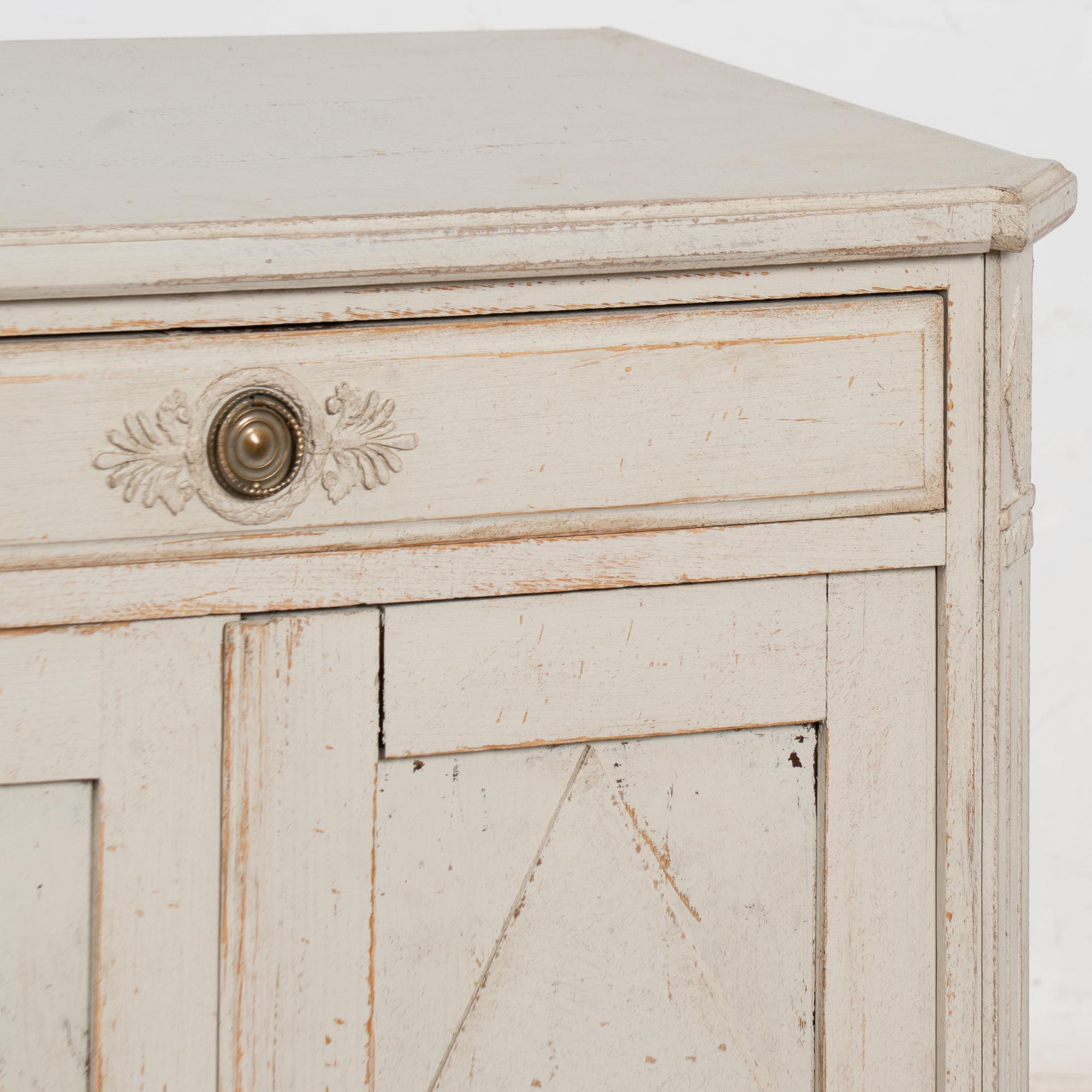 Mid-19th-century Swedish Gustavian-style sideboard cabinet crafted from oak and pine. The newer professionally applied antique white painted finish has light gray undertones and subtle distressing that enhances the form’s graceful simplicity. Features one top drawer with brass pull and a left cabinet door that latches internally (no working lock or key; a skeleton key is included for use as a pull). Fluted sides and diamond accents, entire cabinet rest on tapered fluted legs.