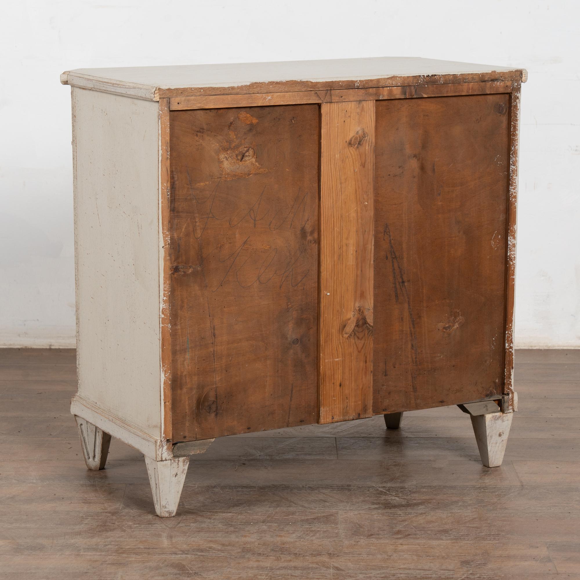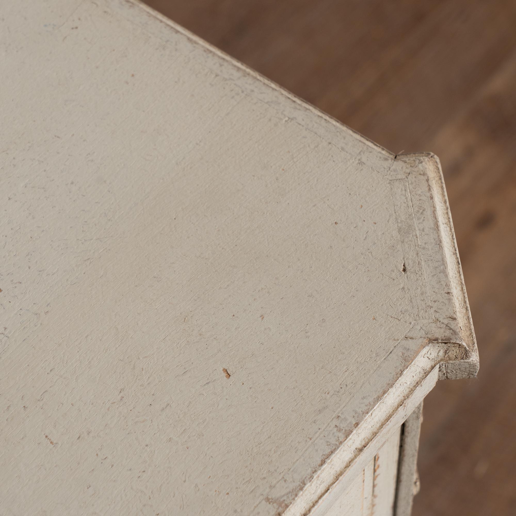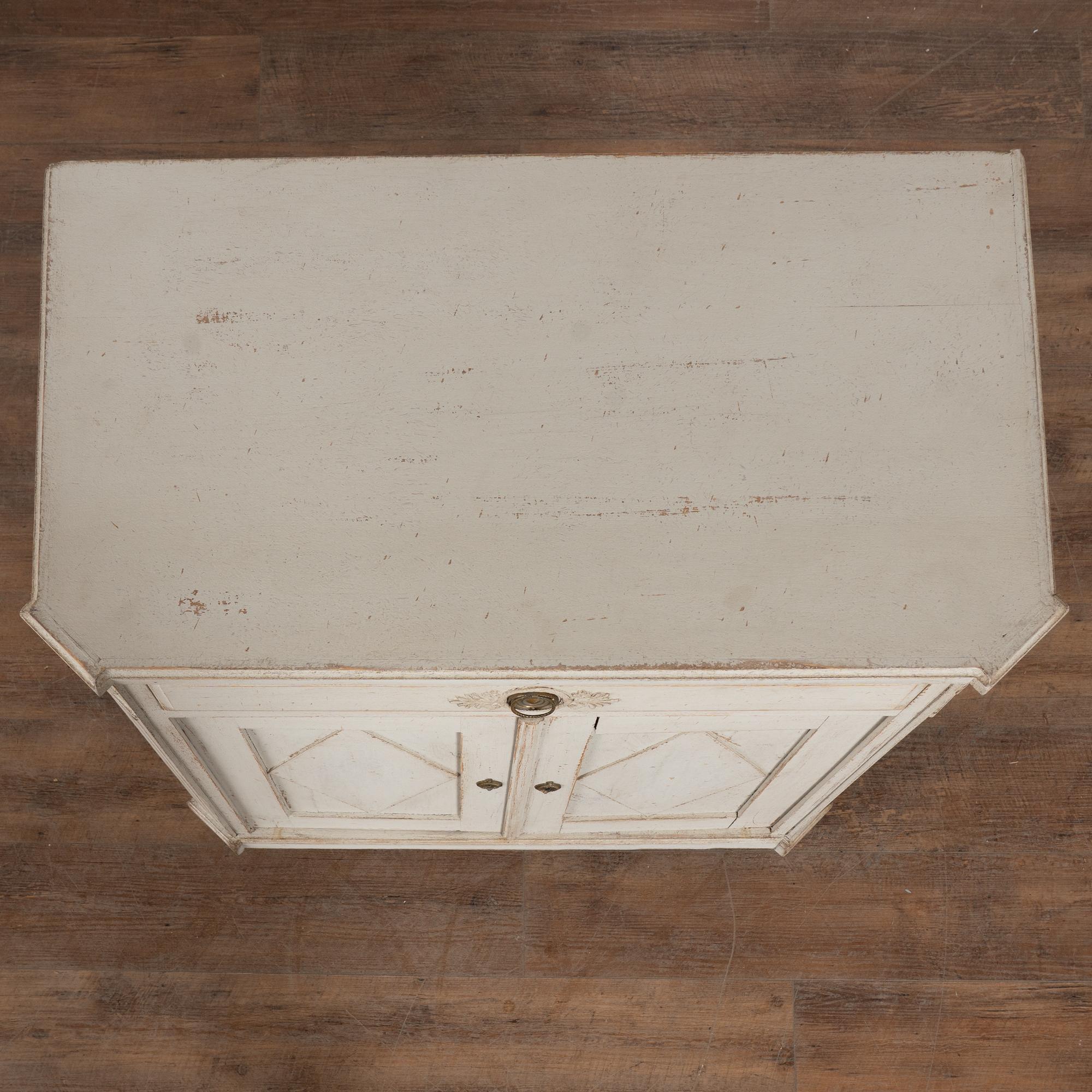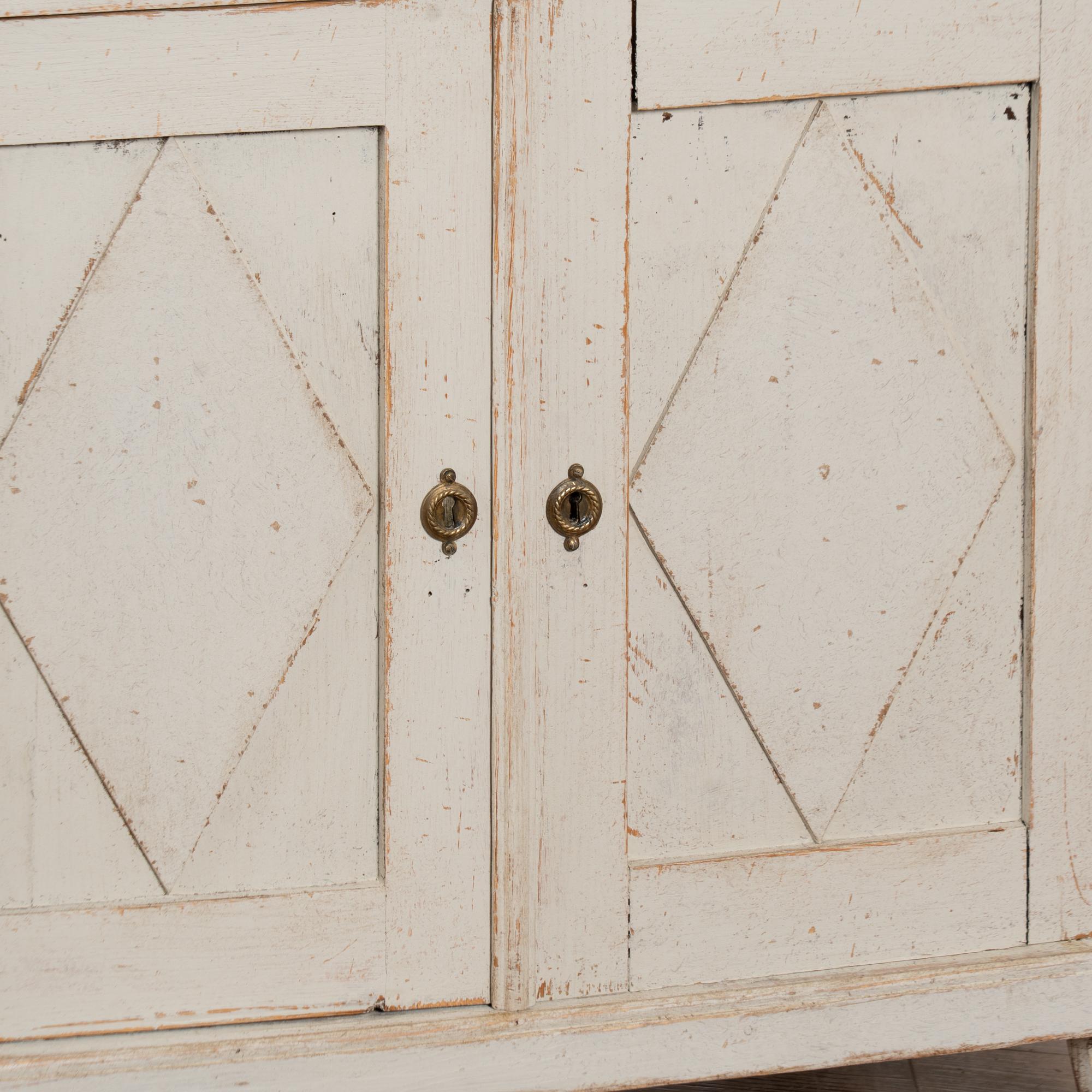 Mid-19th-century Swedish Gustavian-style sideboard cabinet crafted from oak and pine. The newer professionally applied antique white painted finish has light gray undertones and subtle distressing that enhances the form’s graceful simplicity. Features one top drawer with brass pull and a left cabinet door that latches internally (no working lock or key; a skeleton key is included for use as a pull). Fluted sides and diamond accents, entire cabinet rest on tapered fluted legs.
