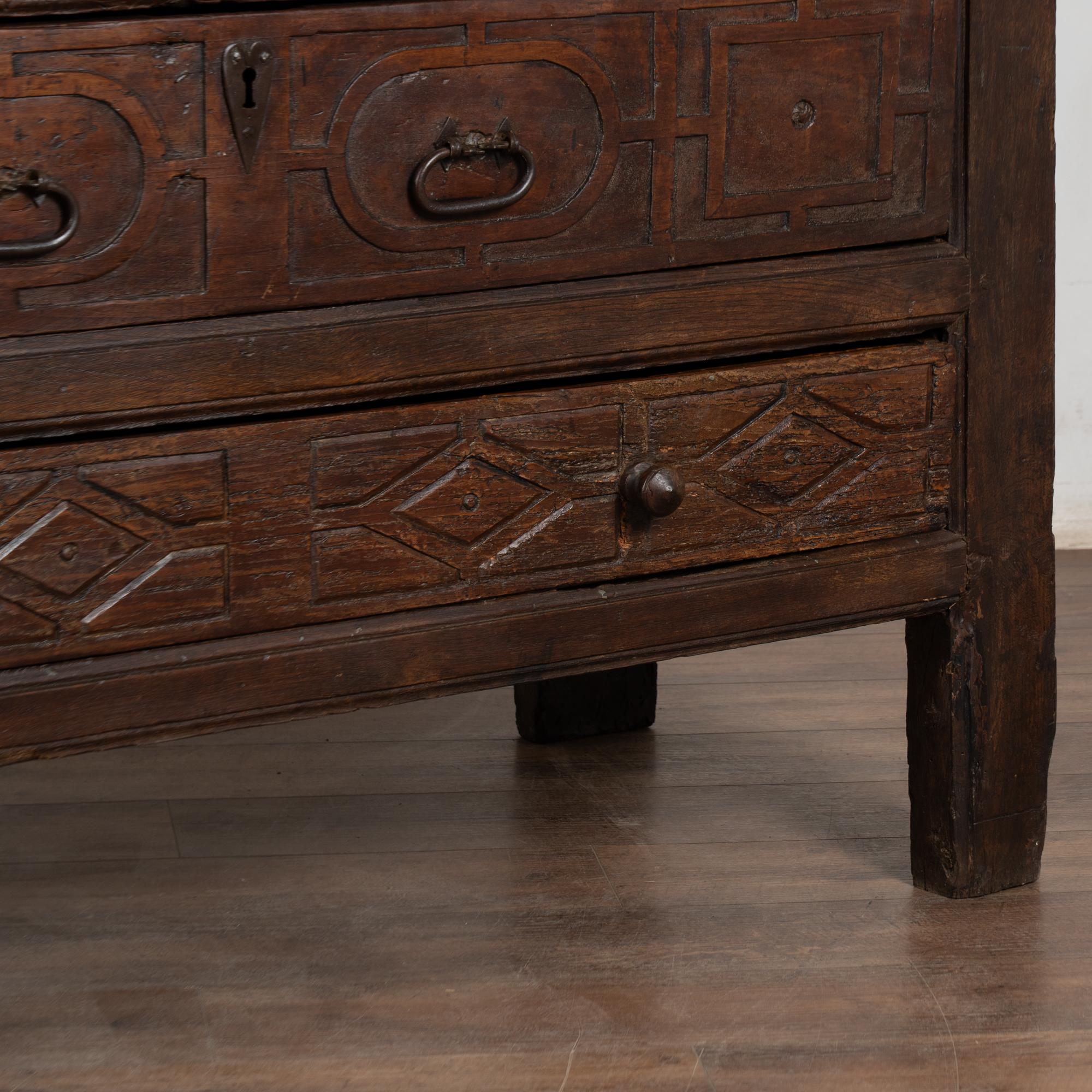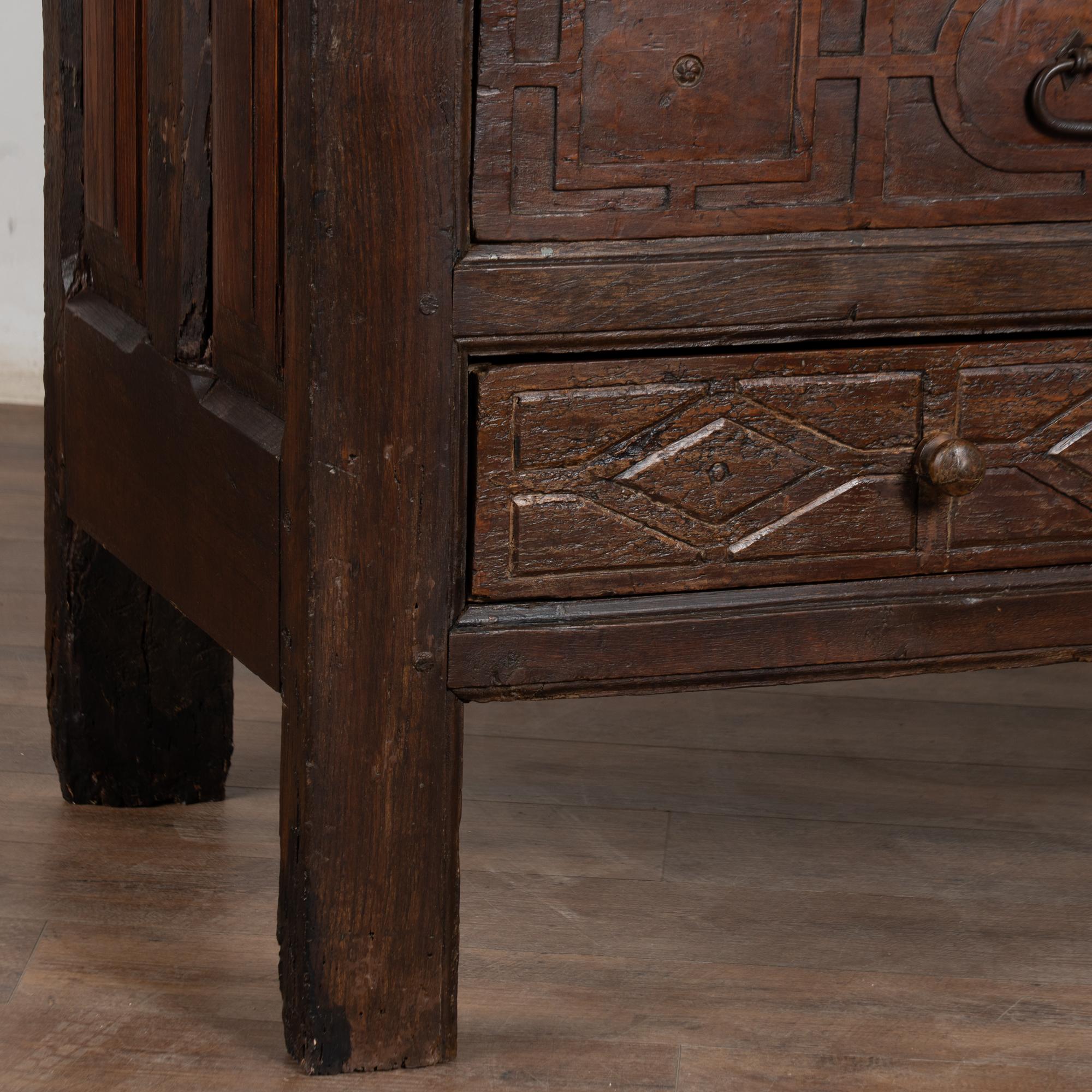 Restored, strong, and stable, this rare early chestnut piece functions well as a console or buffet while displaying the powerful character of true 17th-century European furniture.