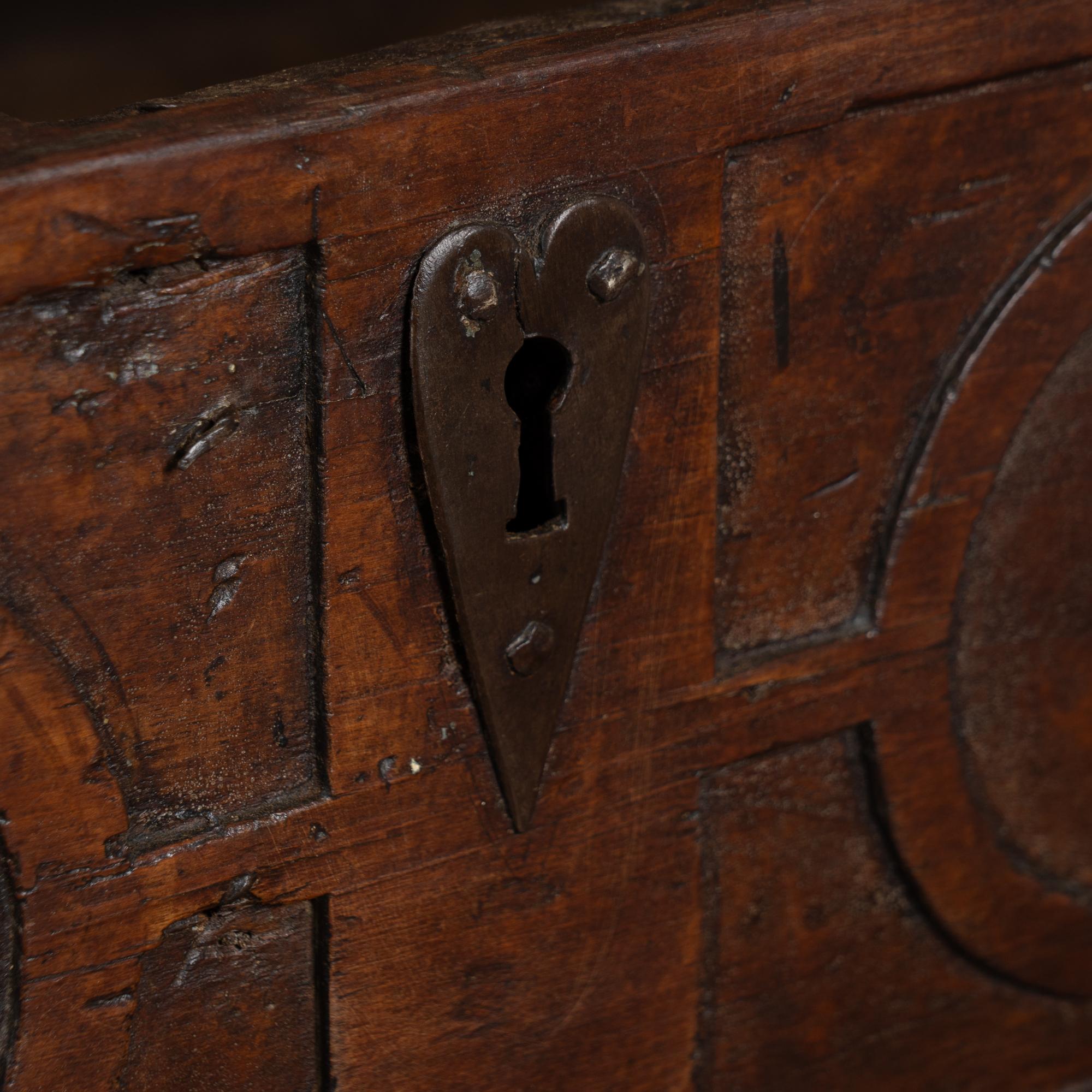 The top drawer is fitted with wrought iron handles and a heart-shaped key cover. The lower drawer shows more extensive distress than the upper with wooden pulls and extensive signs old wormhole activity consistent with age. Drawer bottoms display typical early plank separation.