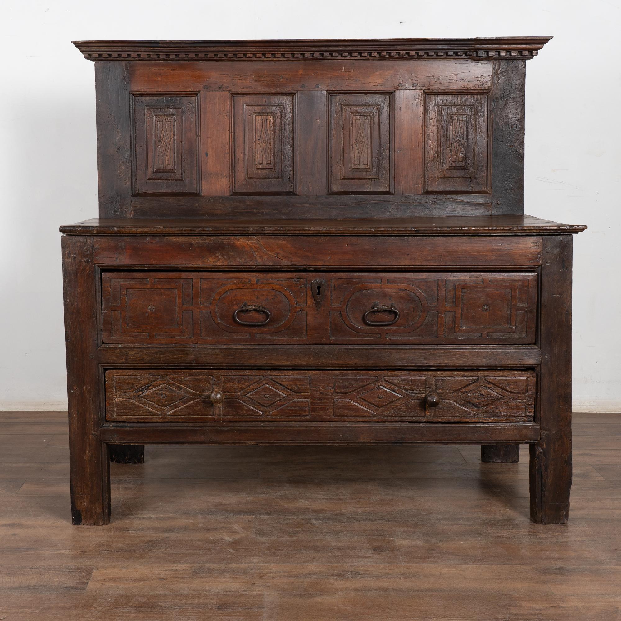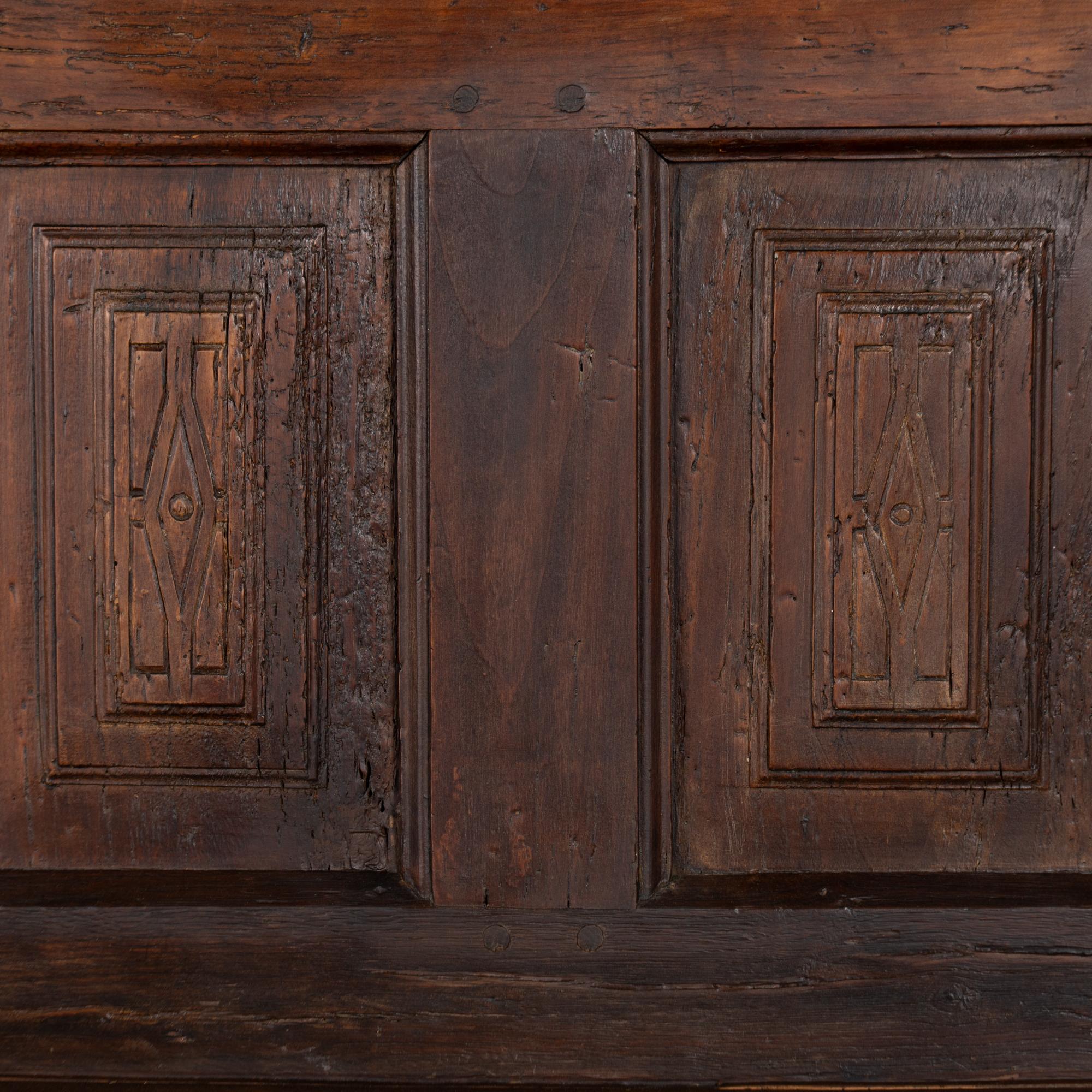 17th-century chestnut console or buffet with exceptionally deep patina and centuries of wear reflecting its early origins. The piece features a high back with simple carved panels, an uncommon detail that adds presence and character.
